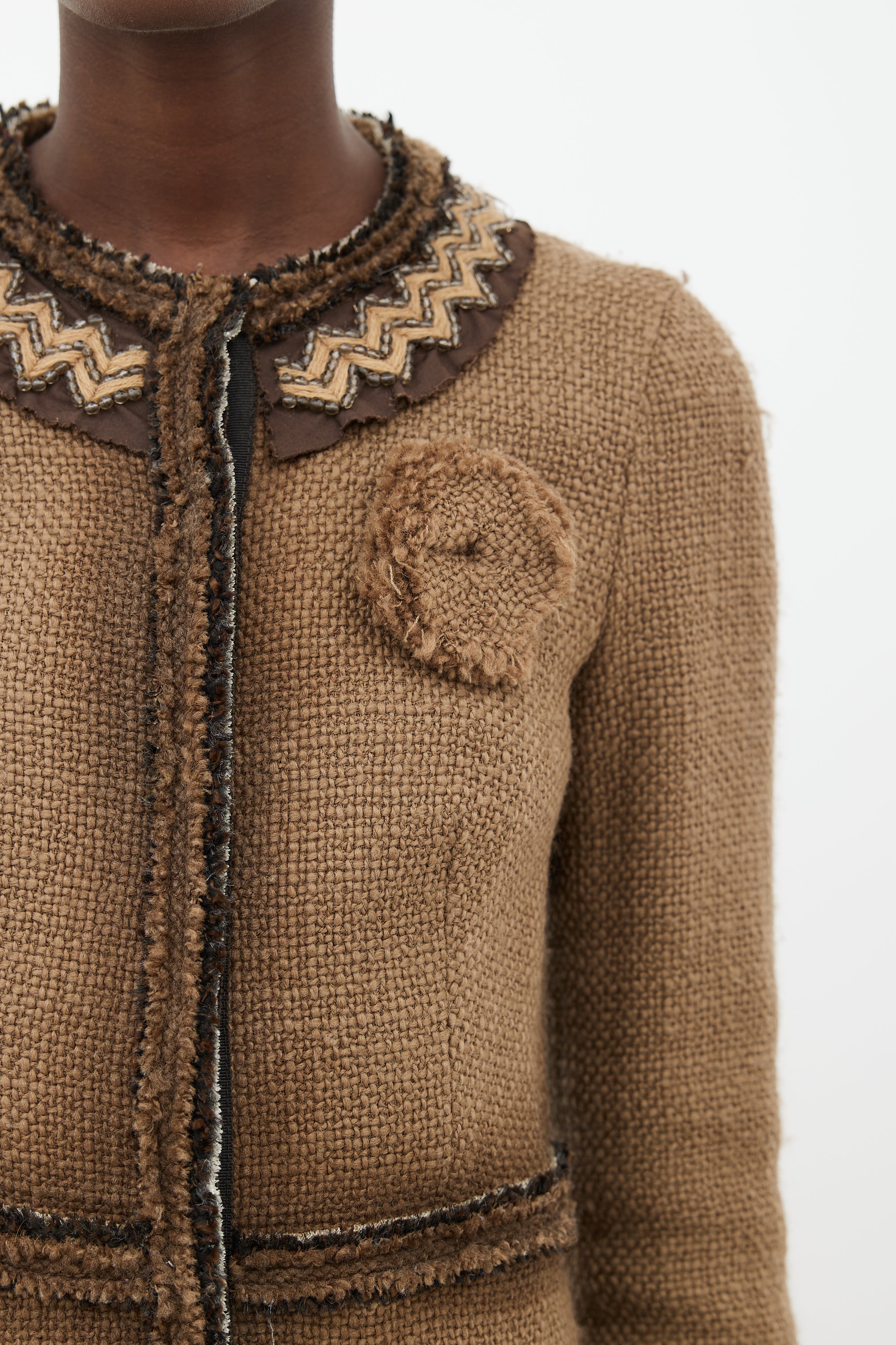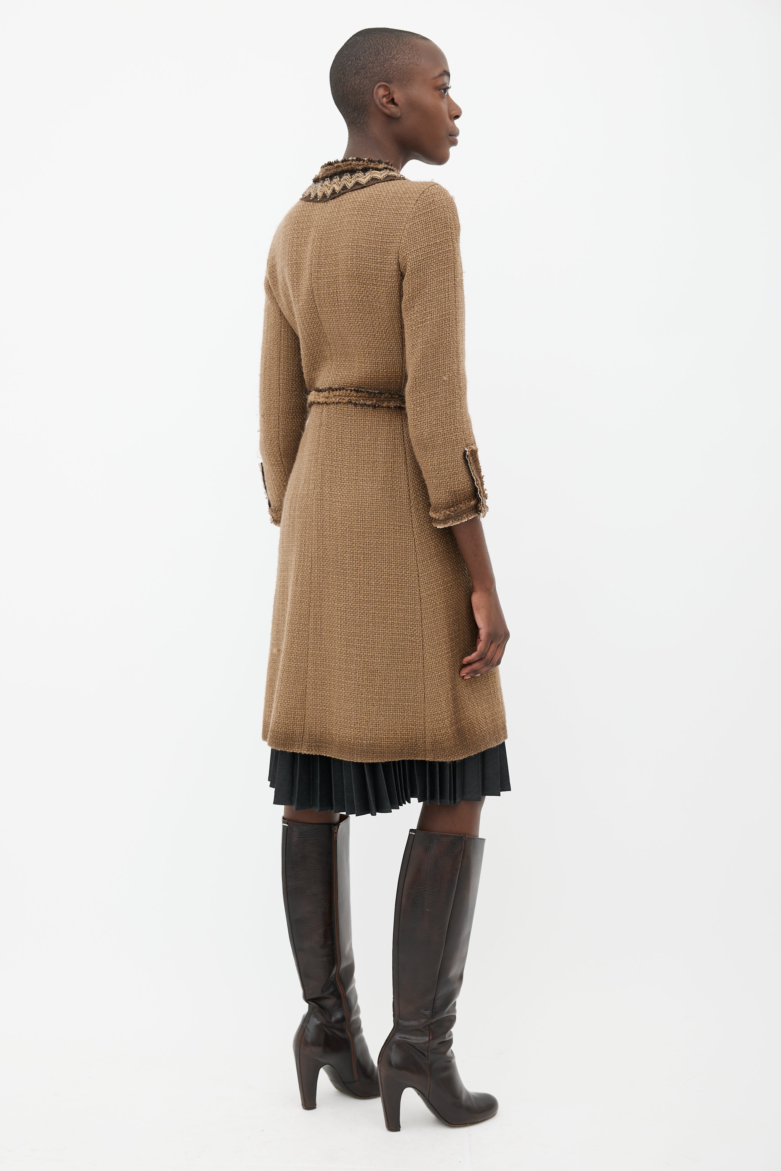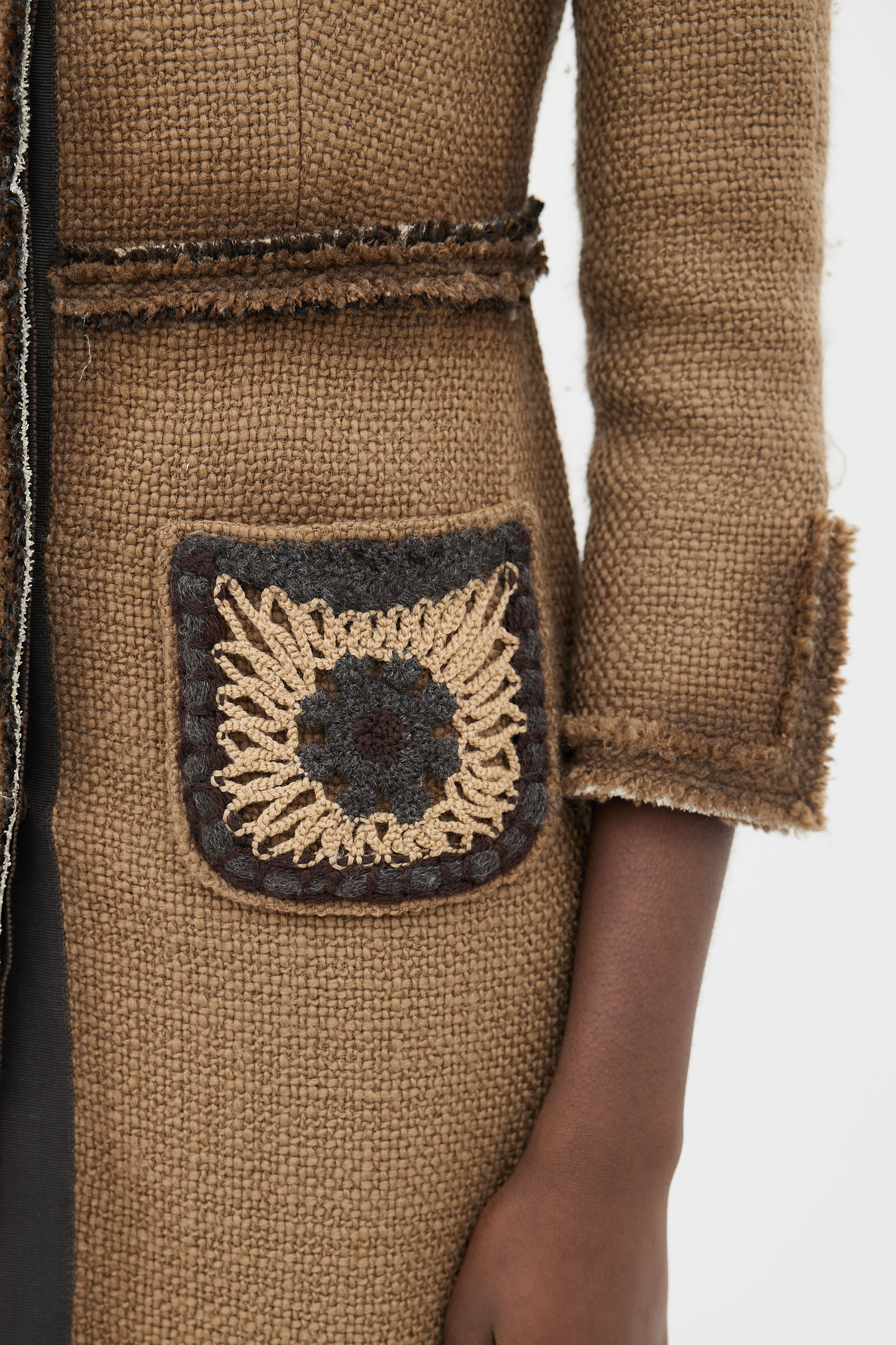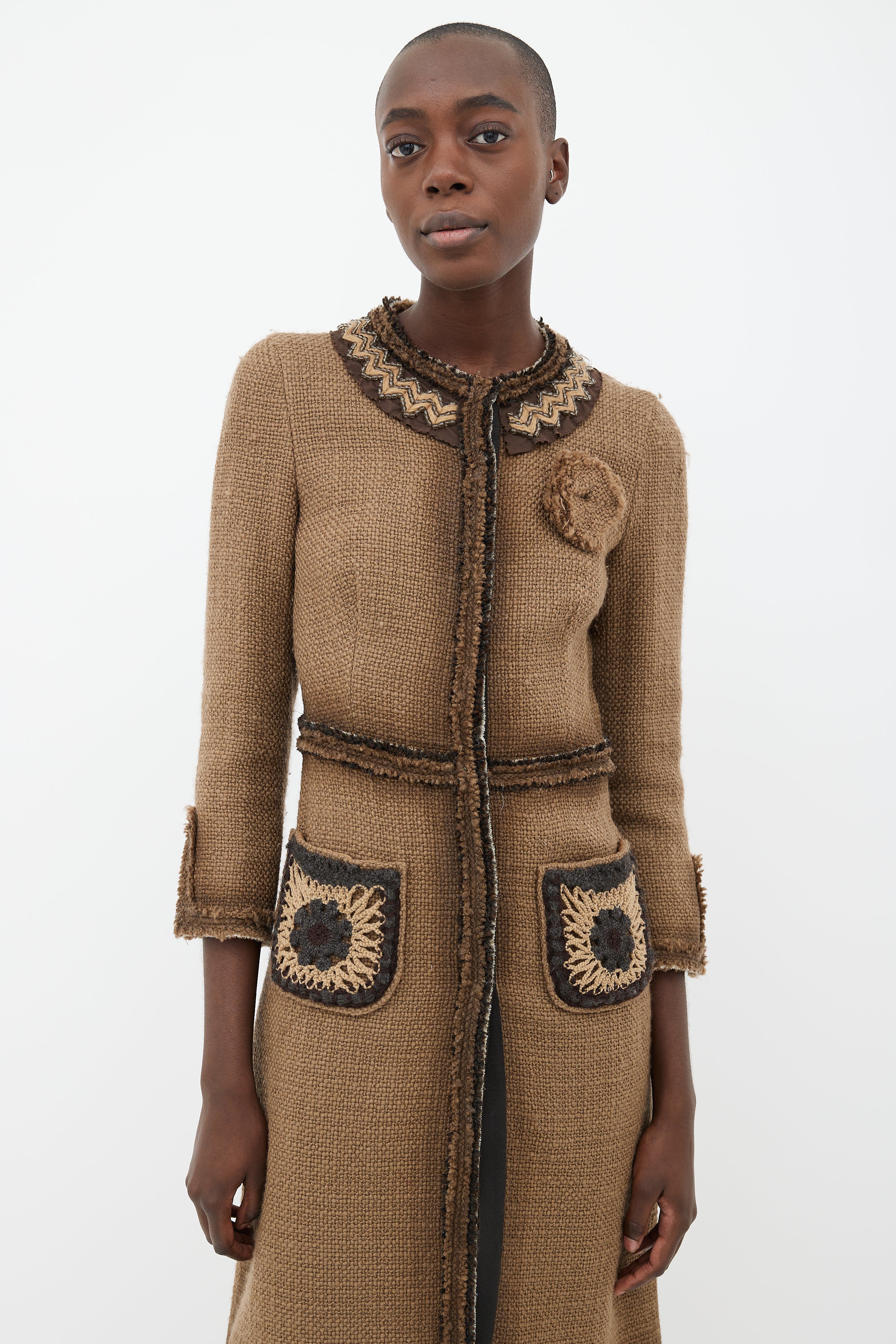 Pre-owned F/W 2005 RTW Prada coat in brown featuring round neckline with bead embellishment, concealed snap button closure at front, tonal tweed trimming detail throughout, detachable tonal tweed brooch at chest, and two pockets styling with crochet detailing.