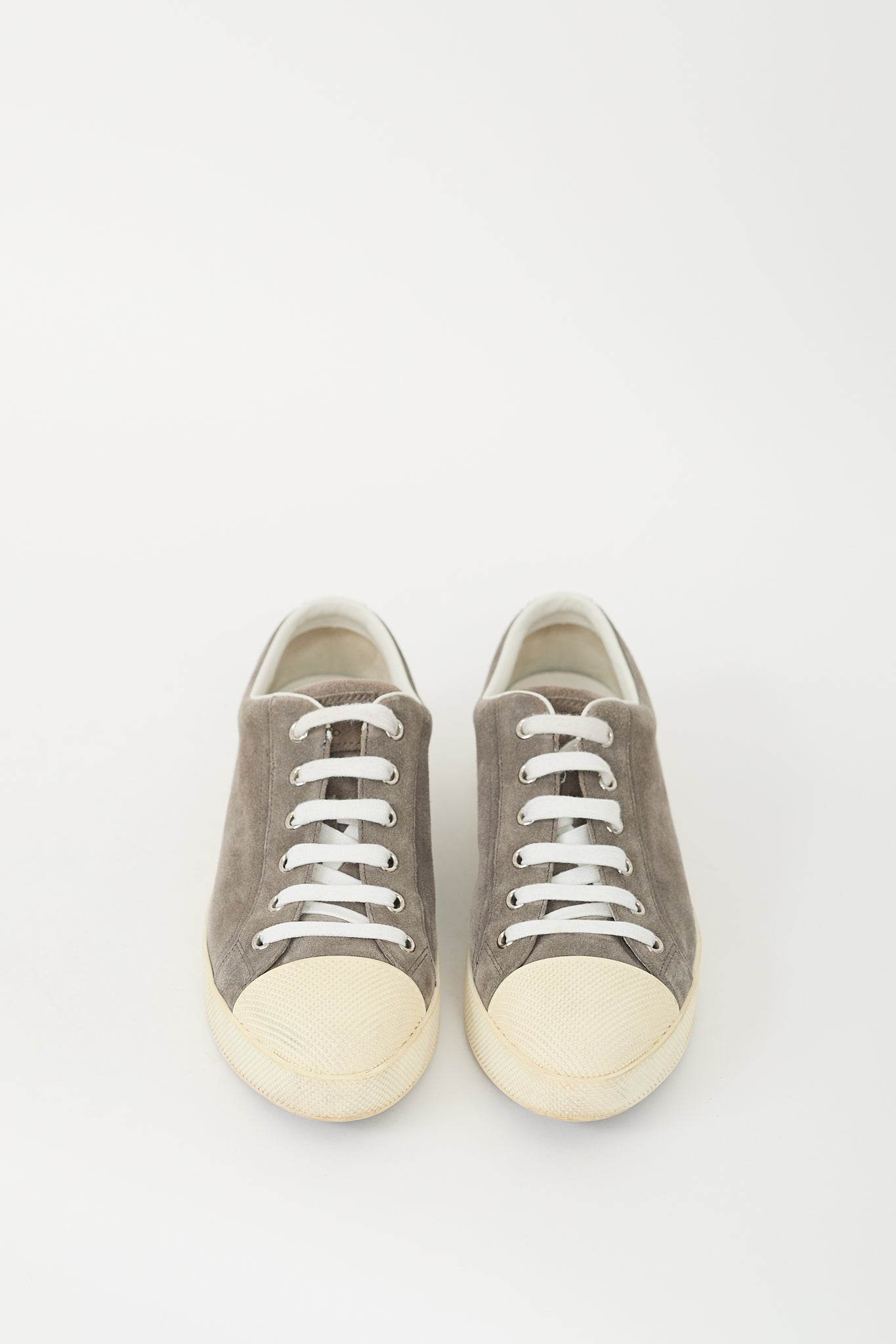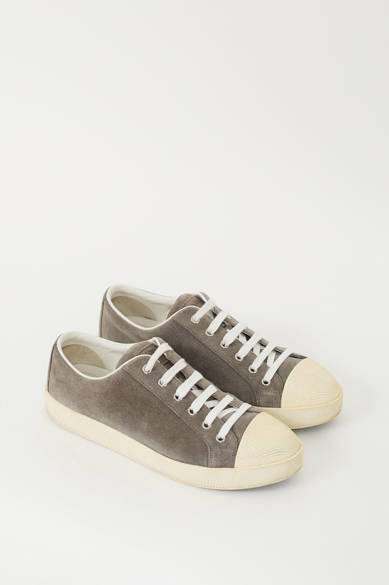 Pre-owned Prada grey suede sneakers featuring an almond toe with studded rubber cap, lace up vamp, stamped logo at tongue, leather interior, and studded rubber platform sole with embossed logo at heel.