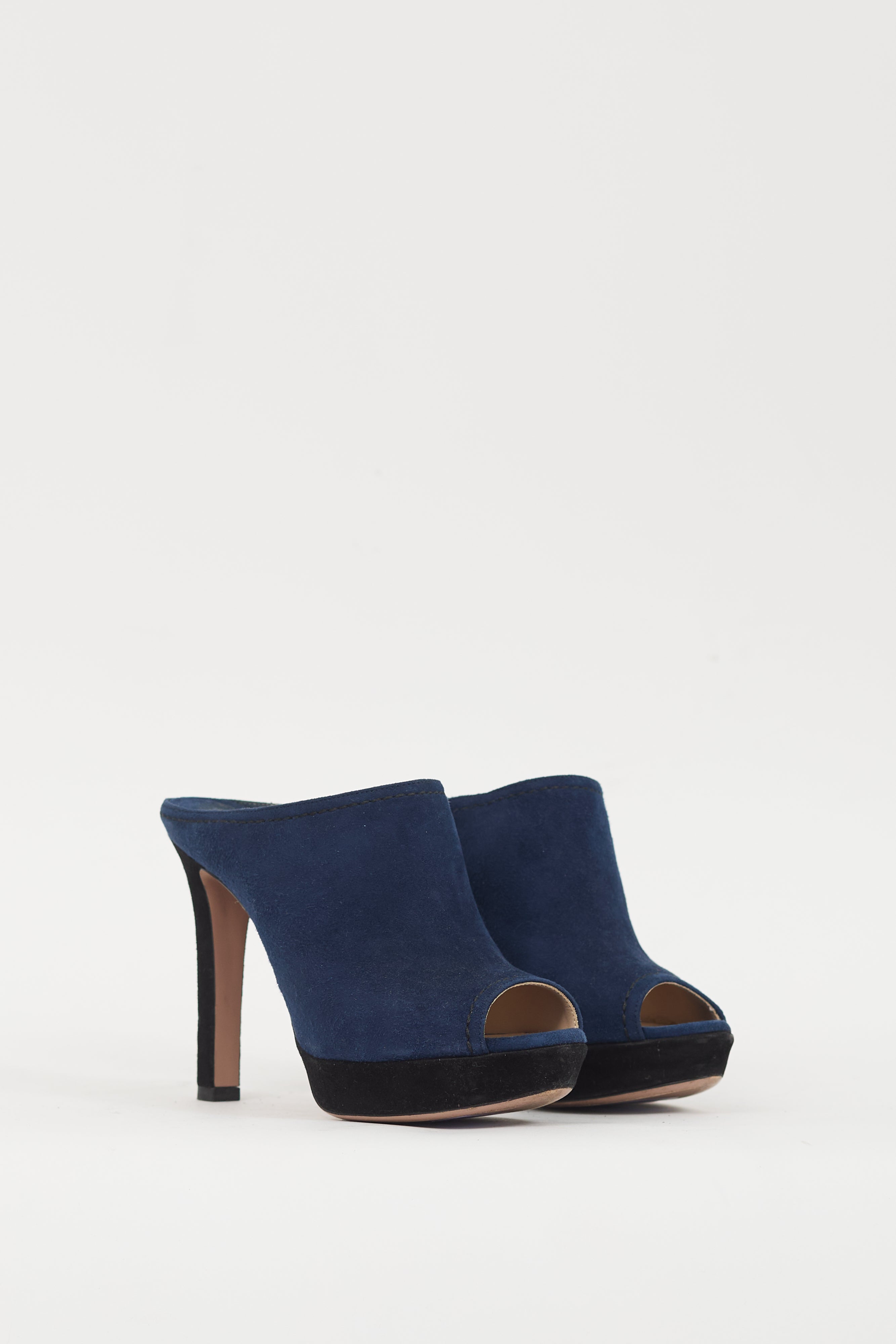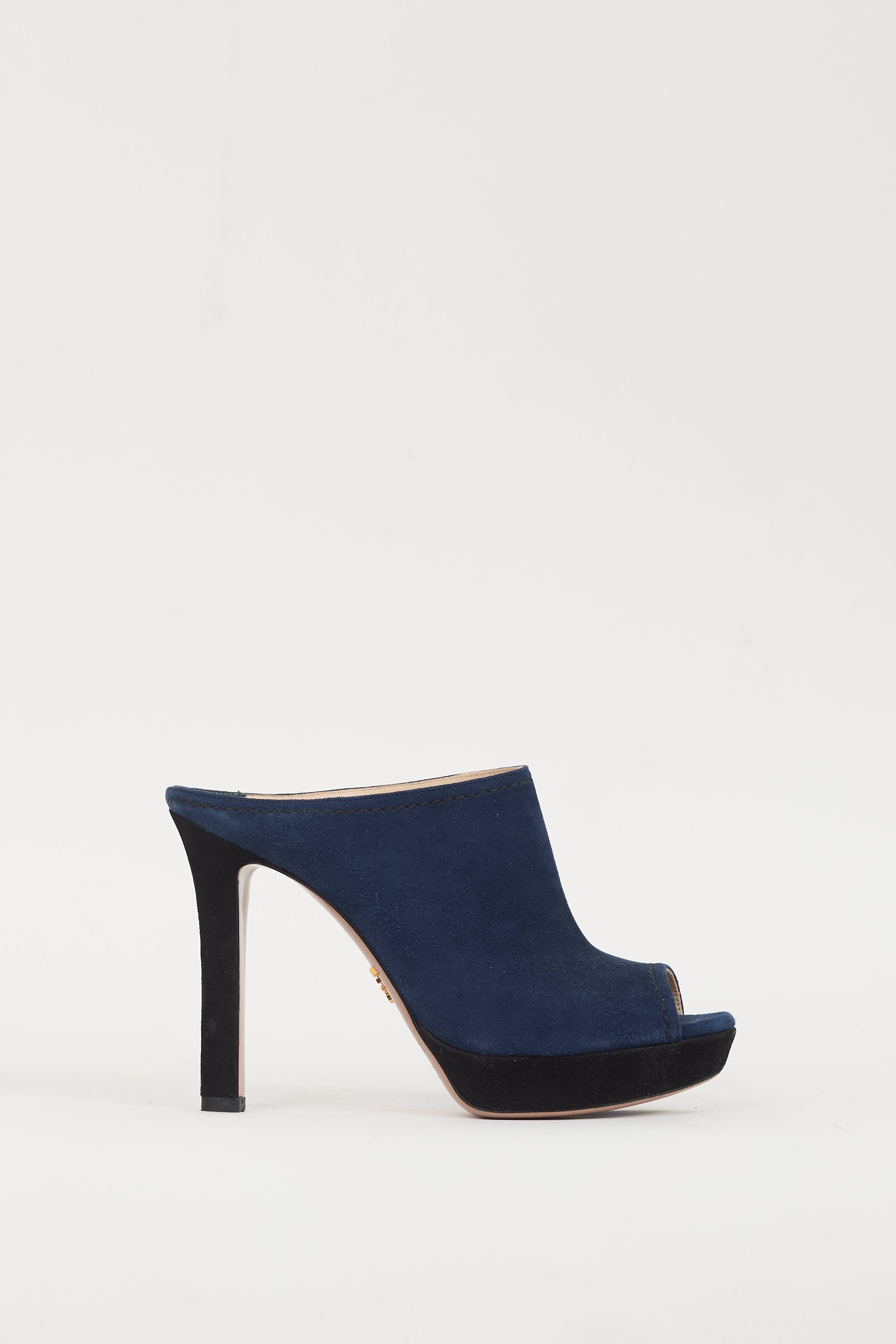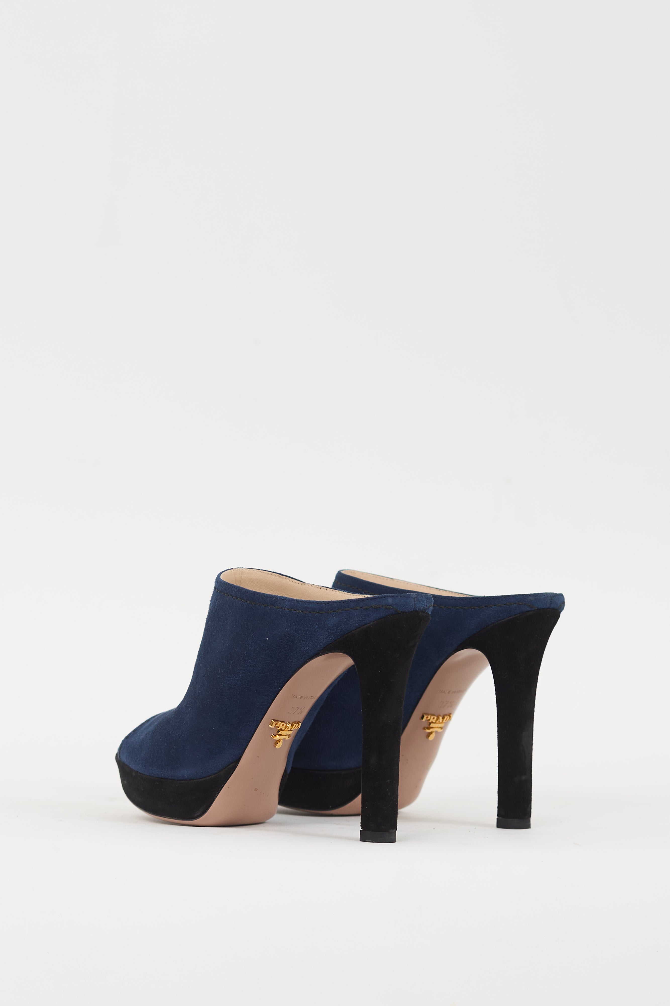 Pre-owned Prada navy suede mules featuring a pointed peep toe, black wrapped stiletto heel and platform midsole, and slip on entry.