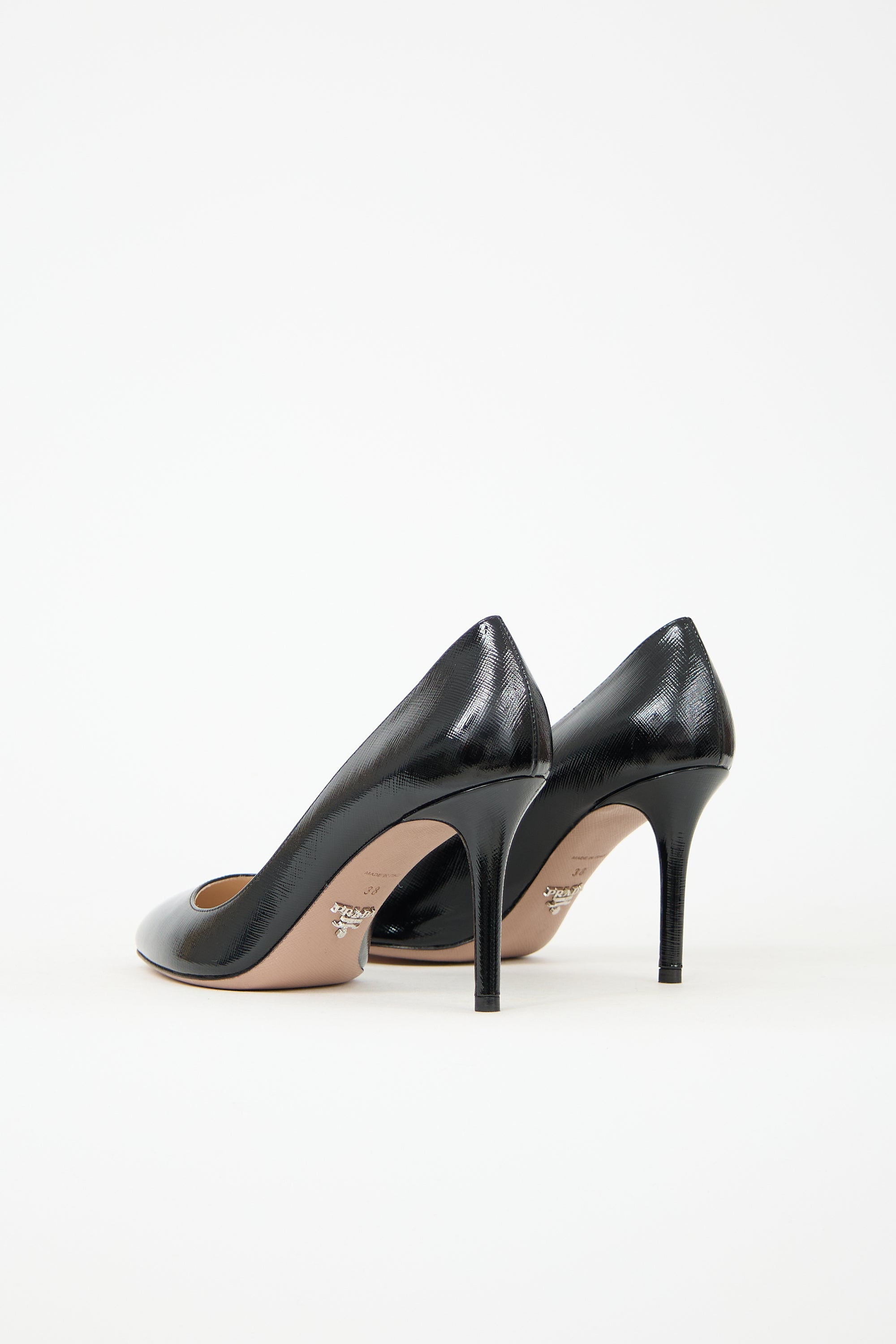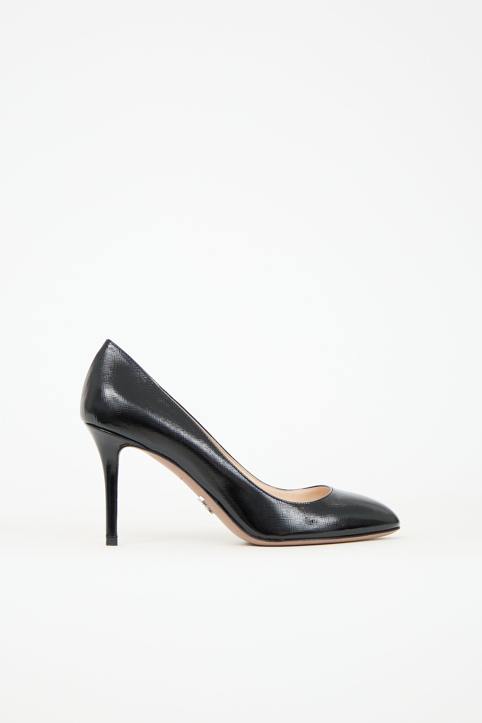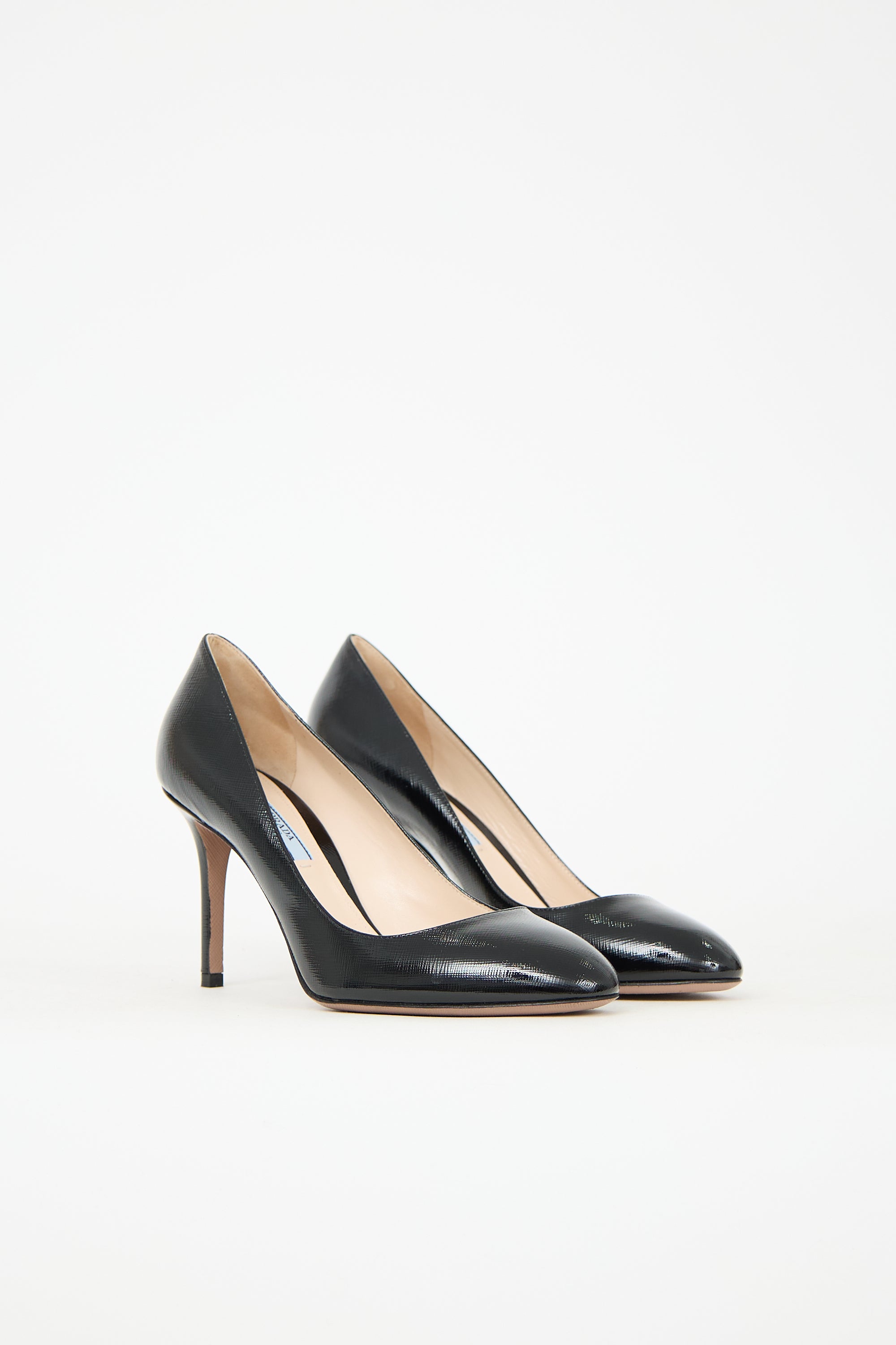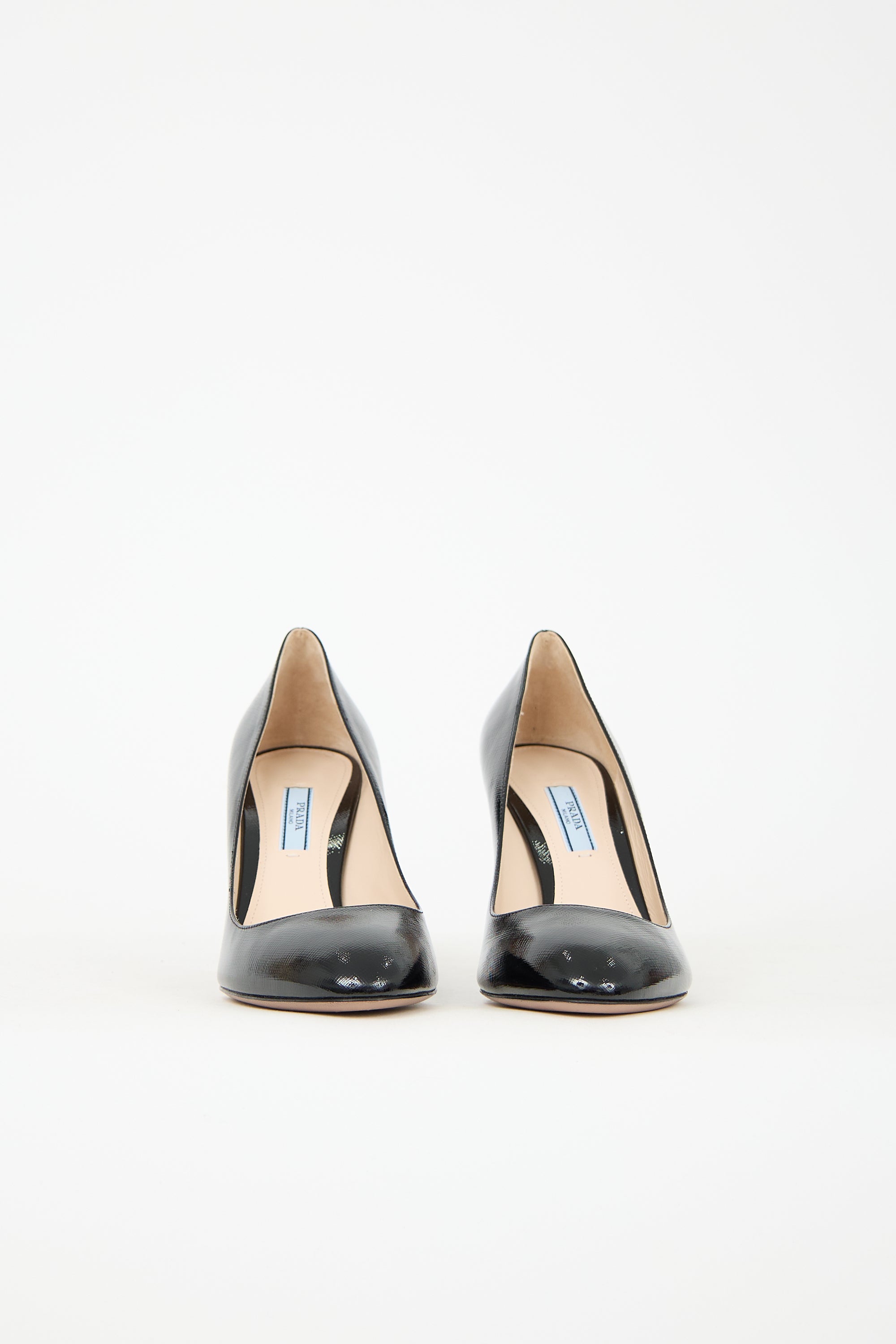 Pre-owned Prada black patent leather pumps featuring a rounded toe, slip on entry, and covered stiletto heel. Includes original dust bags.