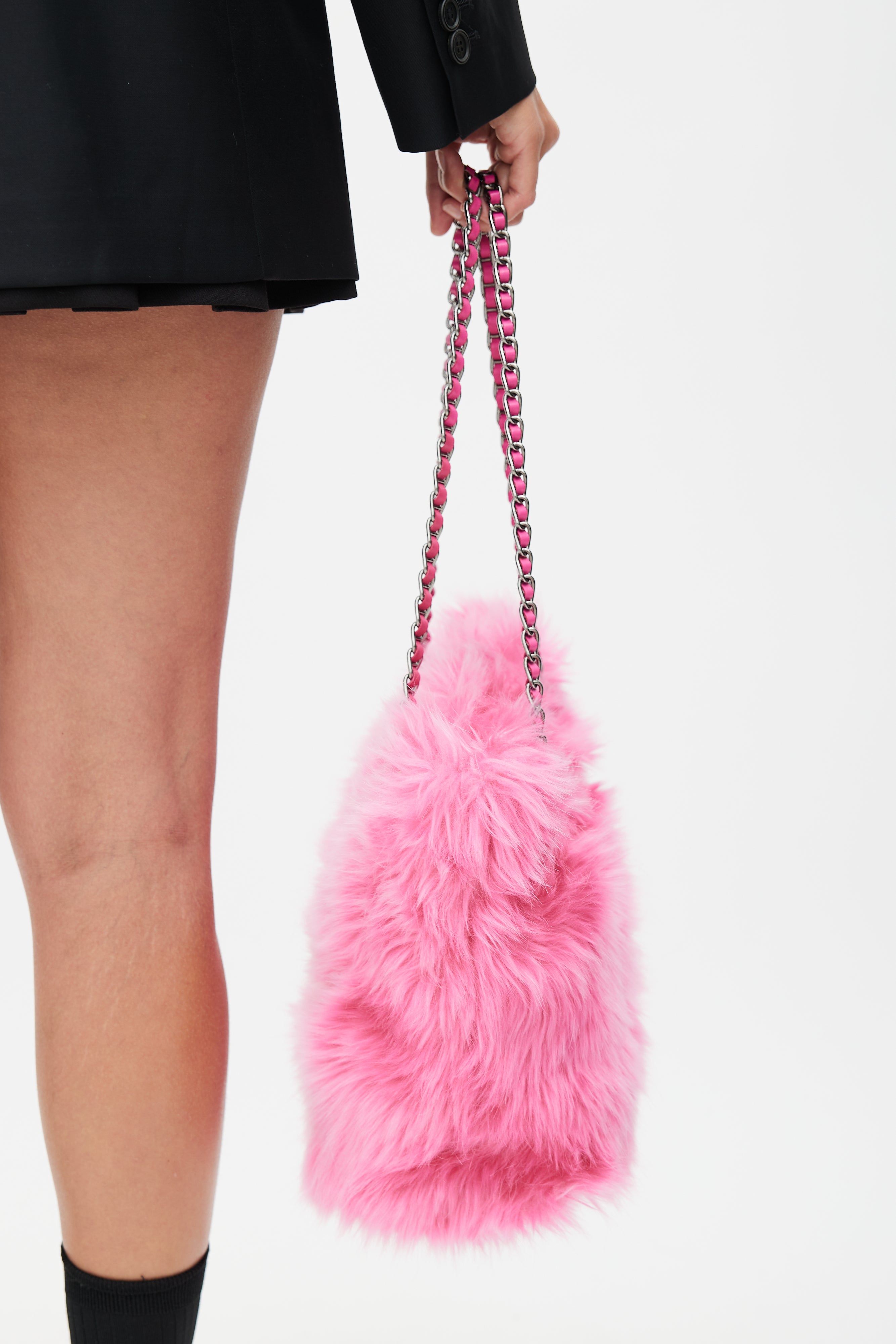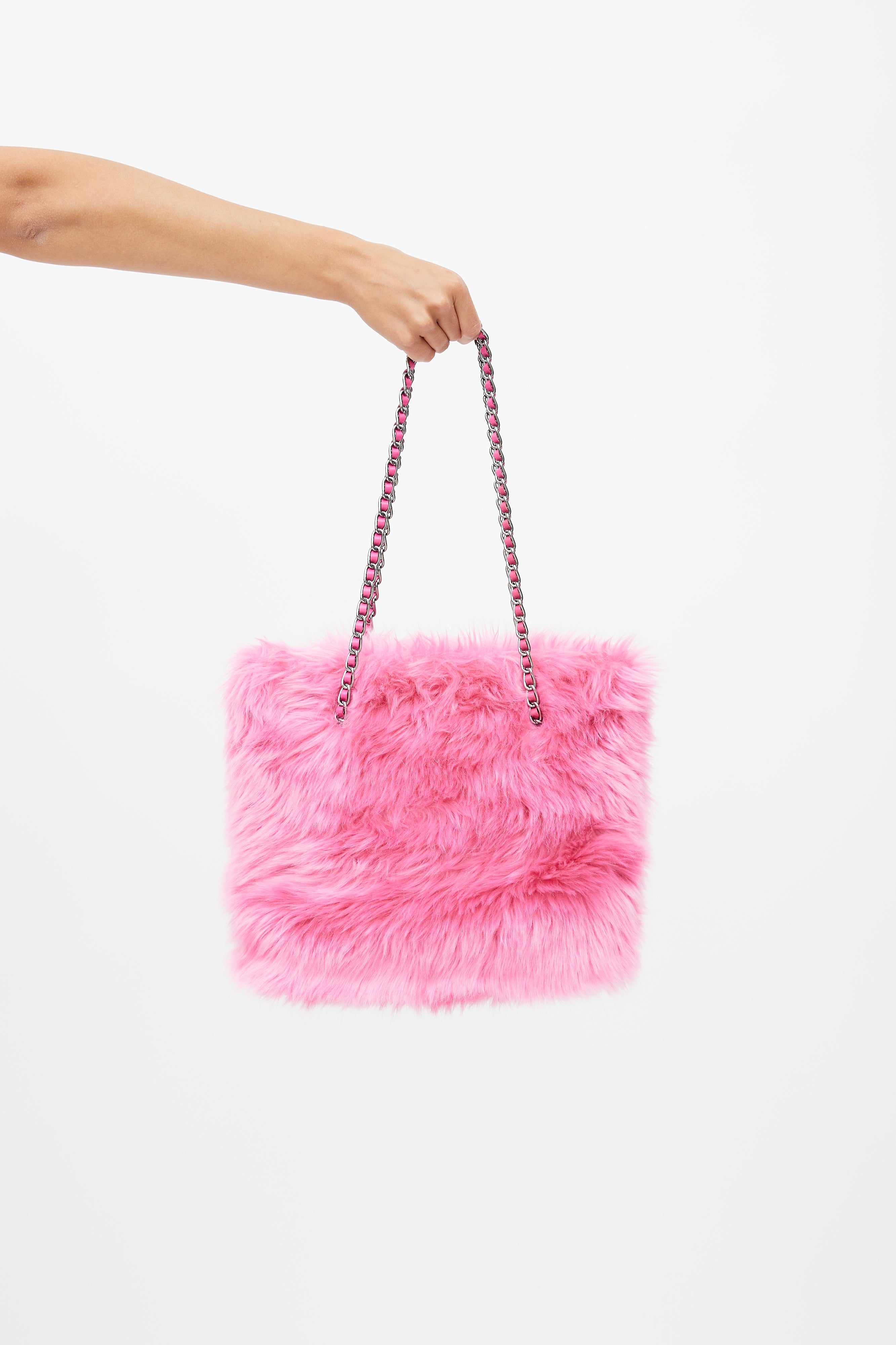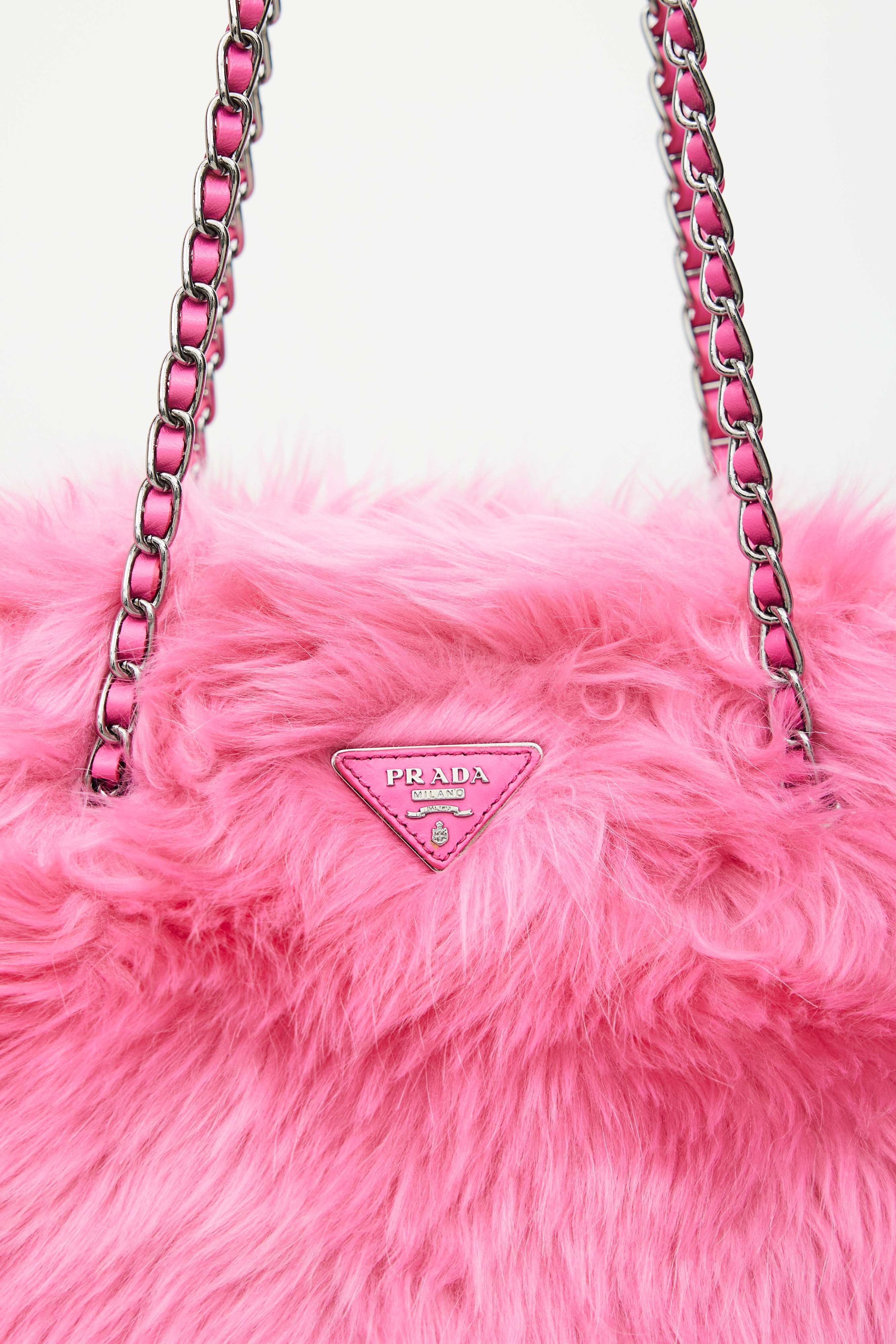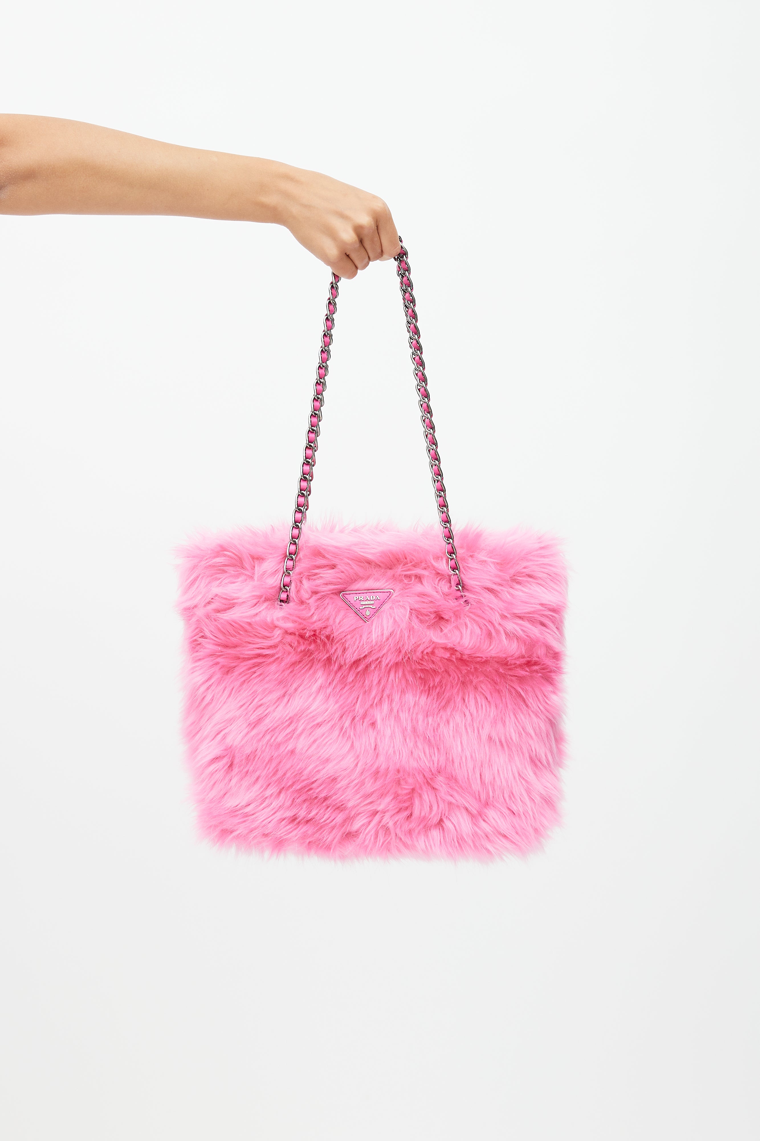 Pre-owned Prada pink Eco Pelliccia furry tote bag featuring pink leather chain straps, triangle logo emblem on front, protective feet at base, magnetic snap top closure, textile lined interior with two zip pockets, and three flat pockets.