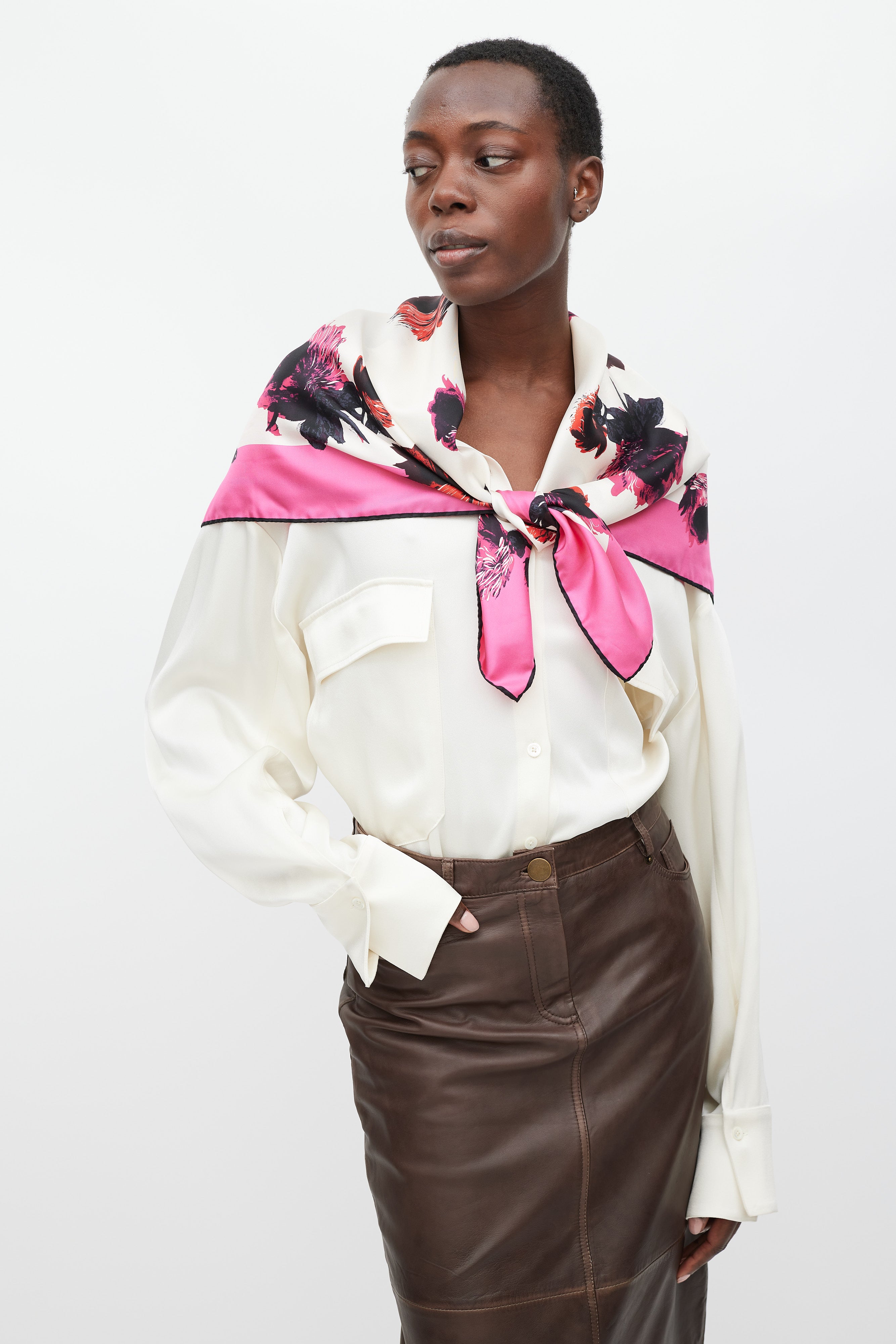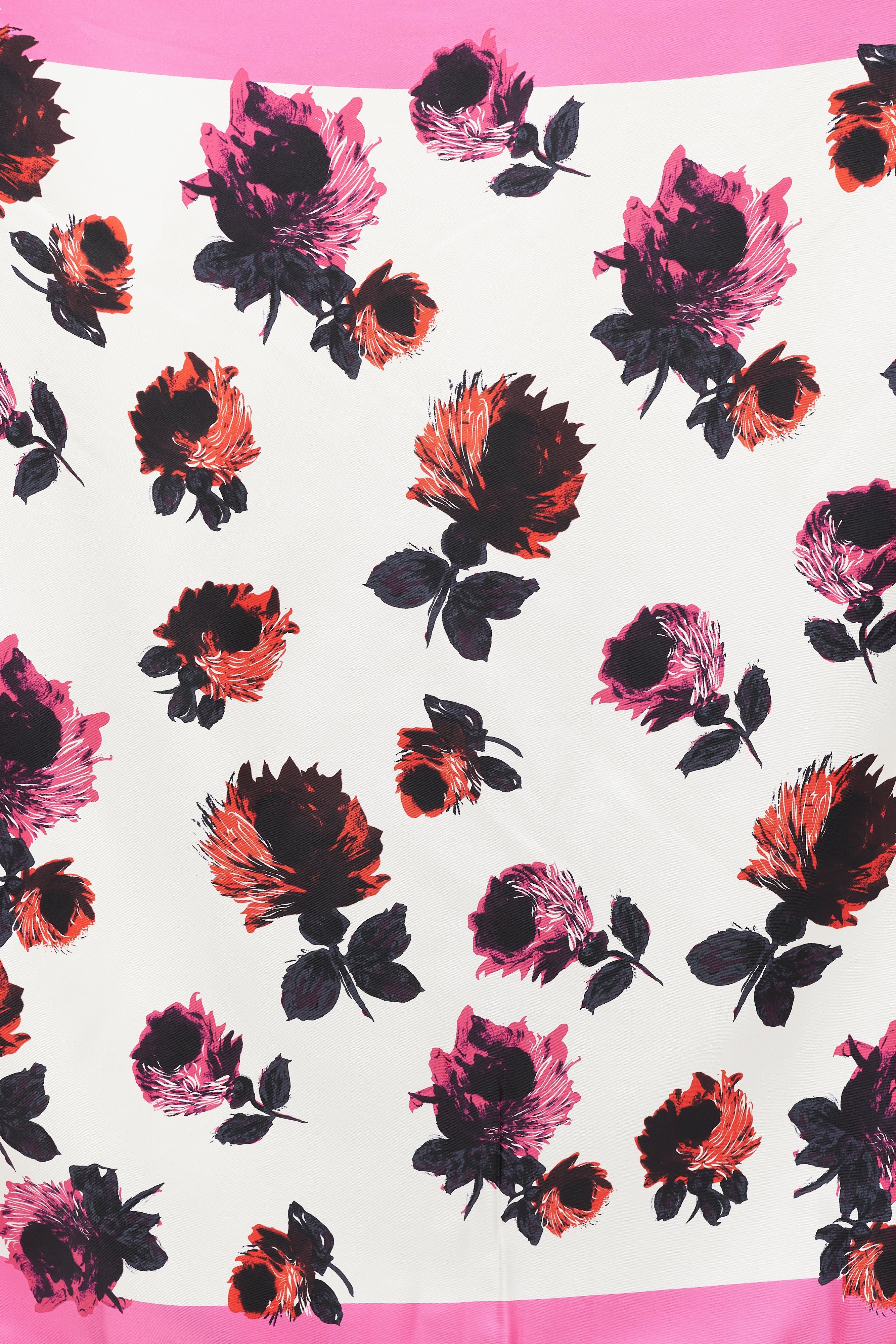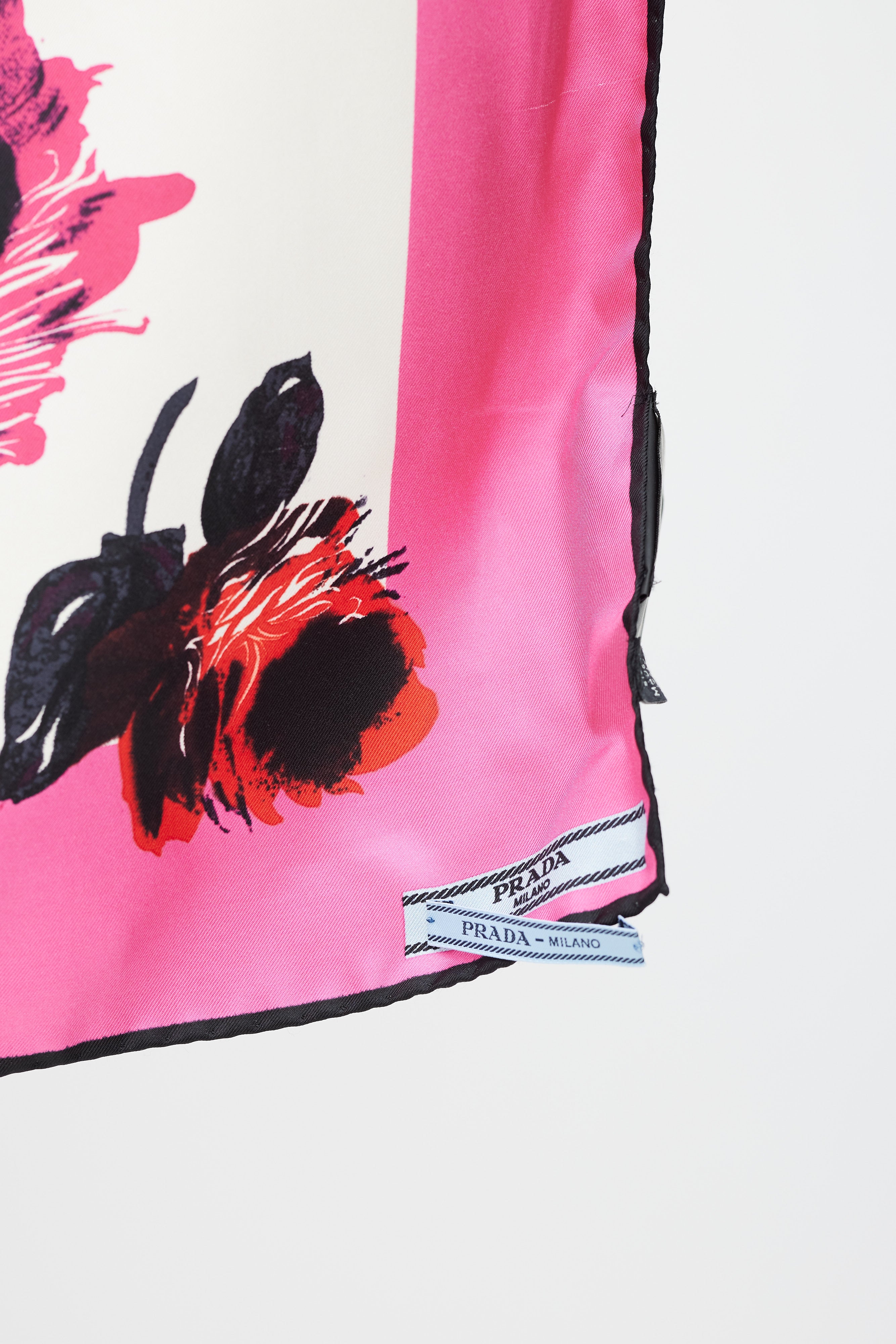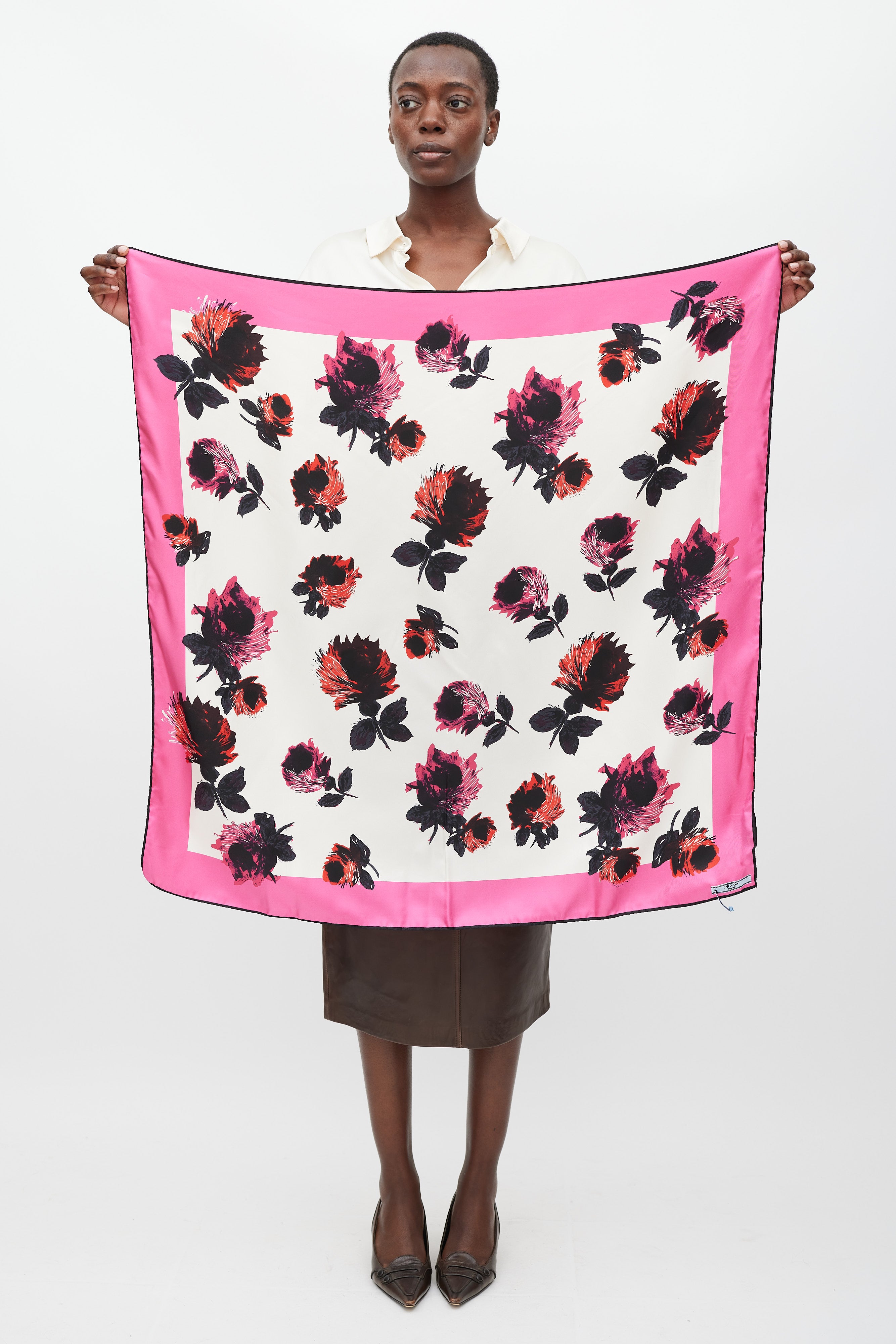Pre-owned Prada pink and multicolour scarf featuring a floral print throughout, rolled edges, and signature logo label printed at bottom right corner. Comes with original box.