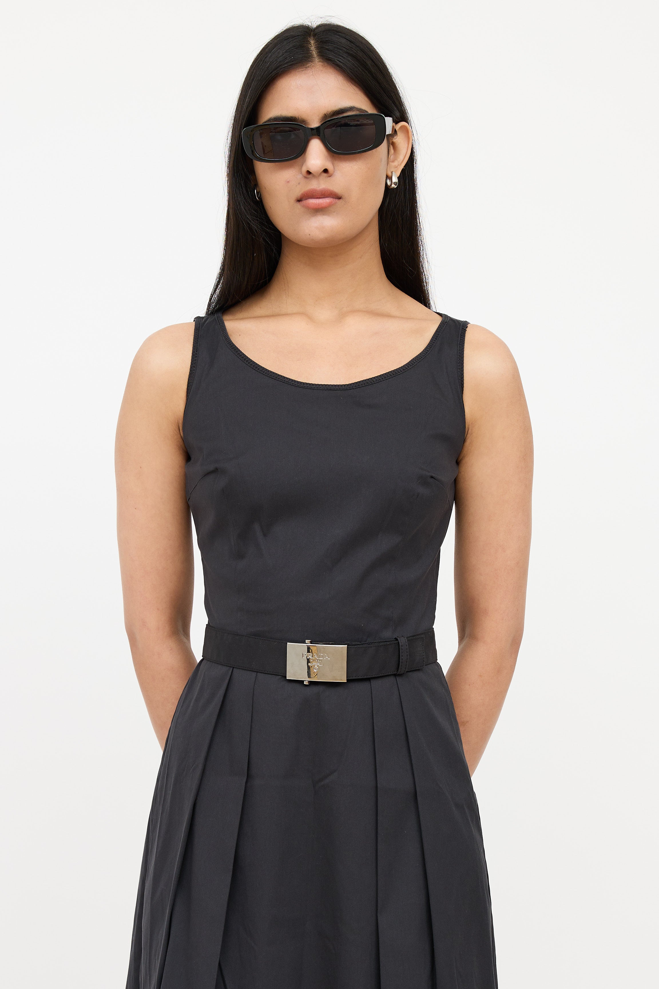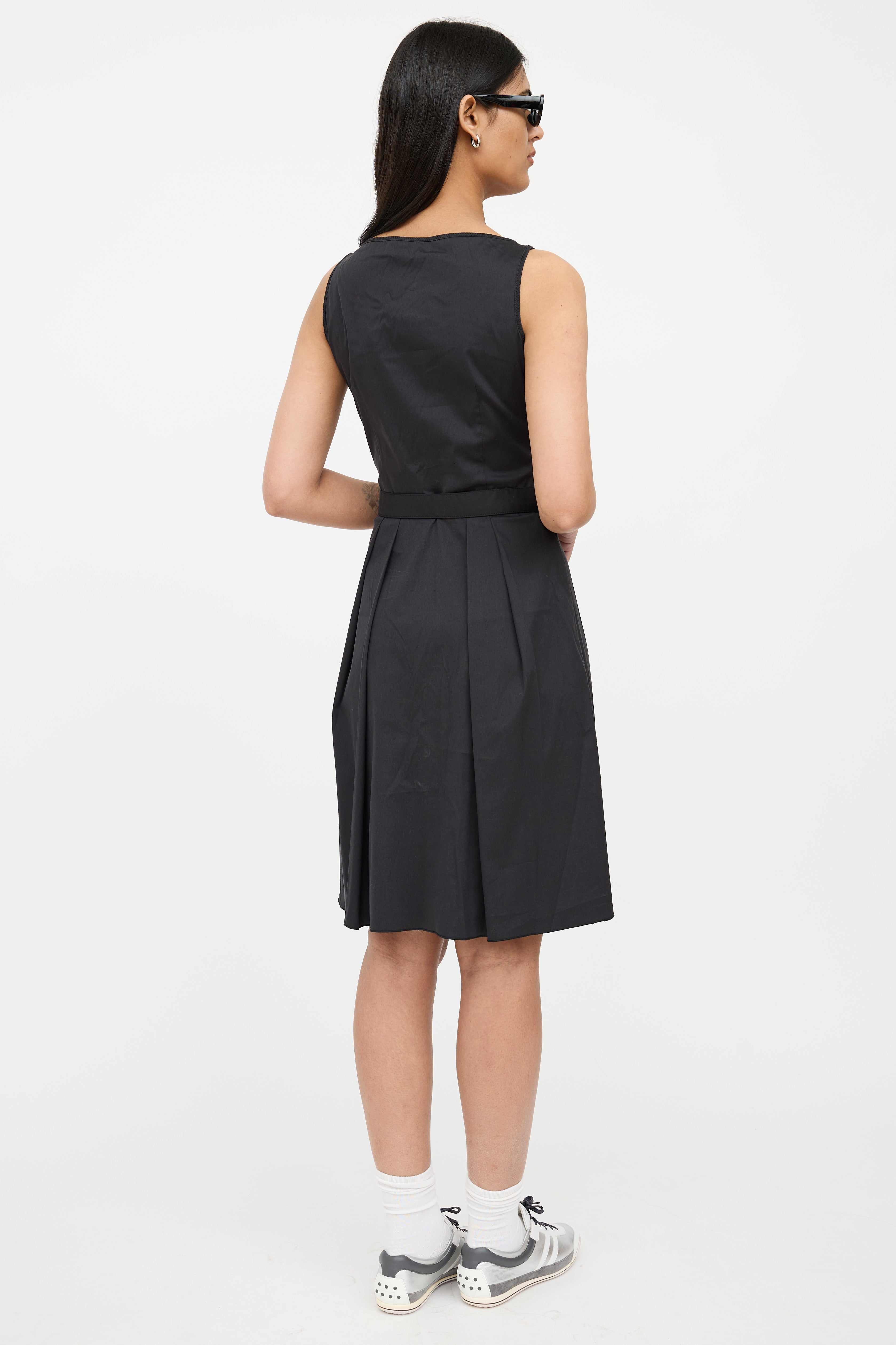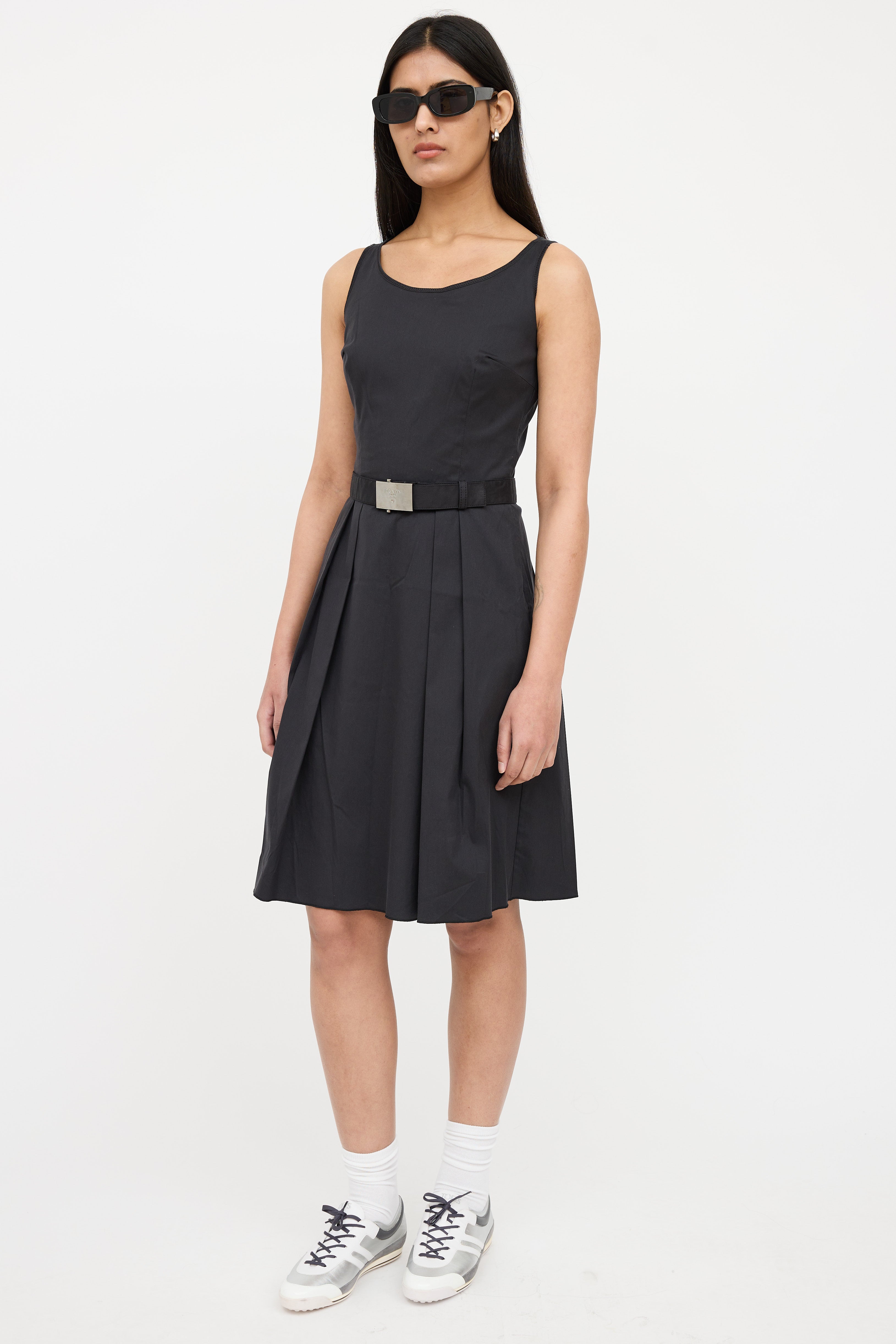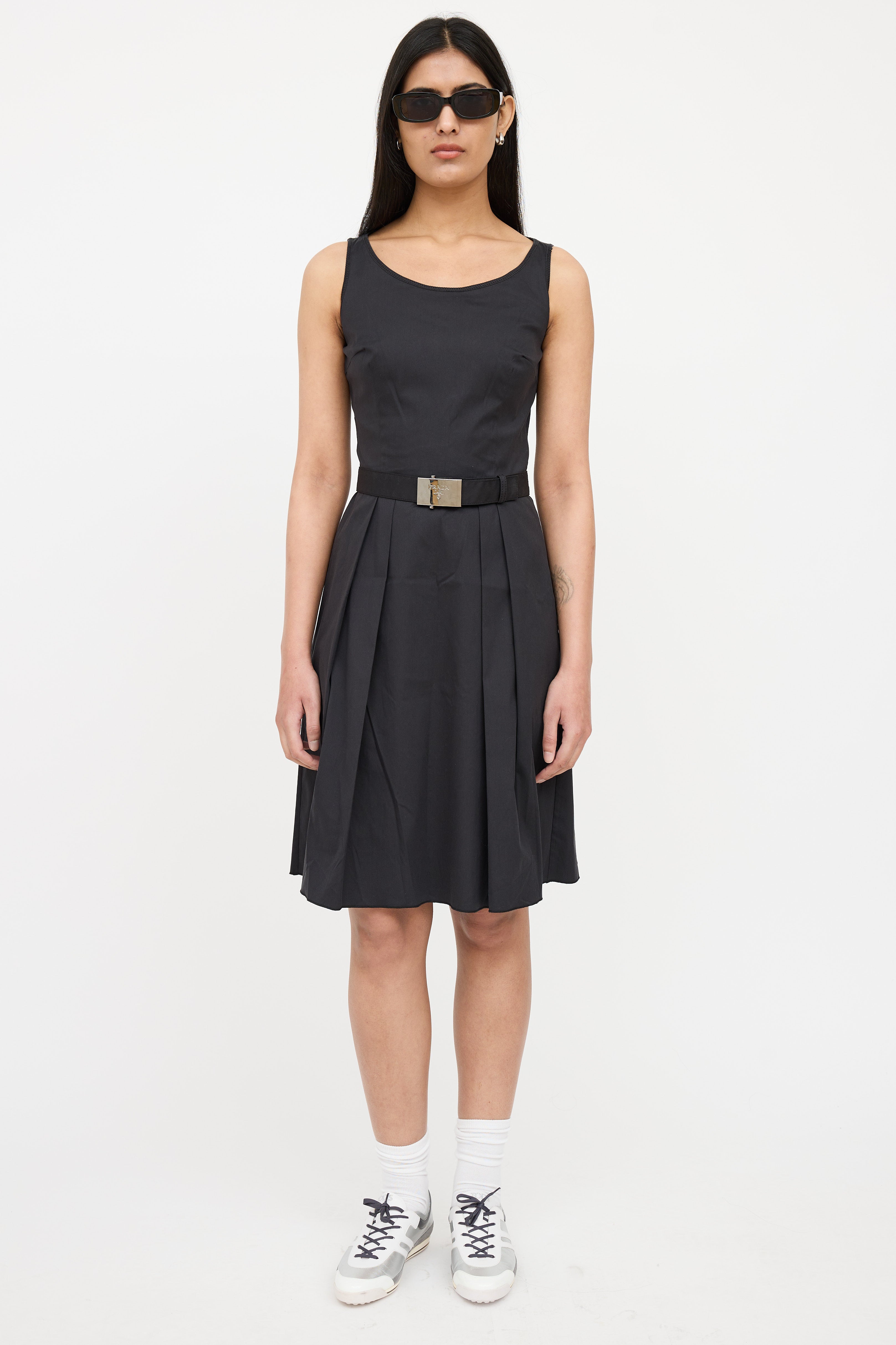 Pre-owned Prada Sport black 2007 sleeveless dress featuring round neck, pleated skirt and side zip entry and removeable belt with silver tone logo stamped buckle.