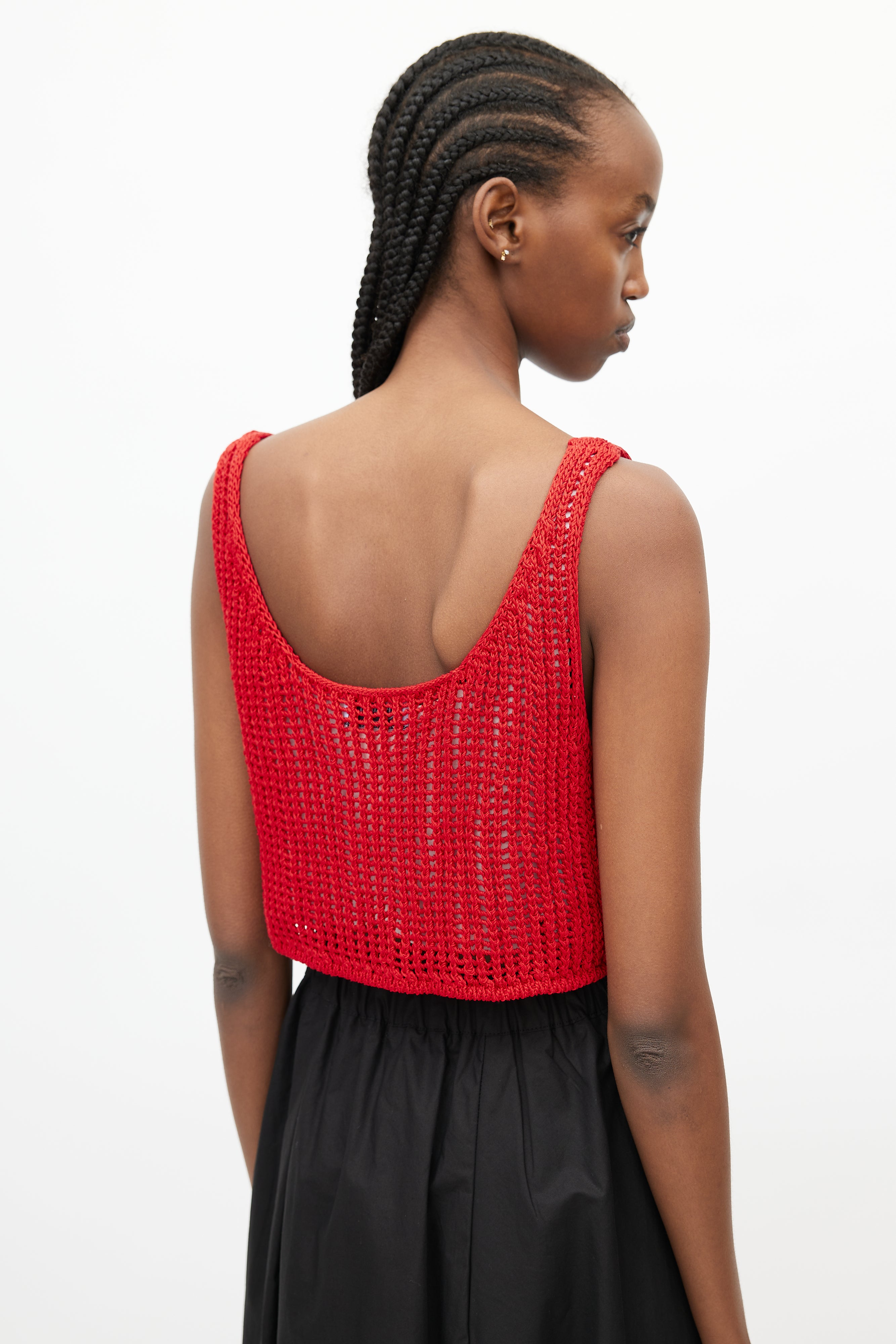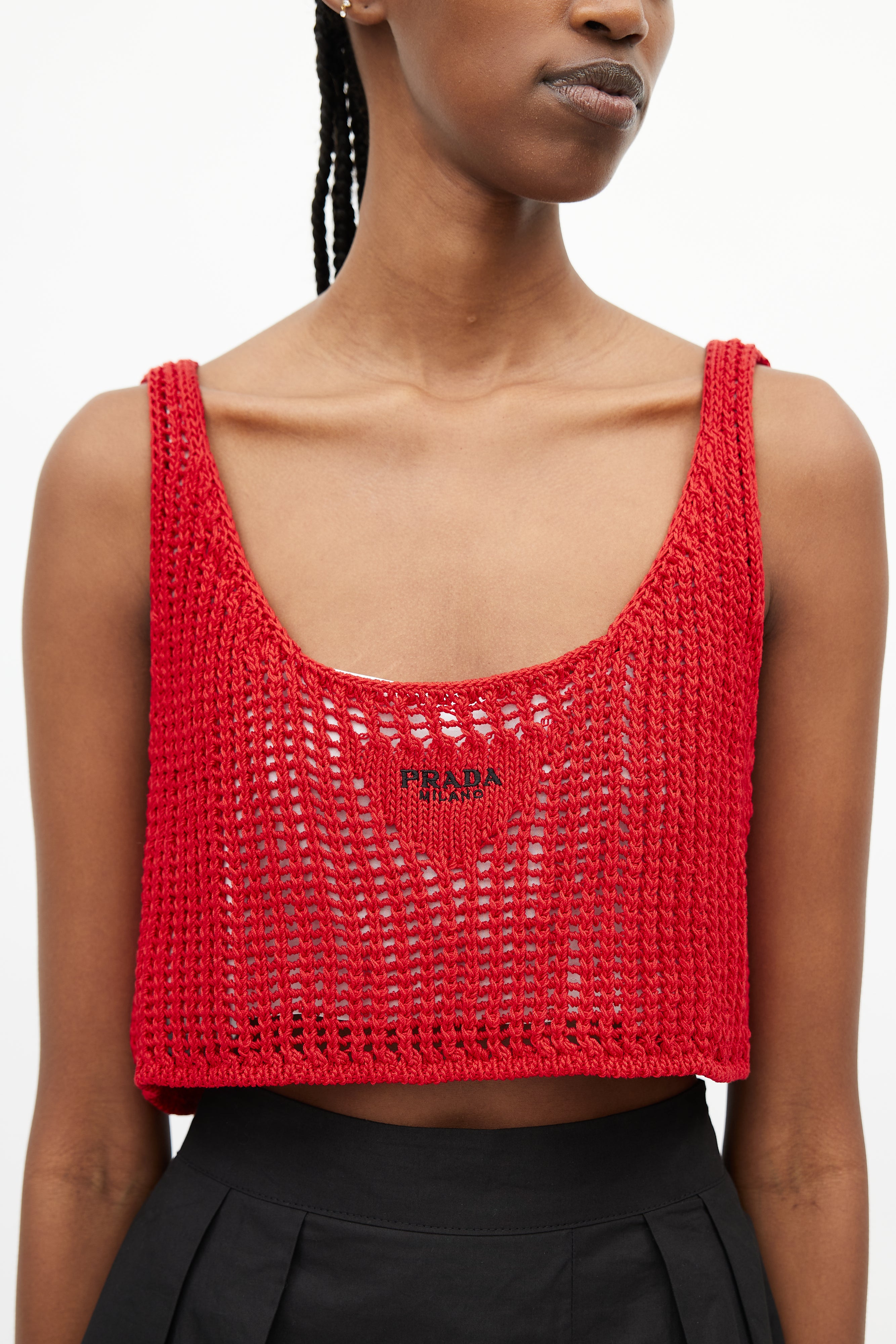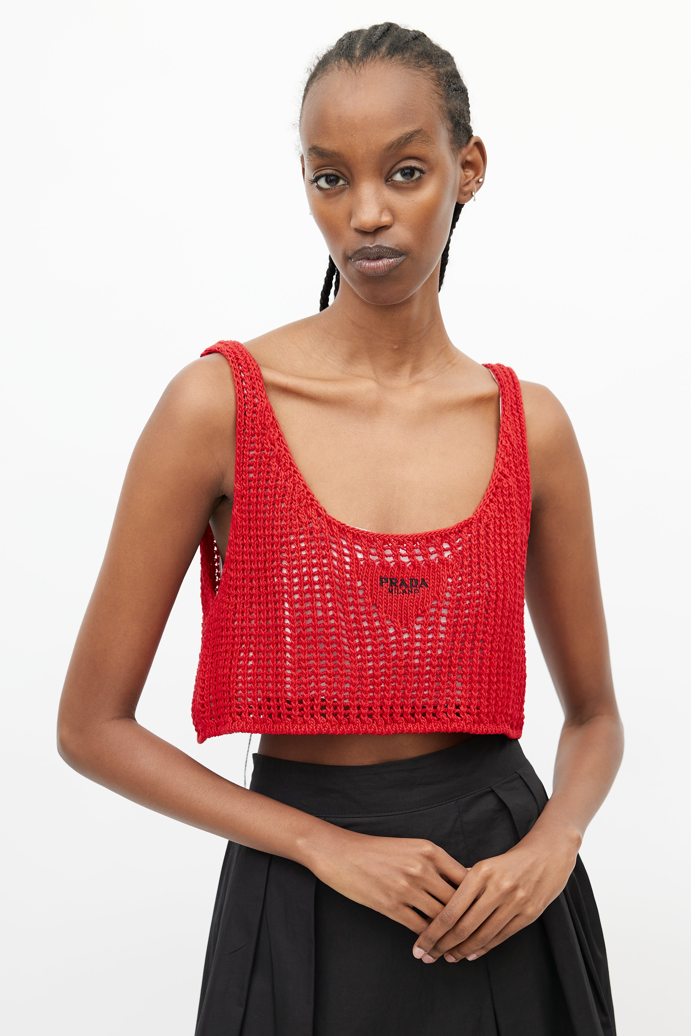 Pre-owned Prada red top featuring fixed shoulder straps, crew neckline, black logo intarsia, and crochet mesh. Comes with attached white tank underneath.