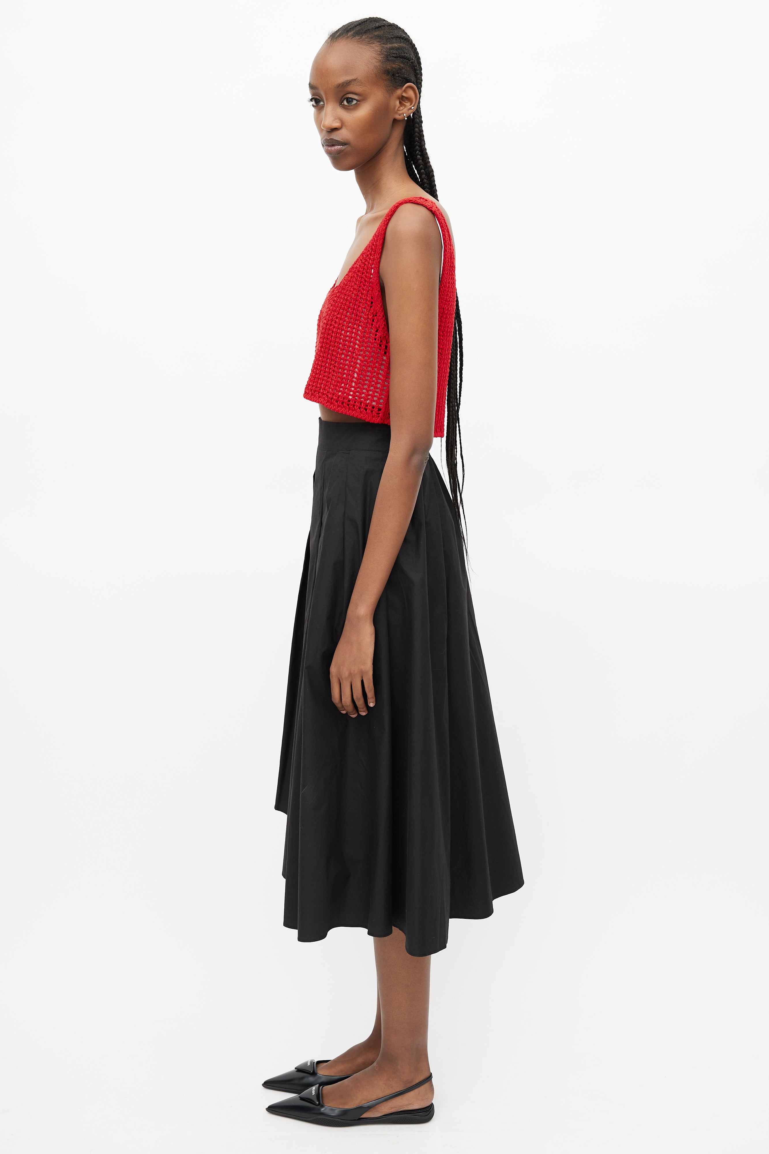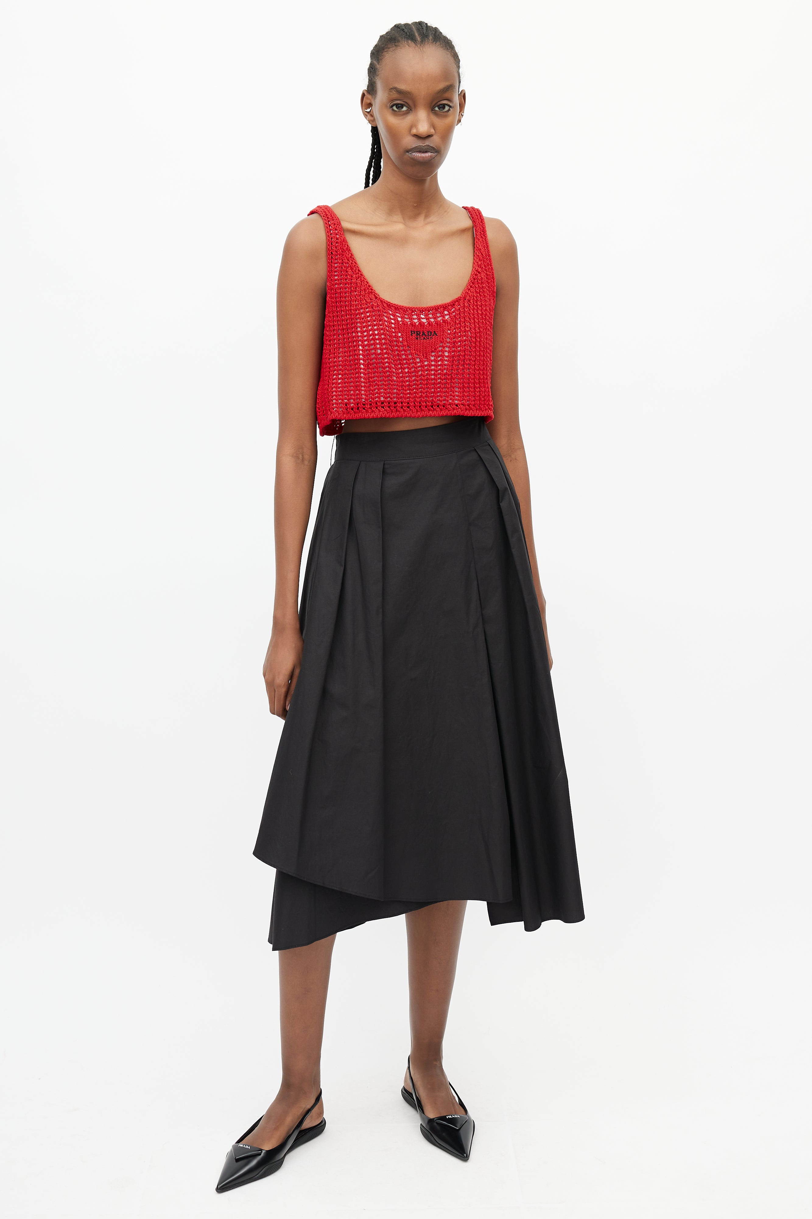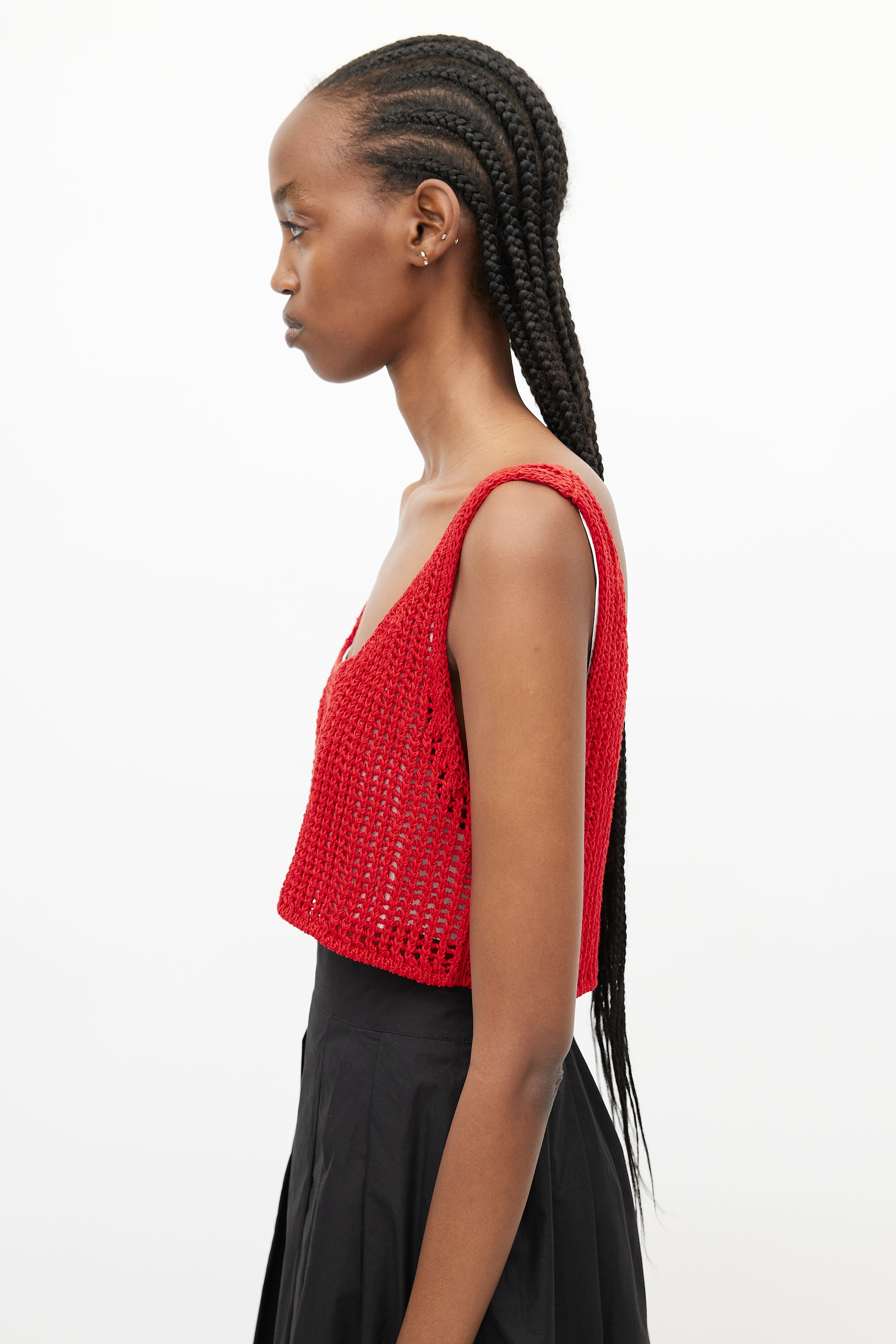 Pre-owned Prada red top featuring fixed shoulder straps, crew neckline, black logo intarsia, and crochet mesh. Comes with attached white tank underneath.