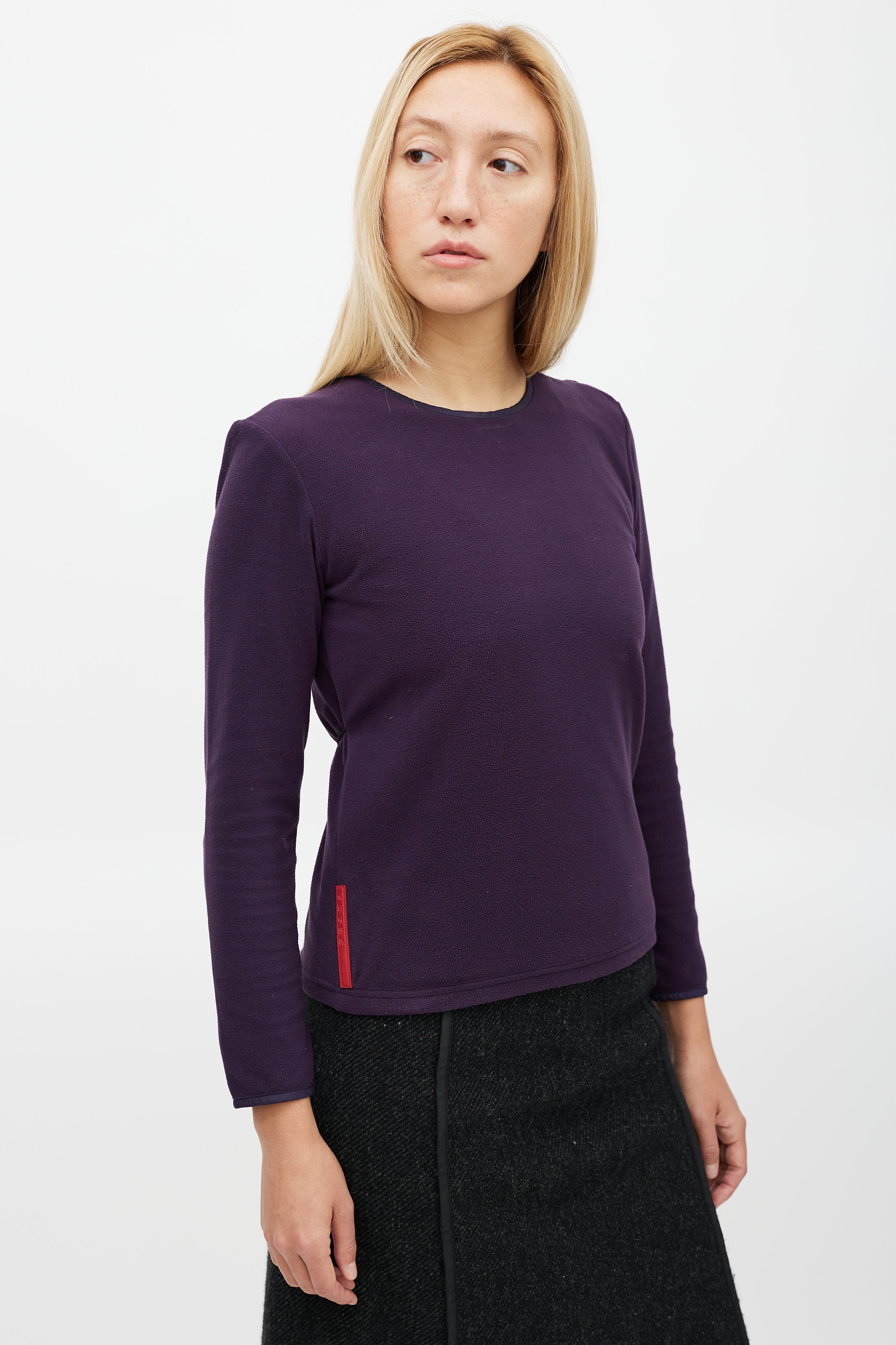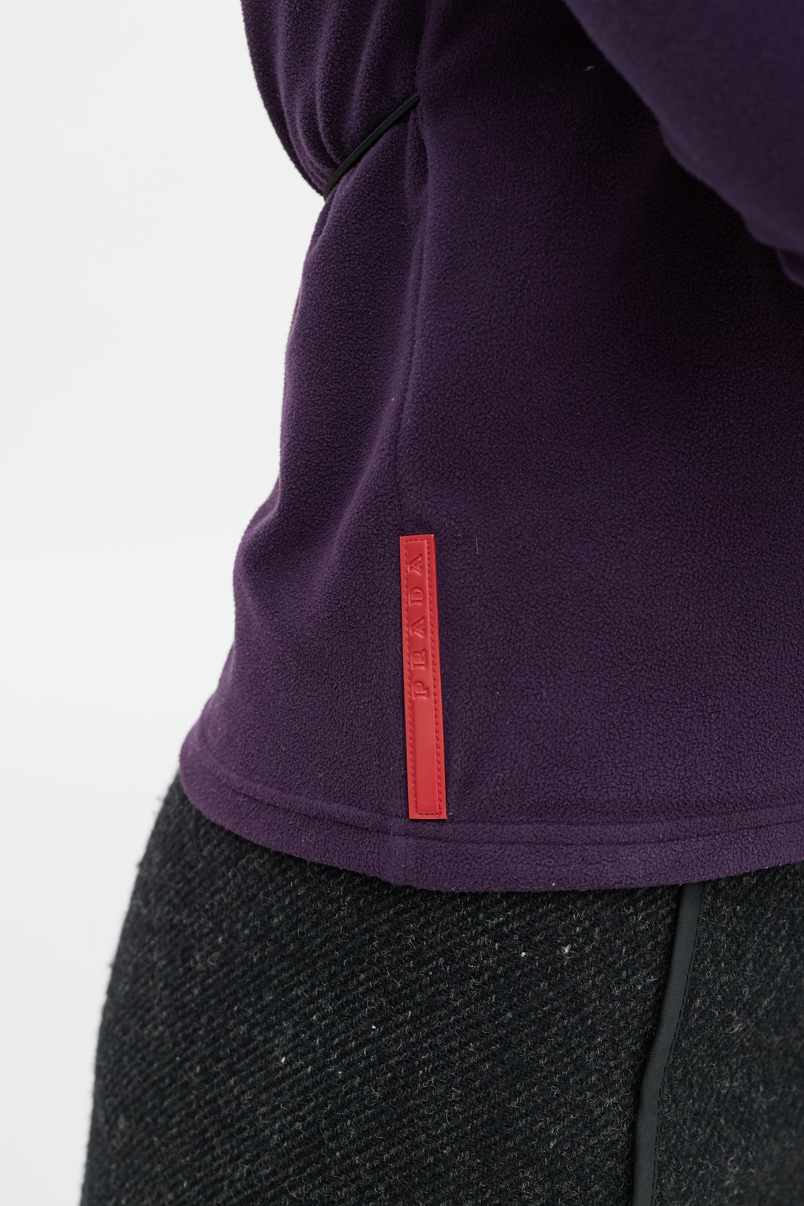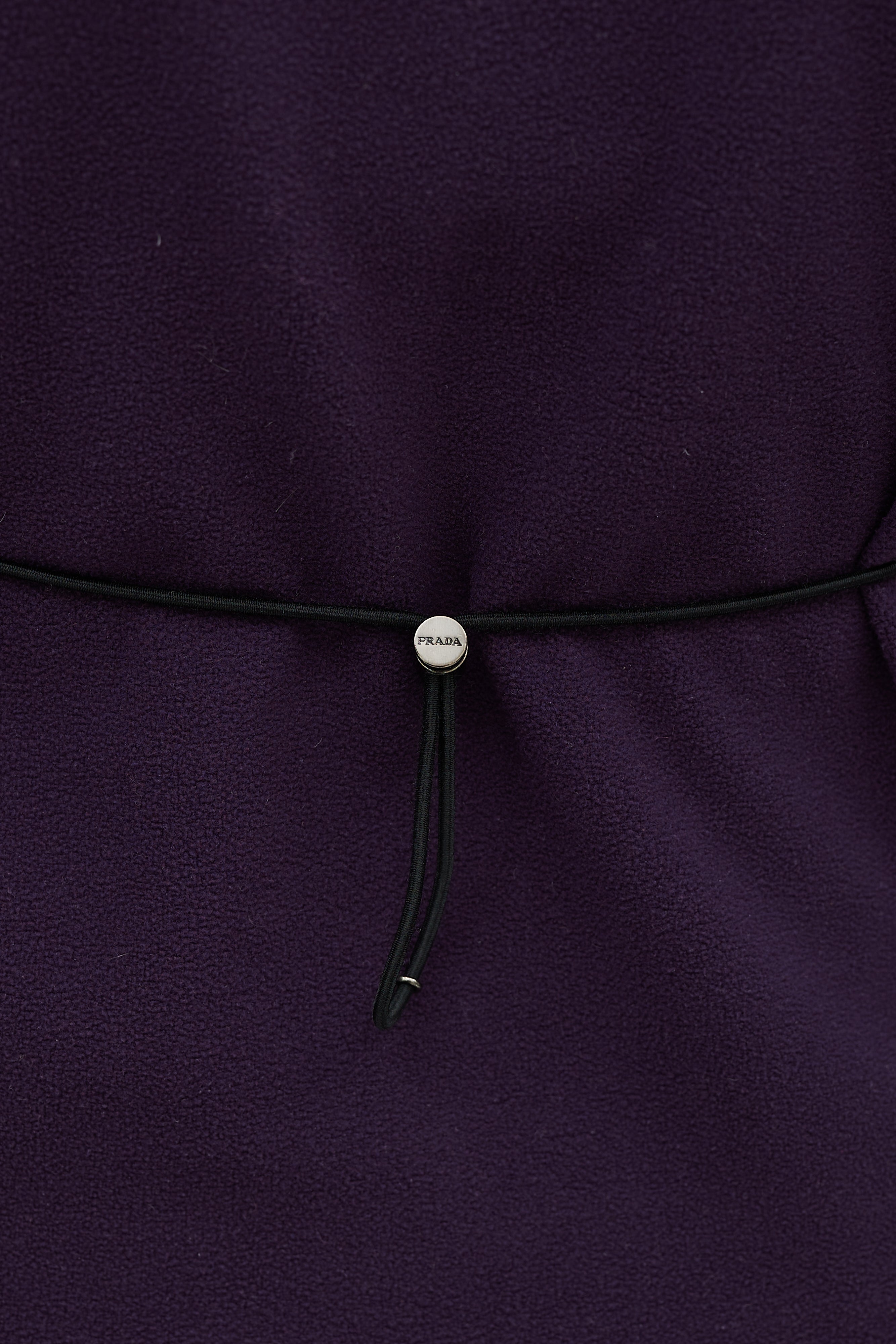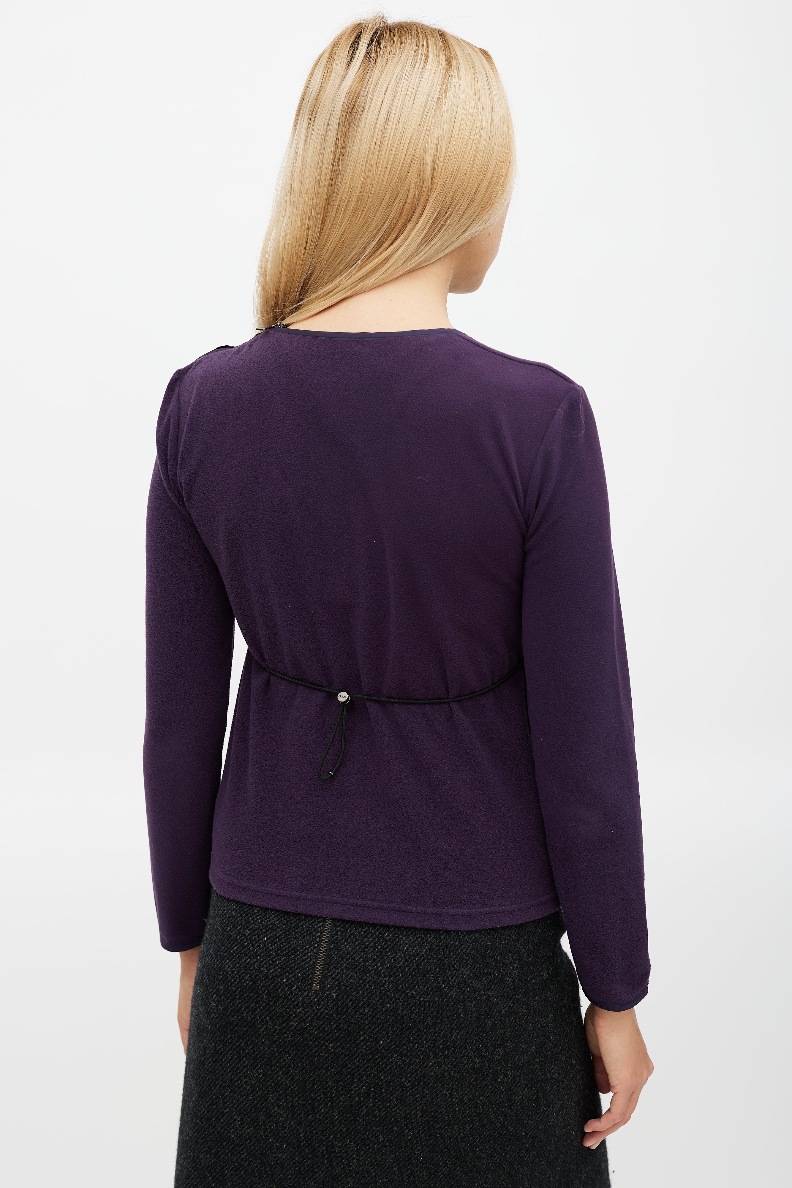 Pre-owned Prada Sport purple fleece top featuring a round neckline, zip detail at shoulder, rubberized logo patch at hip, and toggle drawstring detail at back.