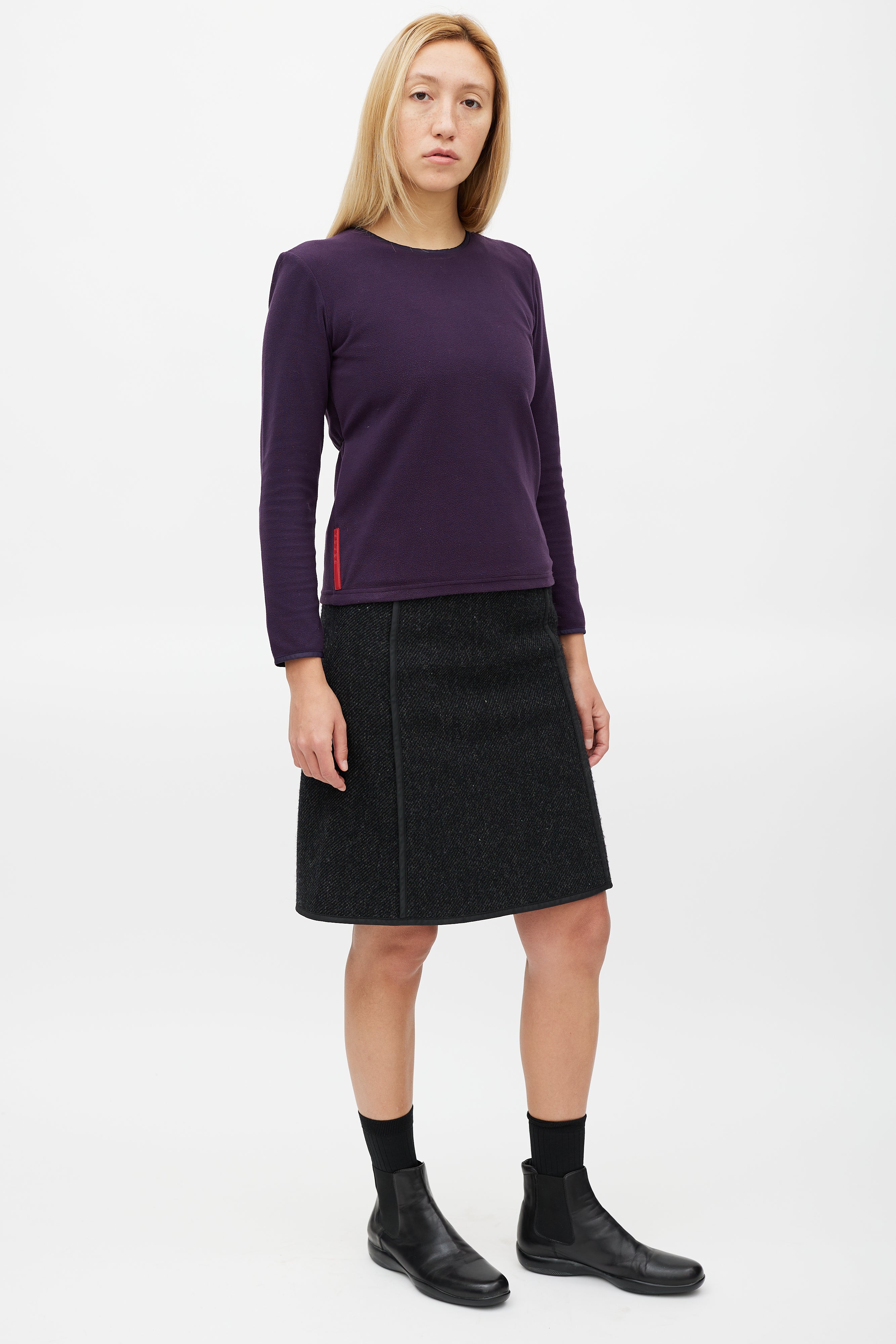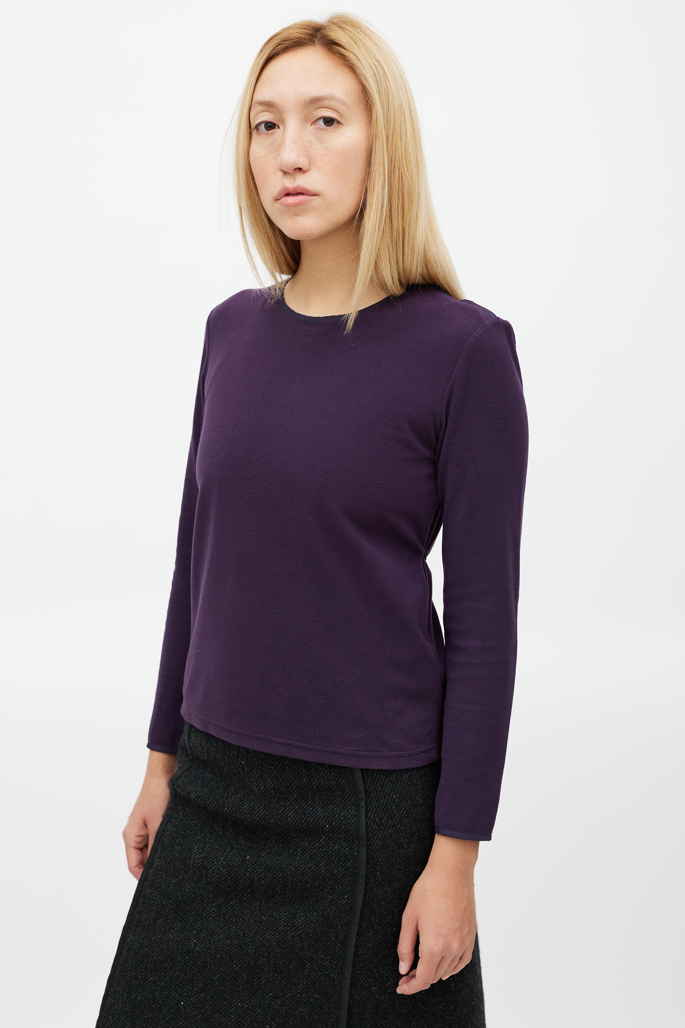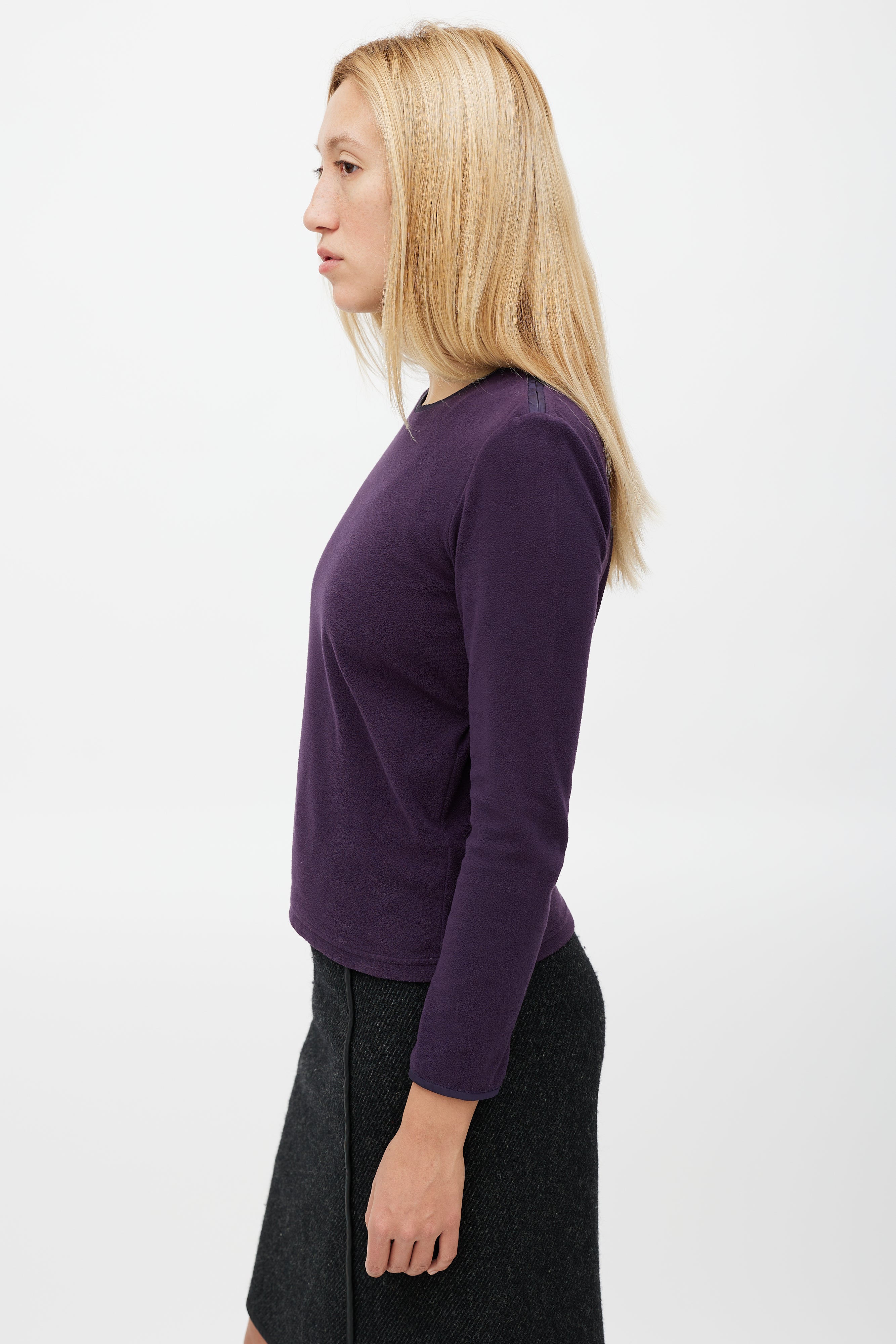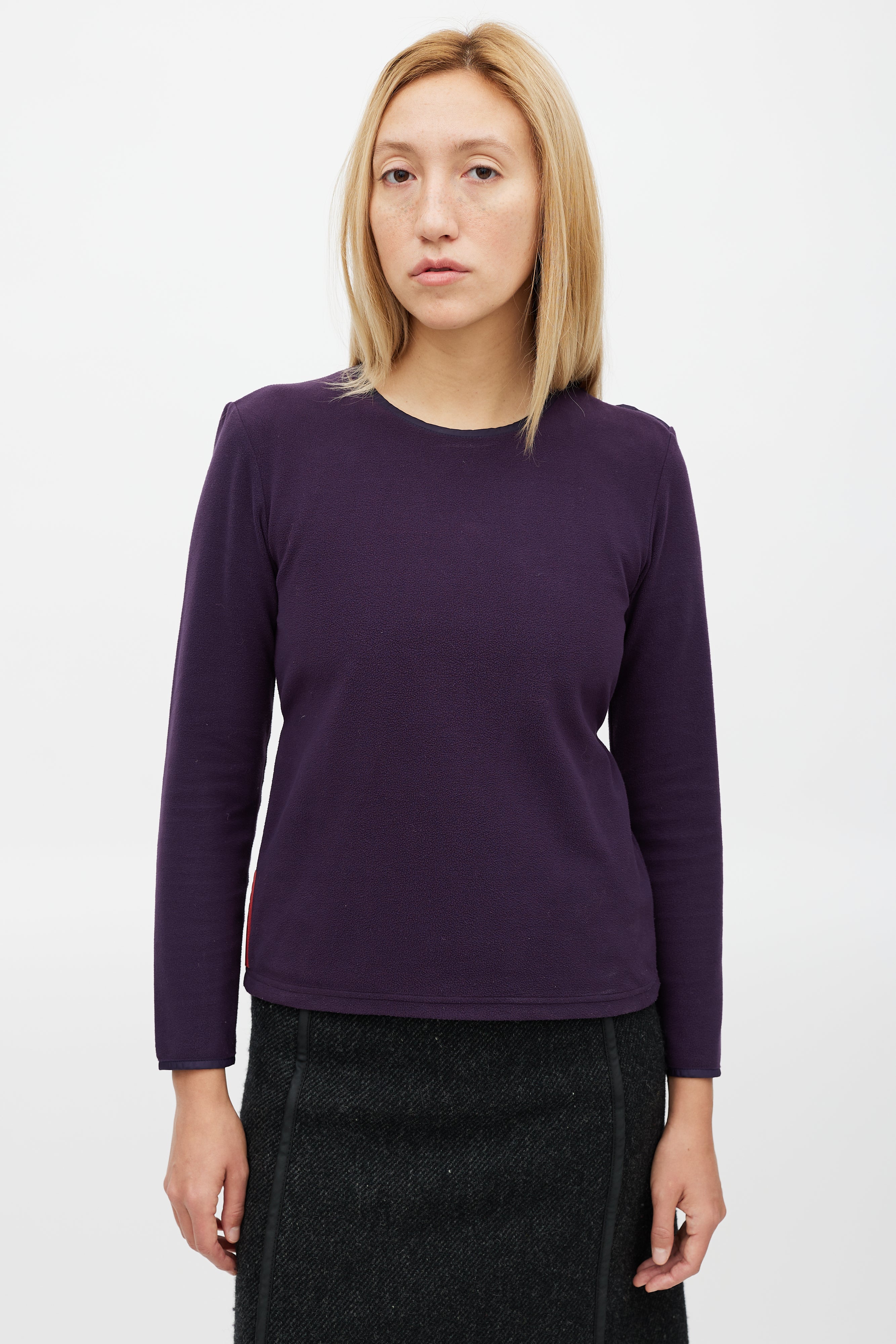 Pre-owned Prada Sport purple fleece top featuring a round neckline, zip detail at shoulder, rubberized logo patch at hip, and toggle drawstring detail at back.