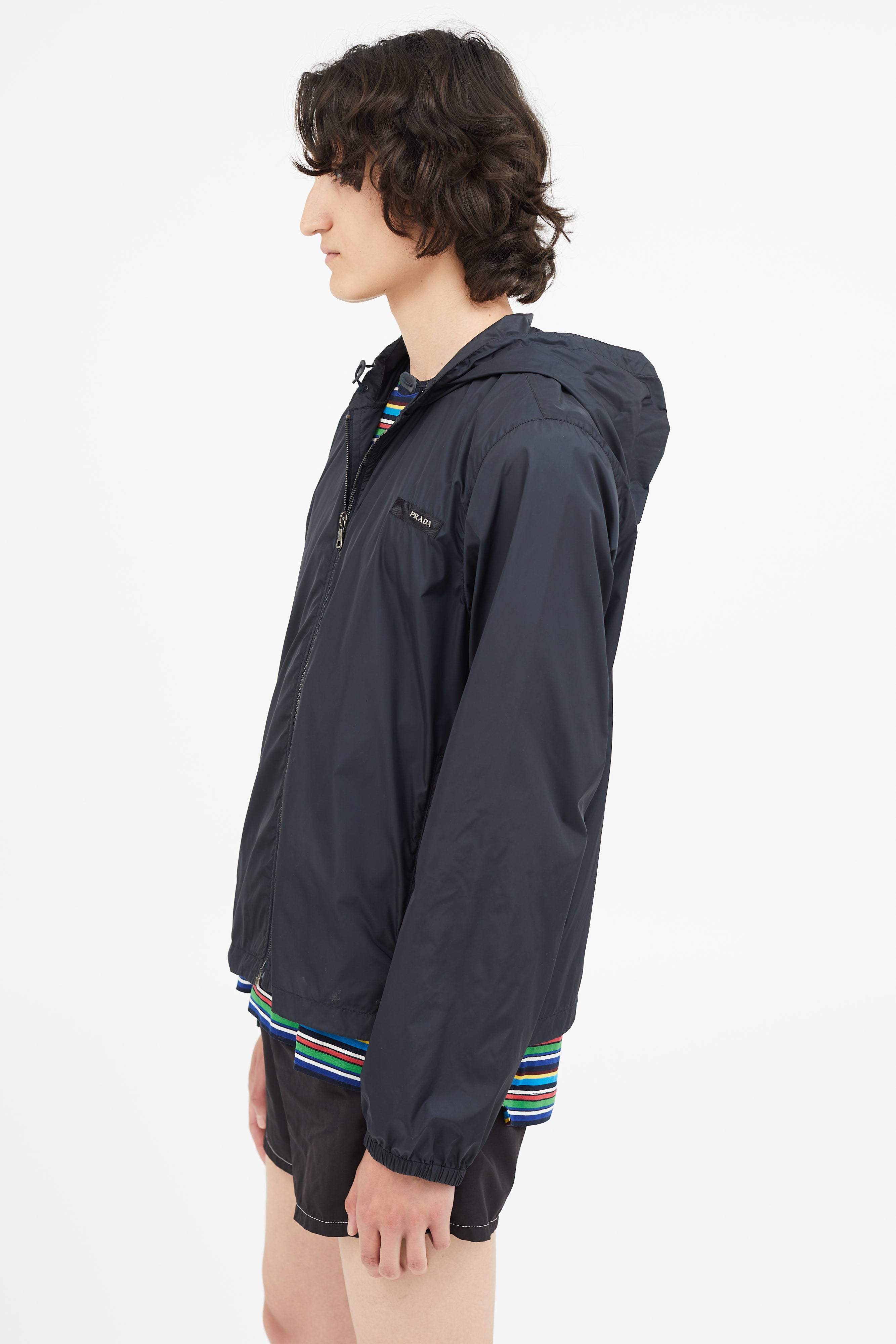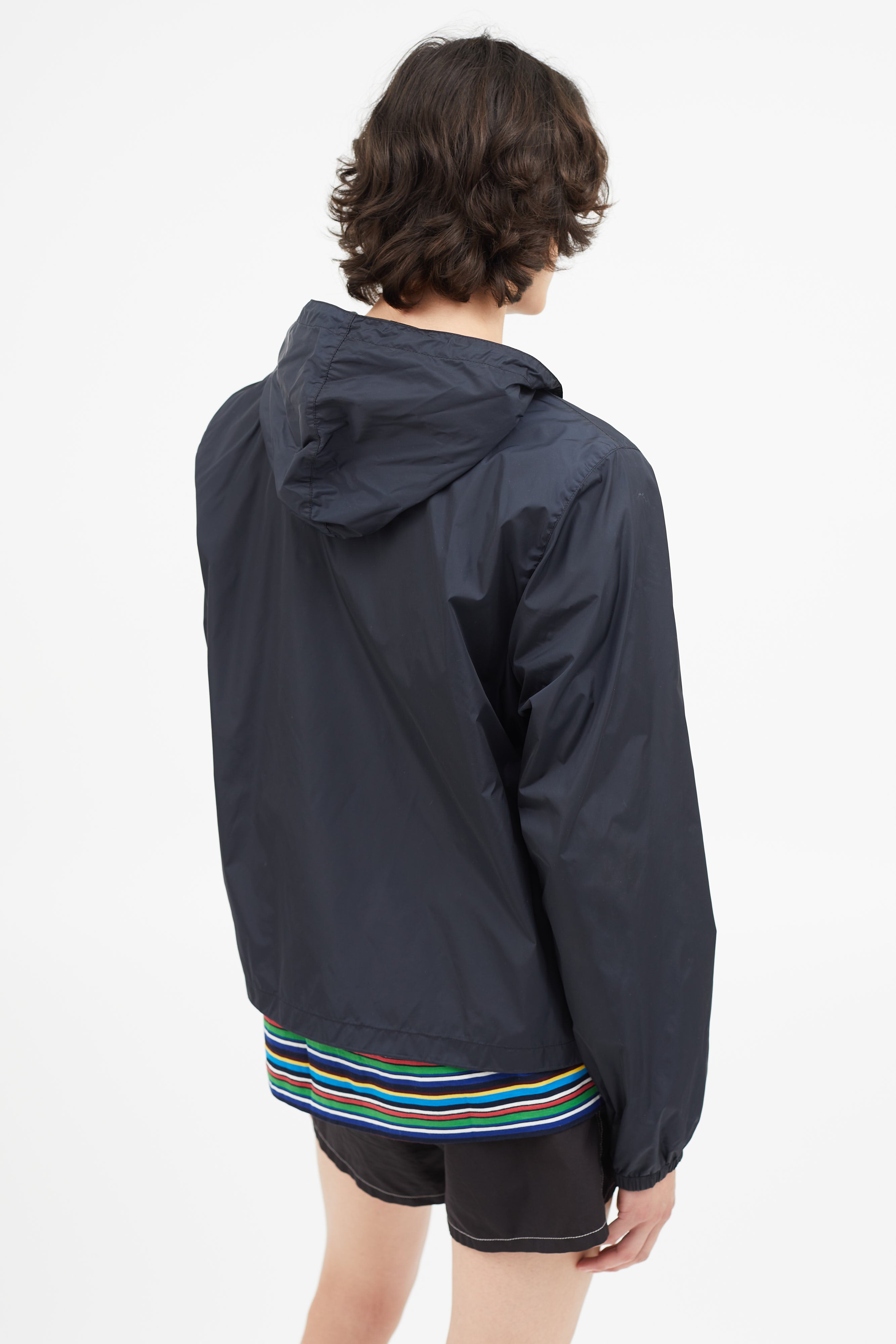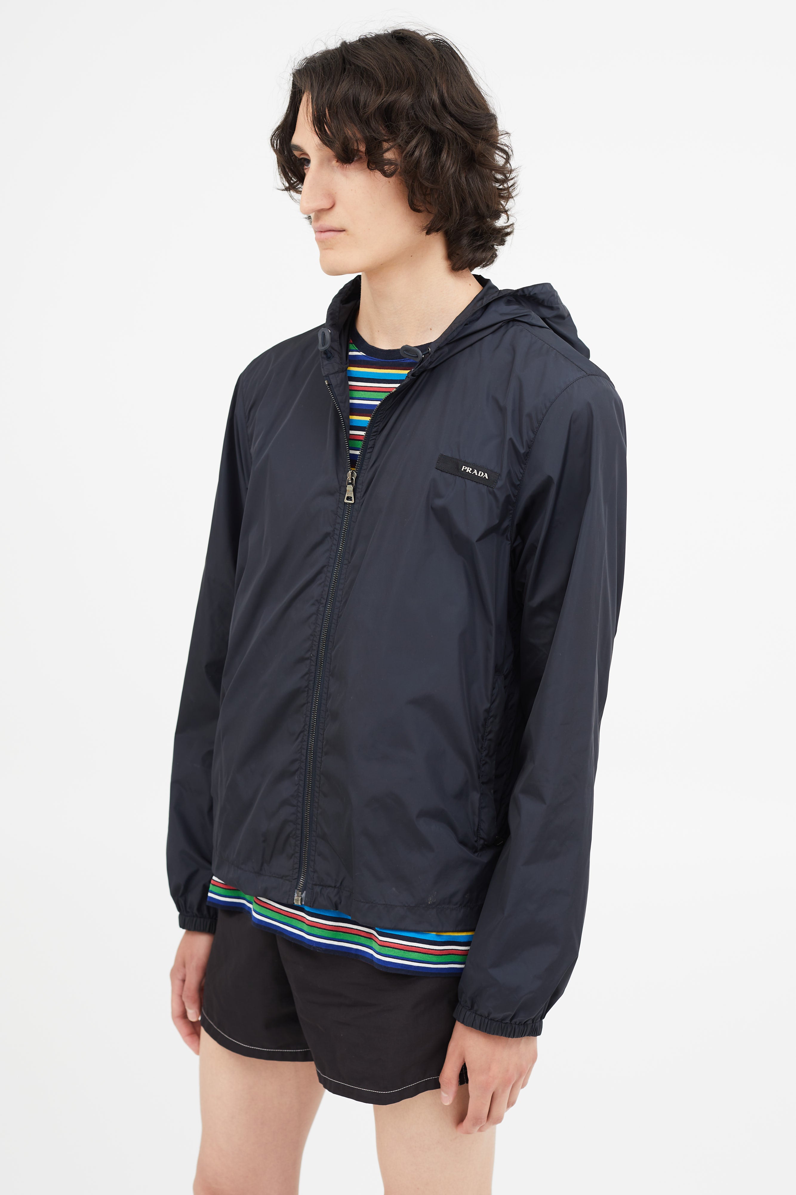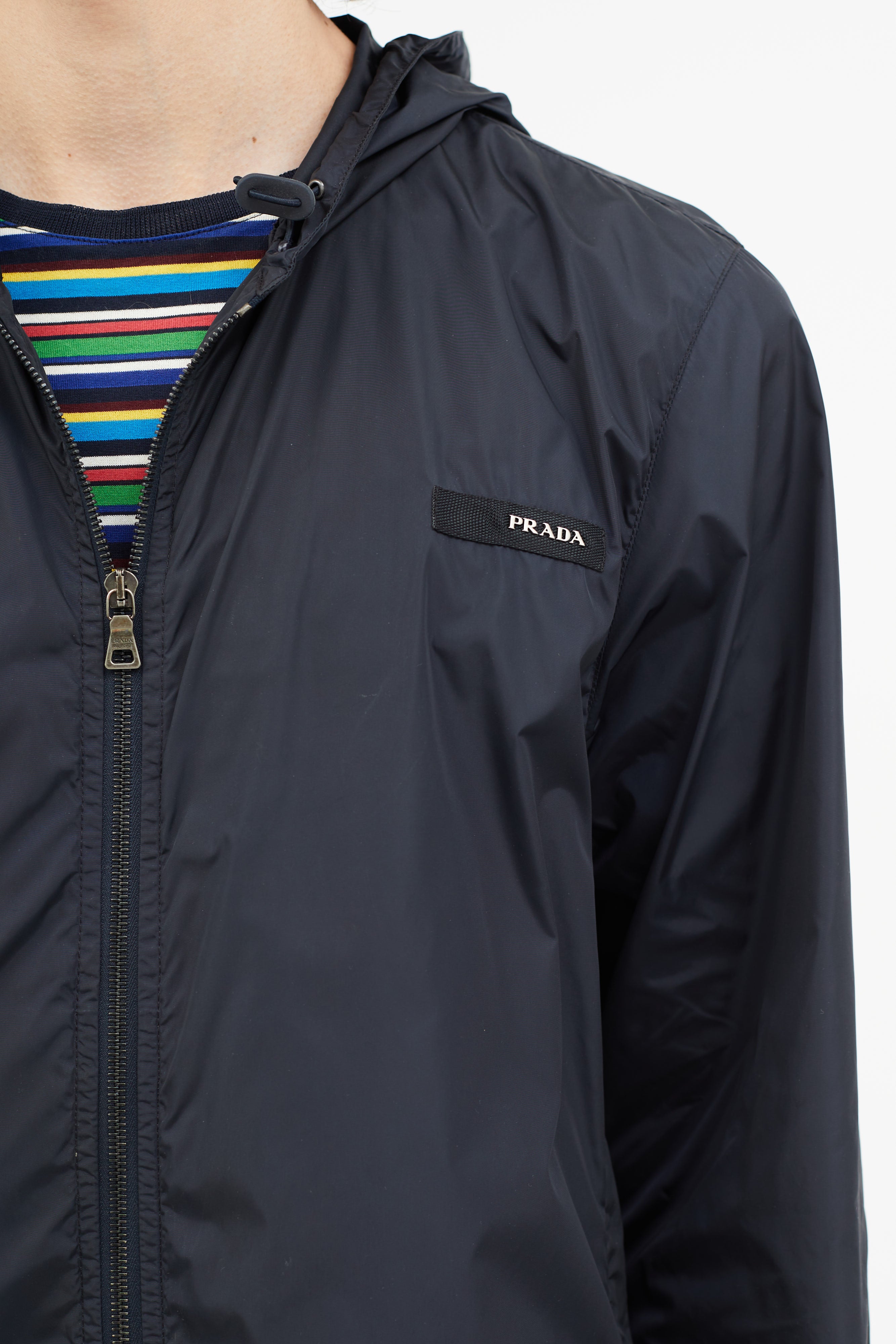 Pre-owned vintage Prada navy nylon jacket featuring attached hood with toggle fastening, zip up closure, hang tab at back, two zip pockets, elasticized cuffs, and logo hardware at chest. Unlined.