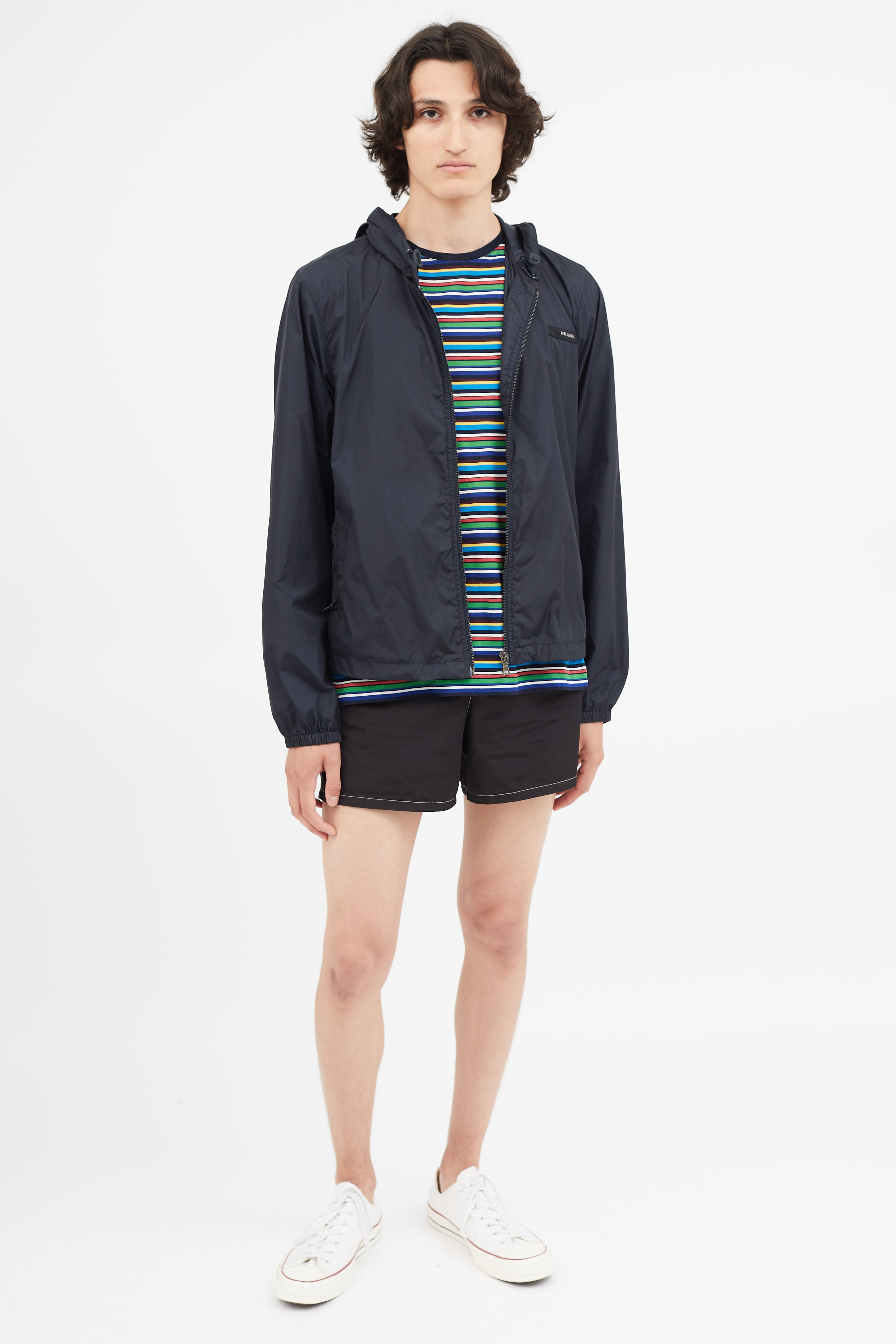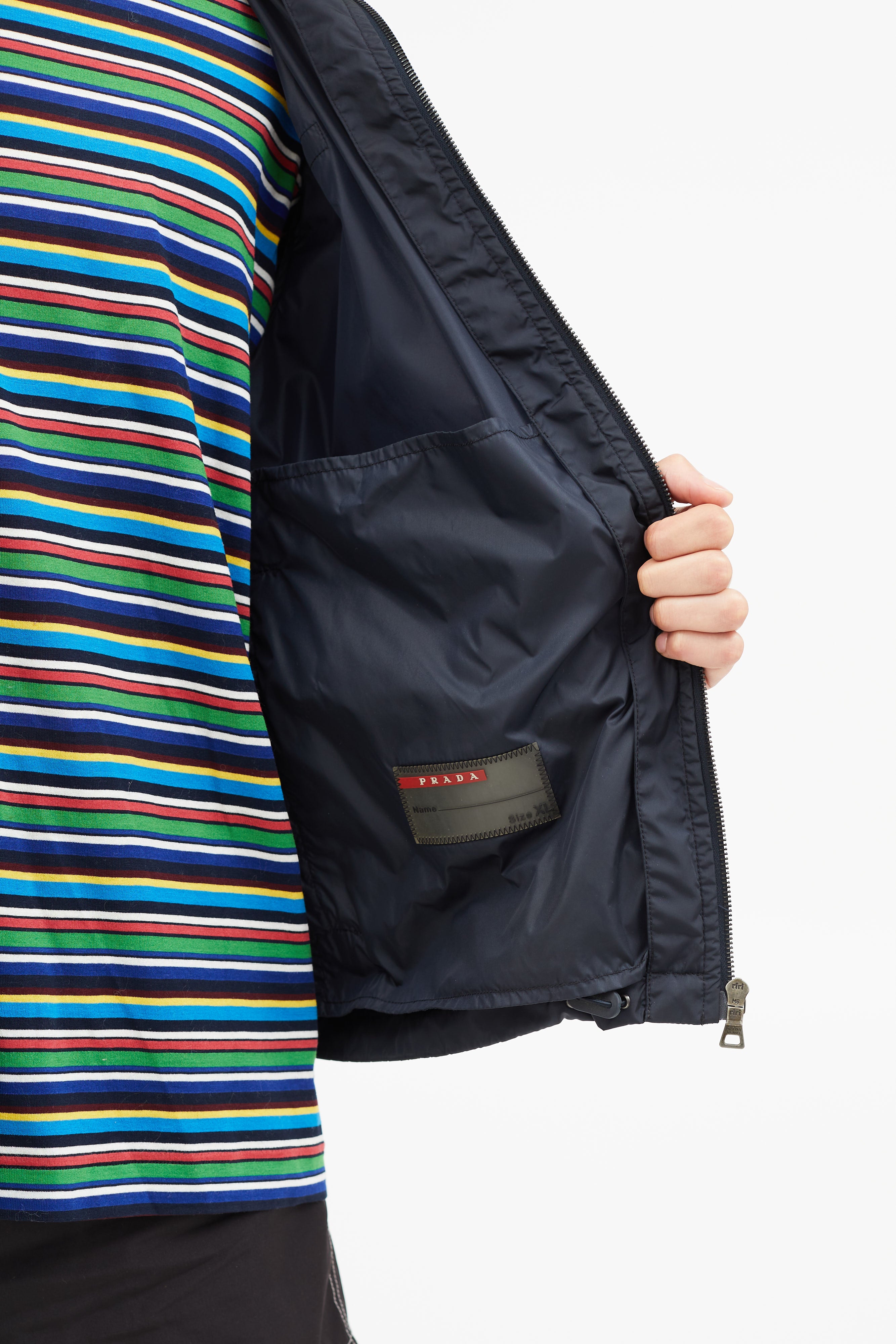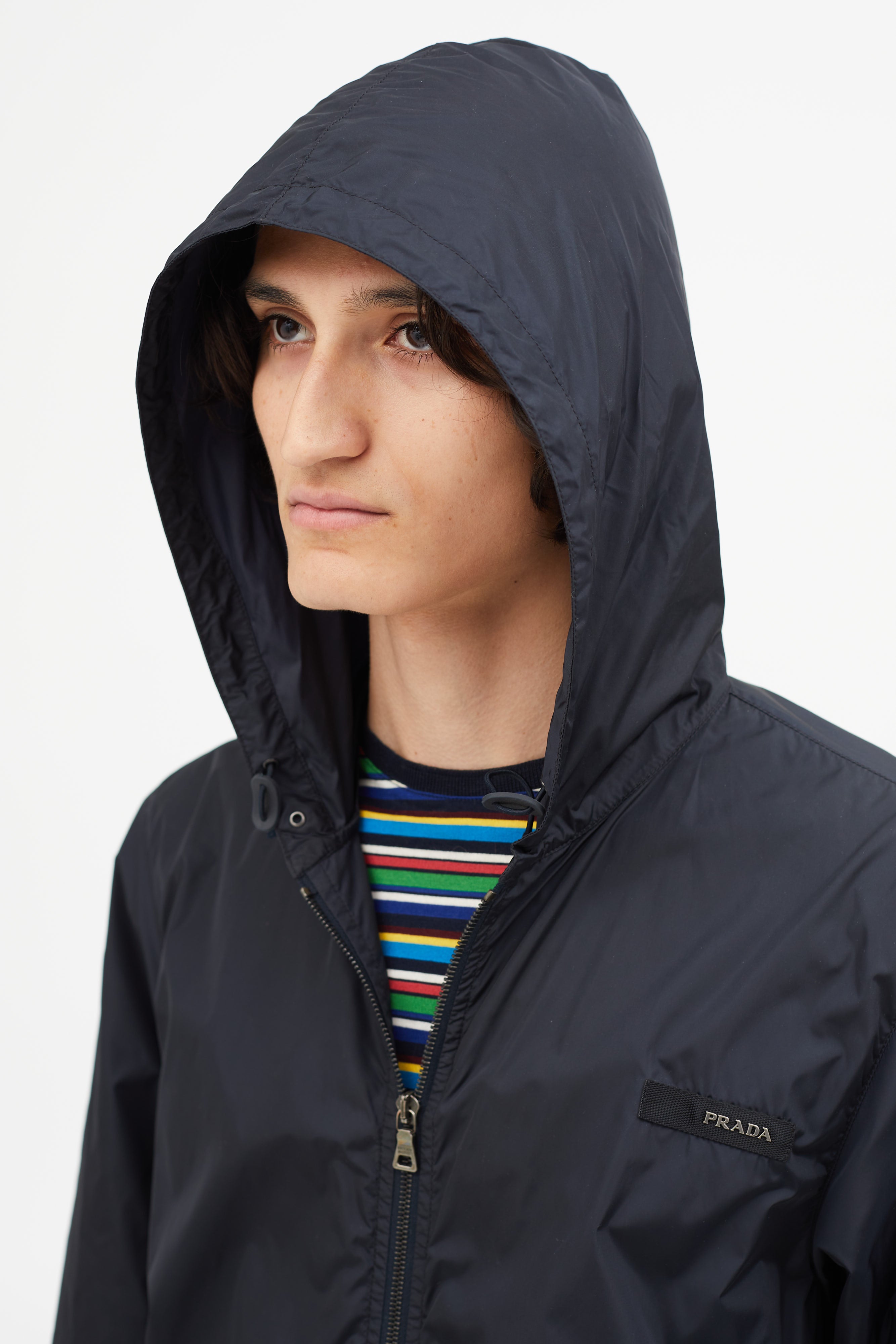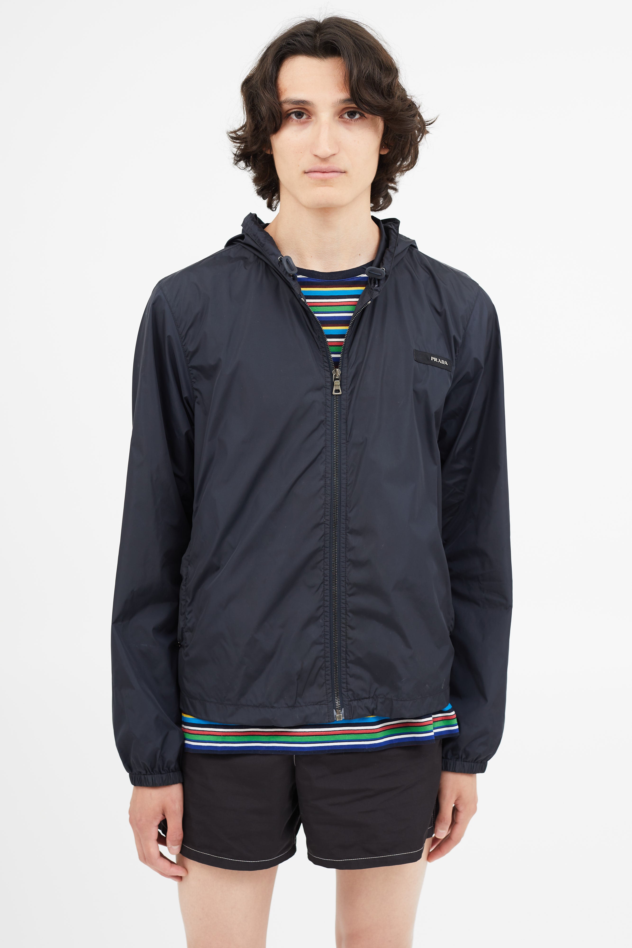 Pre-owned vintage Prada navy nylon jacket featuring attached hood with toggle fastening, zip up closure, hang tab at back, two zip pockets, elasticized cuffs, and logo hardware at chest. Unlined.