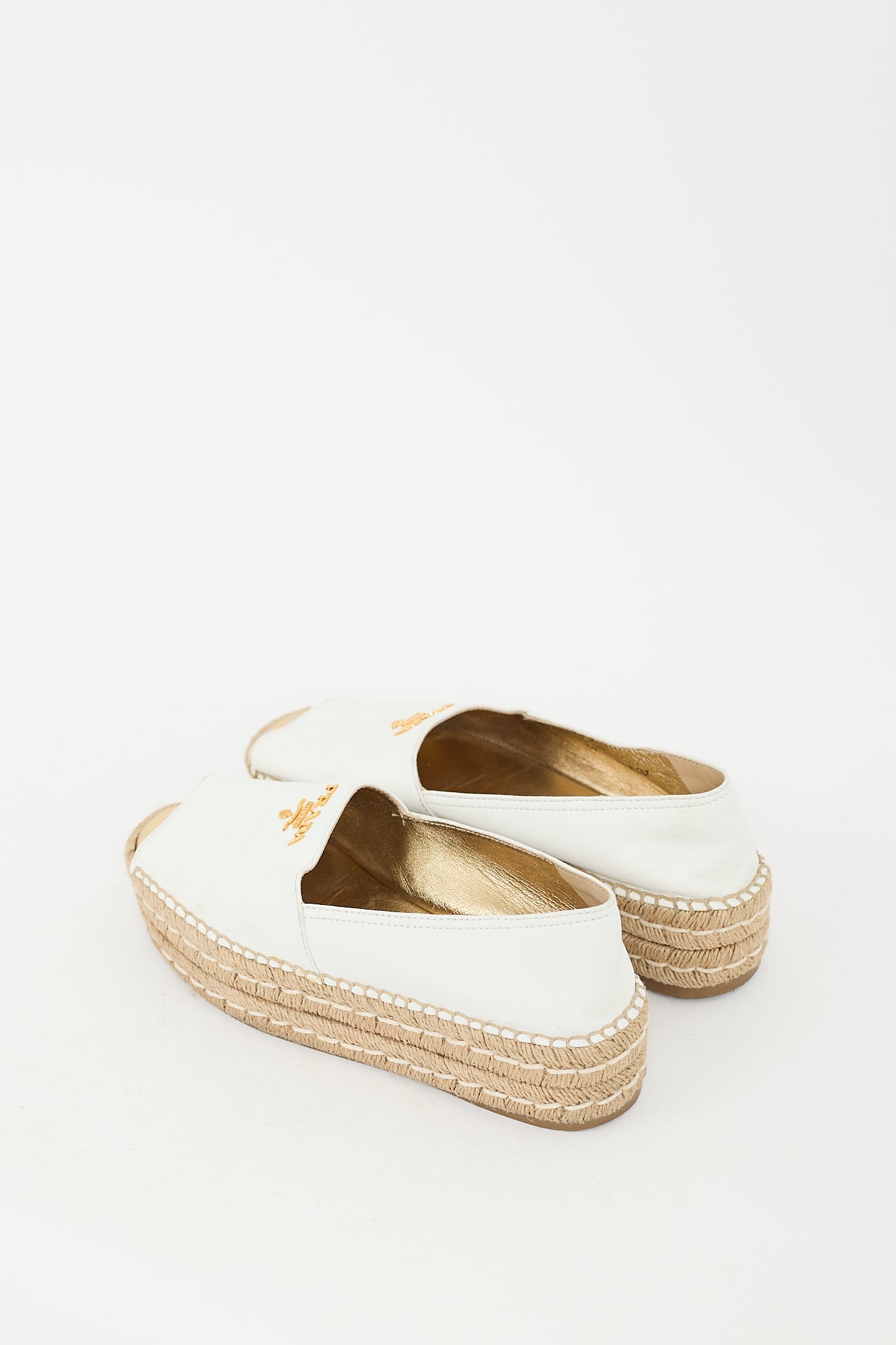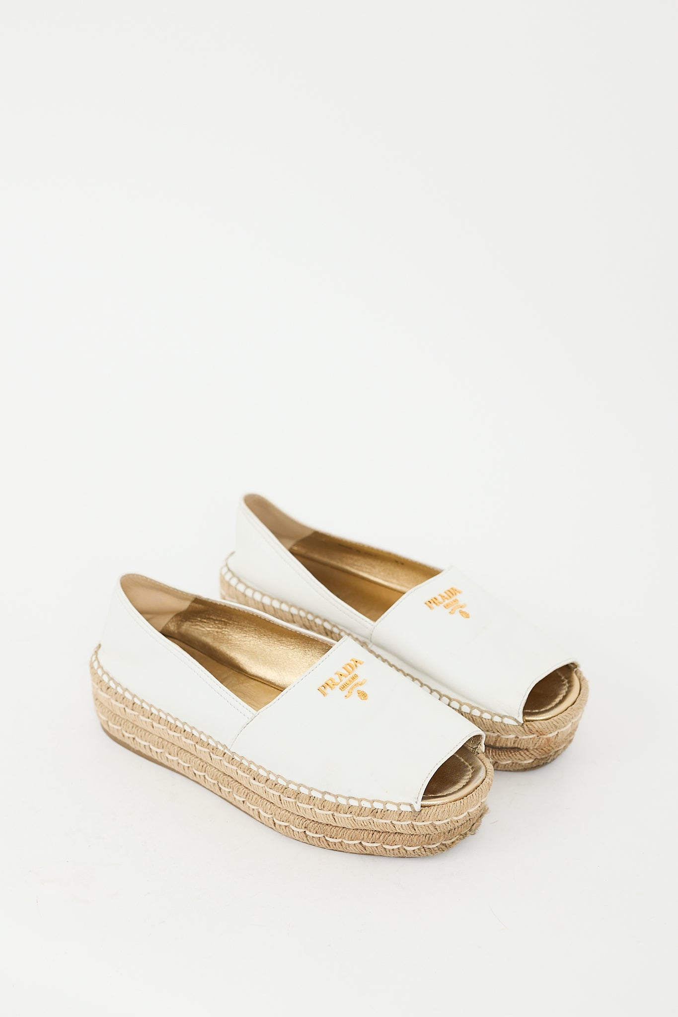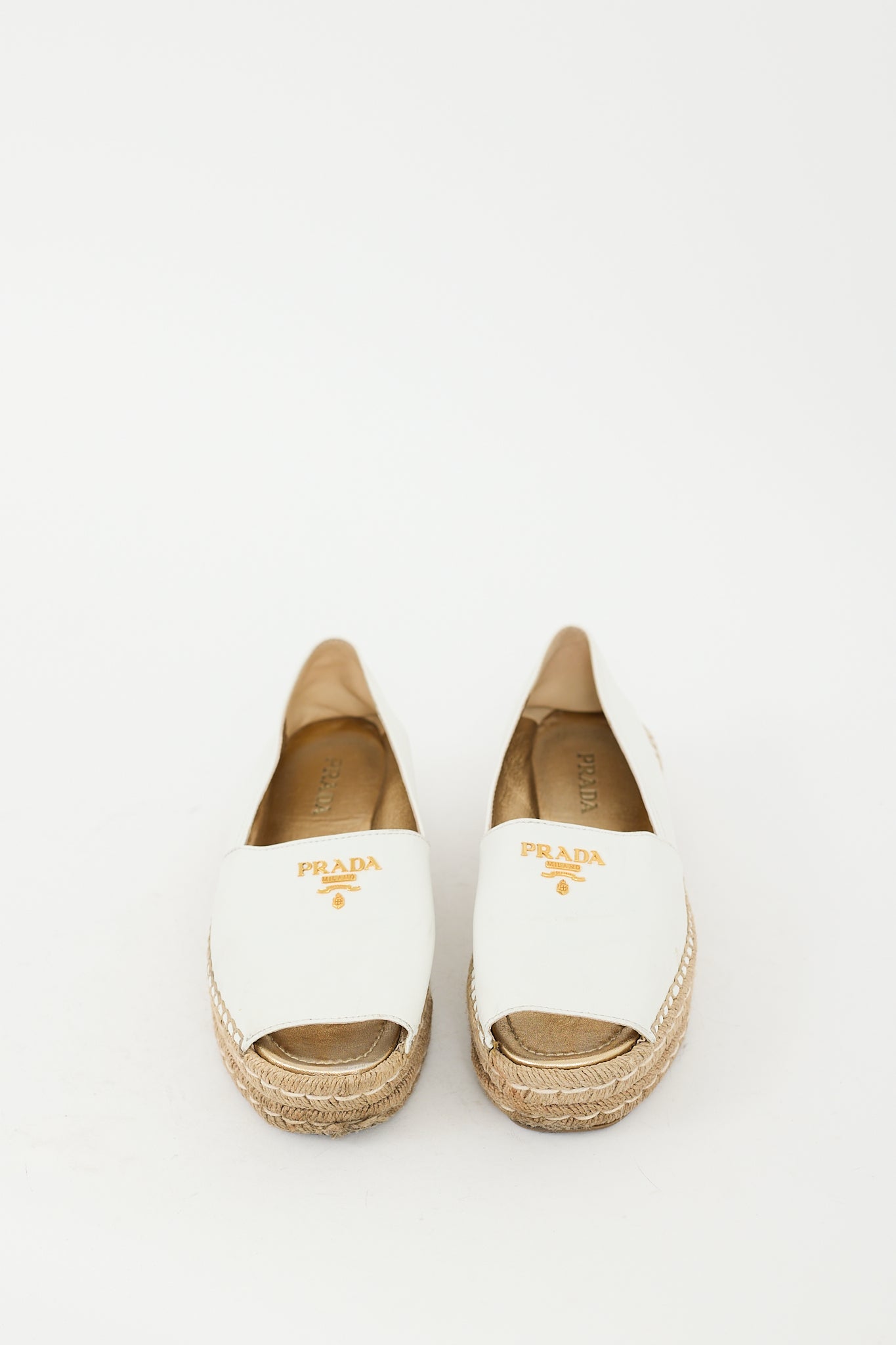 Pre-owned Prada white leather espadrilles featuring a square peep toe, gold tone logo hardware embellishment at throat, braided platform, gold tone metallic leather insole, and rubber outsole.