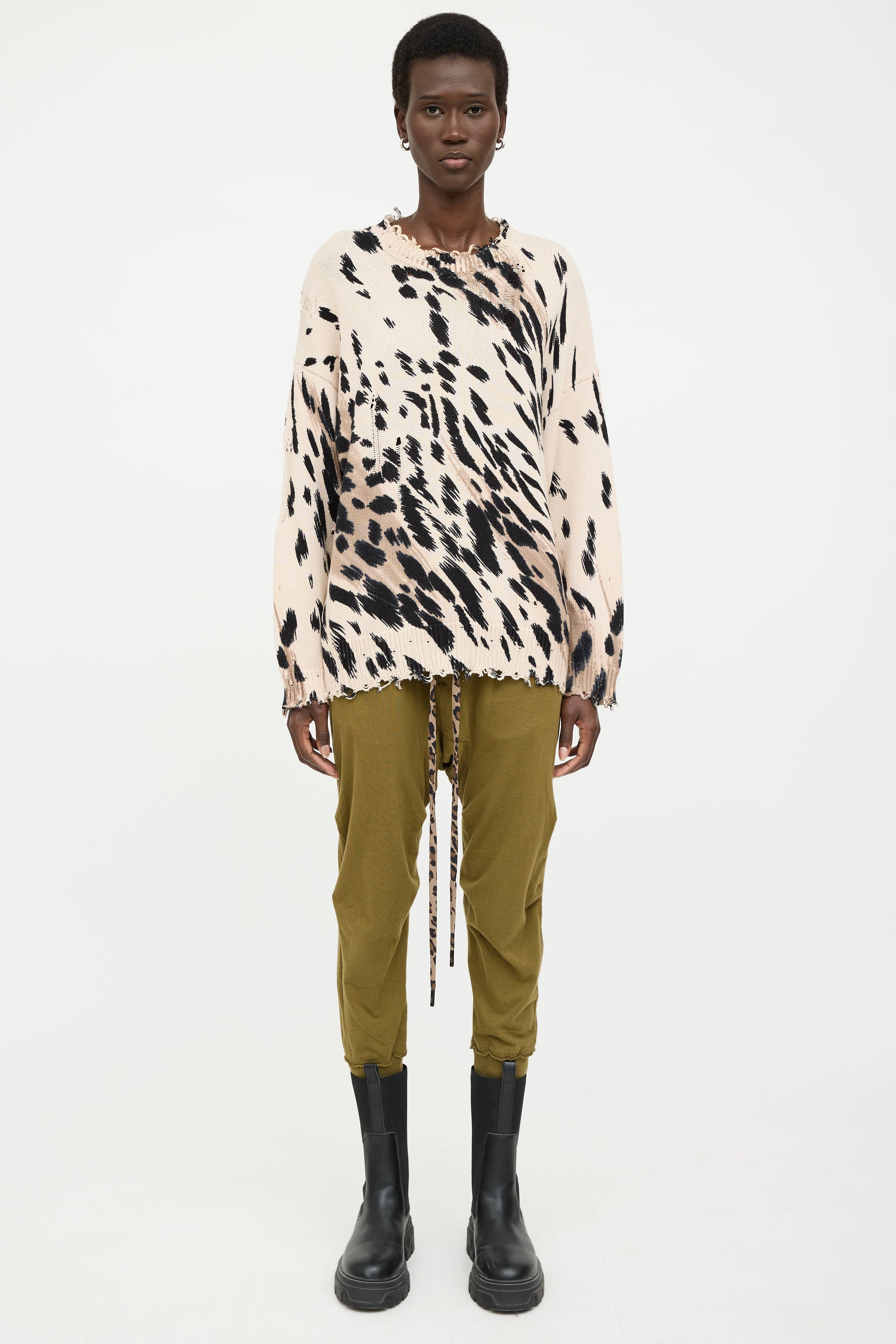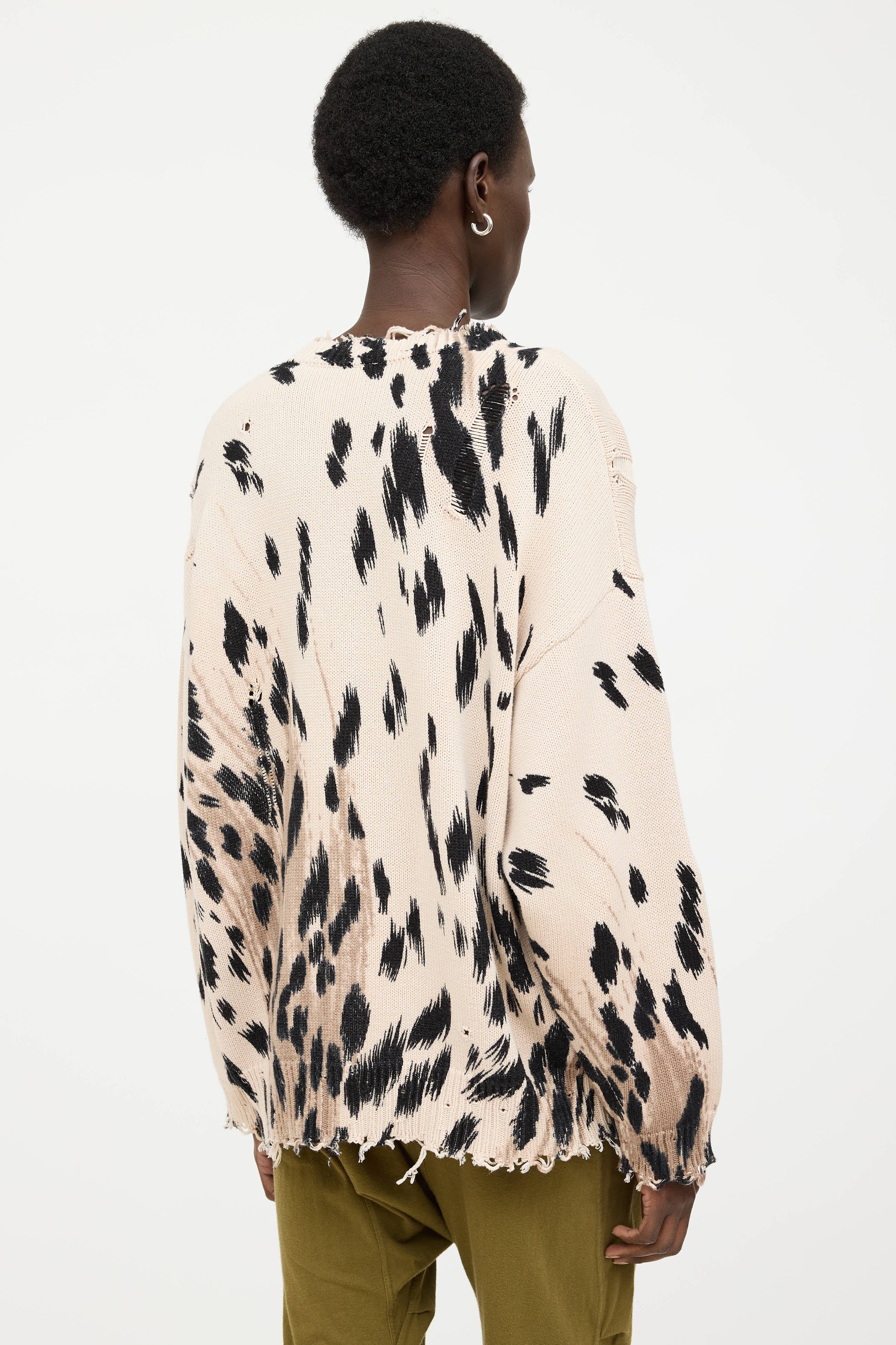 Pre-owned R13 cream knit sweater featuring a black cheetah pattern throughout, round neckline, long sleeves, intentional distressing, and ribbed hem.