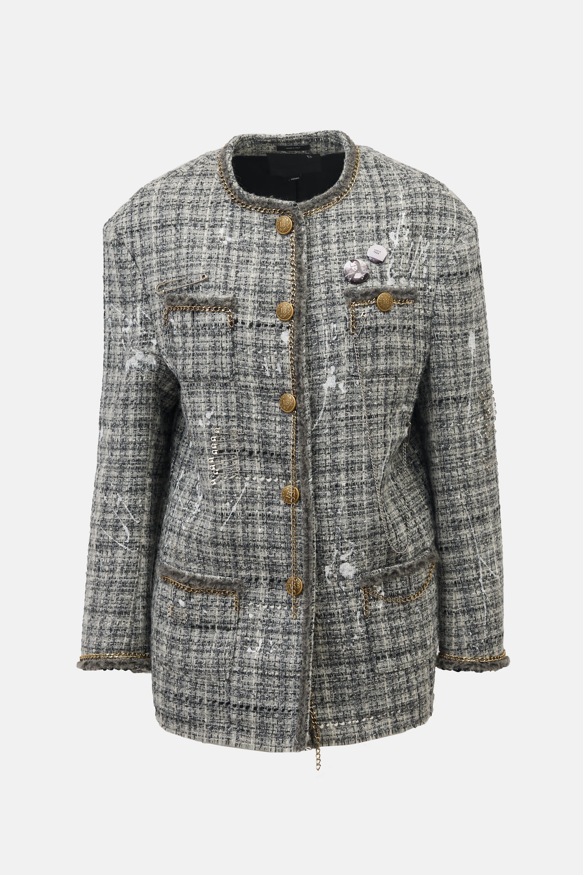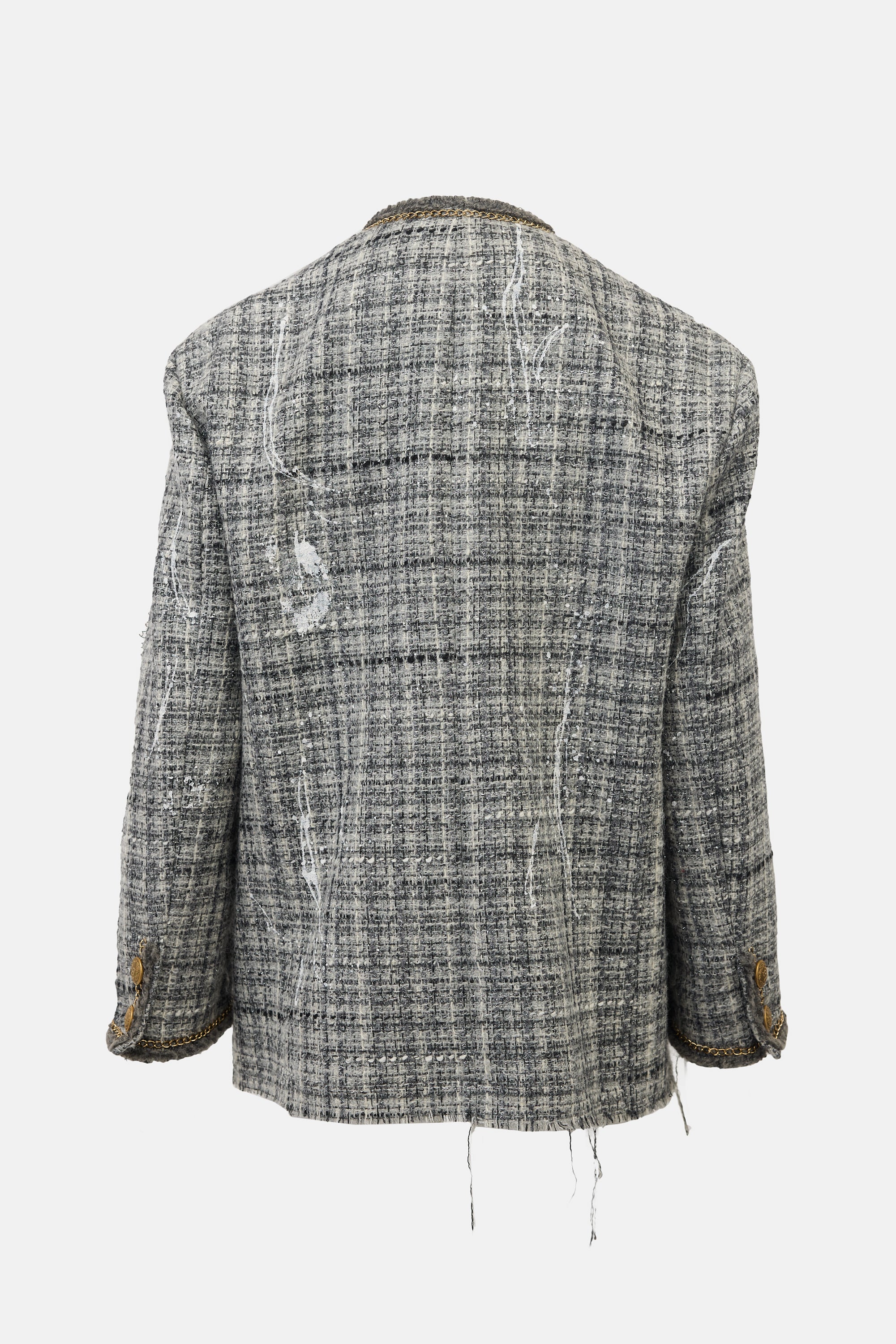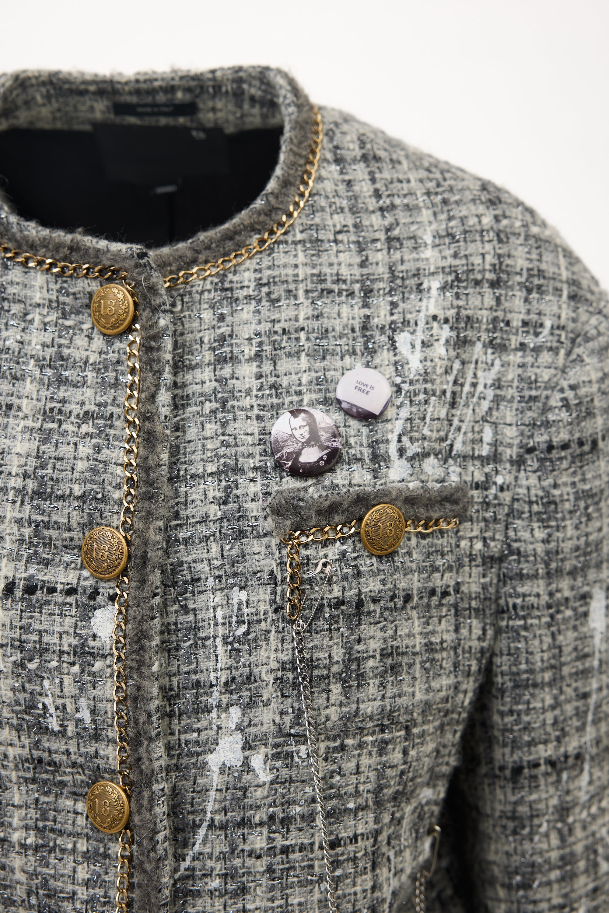 Pre-owned R13 grey tweed blazer featuring paint splatter, safety pin and chain embellishment, button front, and four pockets at front. Lined.