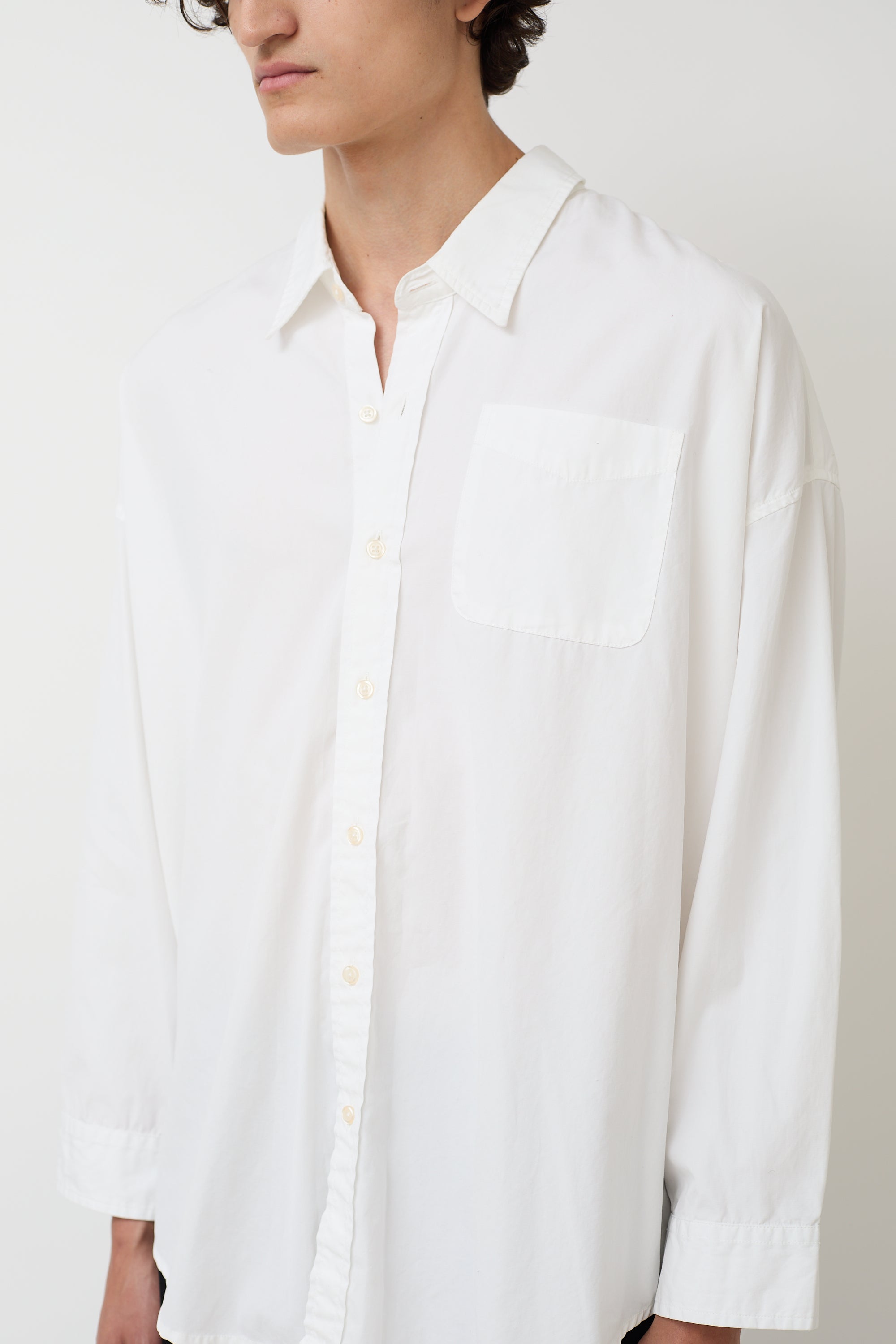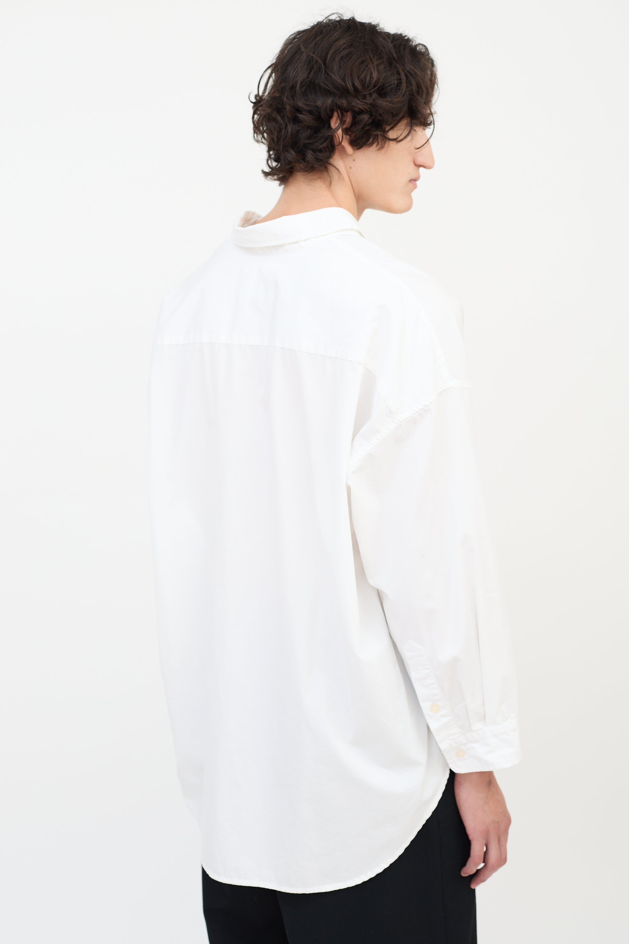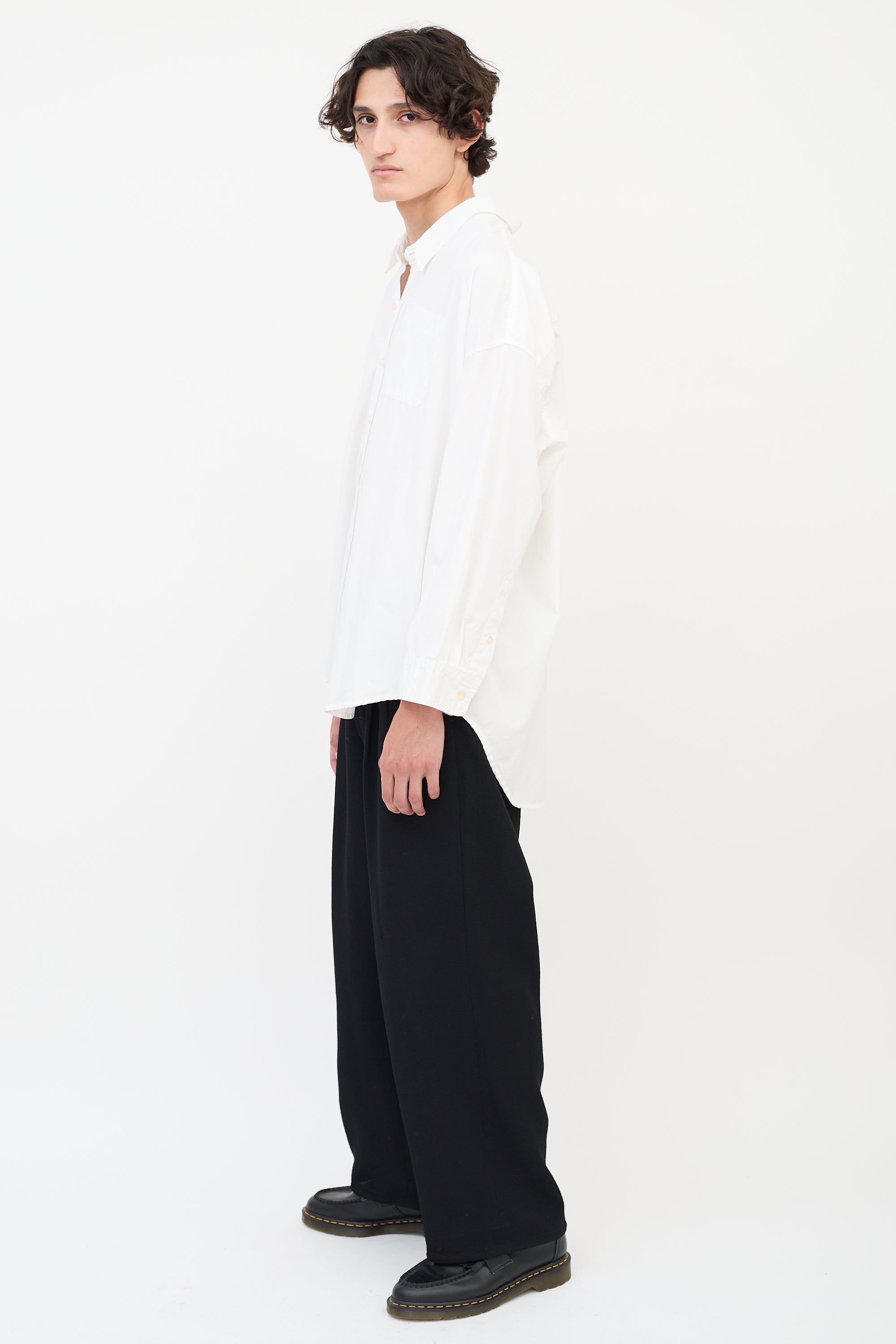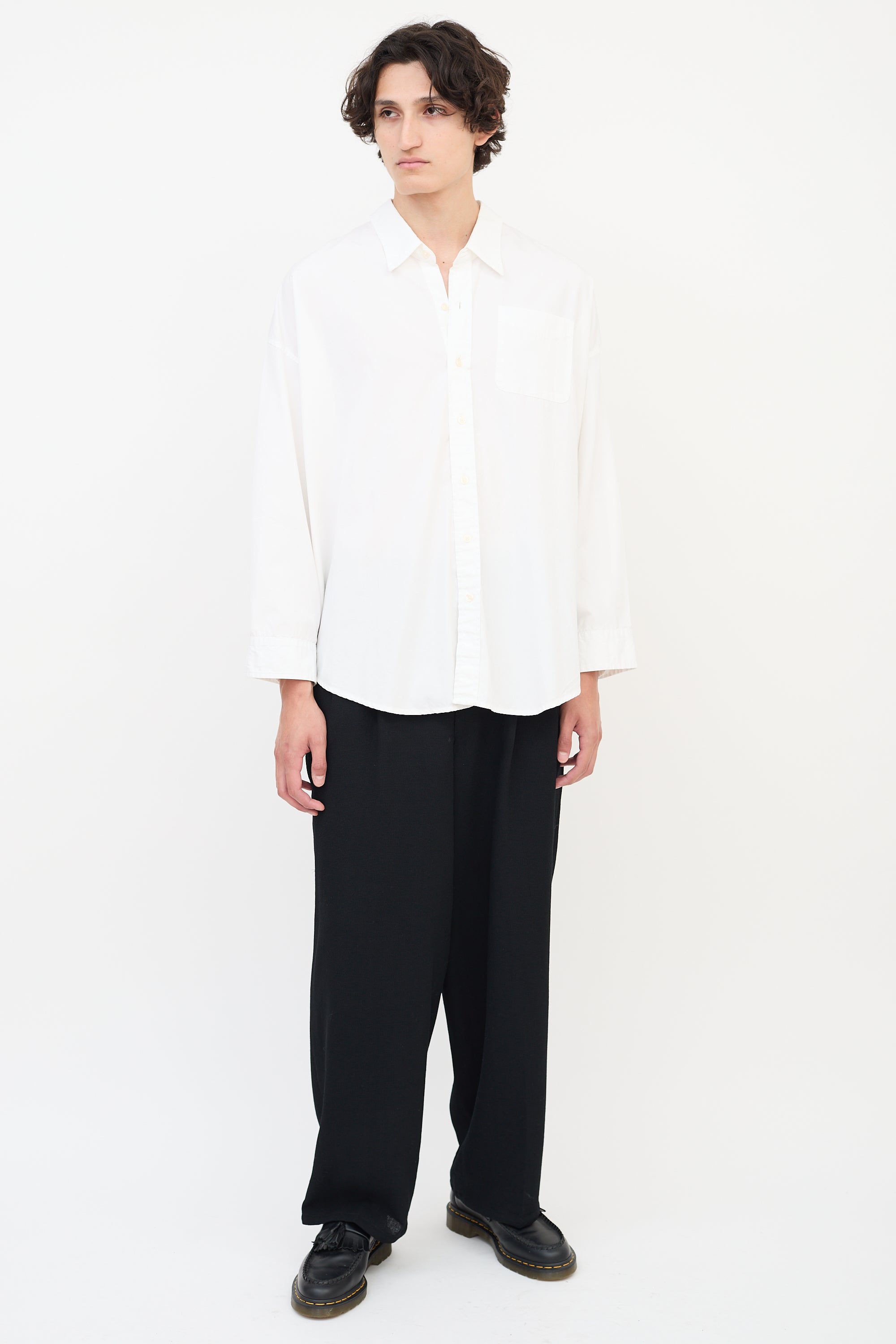 Pre-owned R13 white Drop Neck Oxford shirt featuring a point collar, button up front, loose fit, single patch pocket at left chest, shirttail hem, dropped shoulders, and long sleeves with pleated and buttoned cuffs.