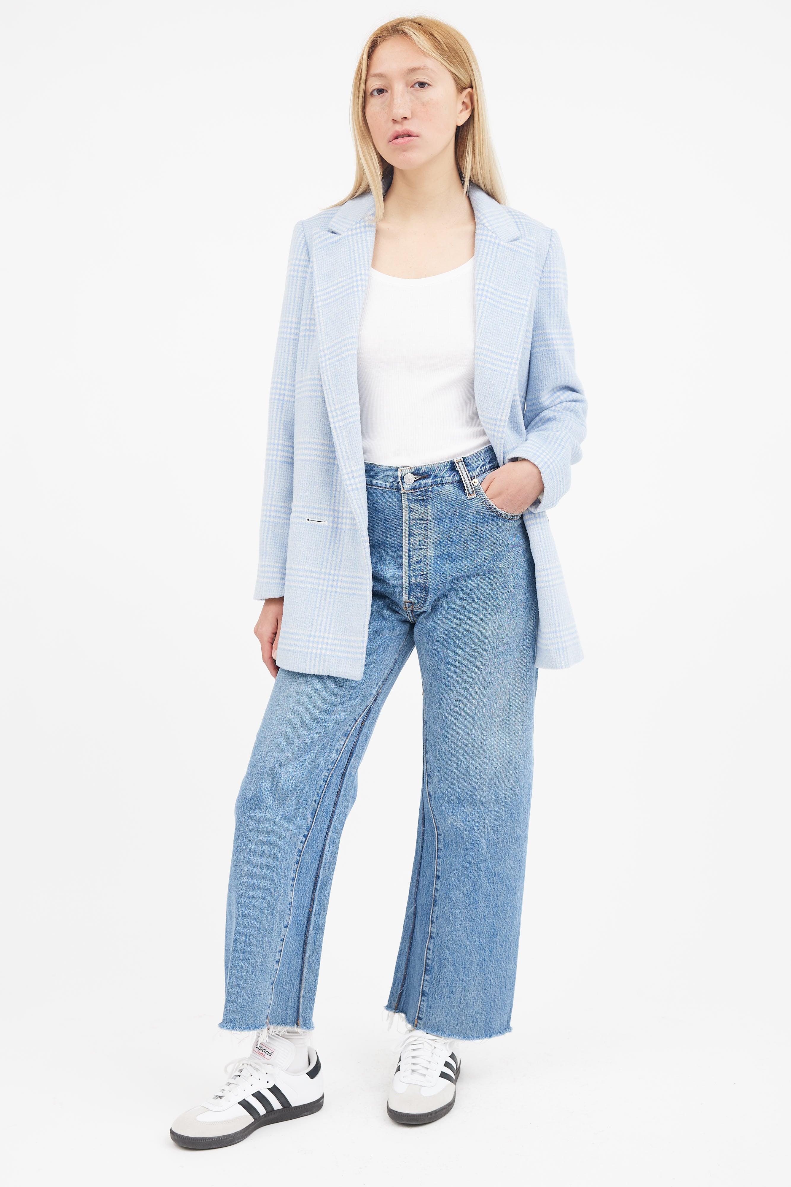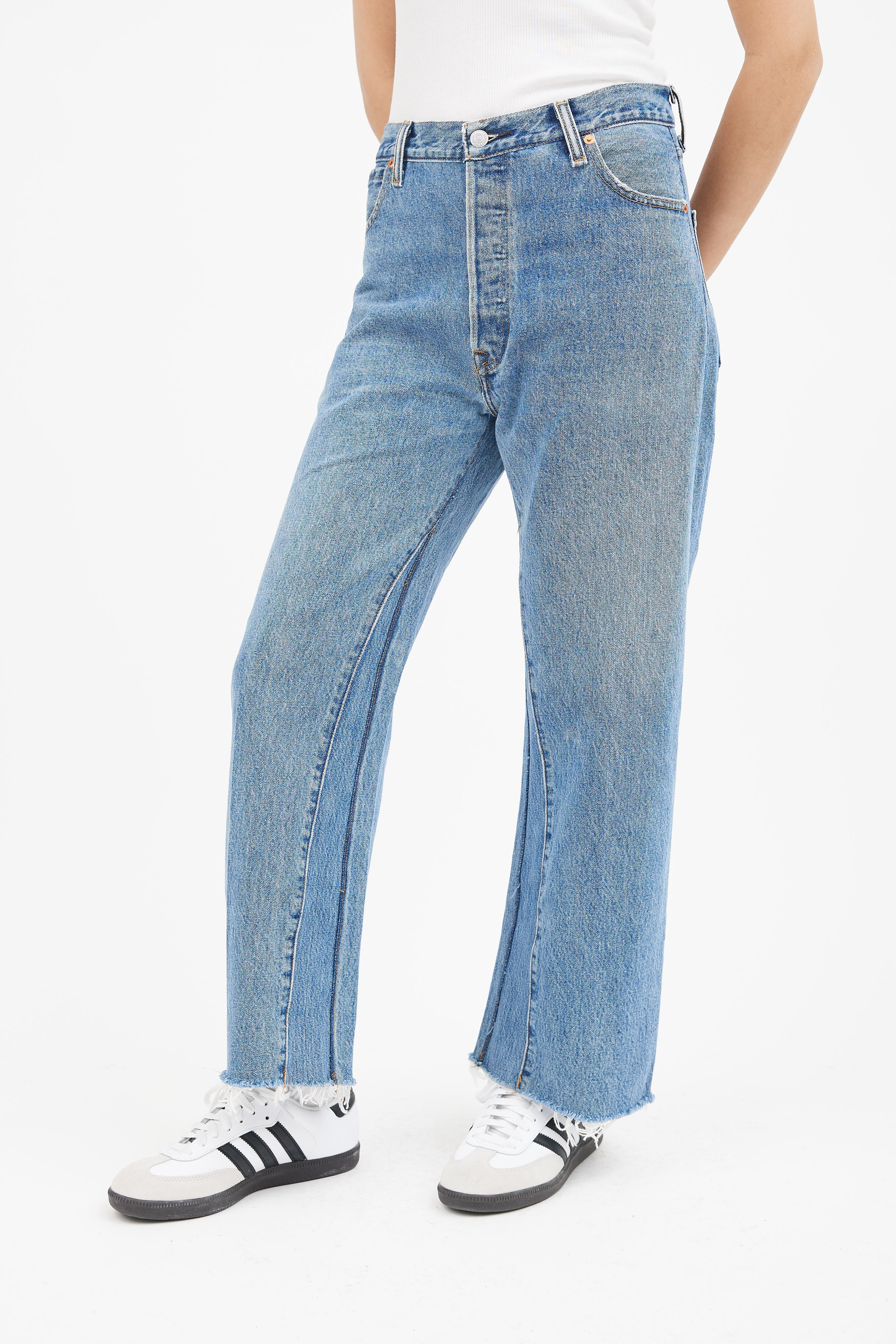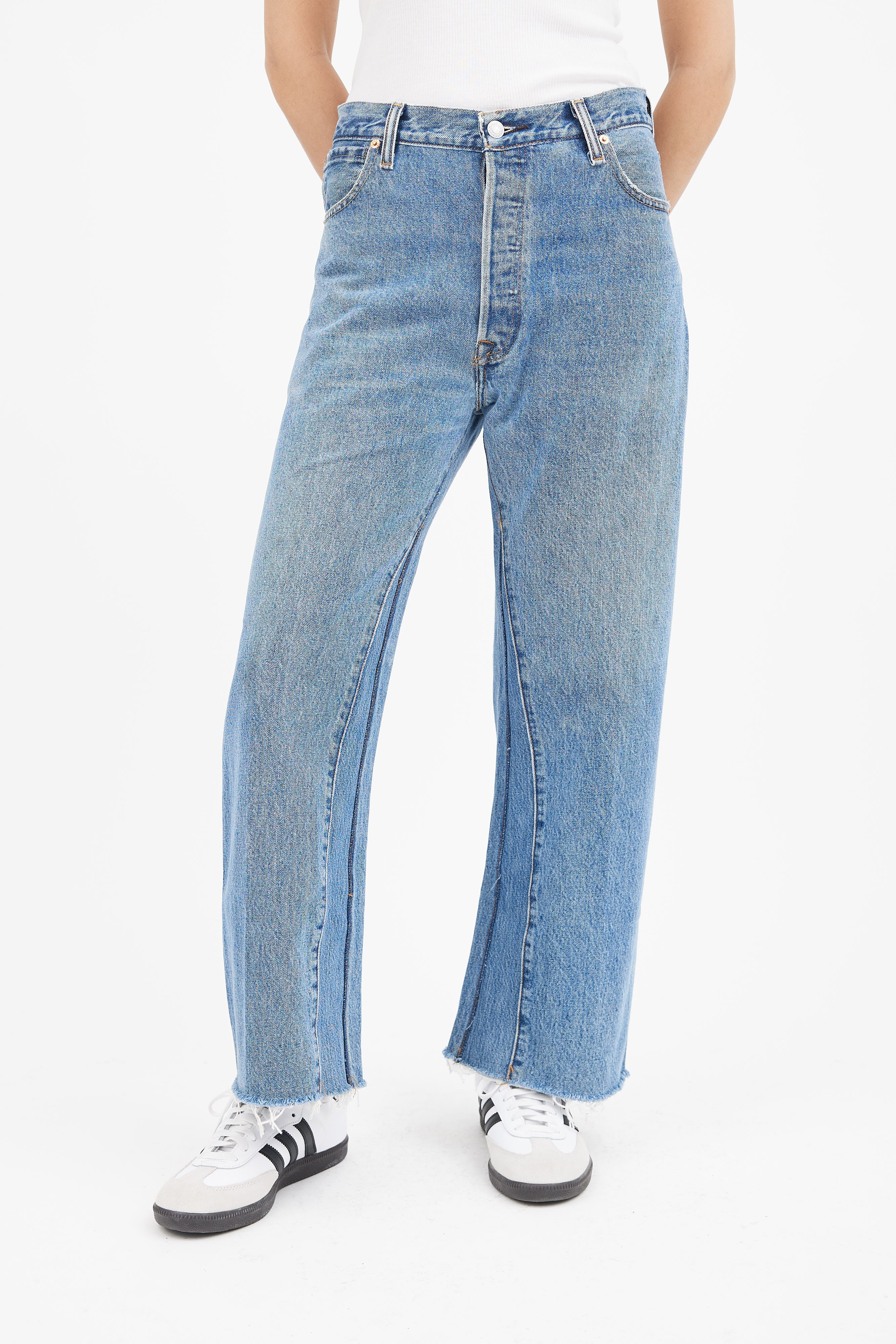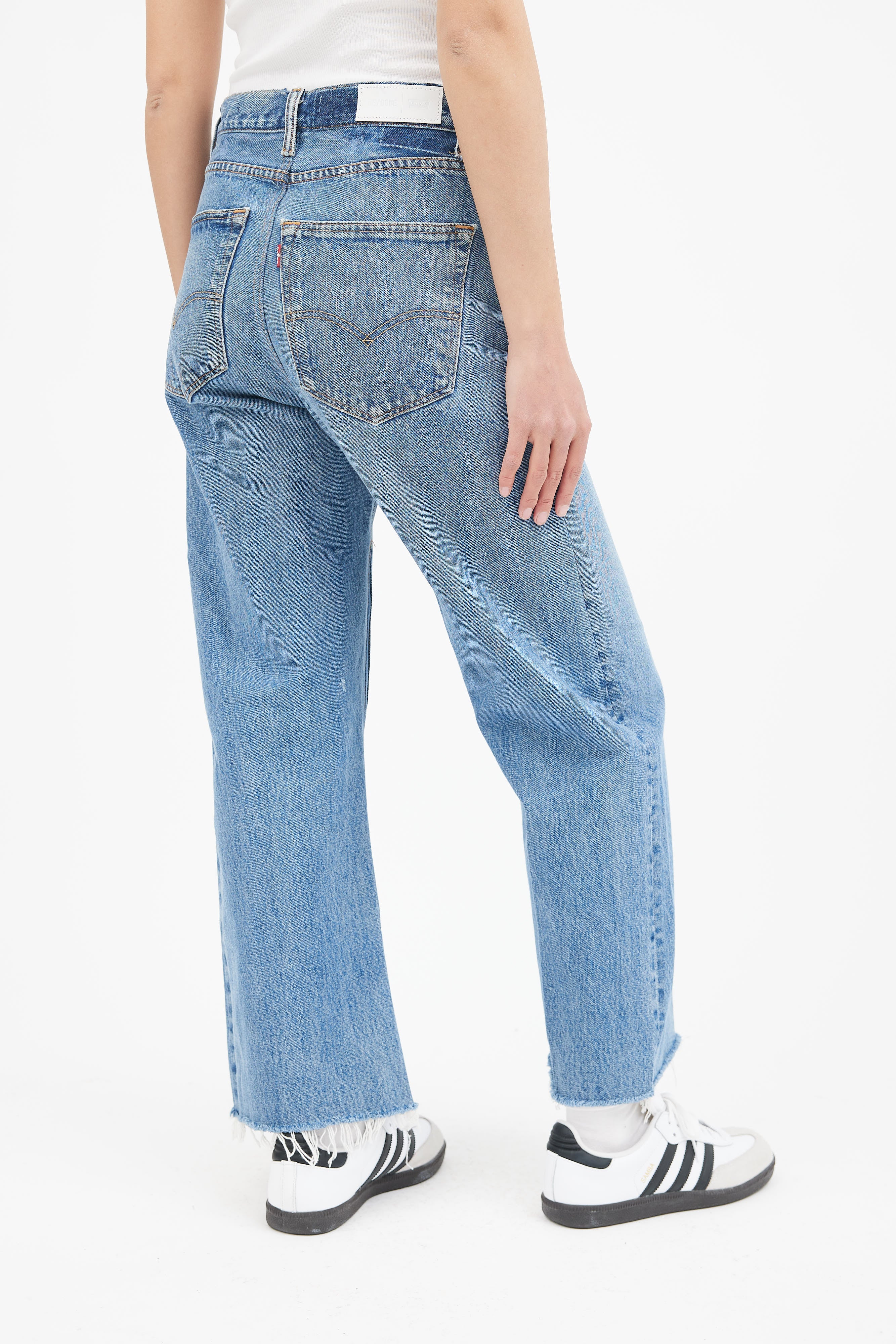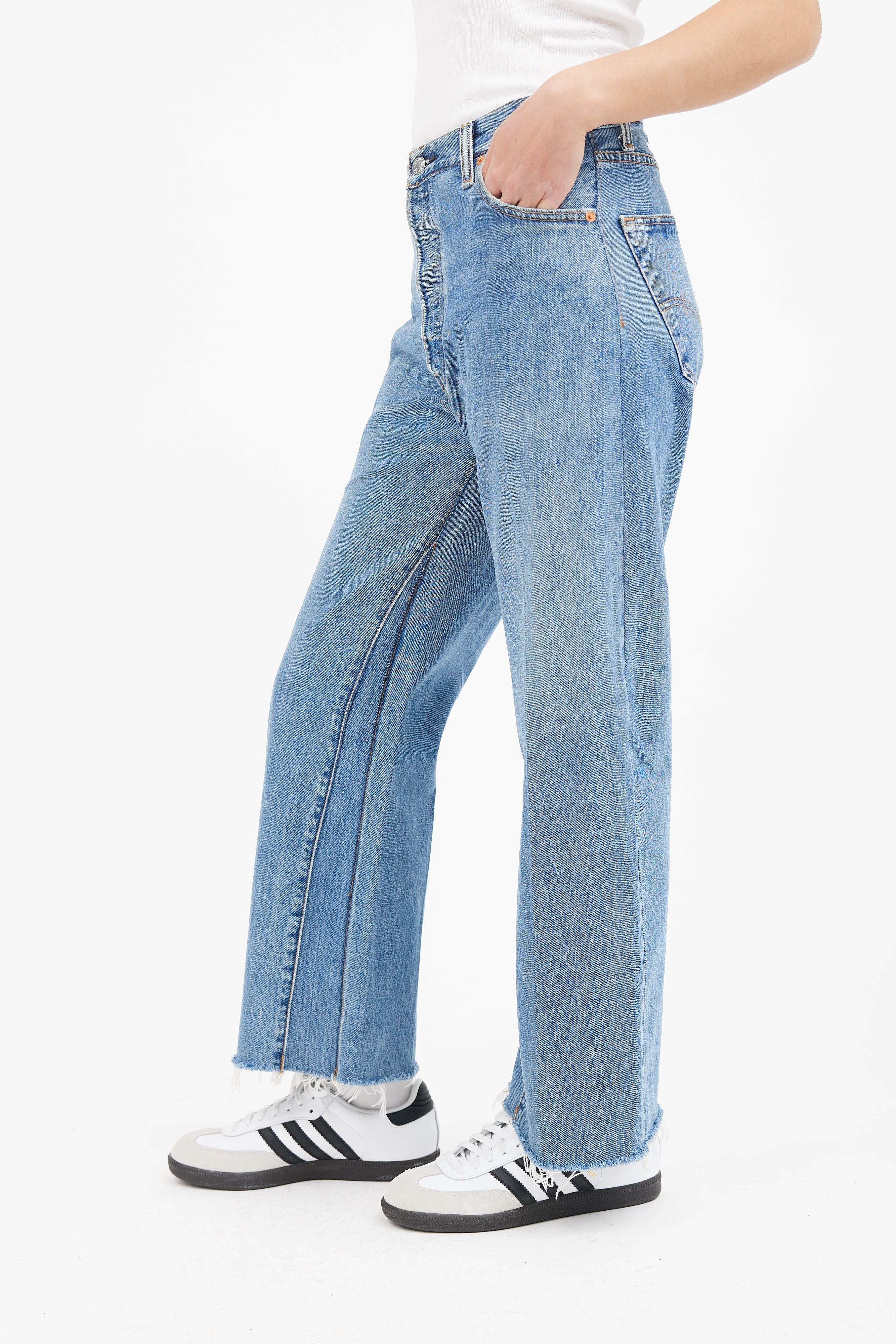 Re/Done x Levi's wide leg jeans in blue featuring belt loops, button fly, five pockets styling, high rise, jacron patch at back, denim panel at inside legs, and raw hem.