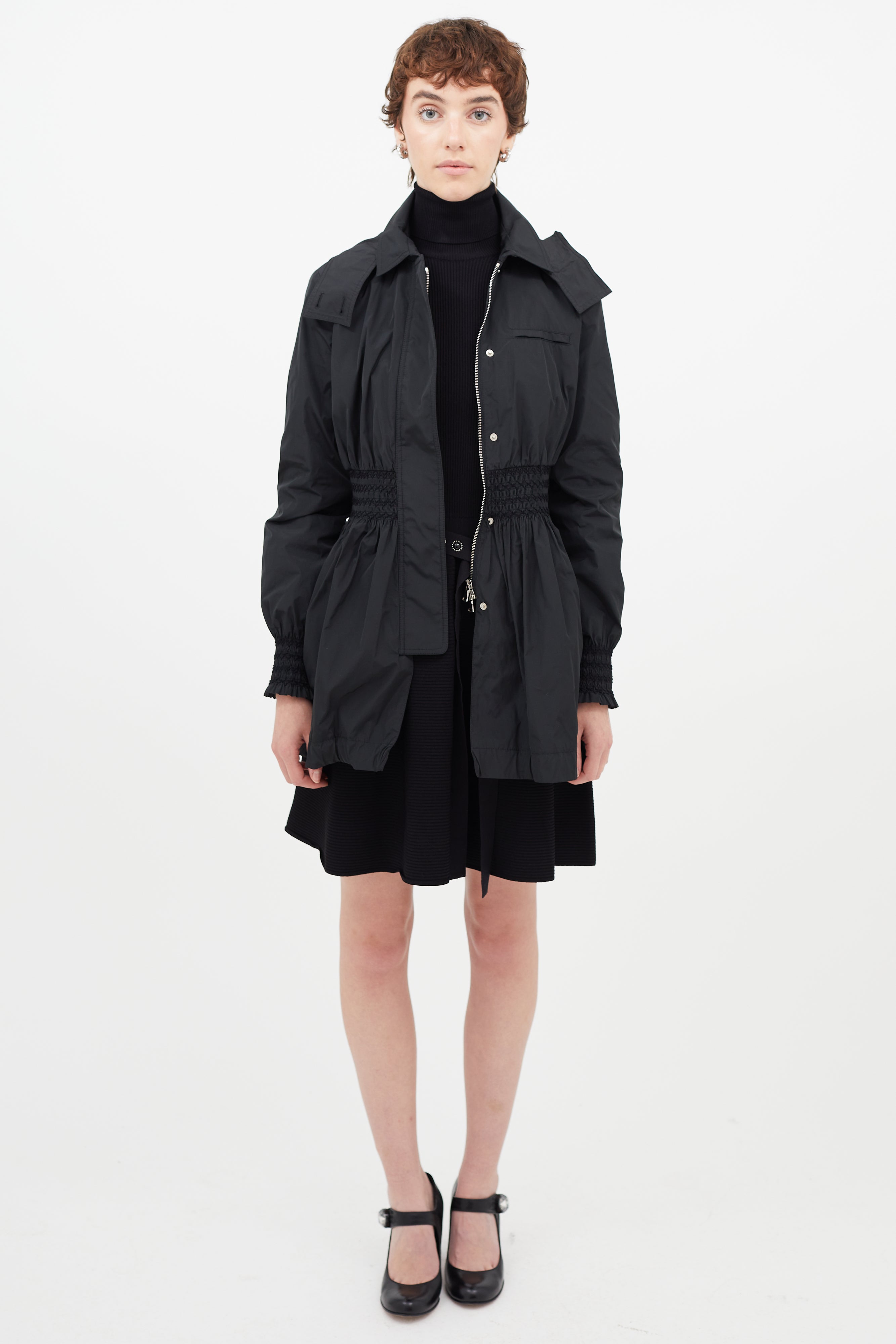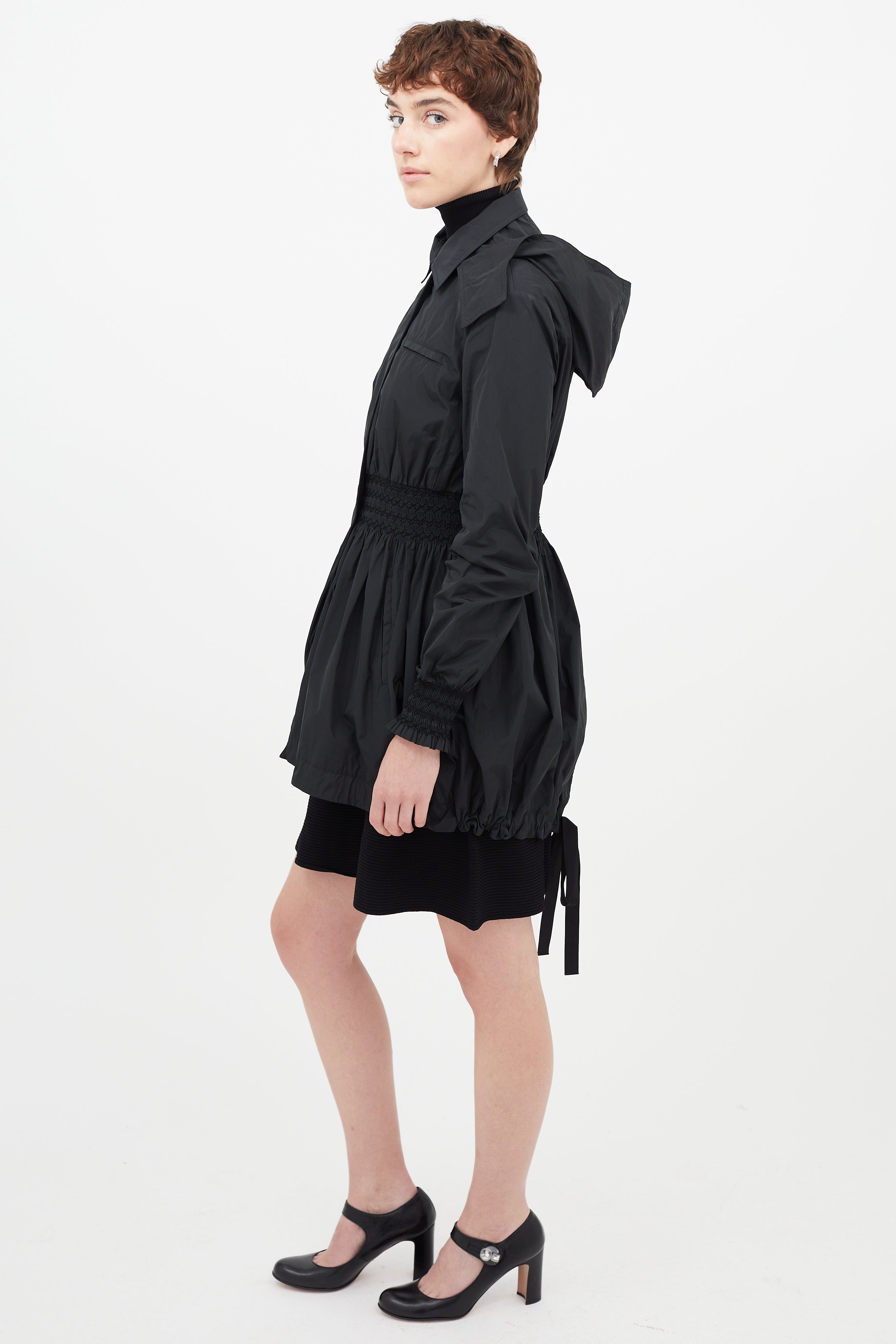 Pre-owned Red Valentino black nylon jacket featuring a pointed collar with removable hood, one welt pocket at chest, two slip pockets at hip, smocked detail at waist and cuffs, fishtail hem with drawstring, and zip front with button closure.