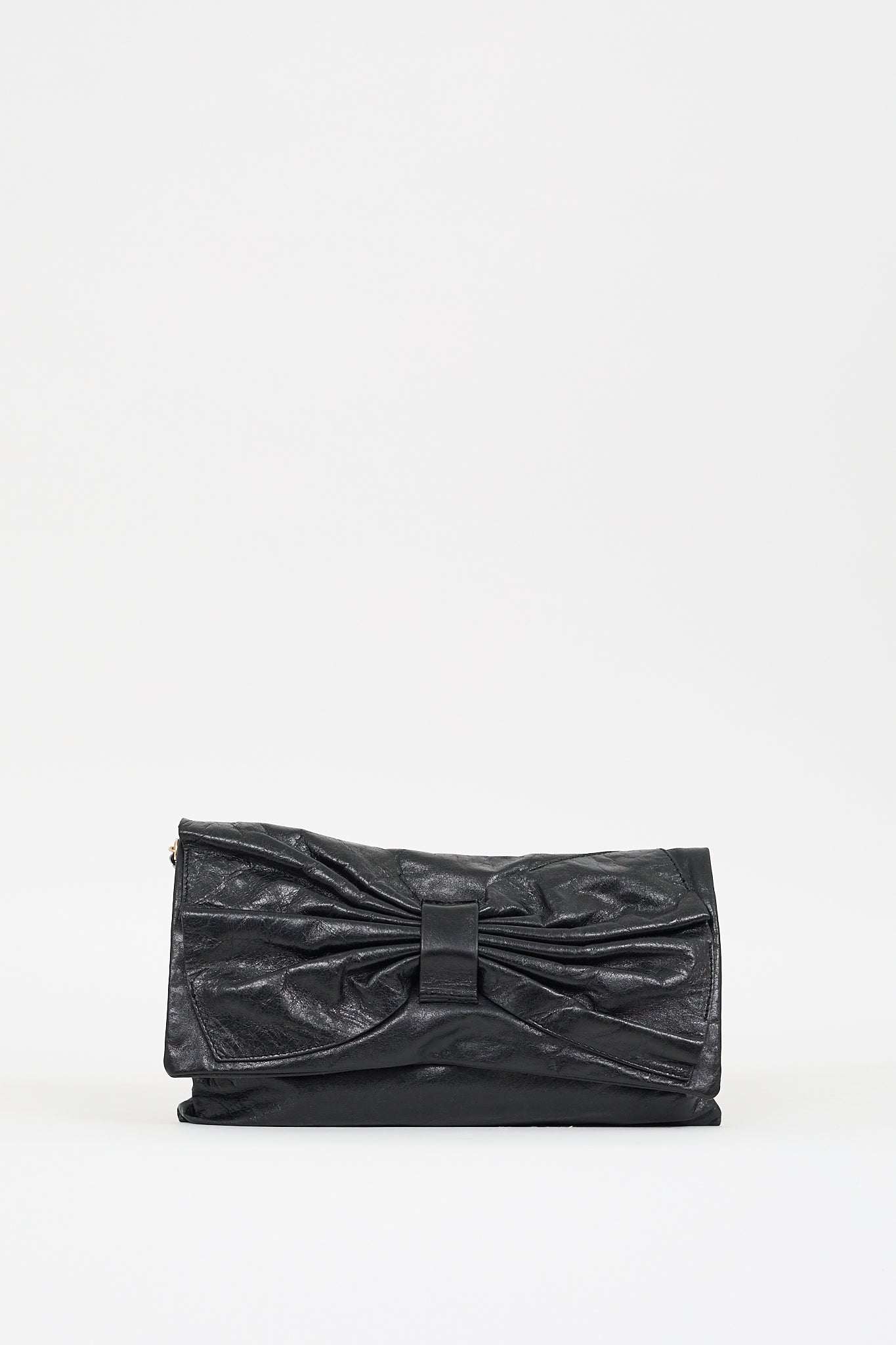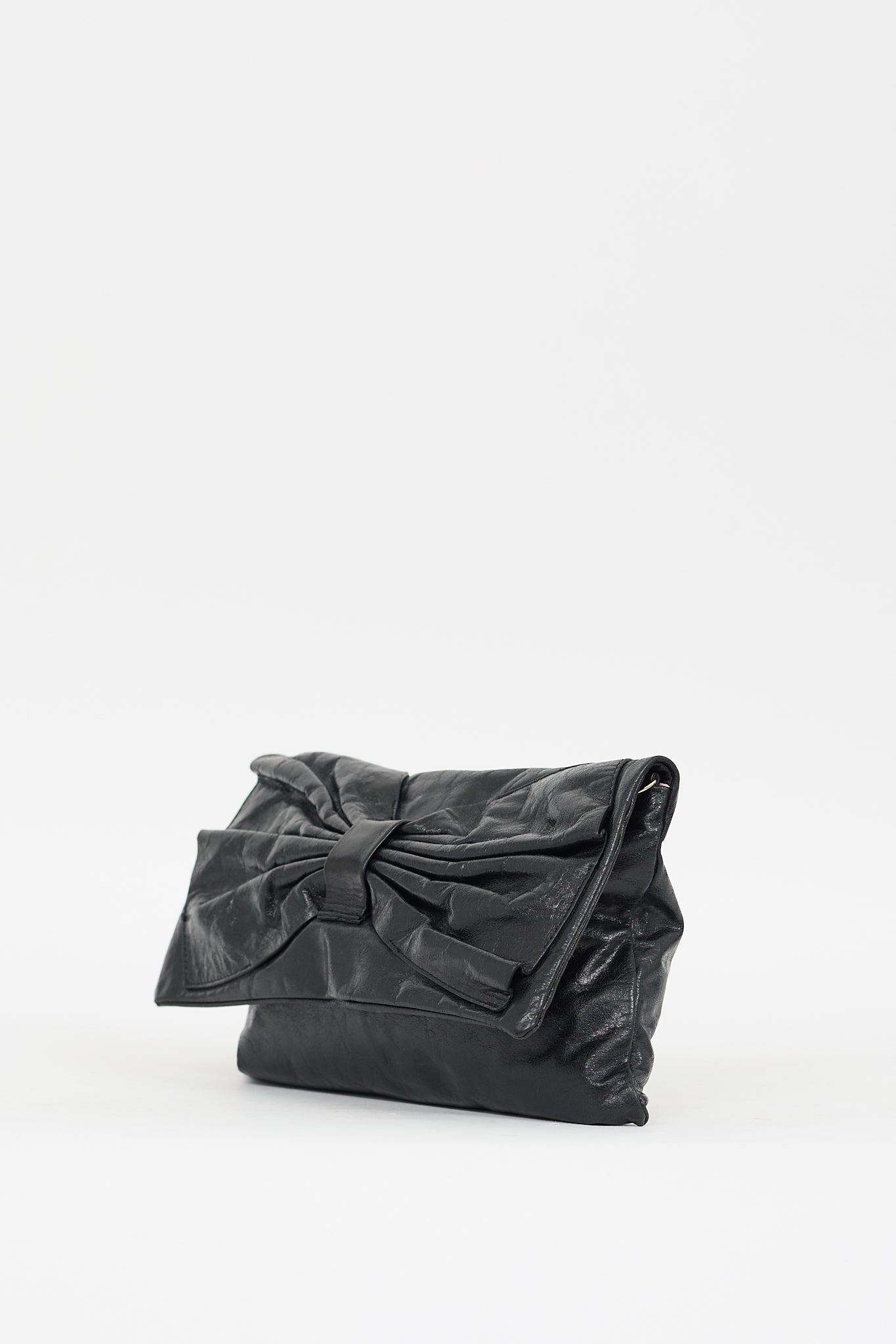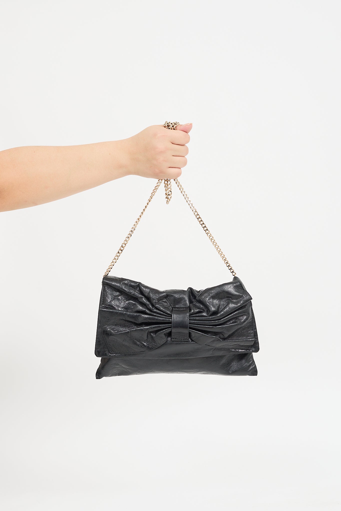 Pre-owned Red Valentino black leather crossbody bag featuring attached bow at top flap, snap button closure, logo enamel at back, attached and fixed chain shoulder strap, canvas lined main compartment, and one zip pocket inside.
