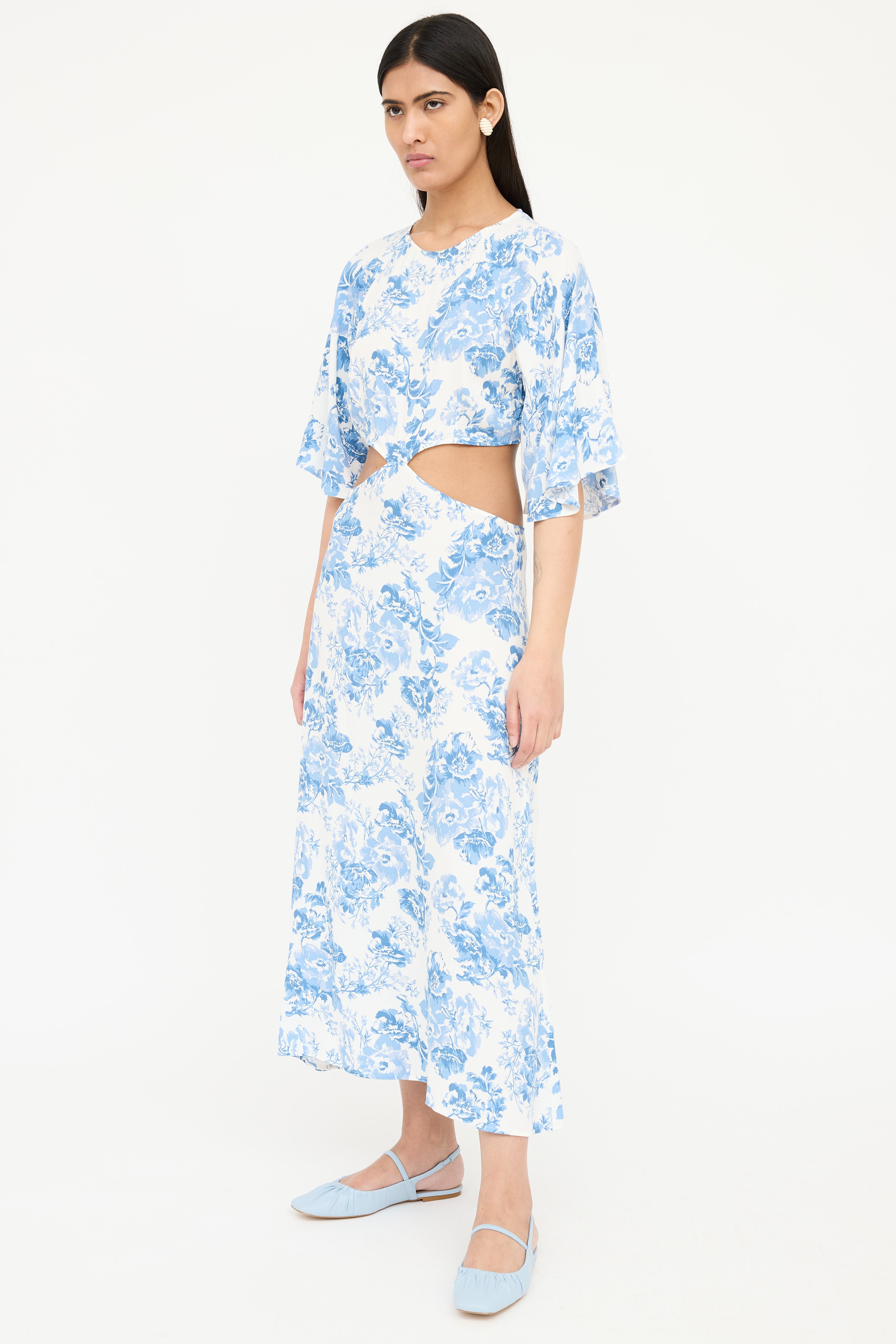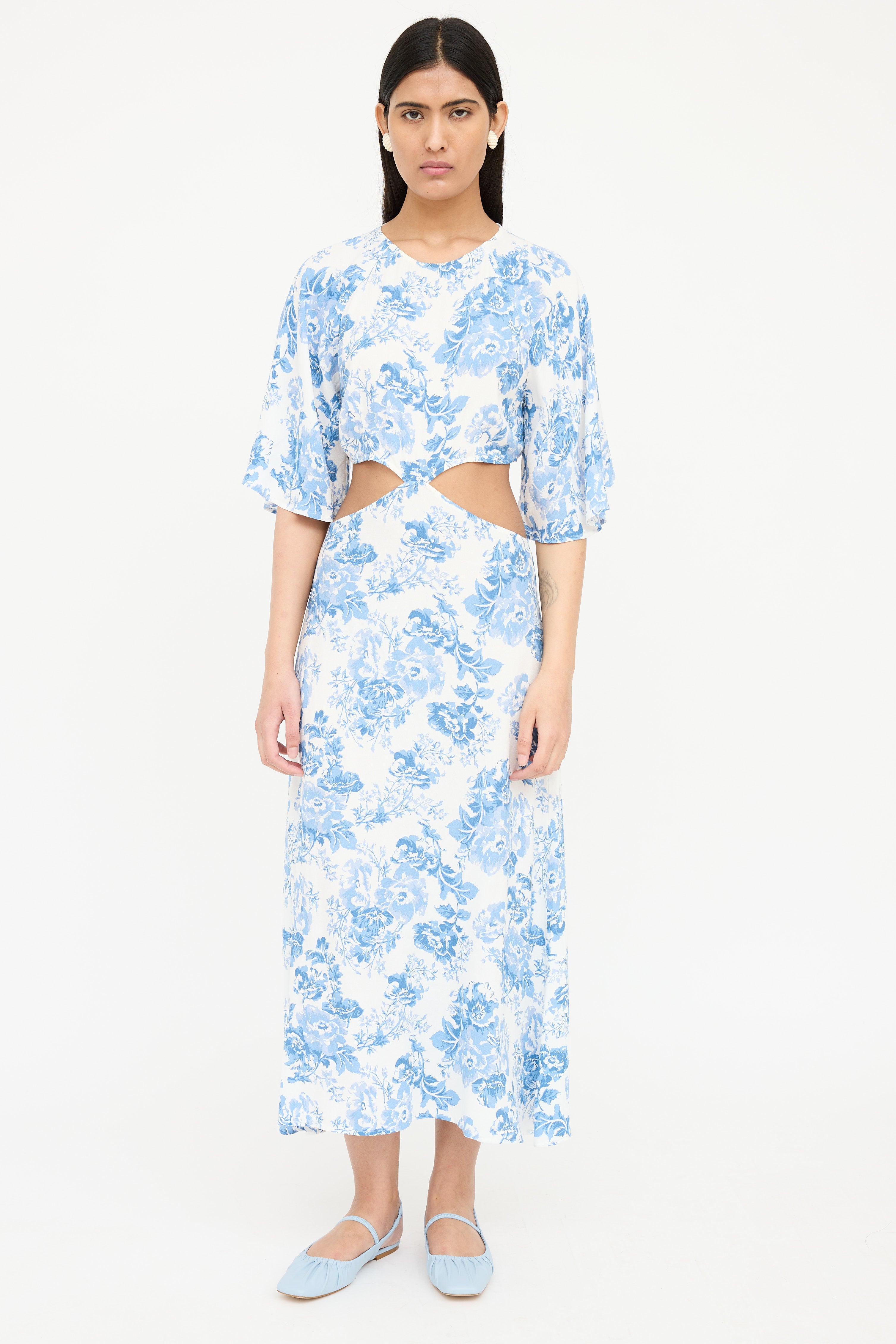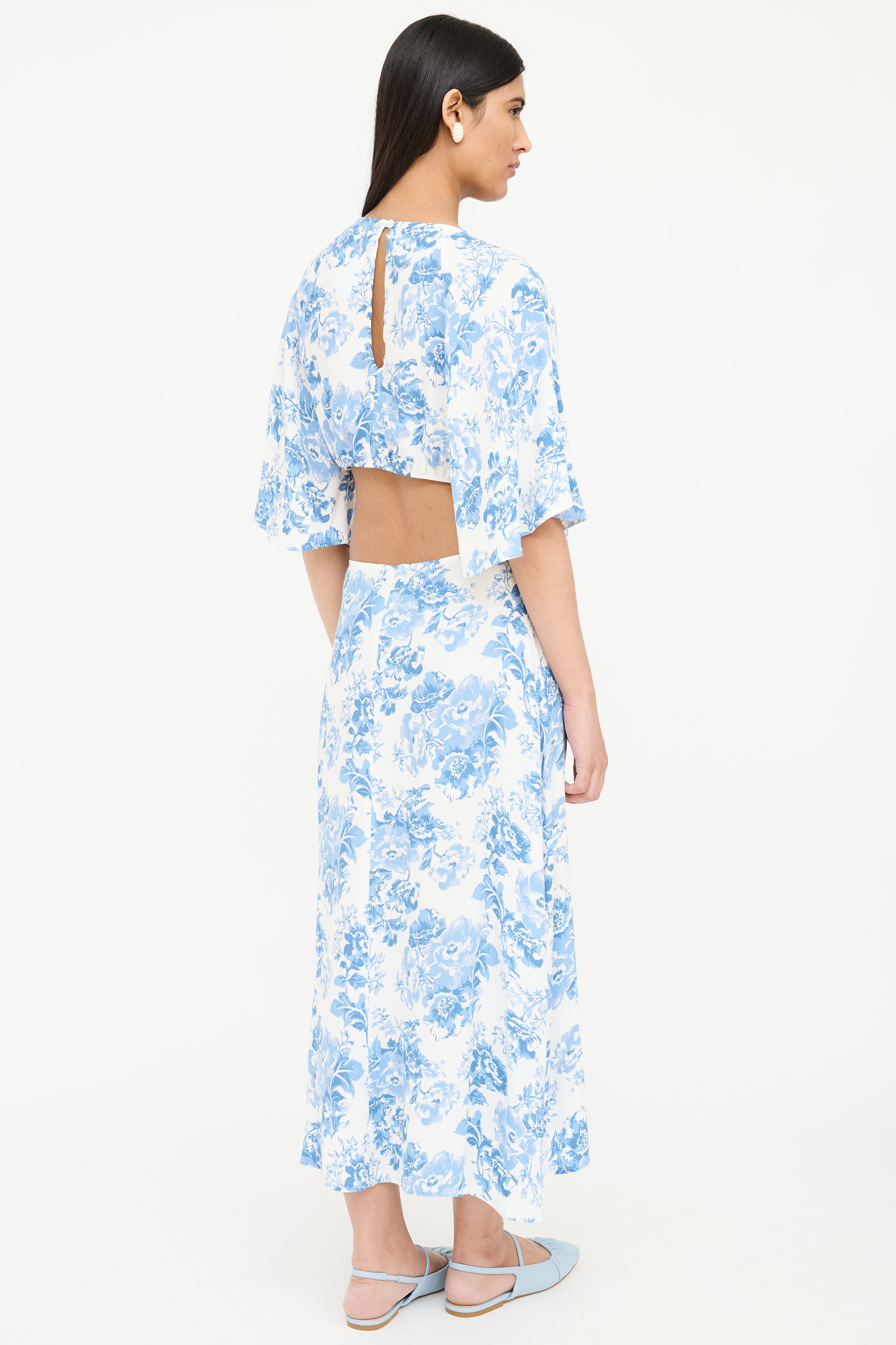 Pre-owned Reformation blue and white dress featuring round neck, keyhole opening on back of neck, floral print, cut out waist, maxi length and zip entry on back of skirt.