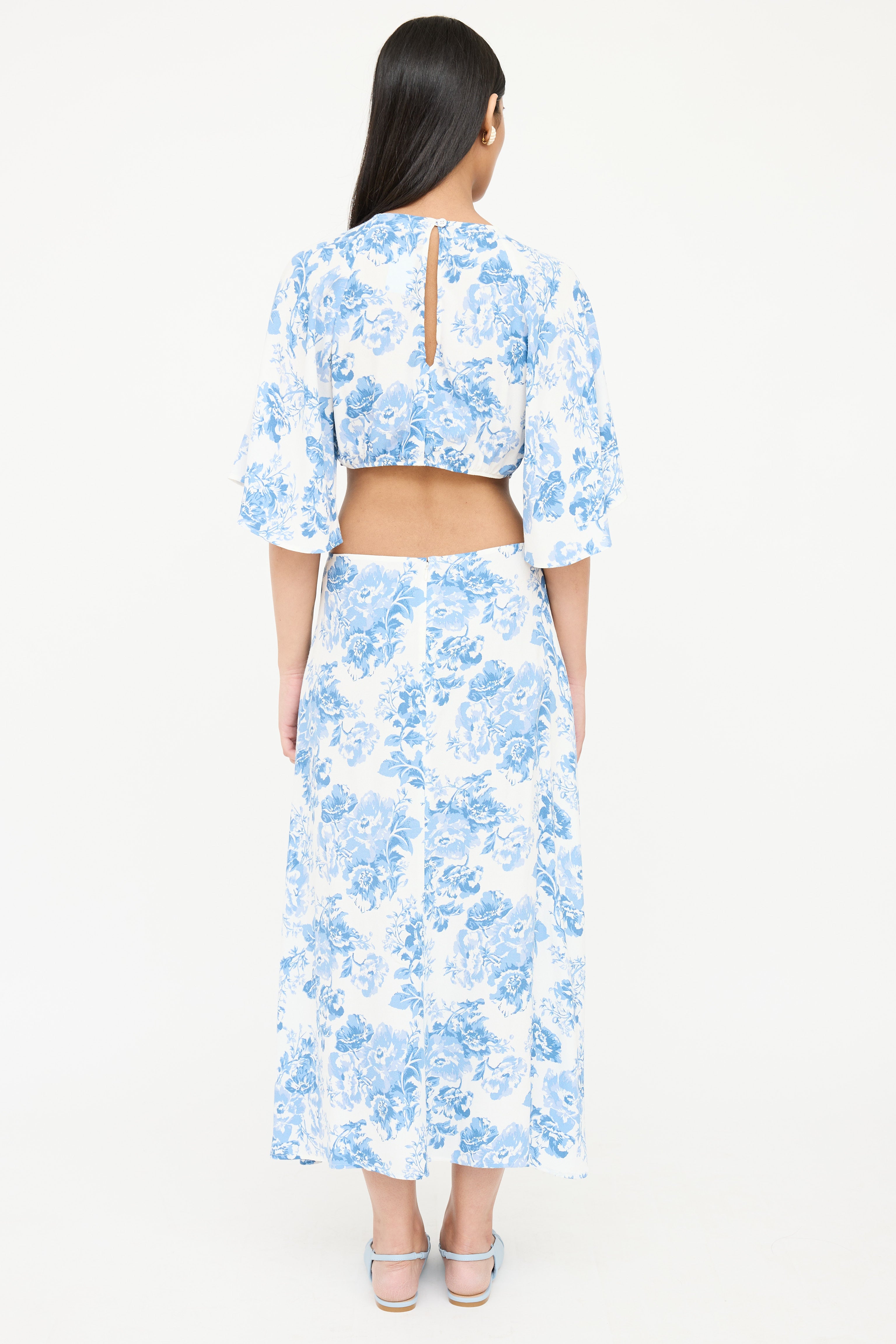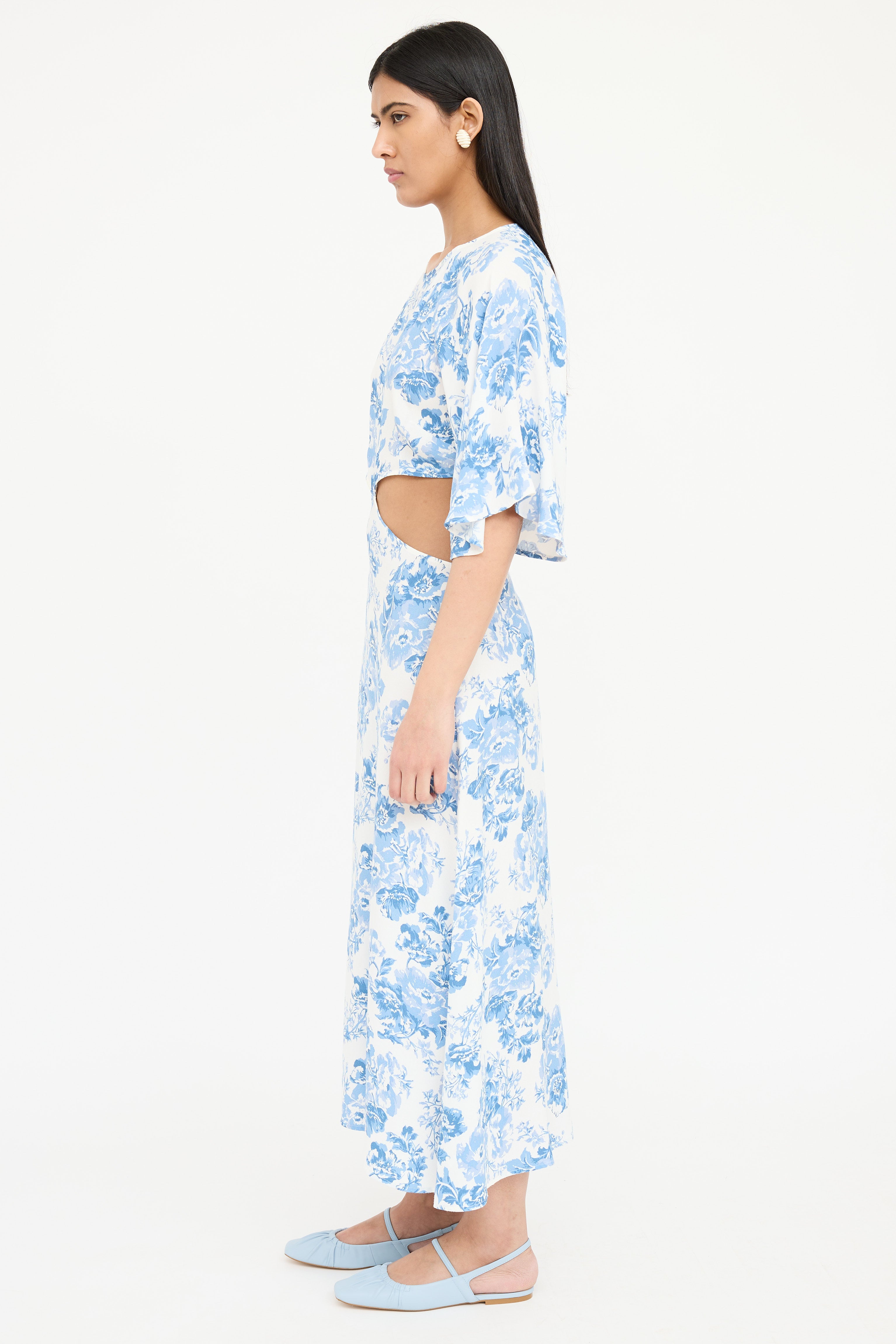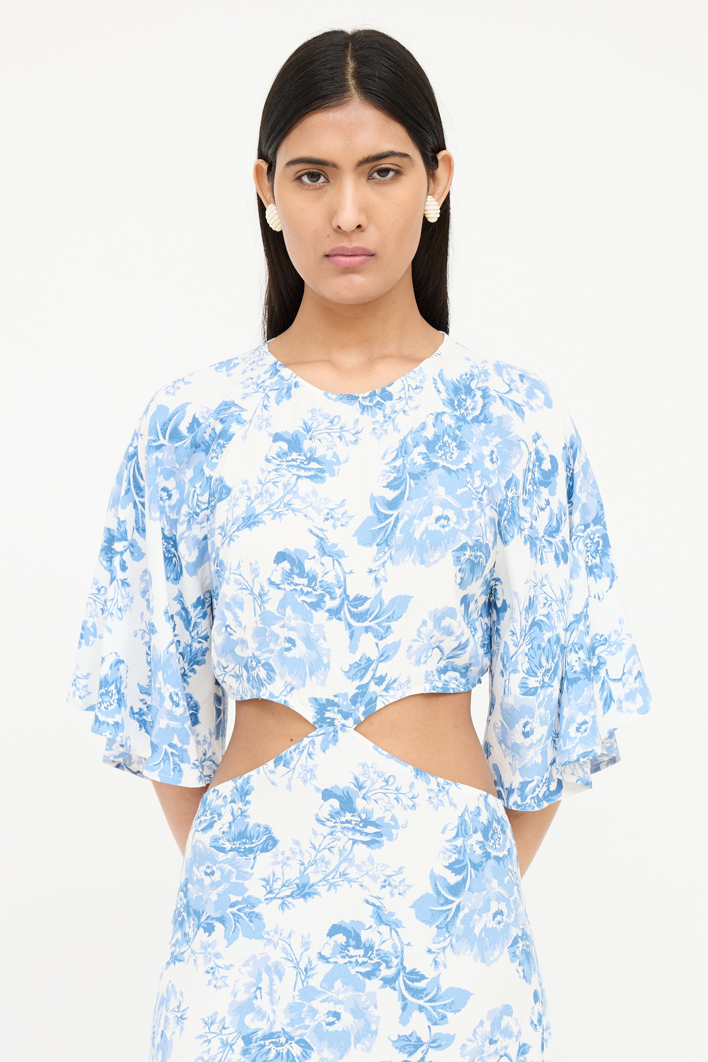 Pre-owned Reformation blue and white dress featuring round neck, keyhole opening on back of neck, floral print, cut out waist, maxi length and zip entry on back of skirt.