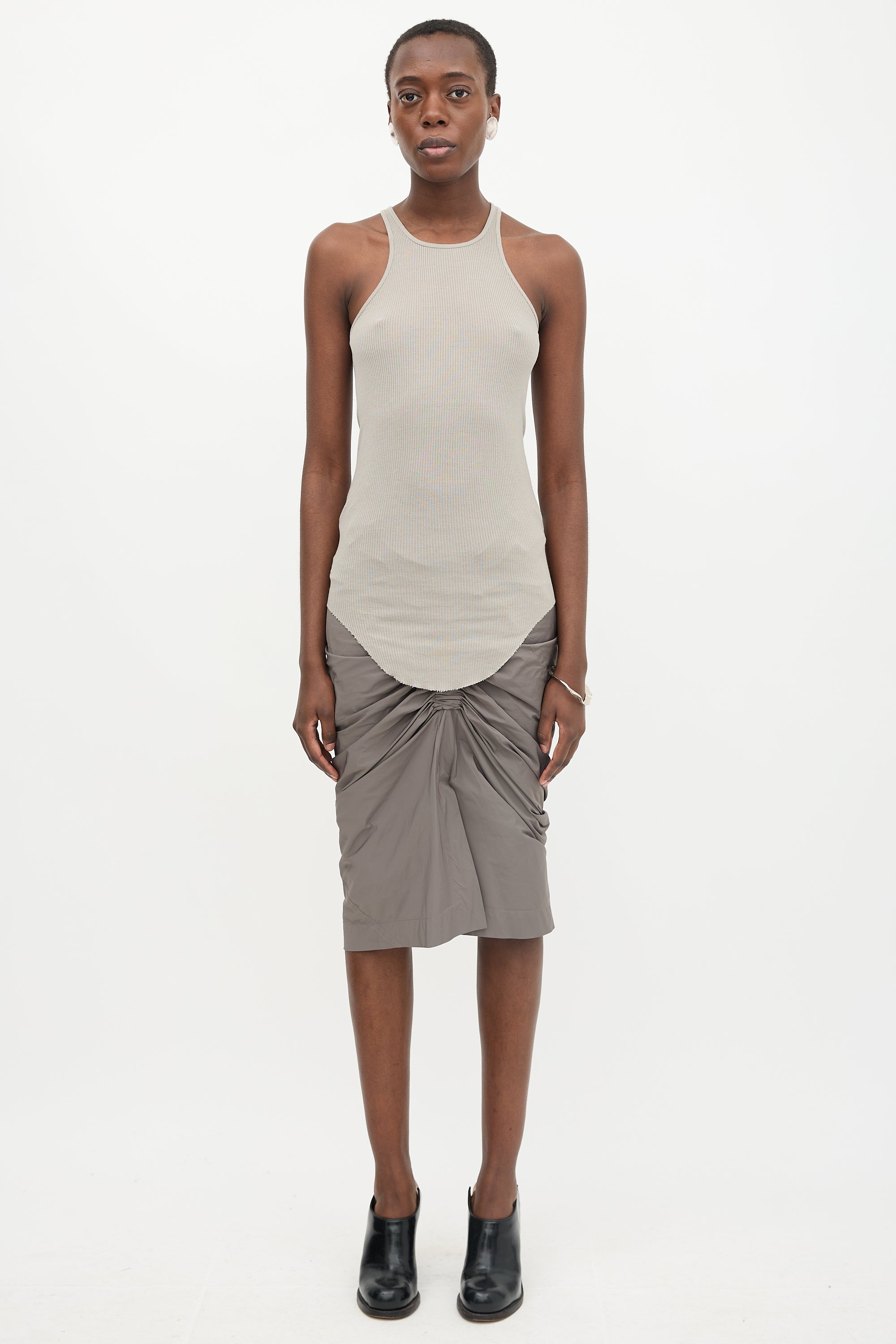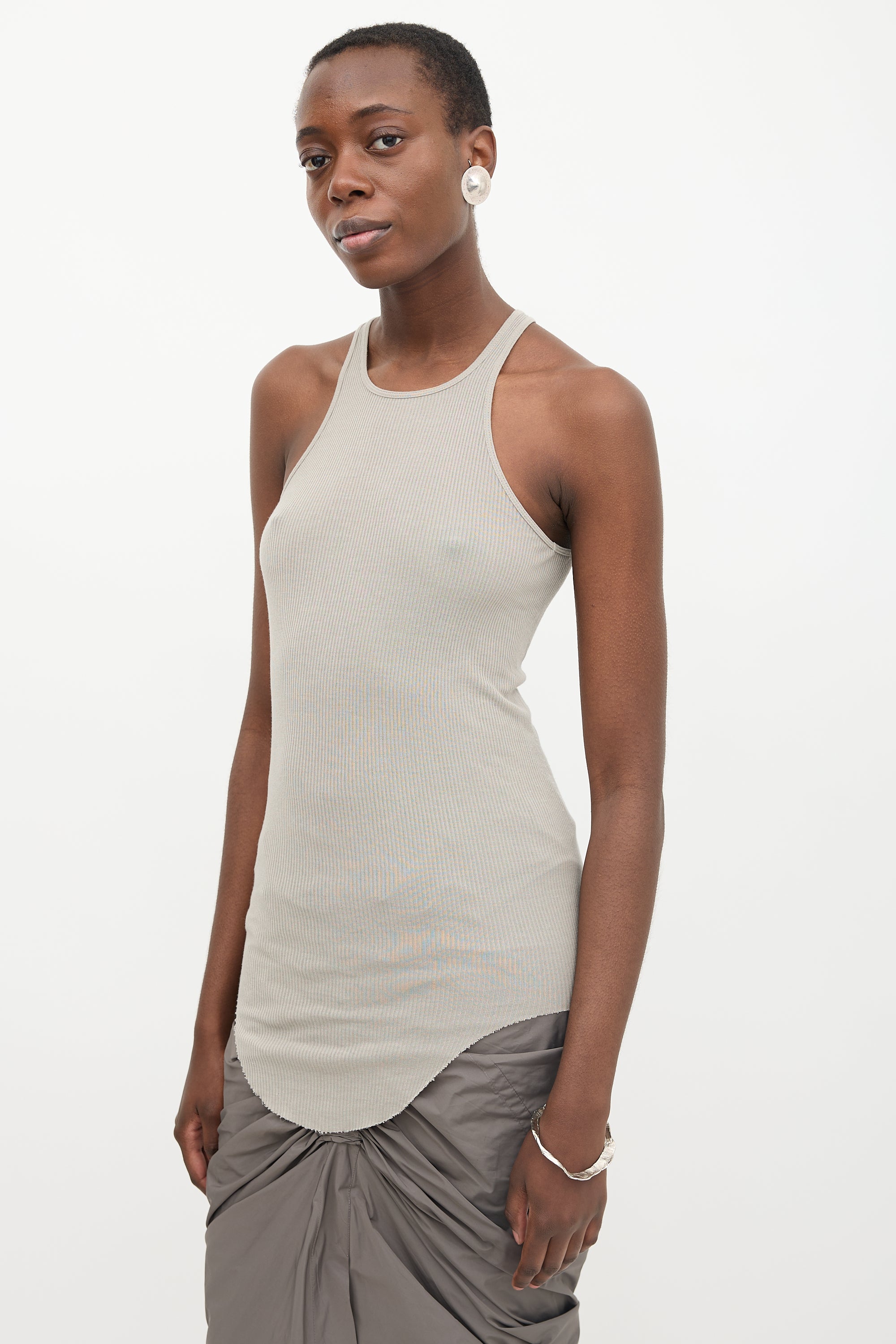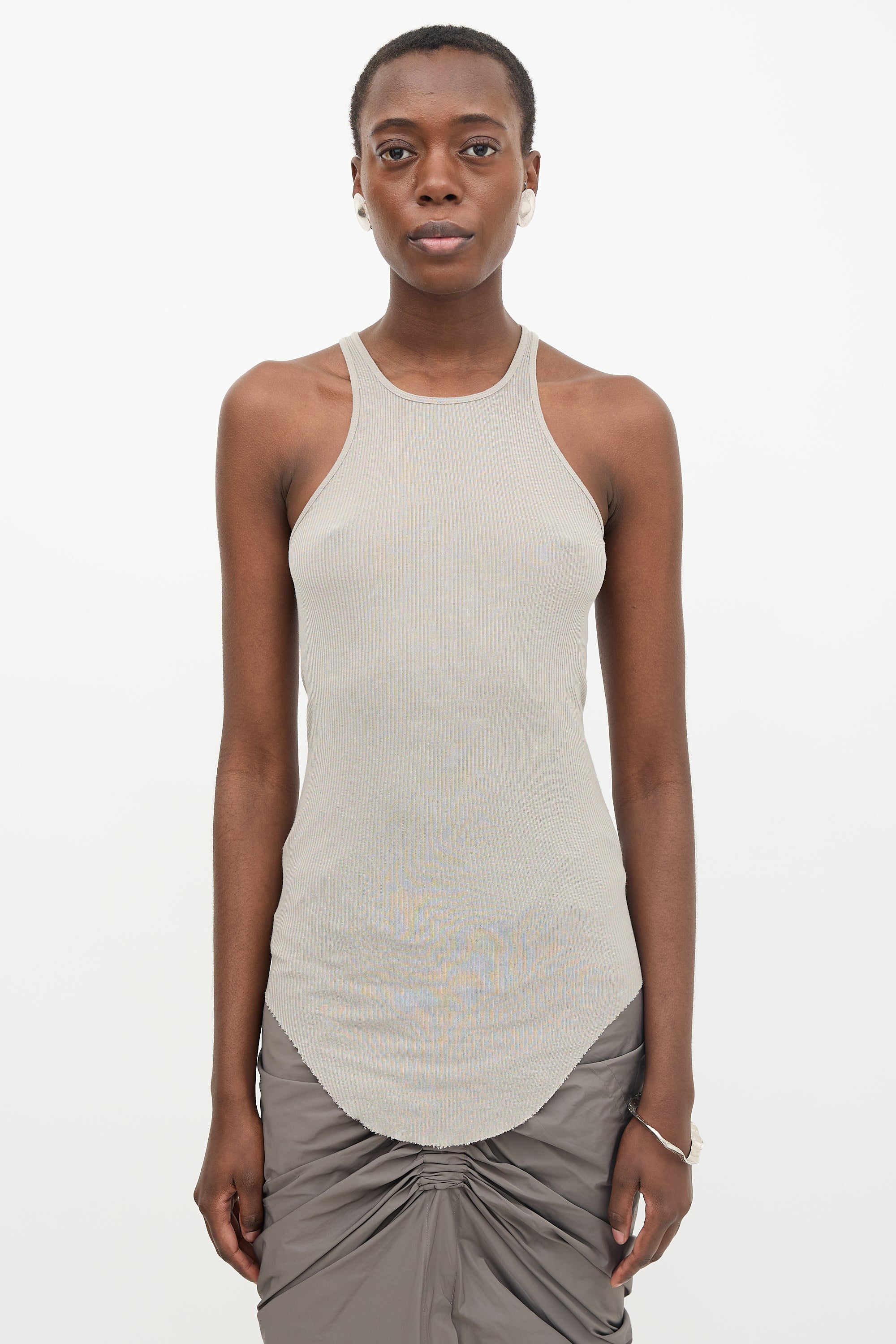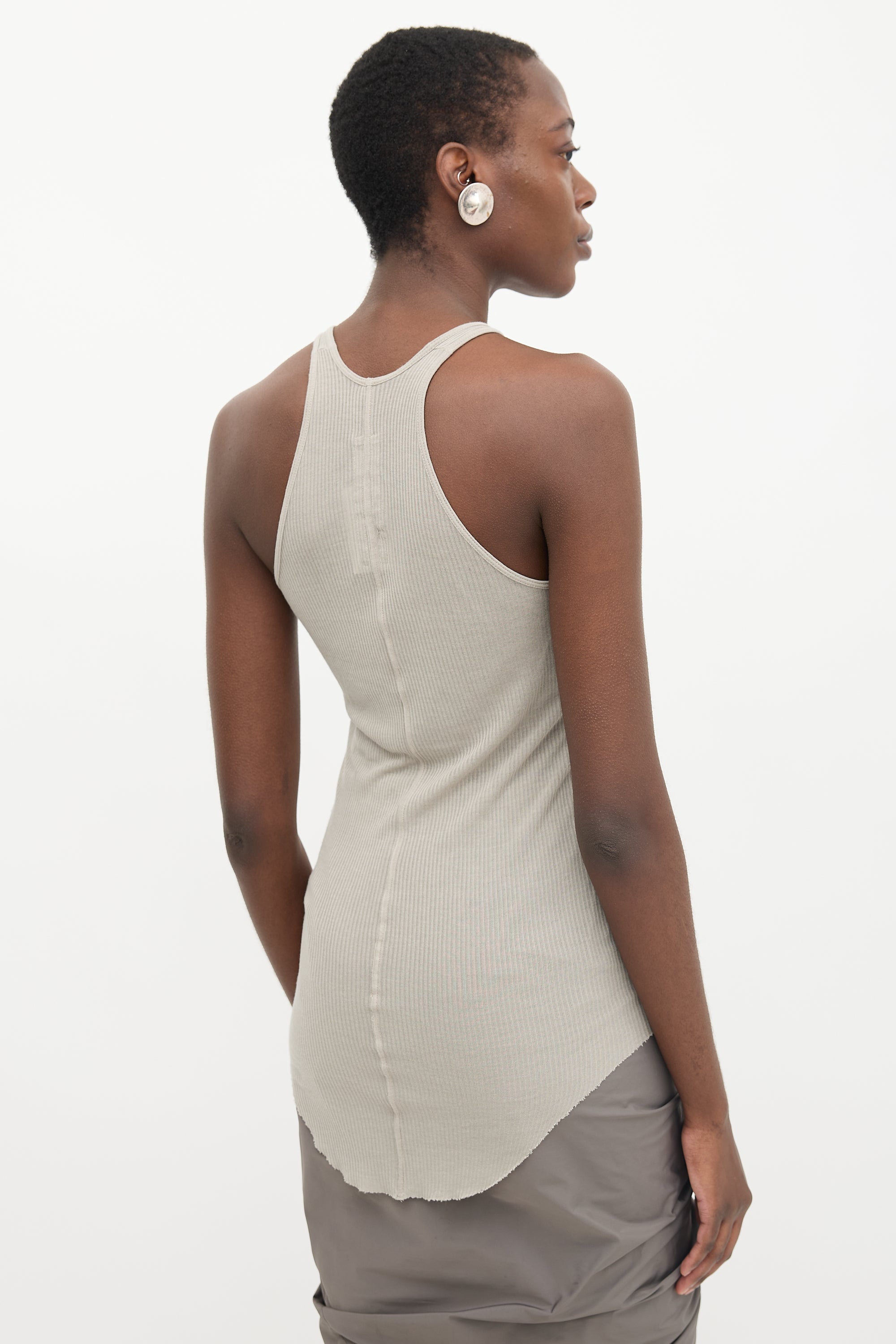 Rick Owens grey Basic Rib tank top featuring a round neckline, centre seam at back, and curved raw edge hem.