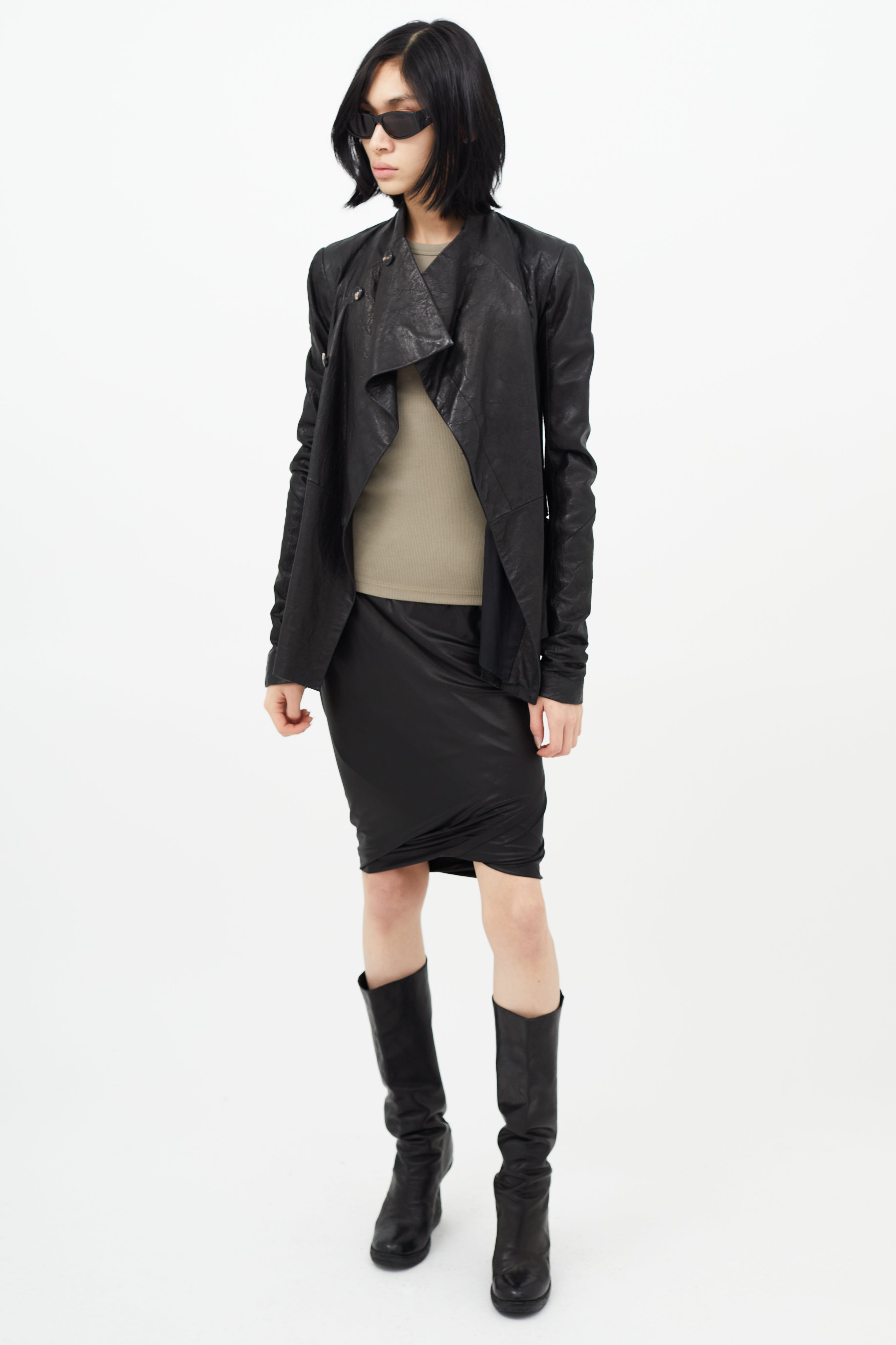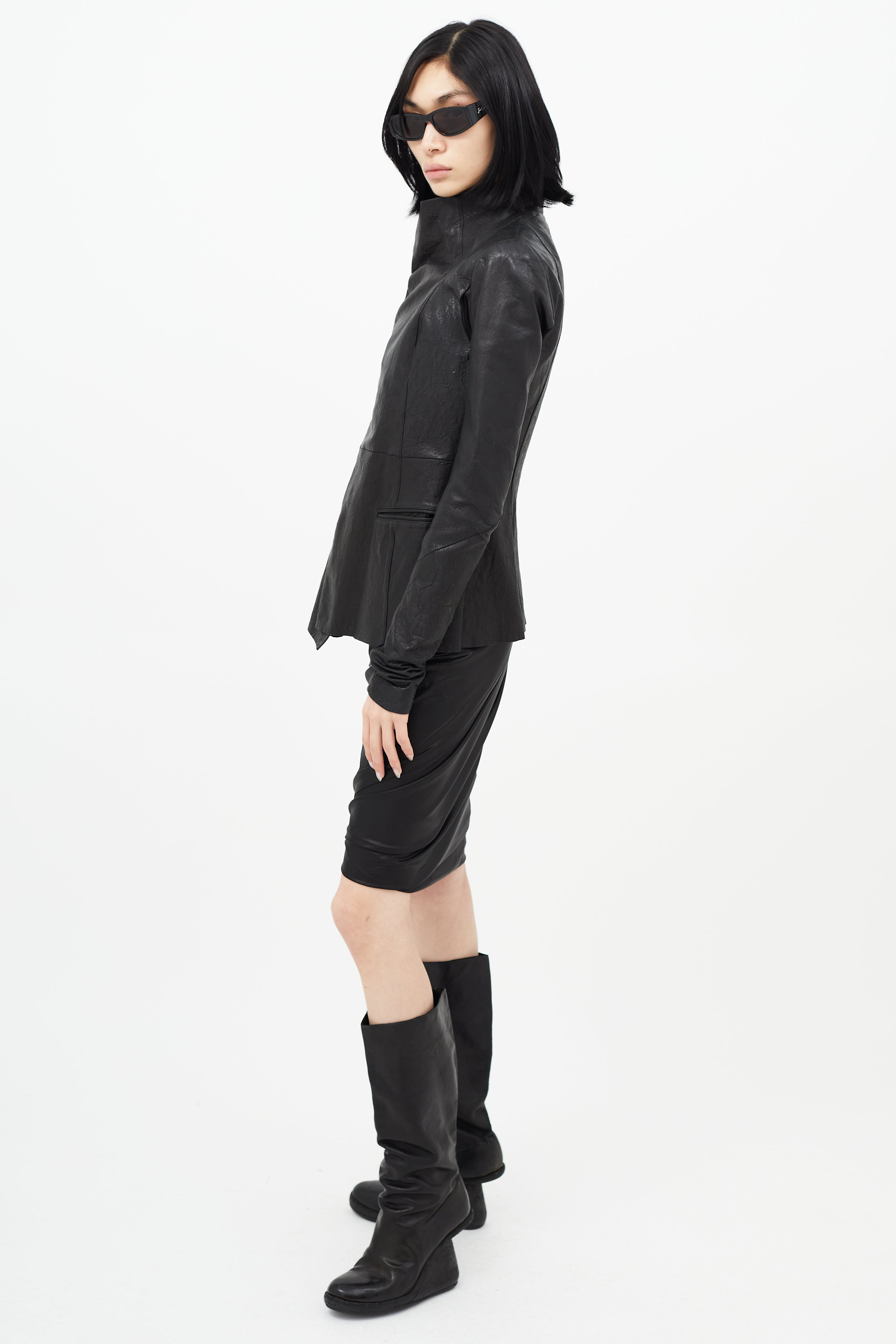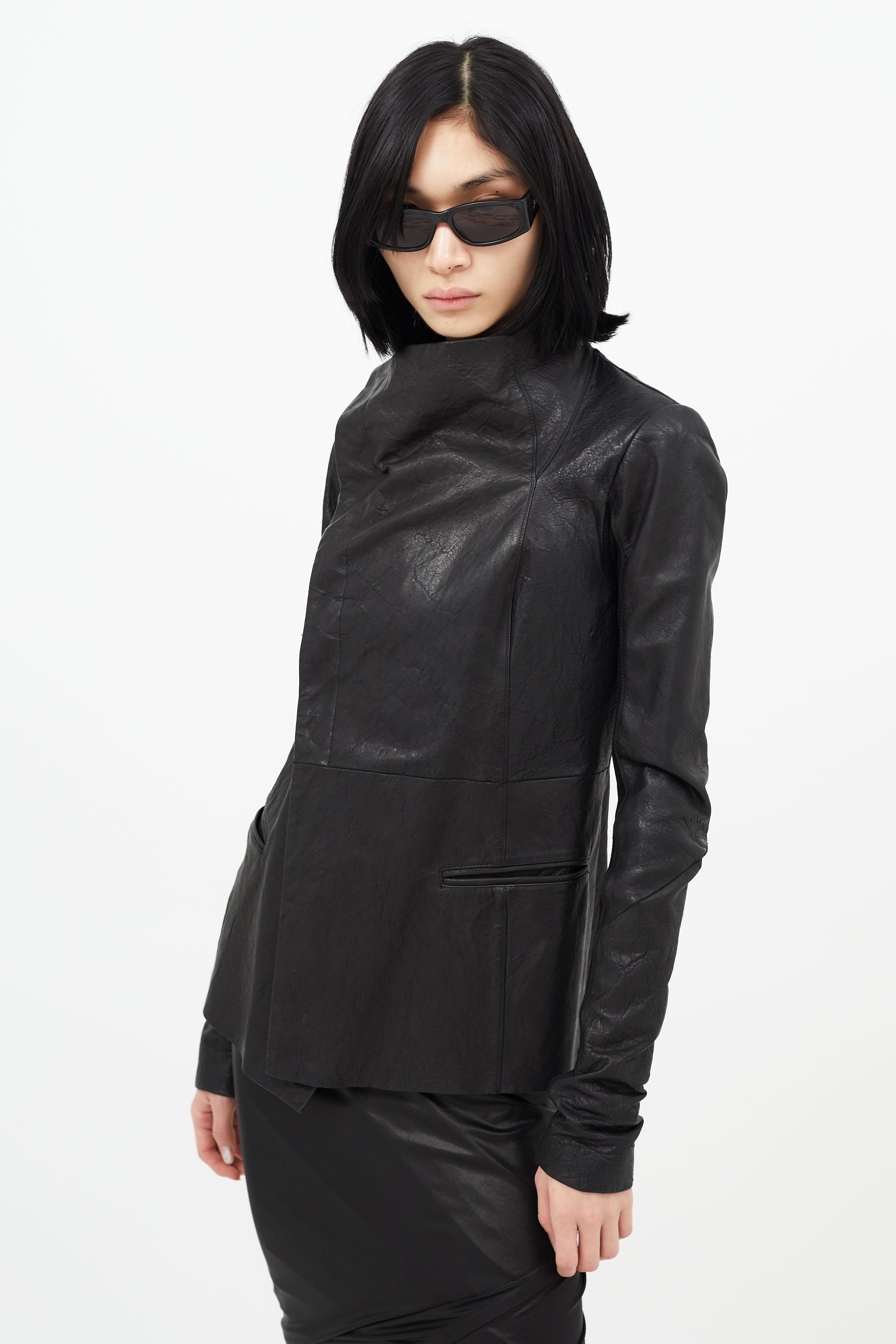 Pre-owned Rick Owens black jacket featuring asymmetrical front, button up front, two welt pockets, ribbed underarms, and flared hem. Lined.