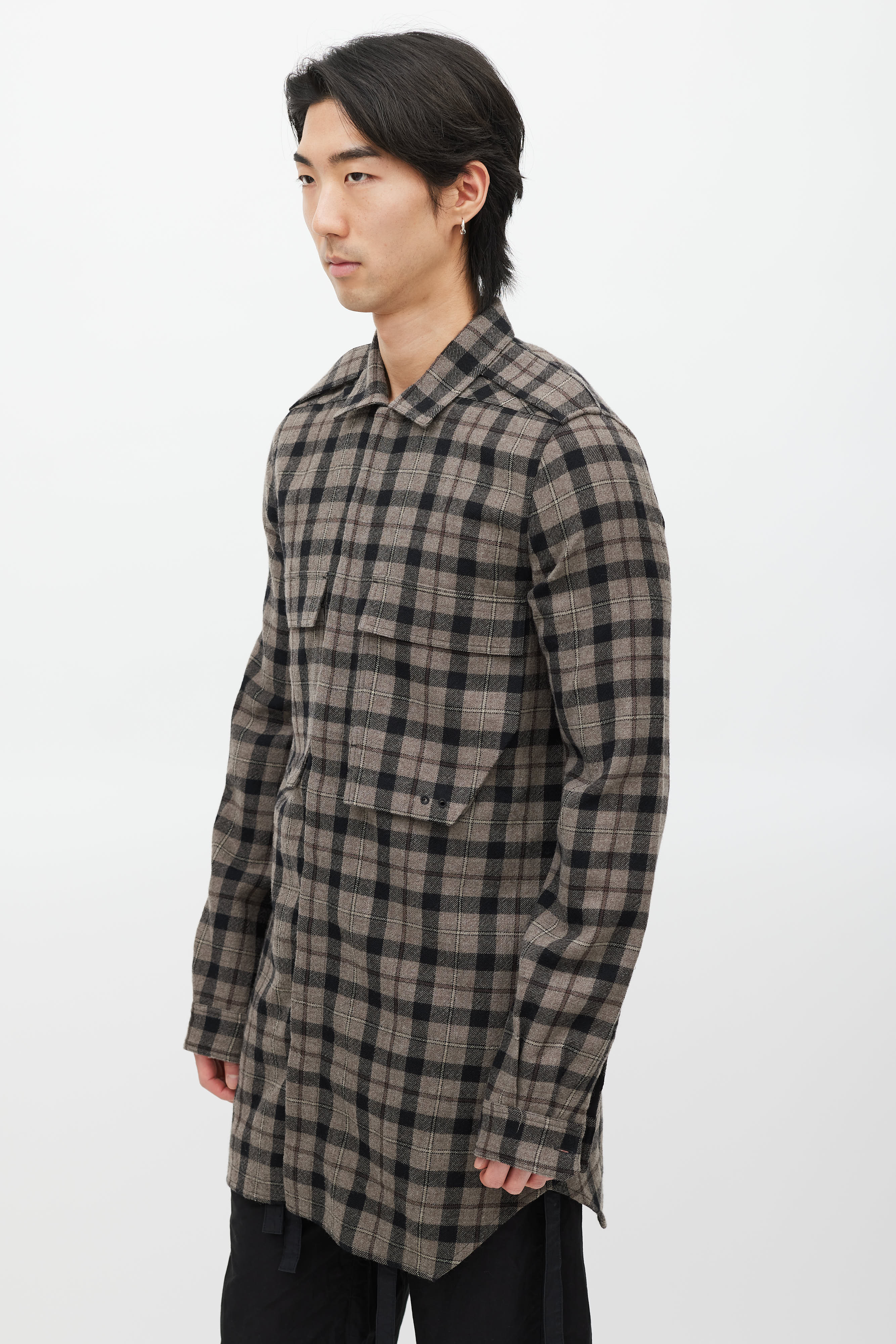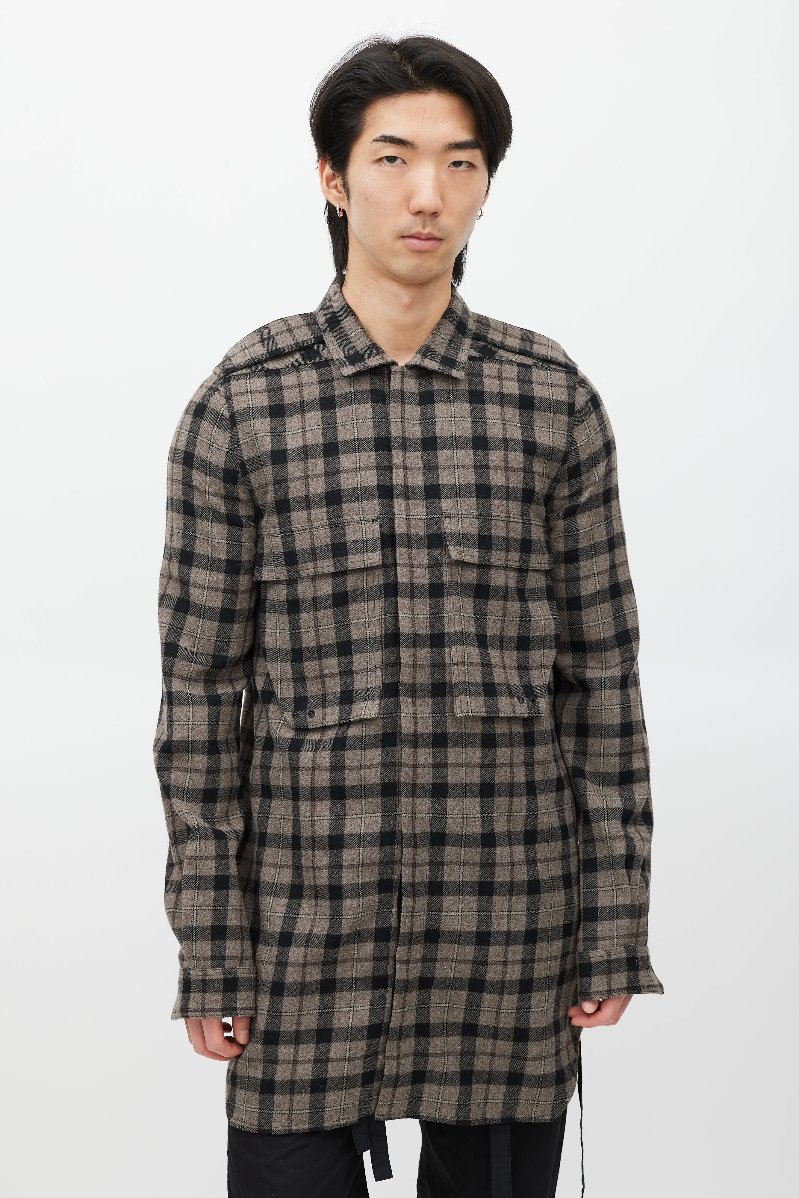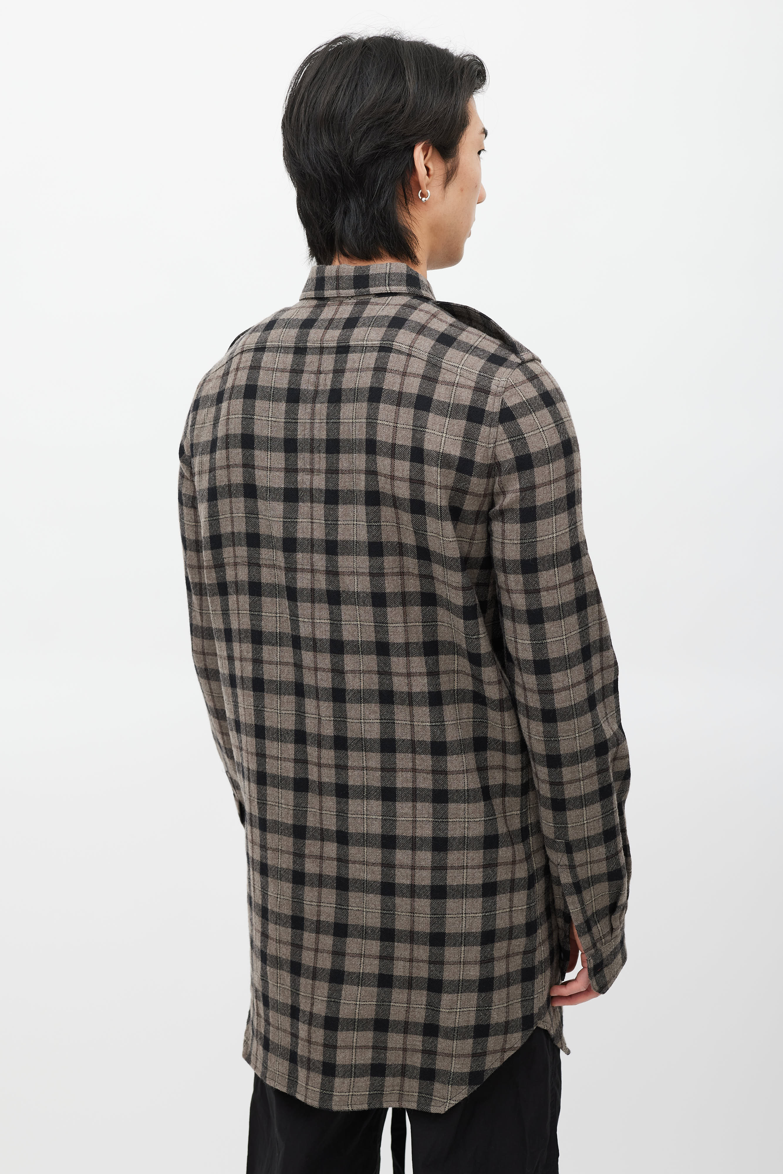 Rick Owens brown wool shirt featuring a black plaid pattern throughout, pointed collar, epaulets at shoulder, long sleeves with buttoned cuffs, two flap pockets at chest, and button up closure.