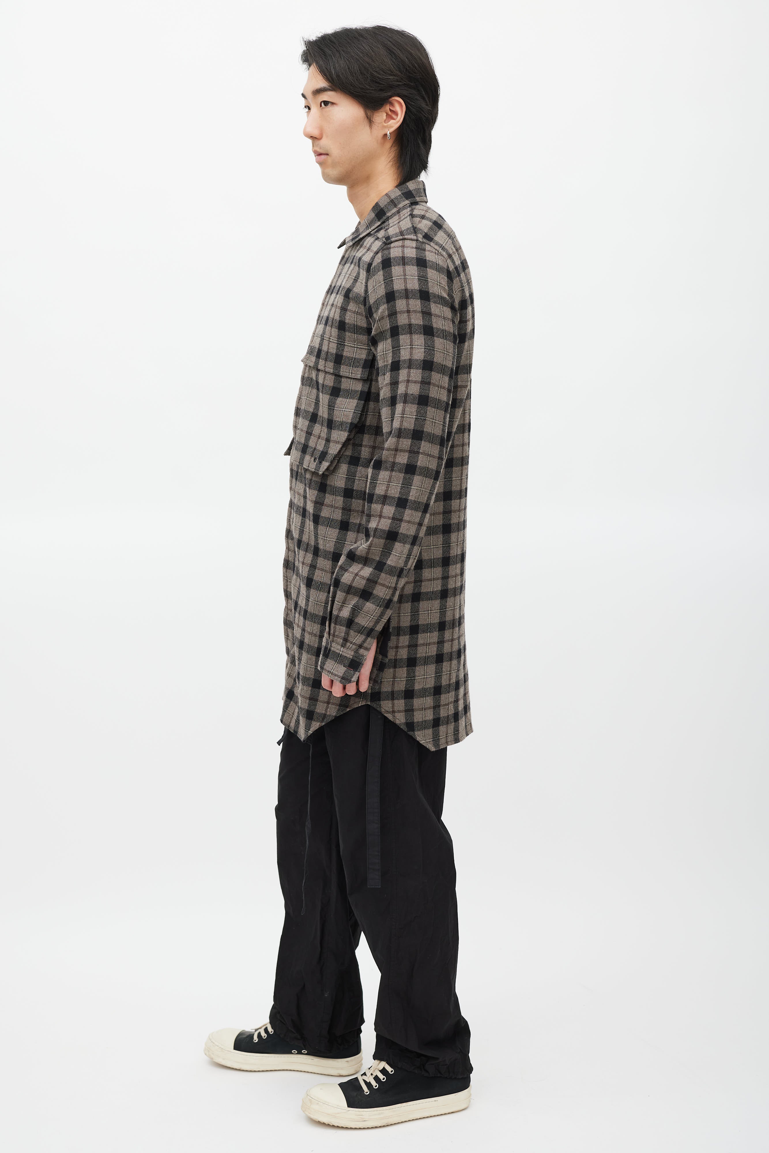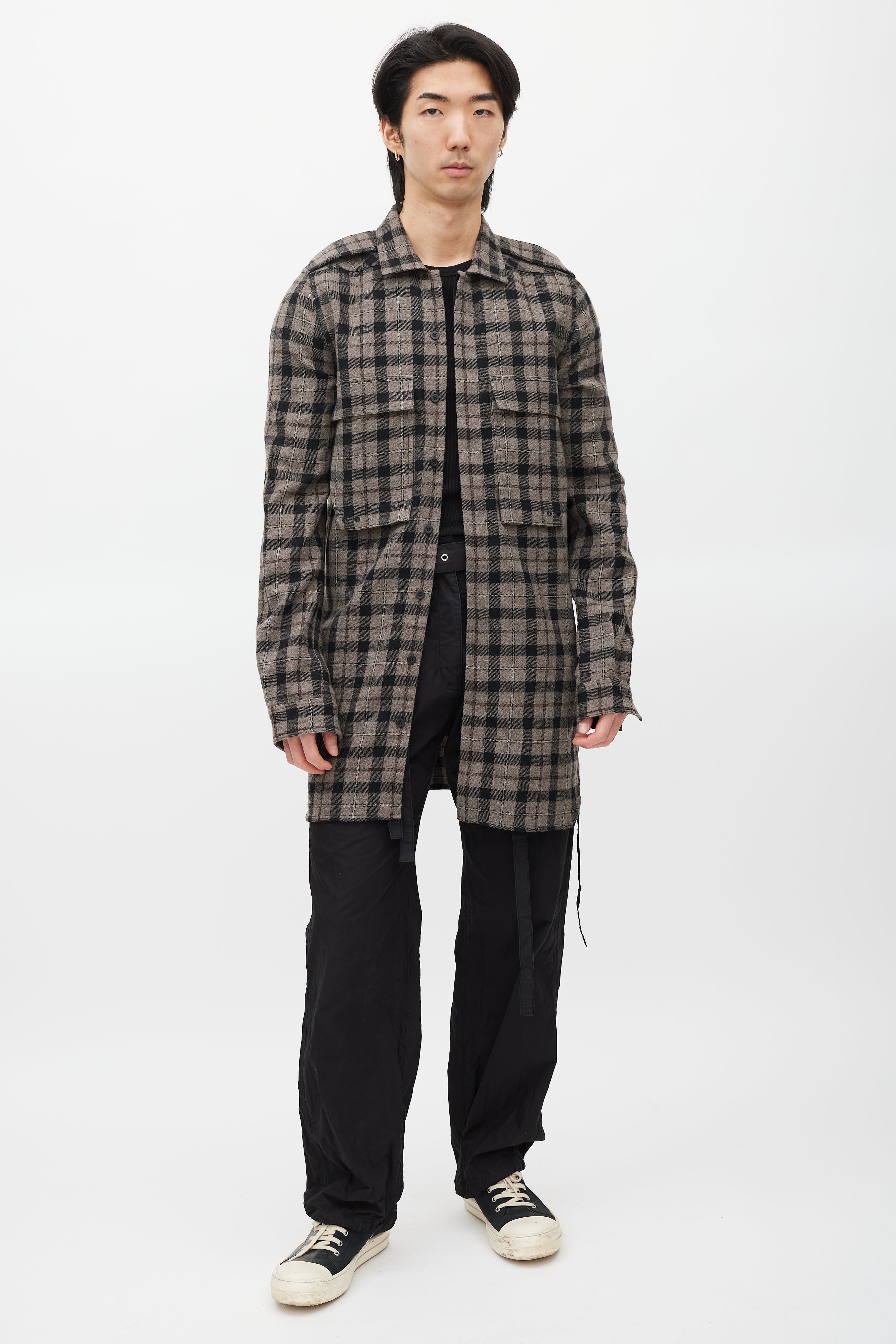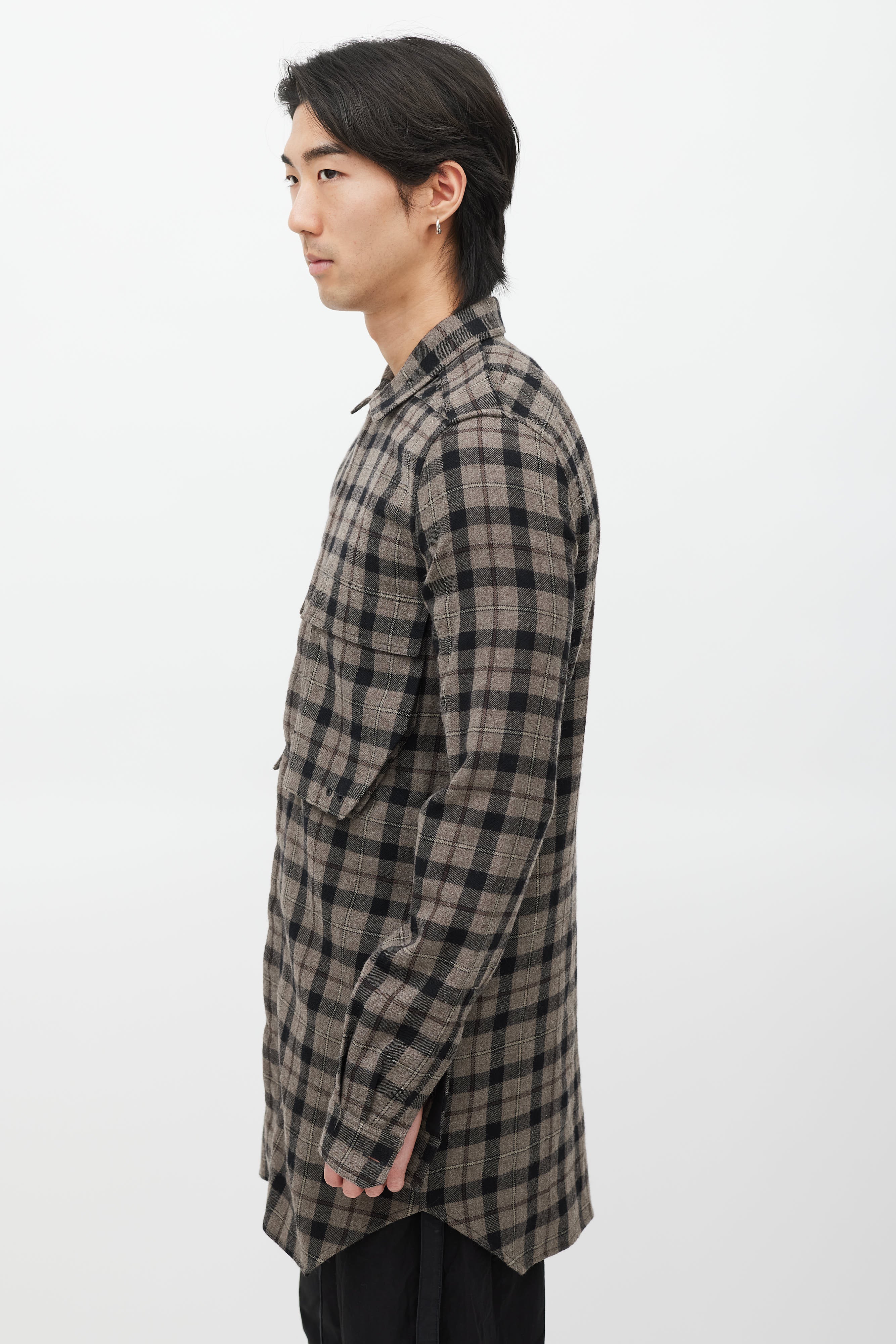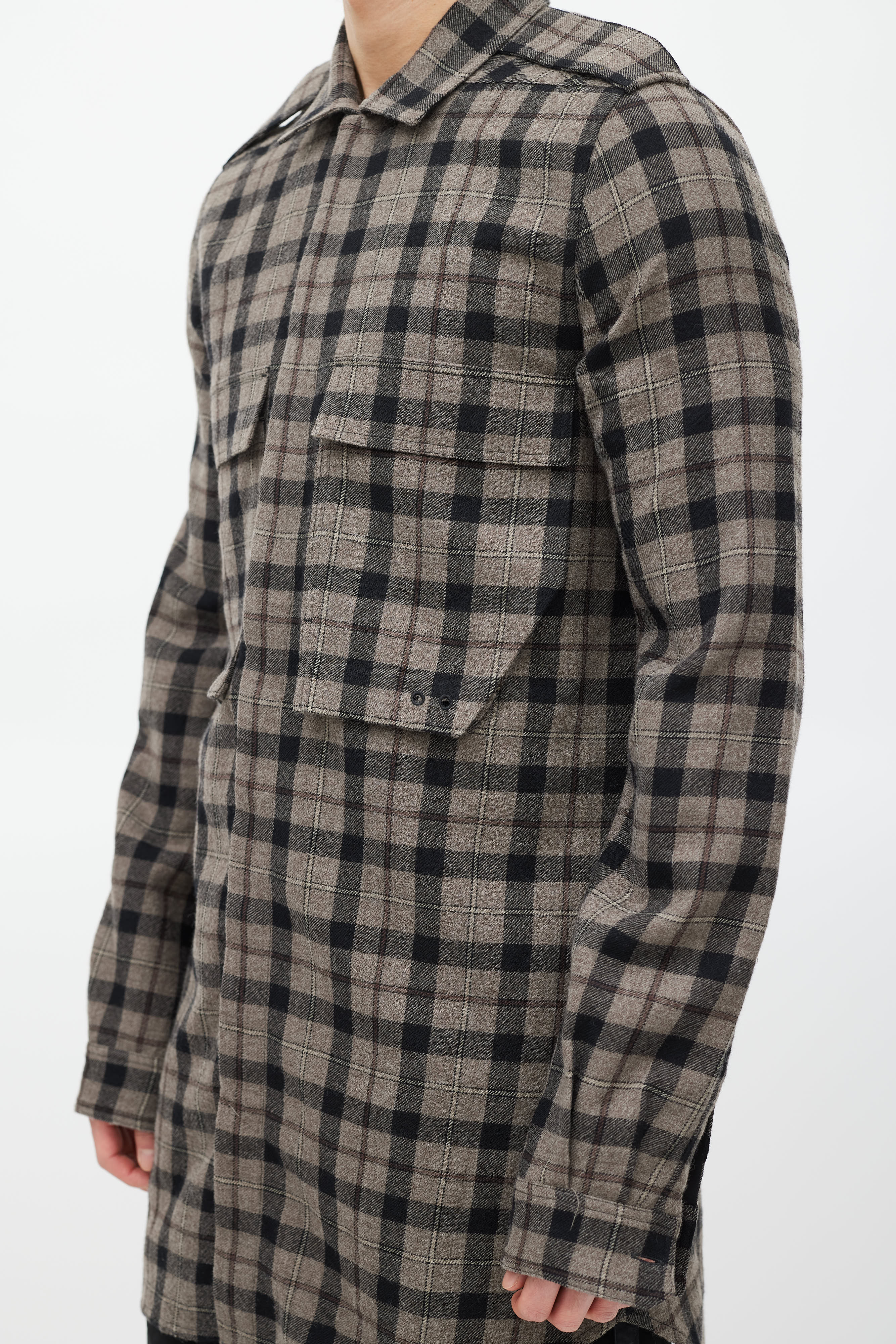 Rick Owens brown wool shirt featuring a black plaid pattern throughout, pointed collar, epaulets at shoulder, long sleeves with buttoned cuffs, two flap pockets at chest, and button up closure.