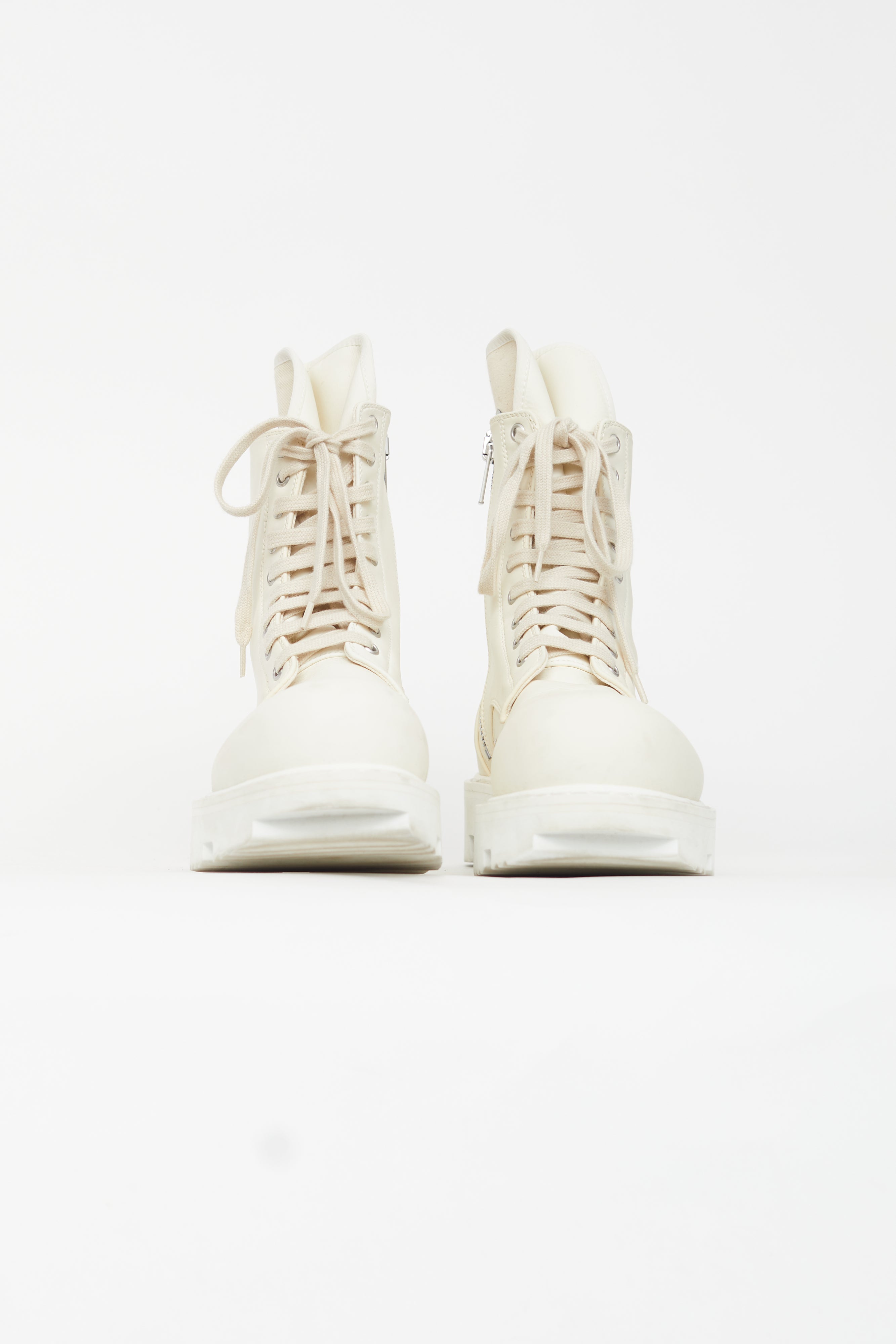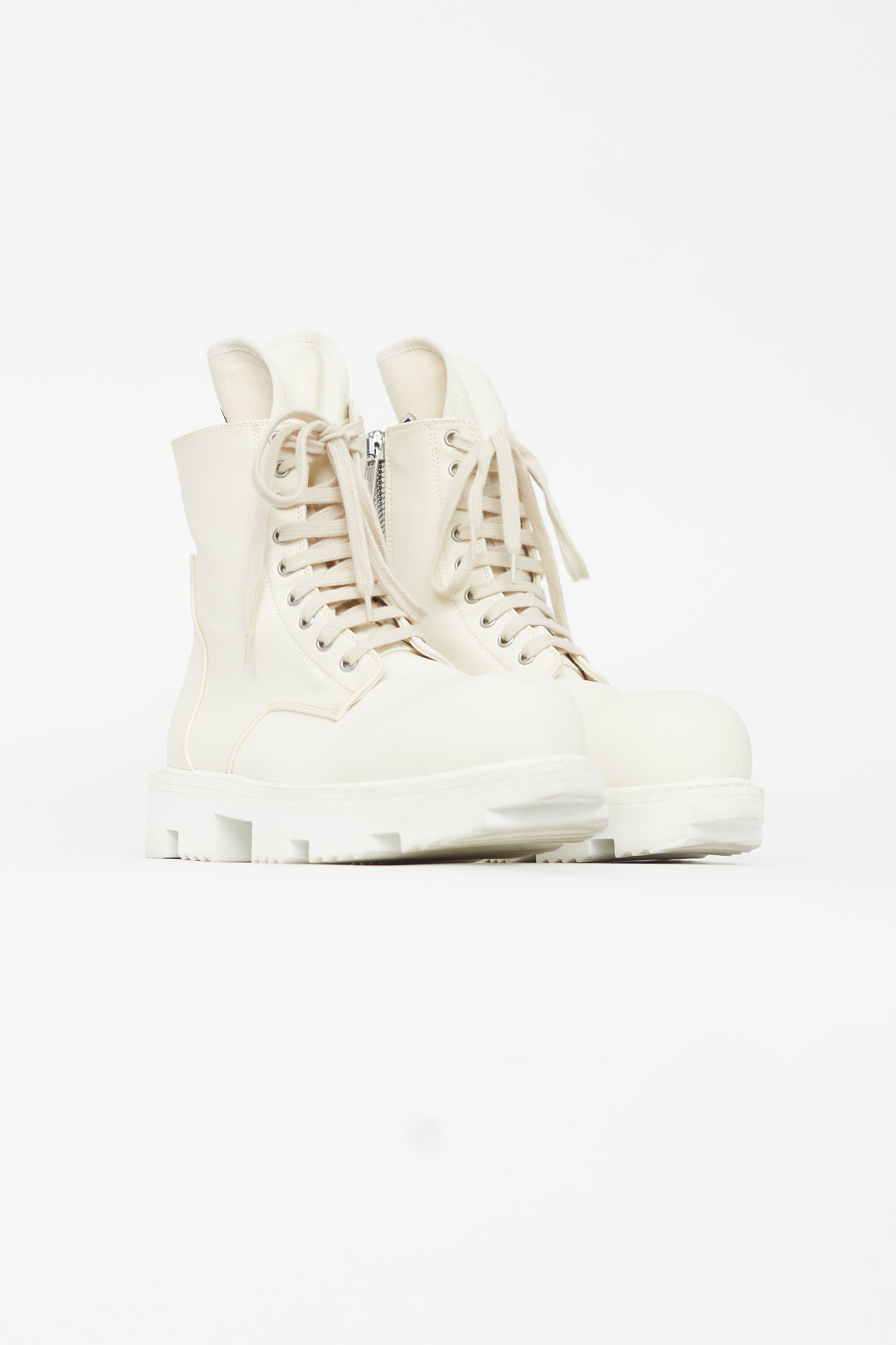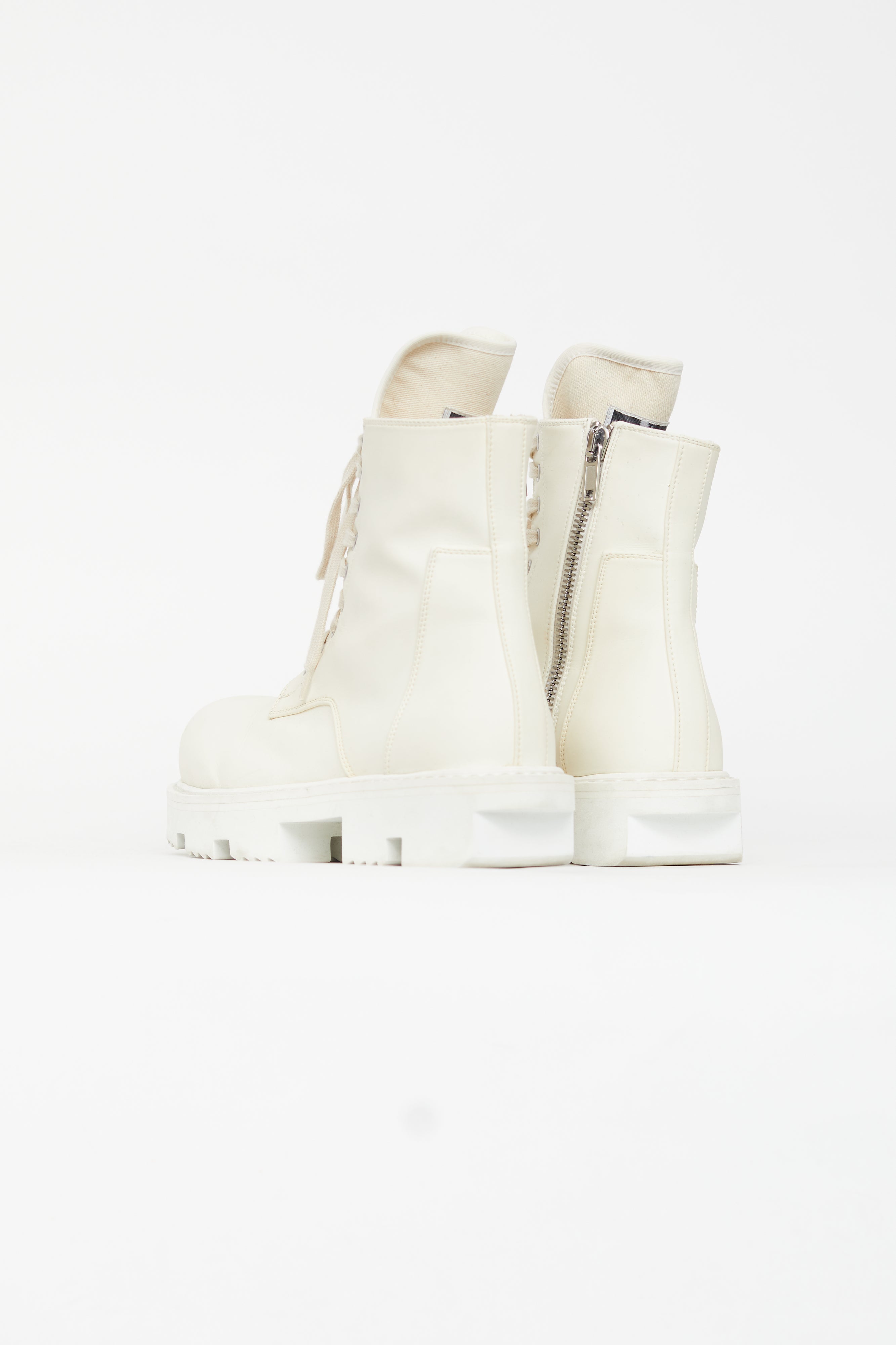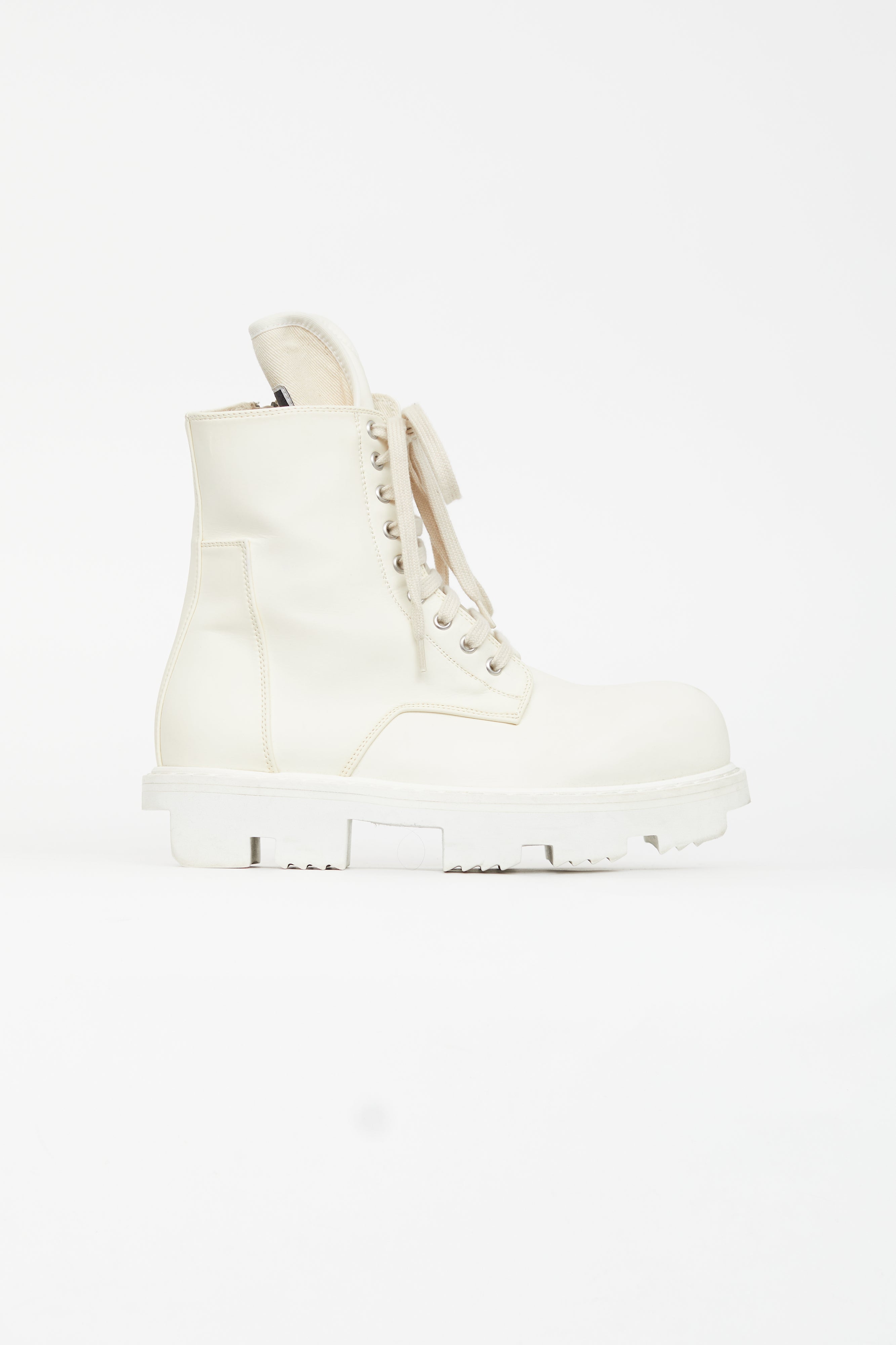 Pre-owned Rick Owens white Megatooth boots featuring rounded toe, zip closure at side, lace up vamp, and white chunky outsole. Comes with original dust bag.