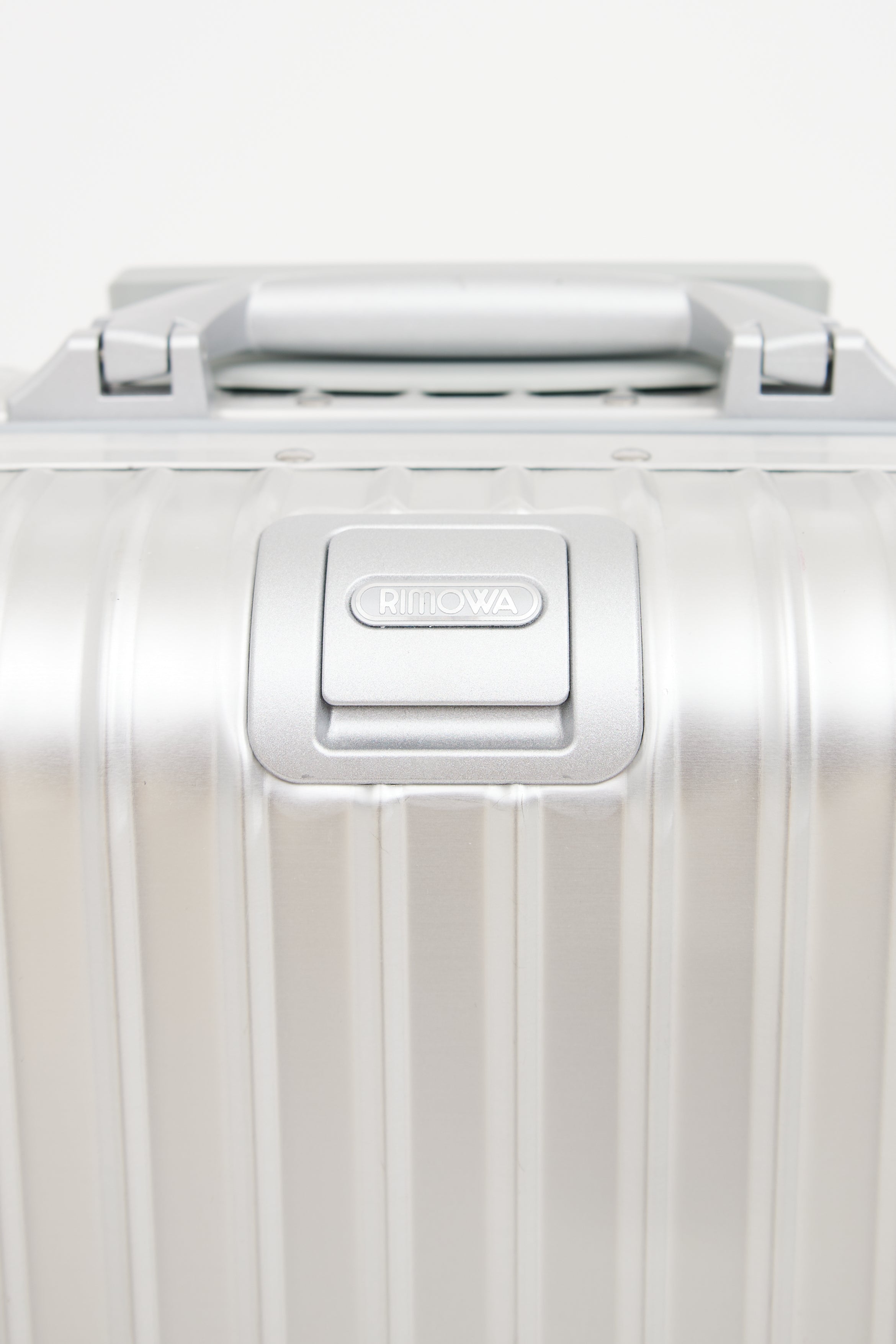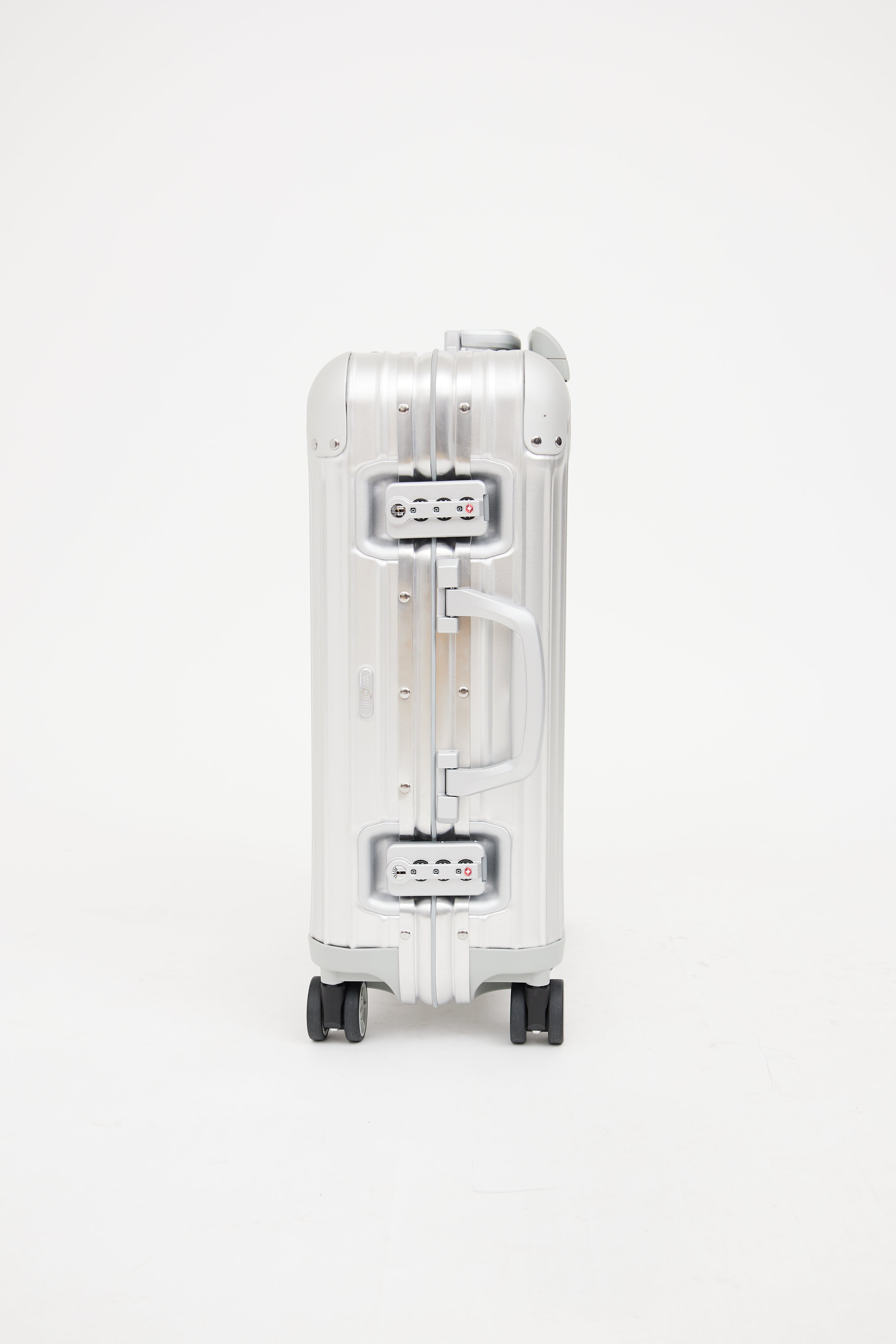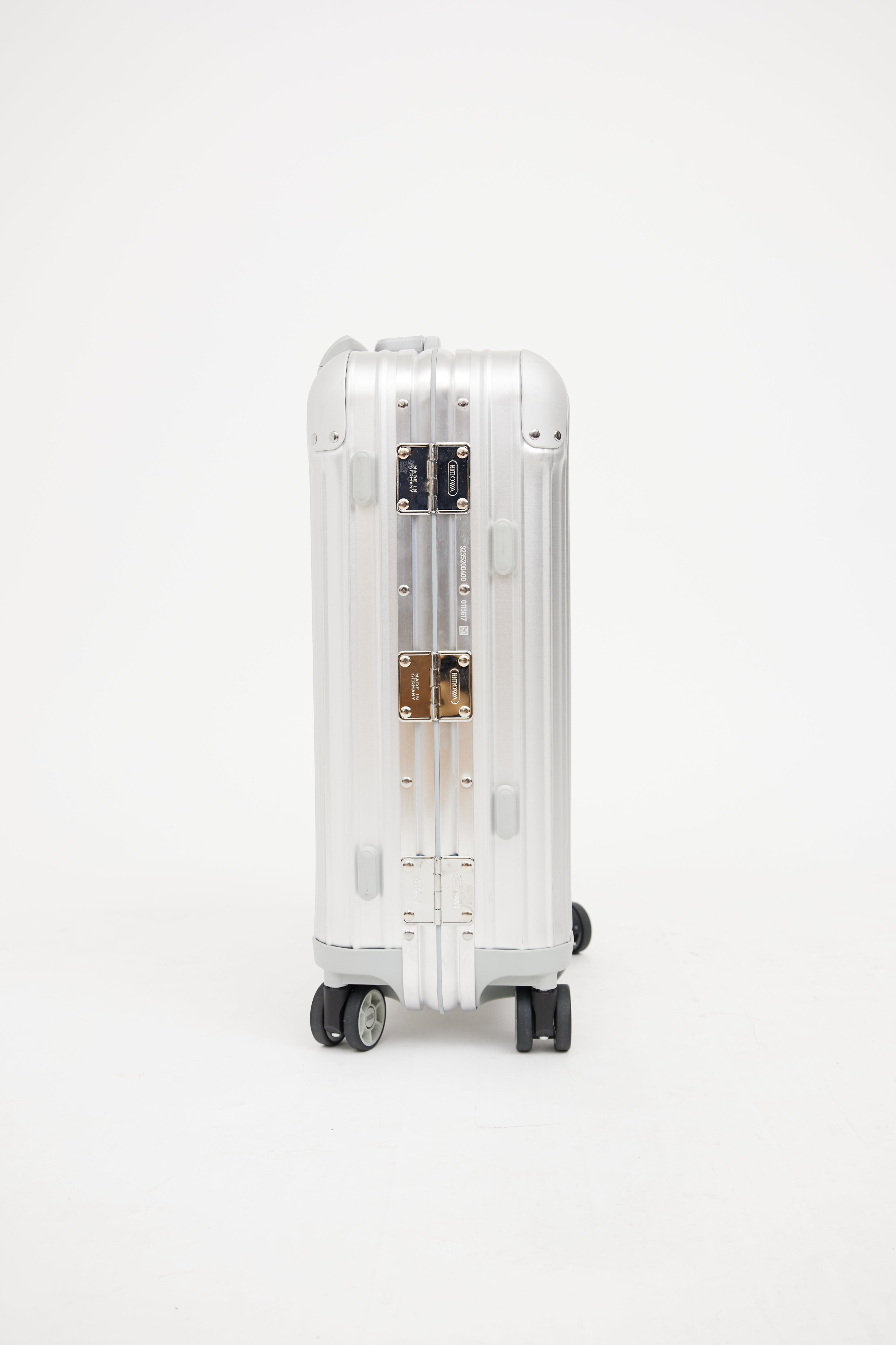 Pre-owned Rimowa Topas aluminum cabin suitcase featuring anodized aluminum, signature grooves, stage-free telescopic handle, RIMOWA multiwheel® system and TSA-approved locks. Interior features one main compartment and two height adjustable flex dividers.