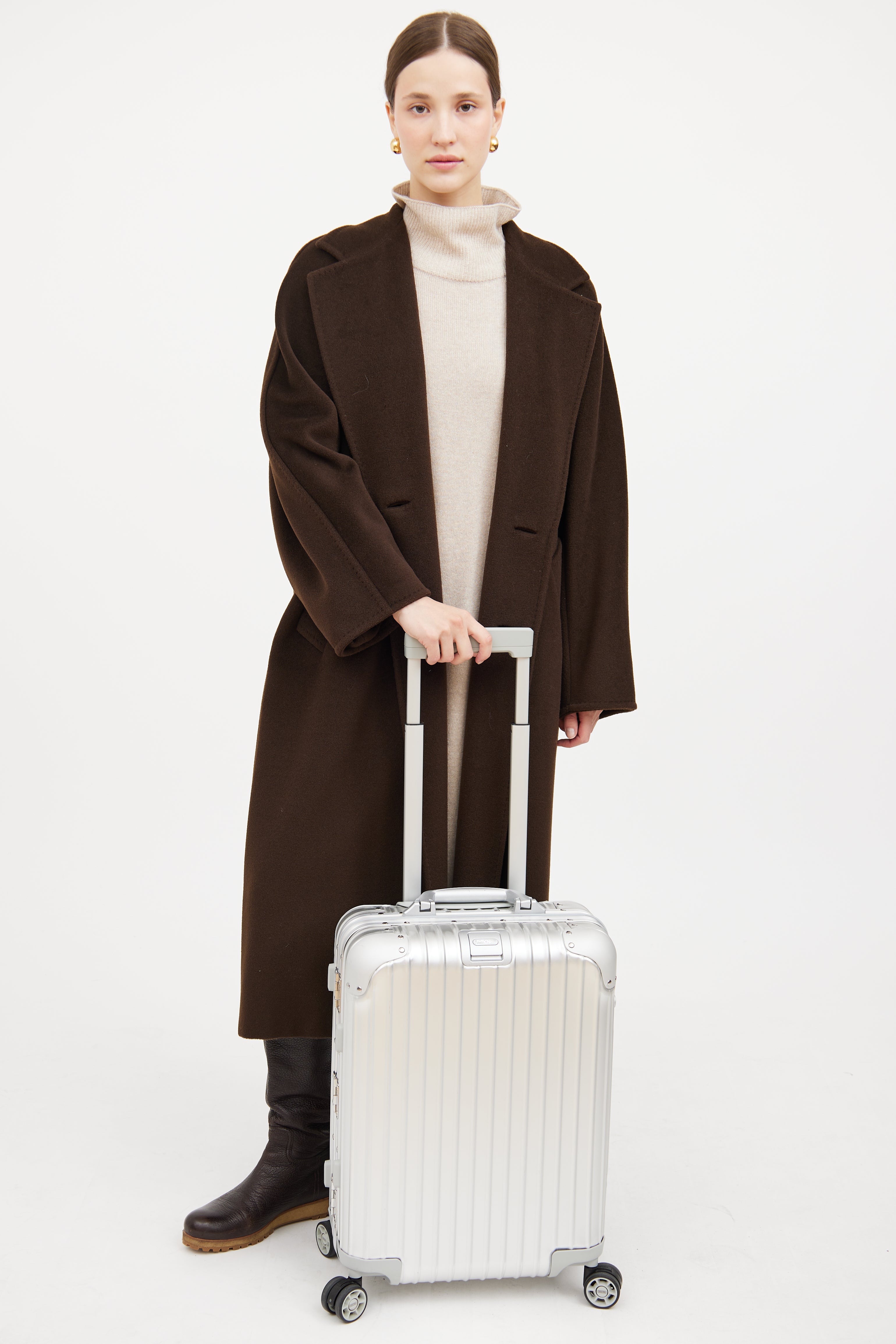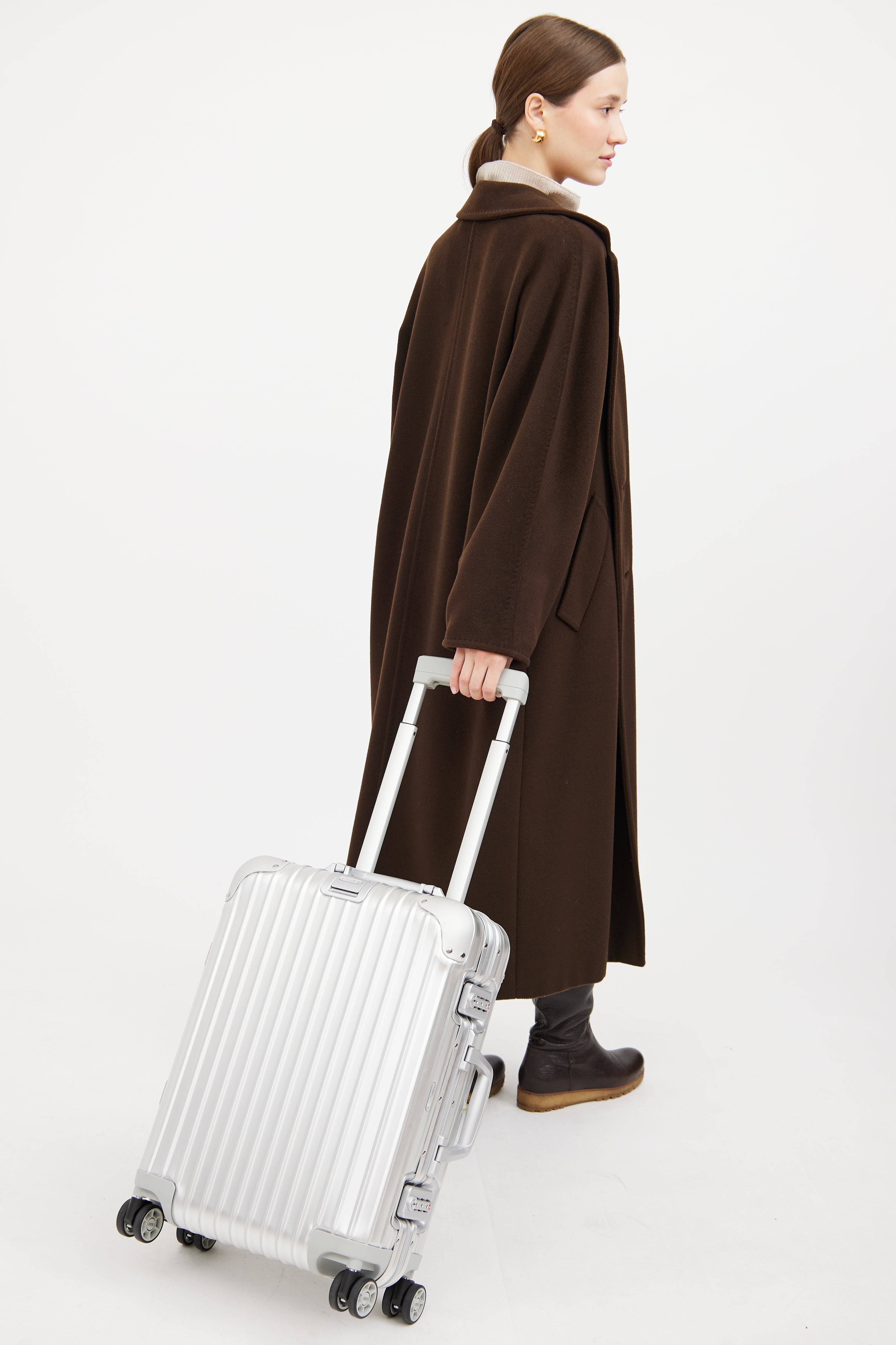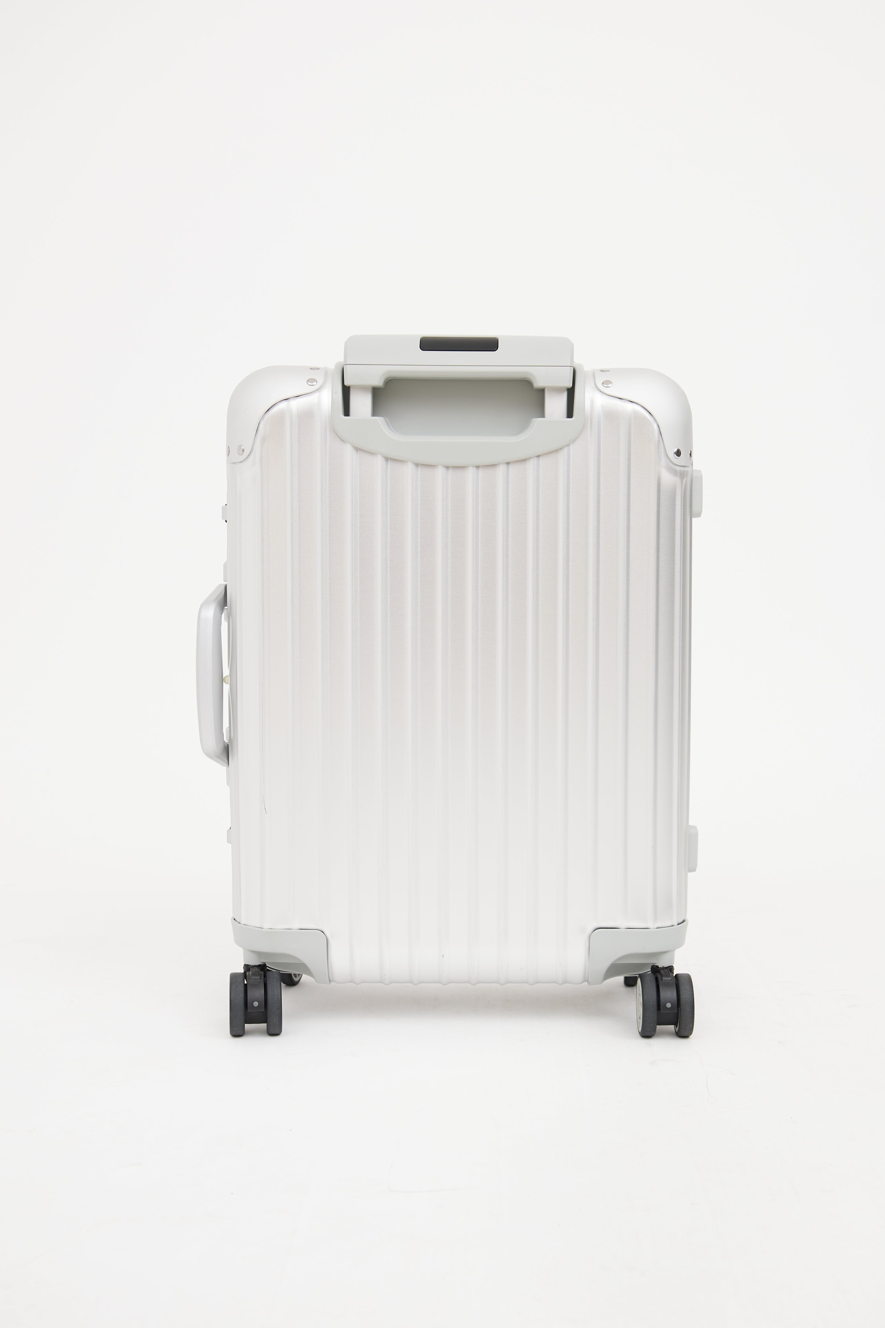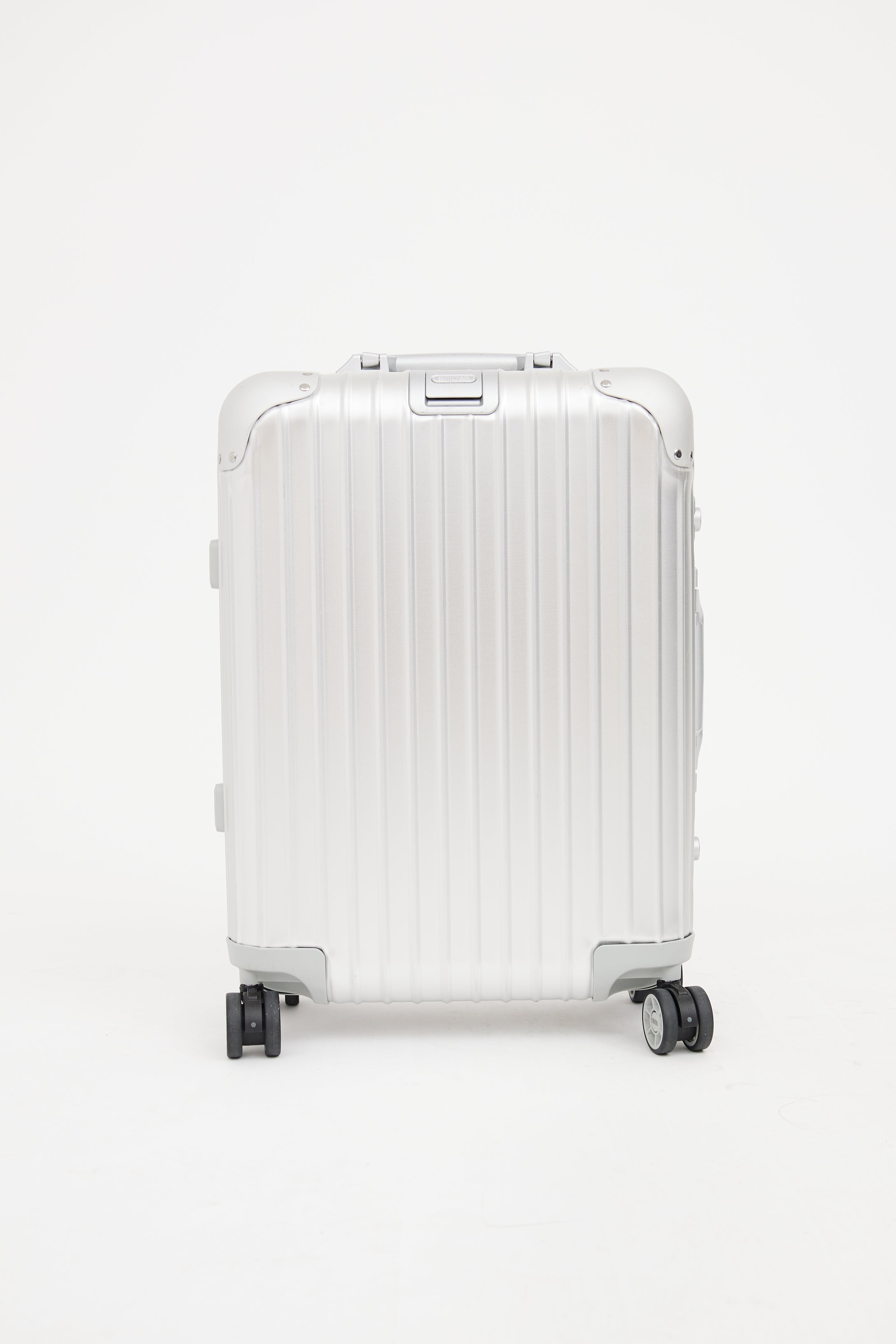 Pre-owned Rimowa Topas aluminum cabin suitcase featuring anodized aluminum, signature grooves, stage-free telescopic handle, RIMOWA multiwheel® system and TSA-approved locks. Interior features one main compartment and two height adjustable flex dividers.