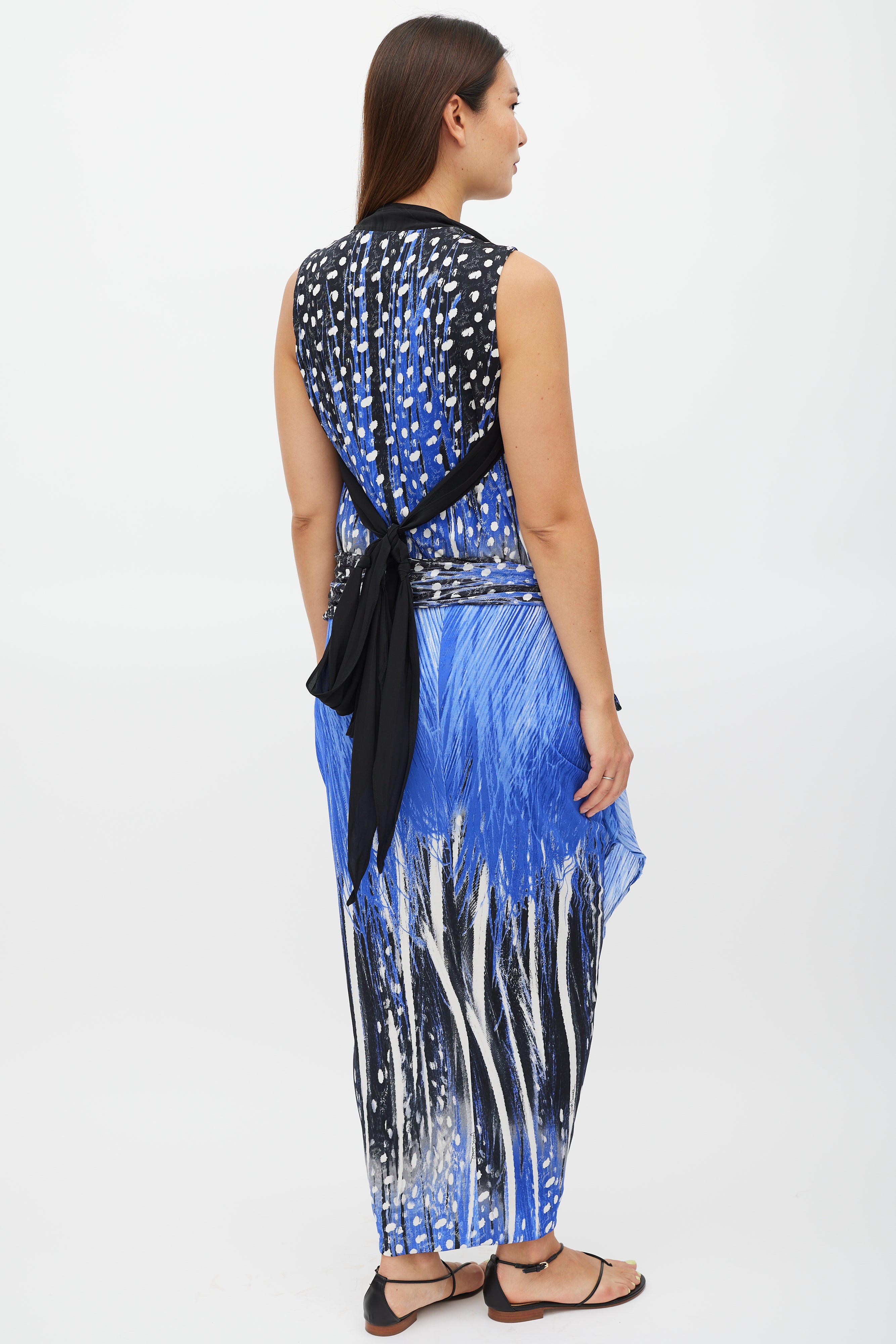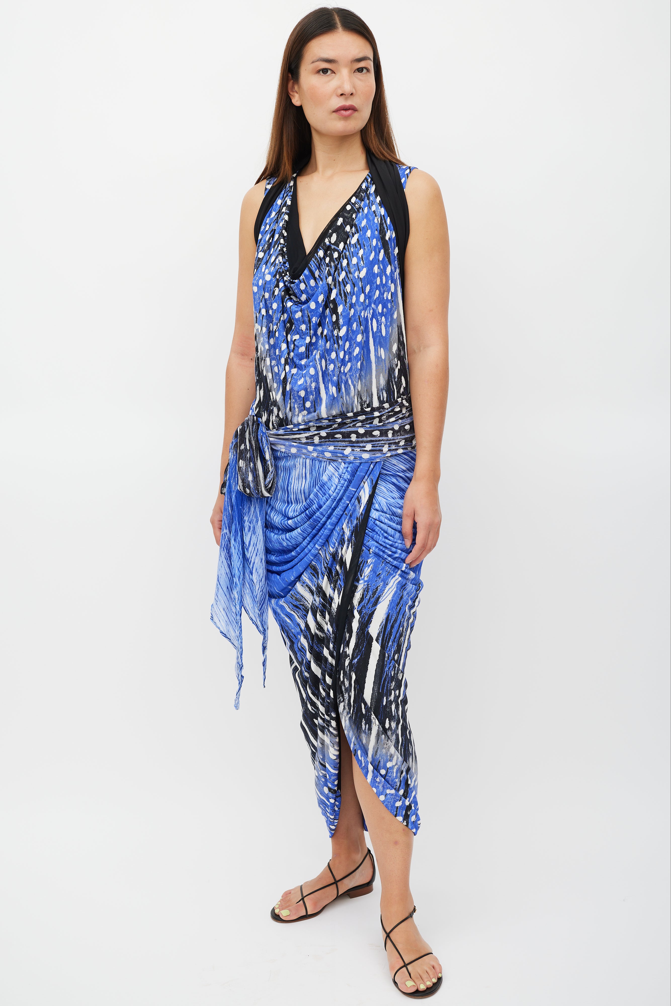 Pre-owned Roberto Cavalli blue dress featuring a black polka dot pattern throughout, V-neckline with elongated scarf detail, sleeveless styling, elasticized waist with tonal scarf belt, gathered detailing at front, and slit at hem. Lined.