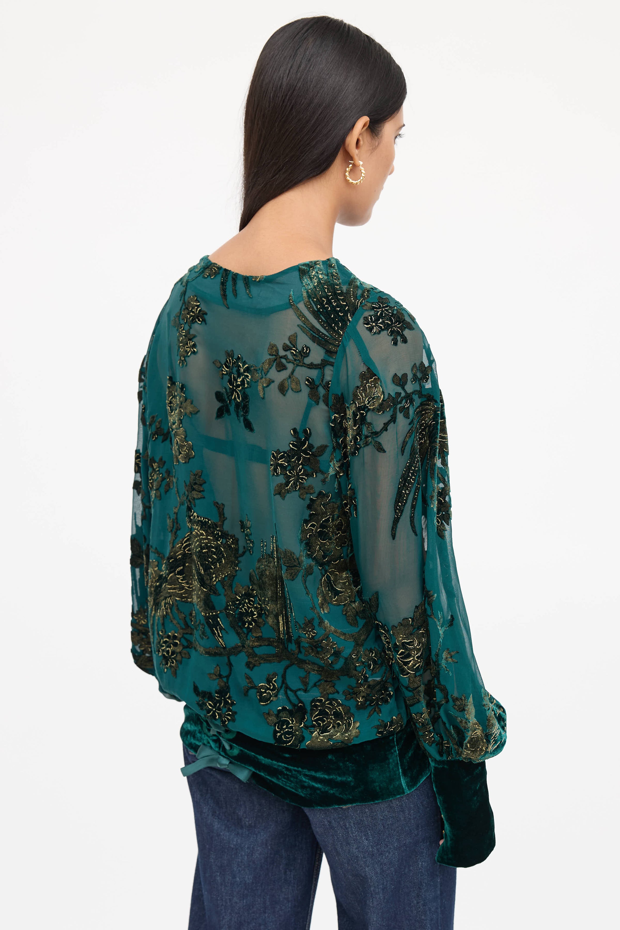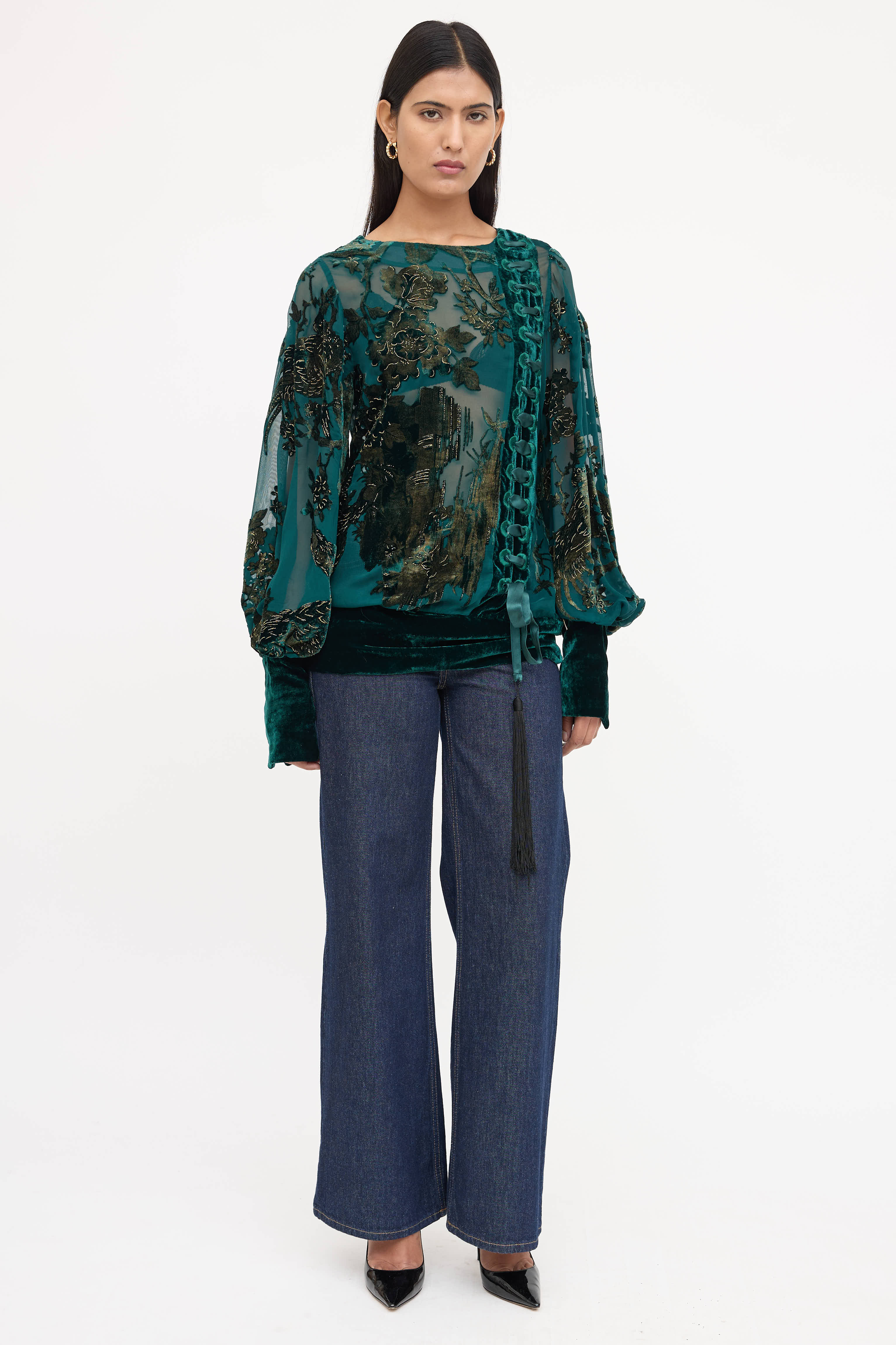 Pre-owned Roberto Cavalli green long sleeve sheer top featuring round neckline, floral velvet applique throughout, velvet cuffs and waistband, tie detail at front with tassel, concealed zip at side, and gold tone buttoned cuffs.