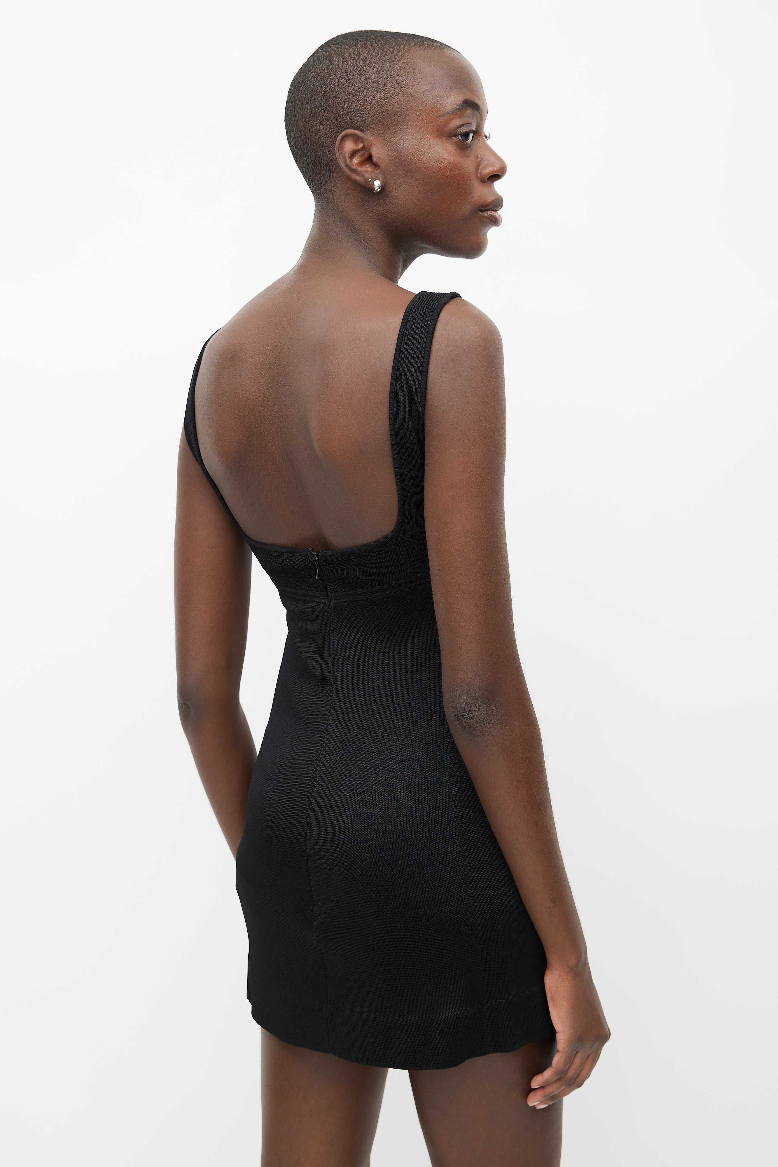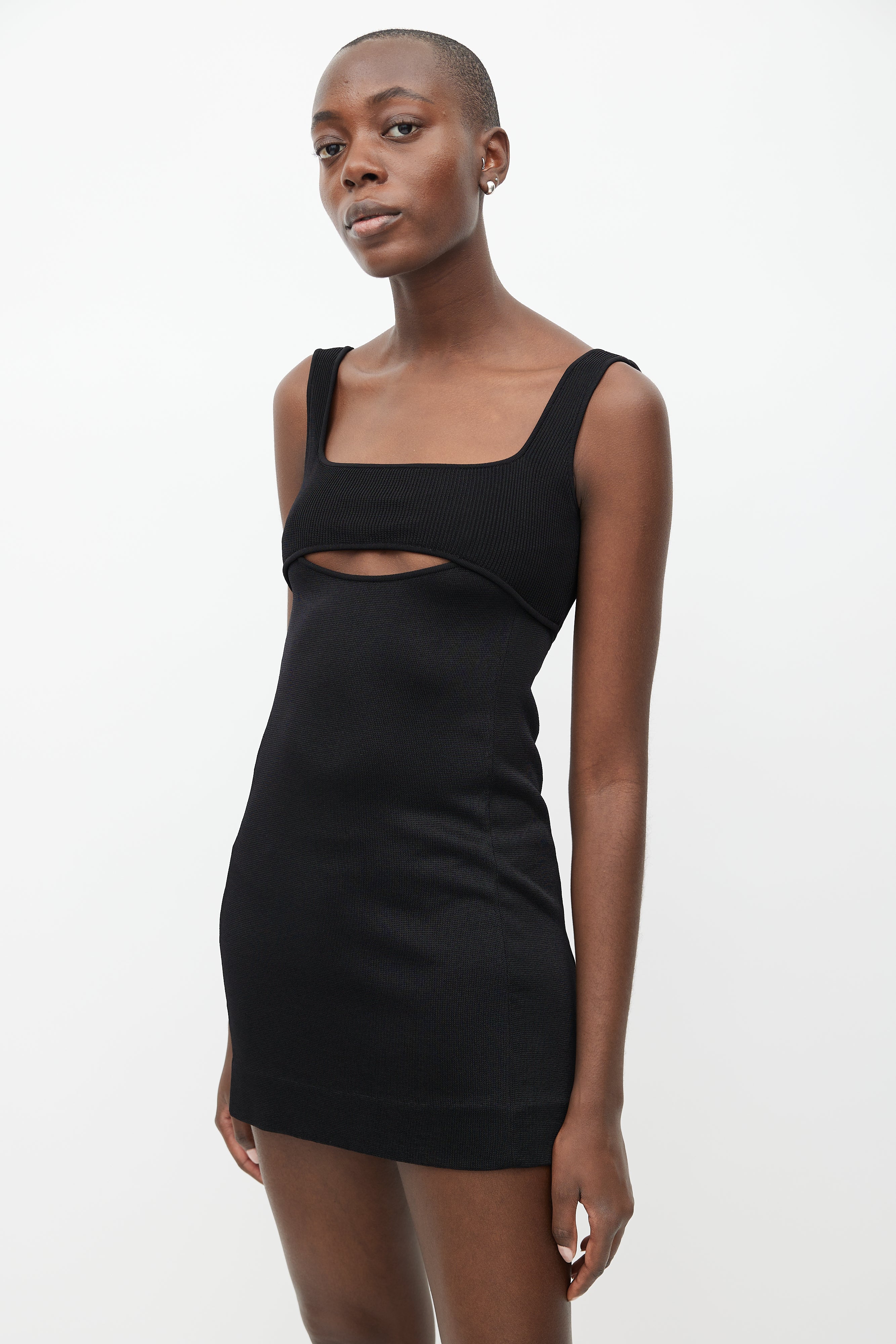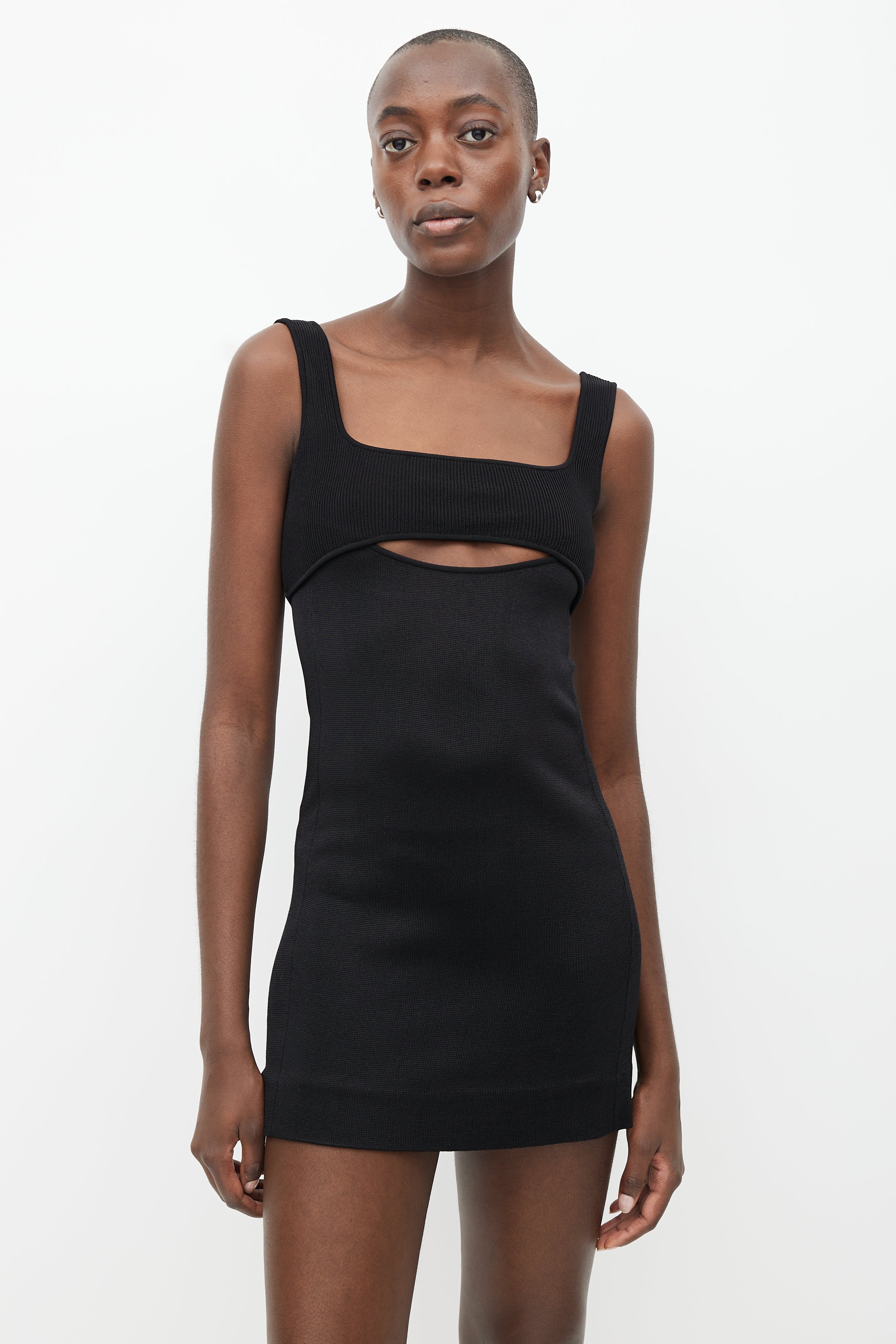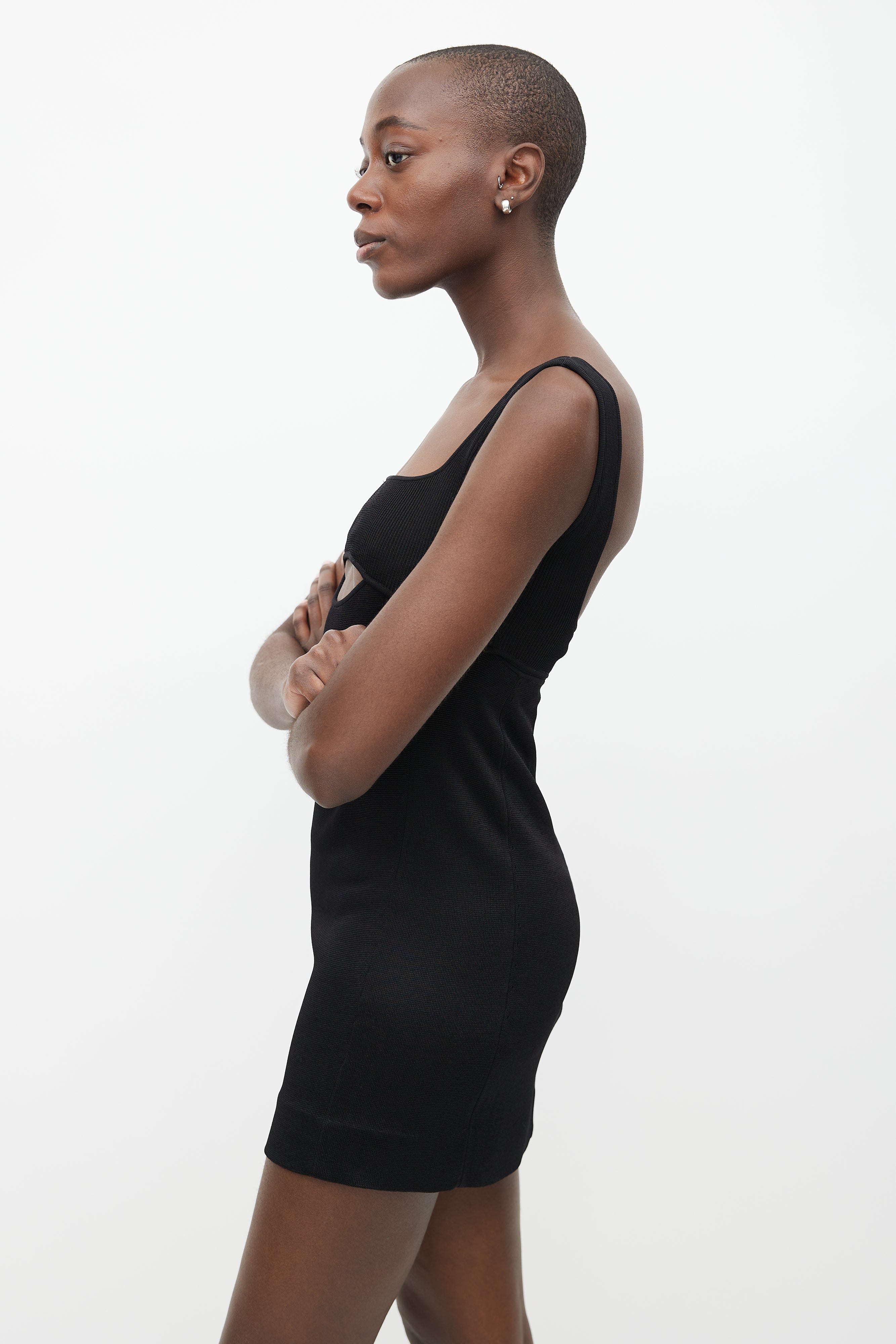 Pre-owned Saint Laurent black dress featuring ribbed knit bustier, flat shoulder straps, cut out at centre, and concealed zip closure at back.