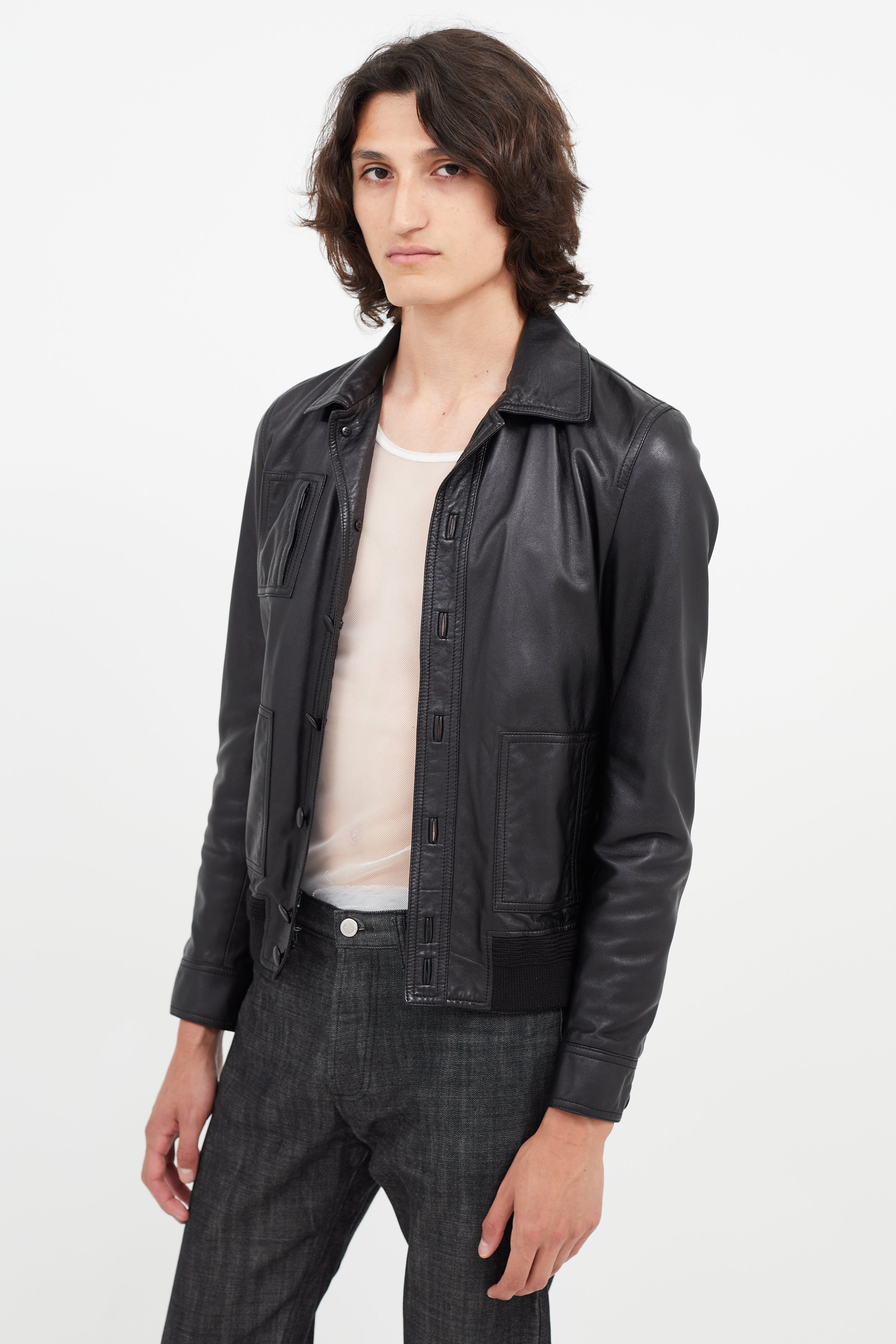 Pre-owned Saint Laurent black leather jacket featuring classic collar, button up front, knitted hem, one zip pocket at chest, two buttoned pockets at hips, and buttoned cuffs. Lined.