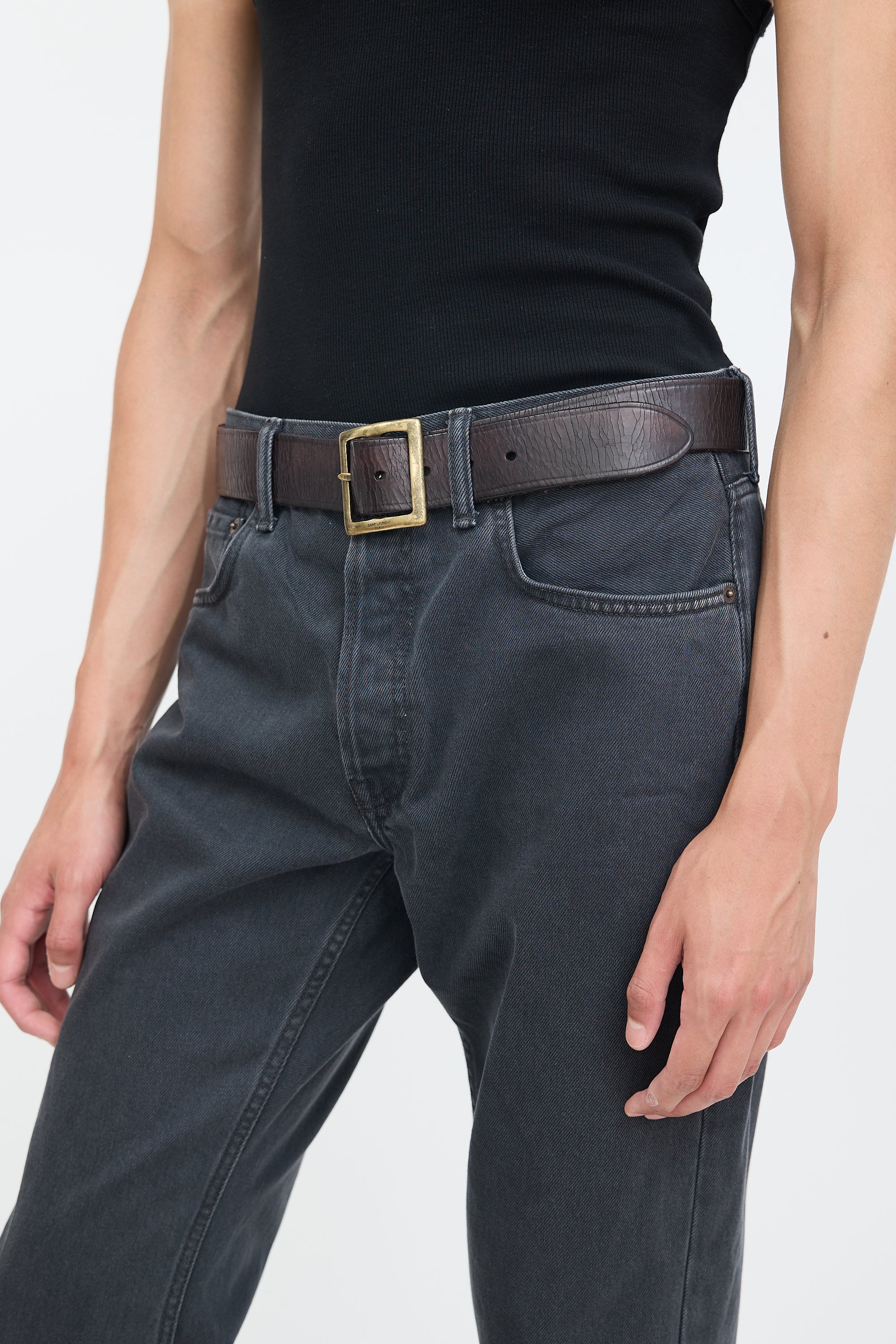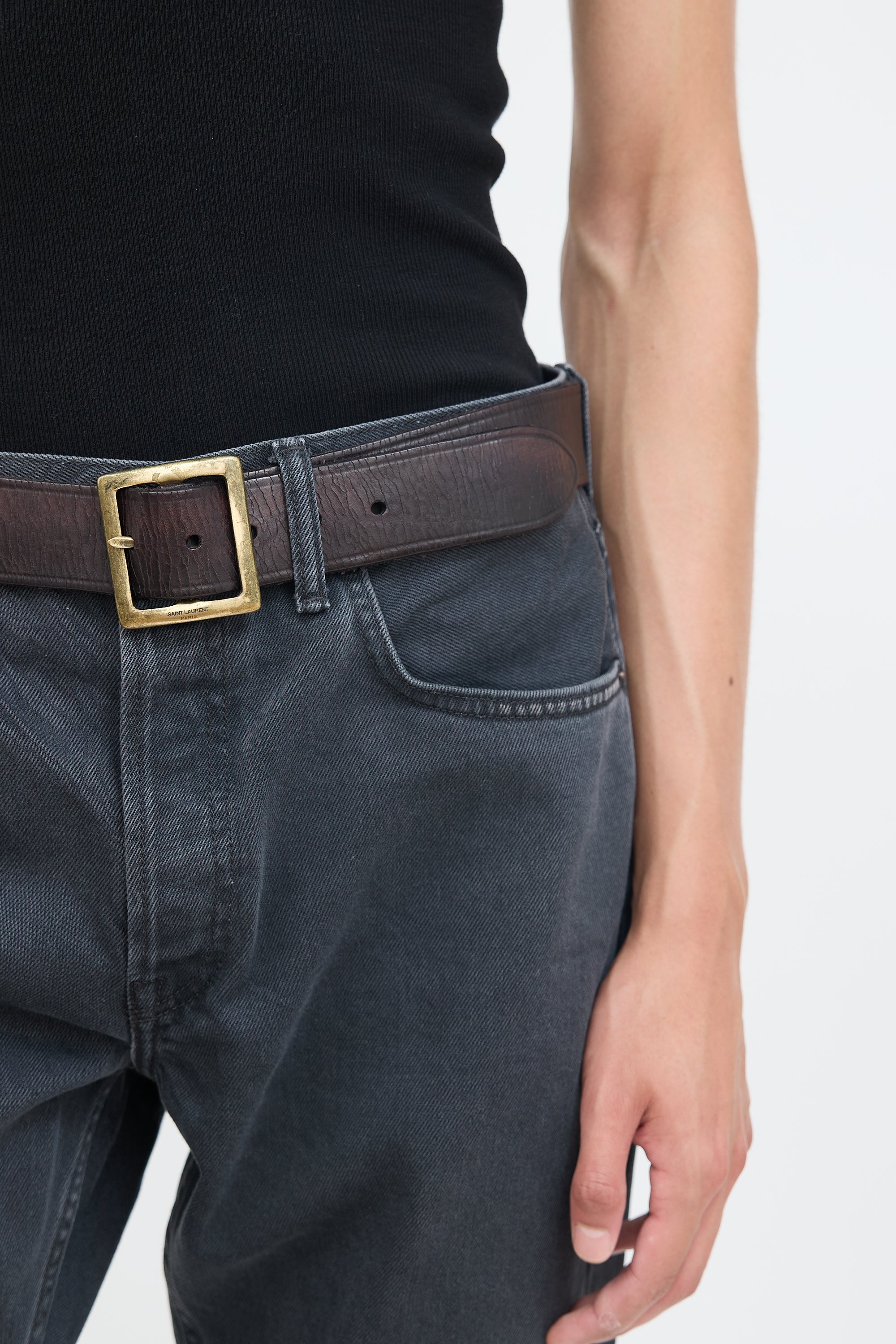 Pre-owned Saint Laurent dark brown leather Dylan belt featuring tonal stitching, intentional distressing throughout, large aged gold tone square buckle with engraved logo, and stamped logo at interior.