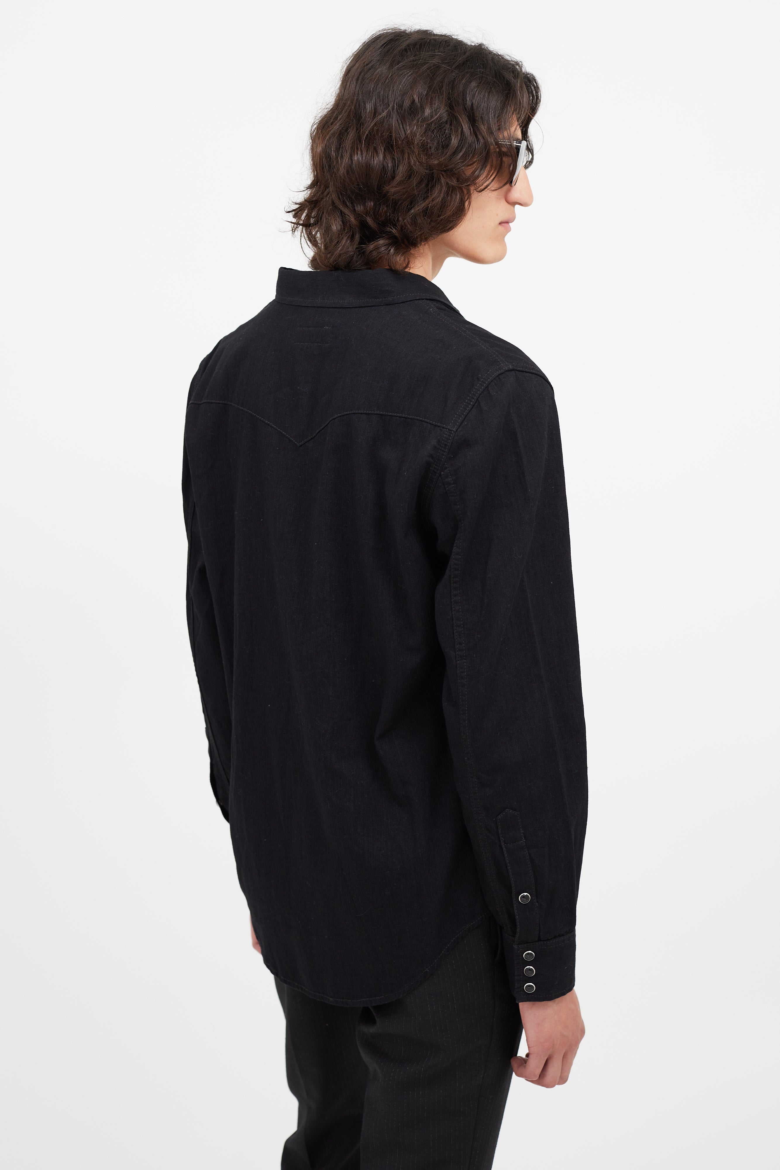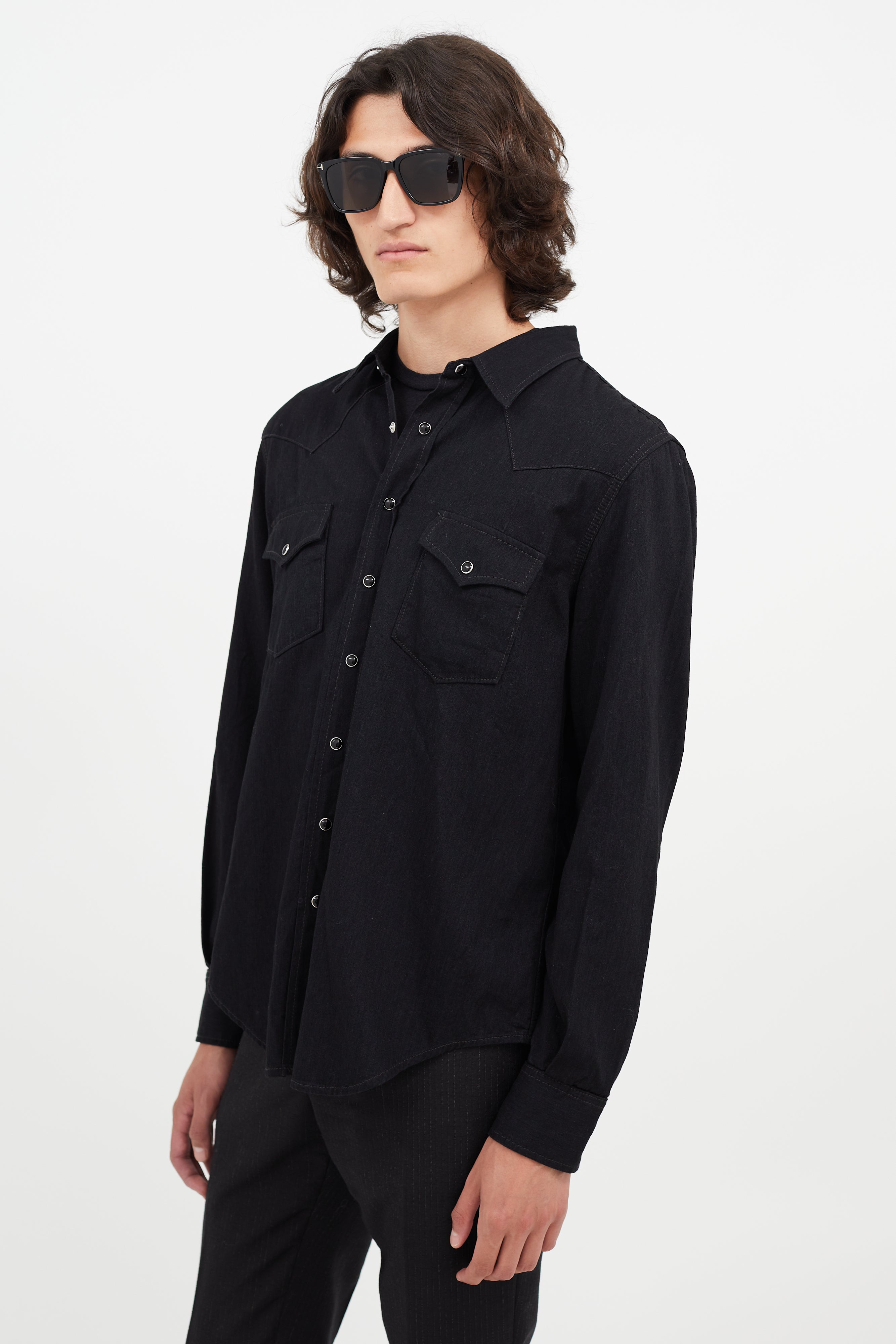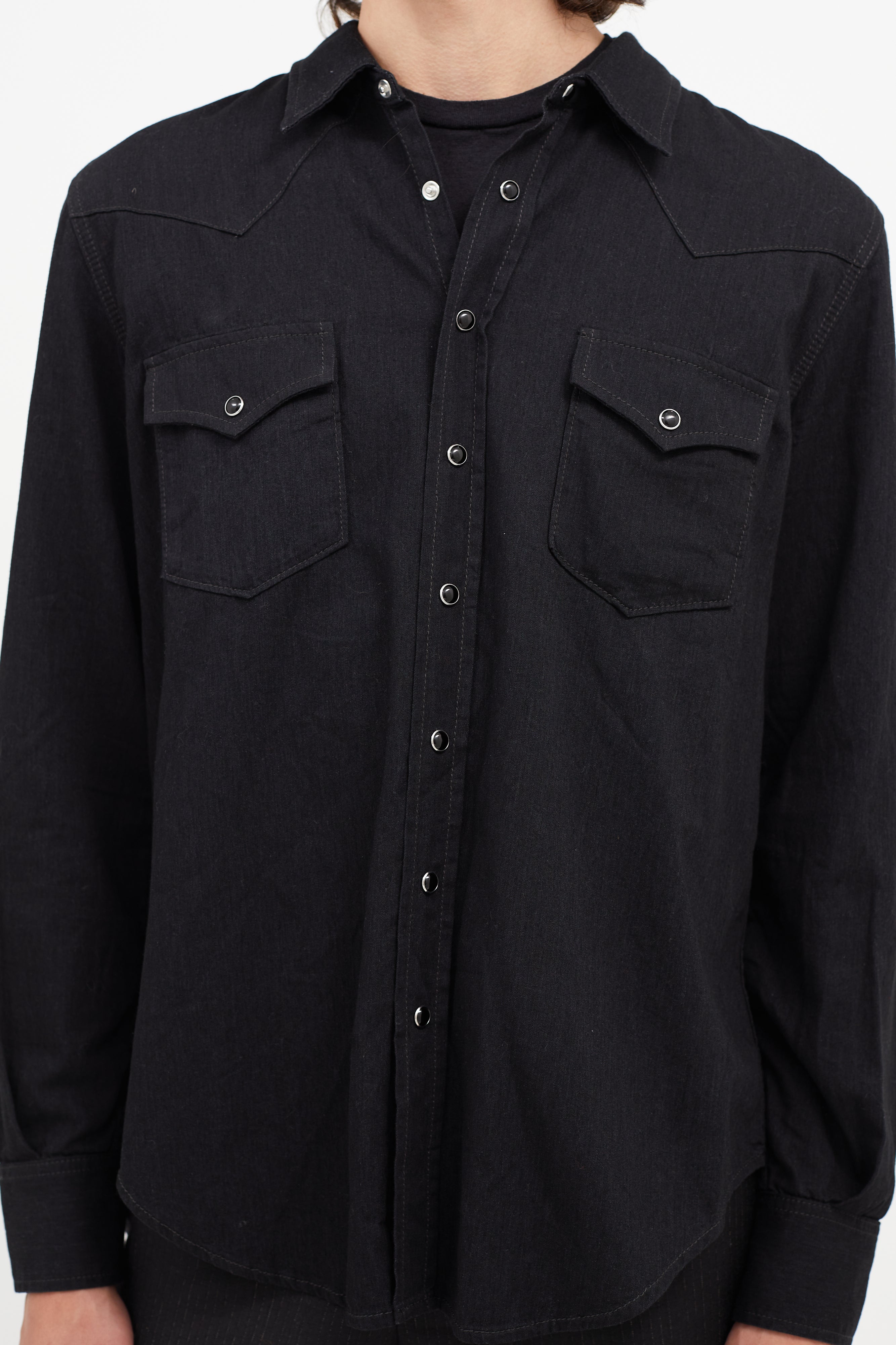 Pre-owned Saint Laurent black western jacket featuring classic collar, button down front, two buttoned pockets at chest, and silver tone hardware.