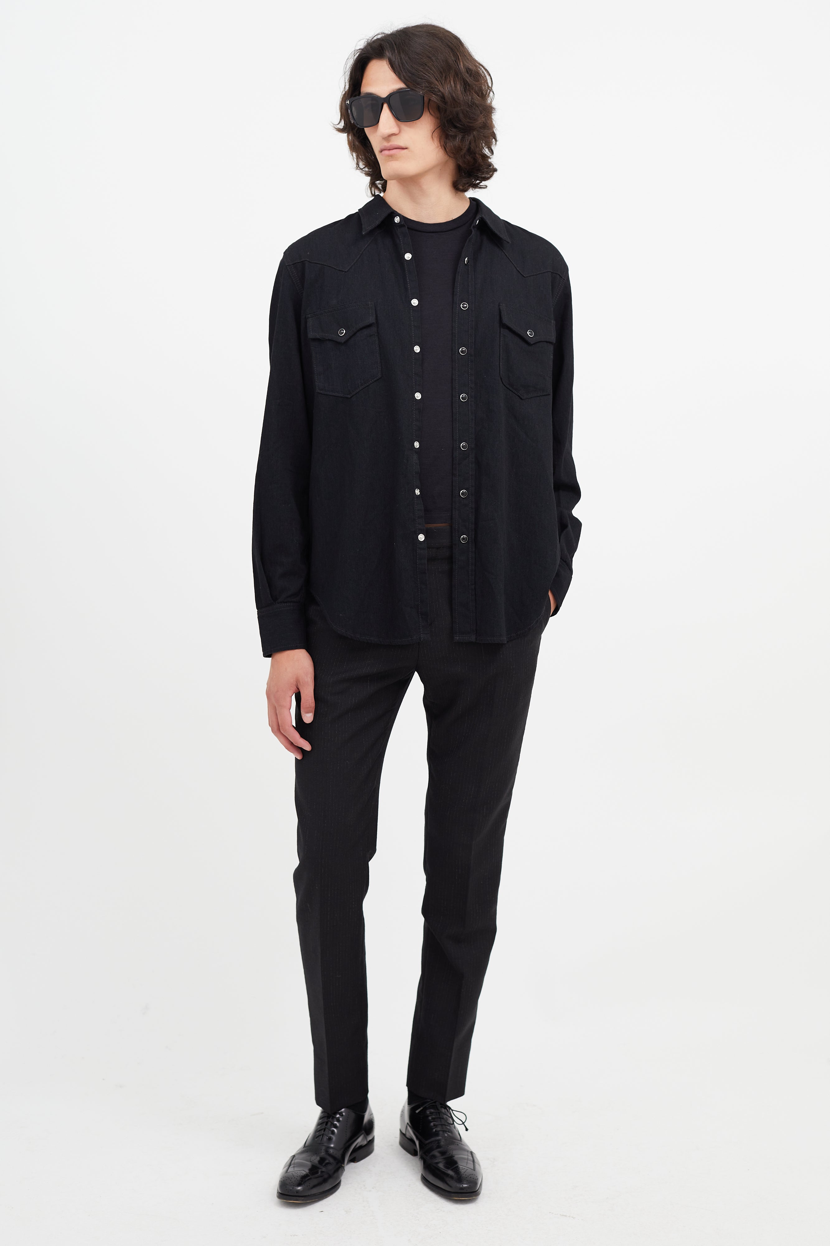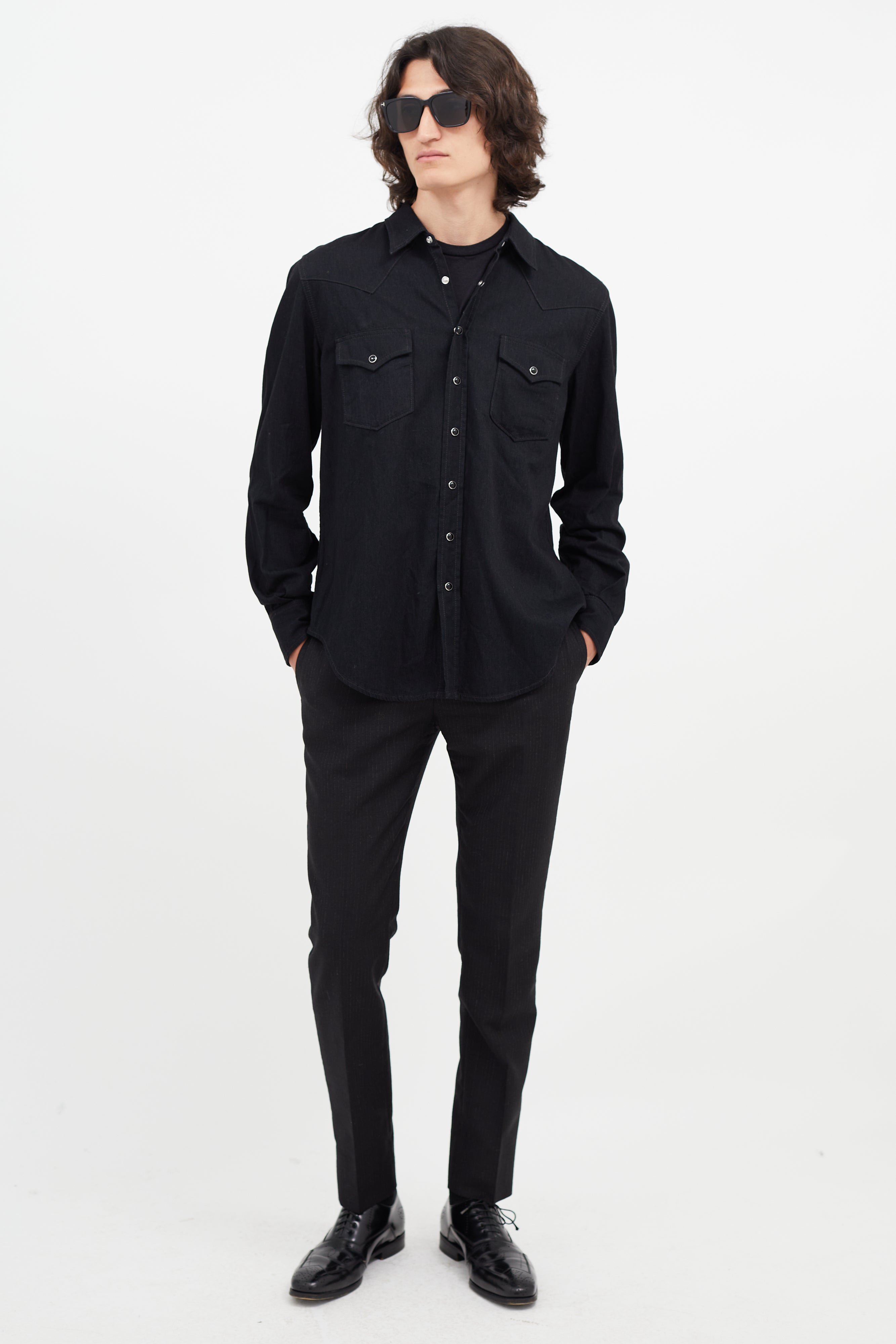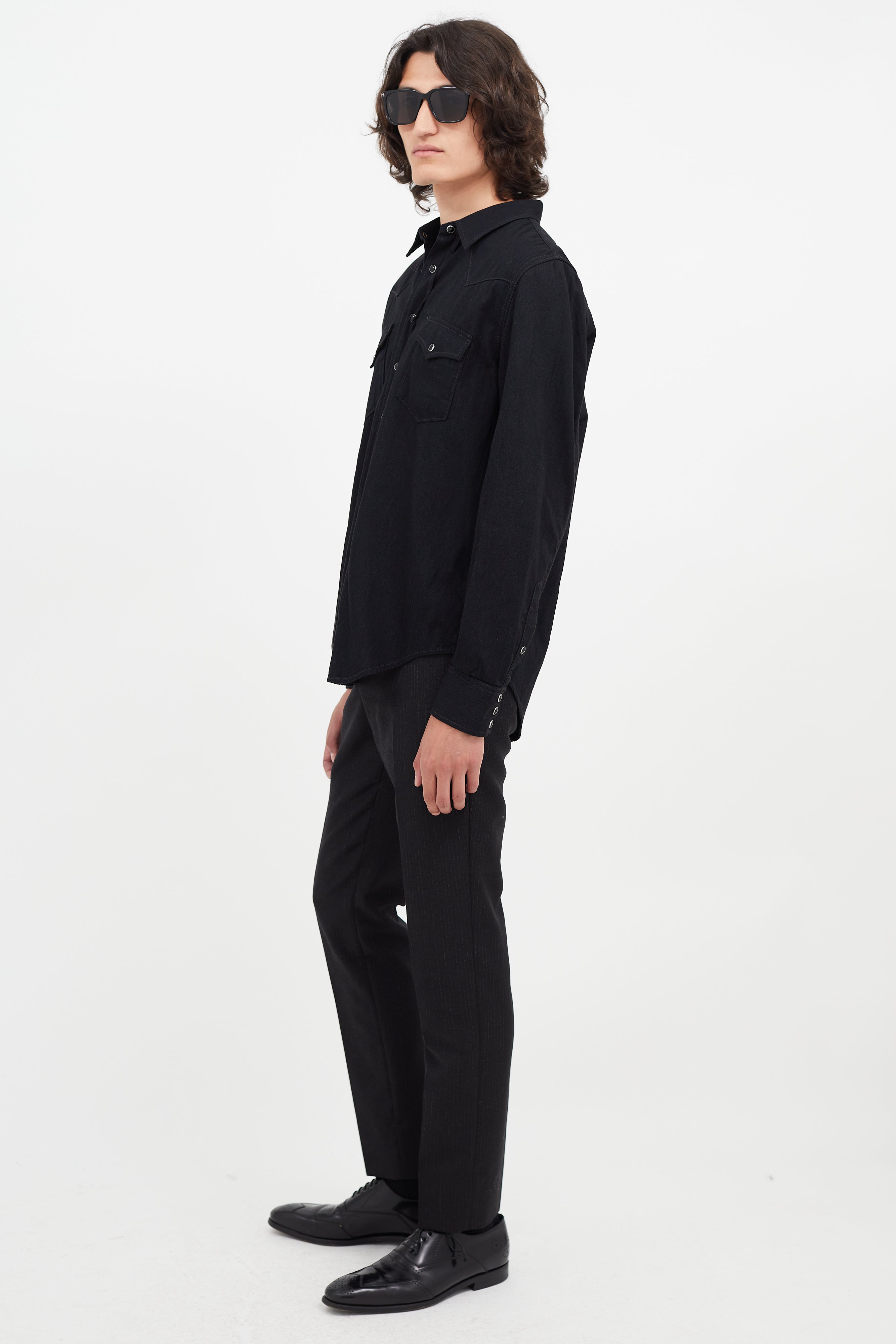 Pre-owned Saint Laurent black western jacket featuring classic collar, button down front, two buttoned pockets at chest, and silver tone hardware.
