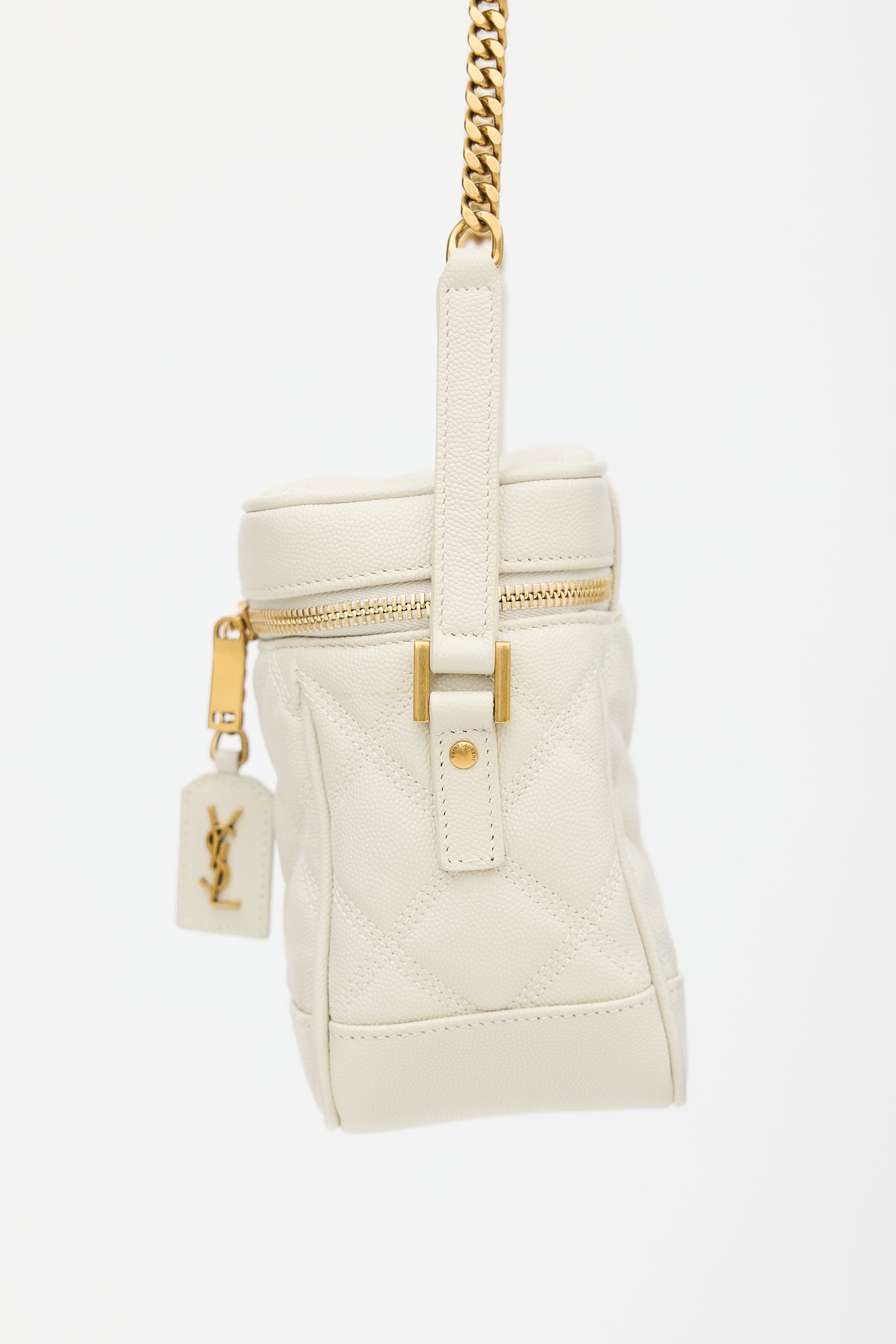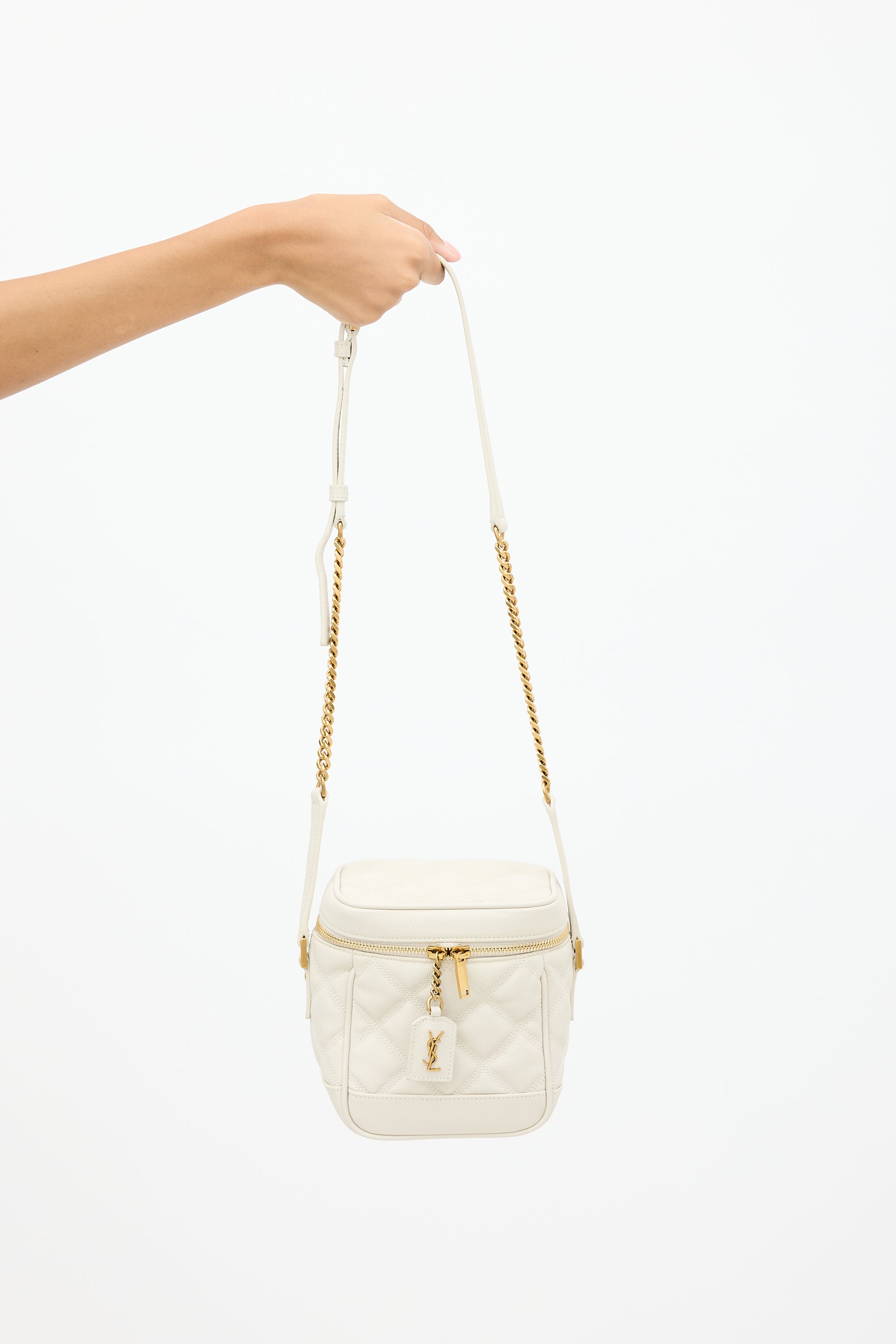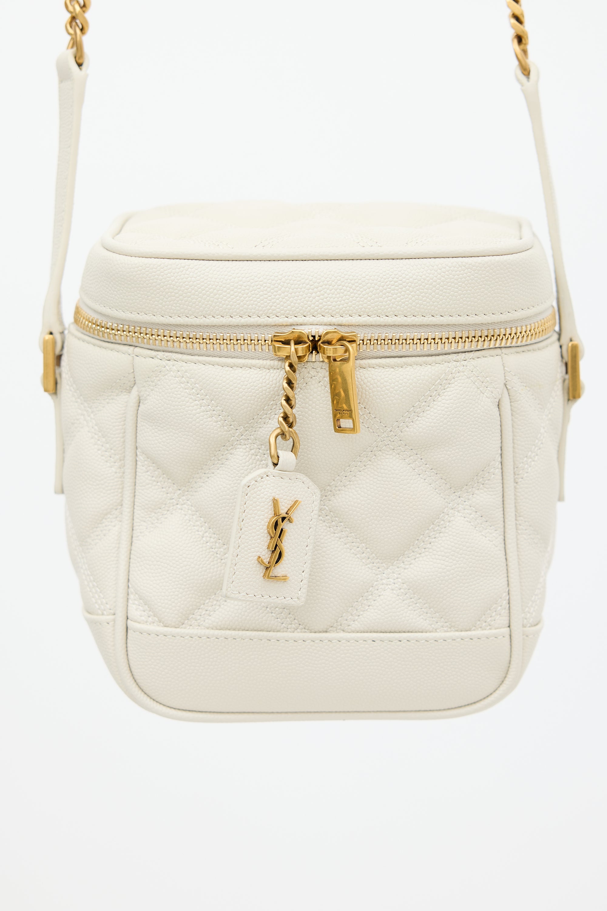 Pre-owned Saint Laurent cream leather 80s Vanity Crossbody bag featuring quilting throughout, gold tone hardware, adjustable leather and chain shoulder strap, dual zip around closure, logo hardware embellished luggage tag pull tab at one zipper, and one lined main compartment with single slip pocket. Comes with original dust bag.
