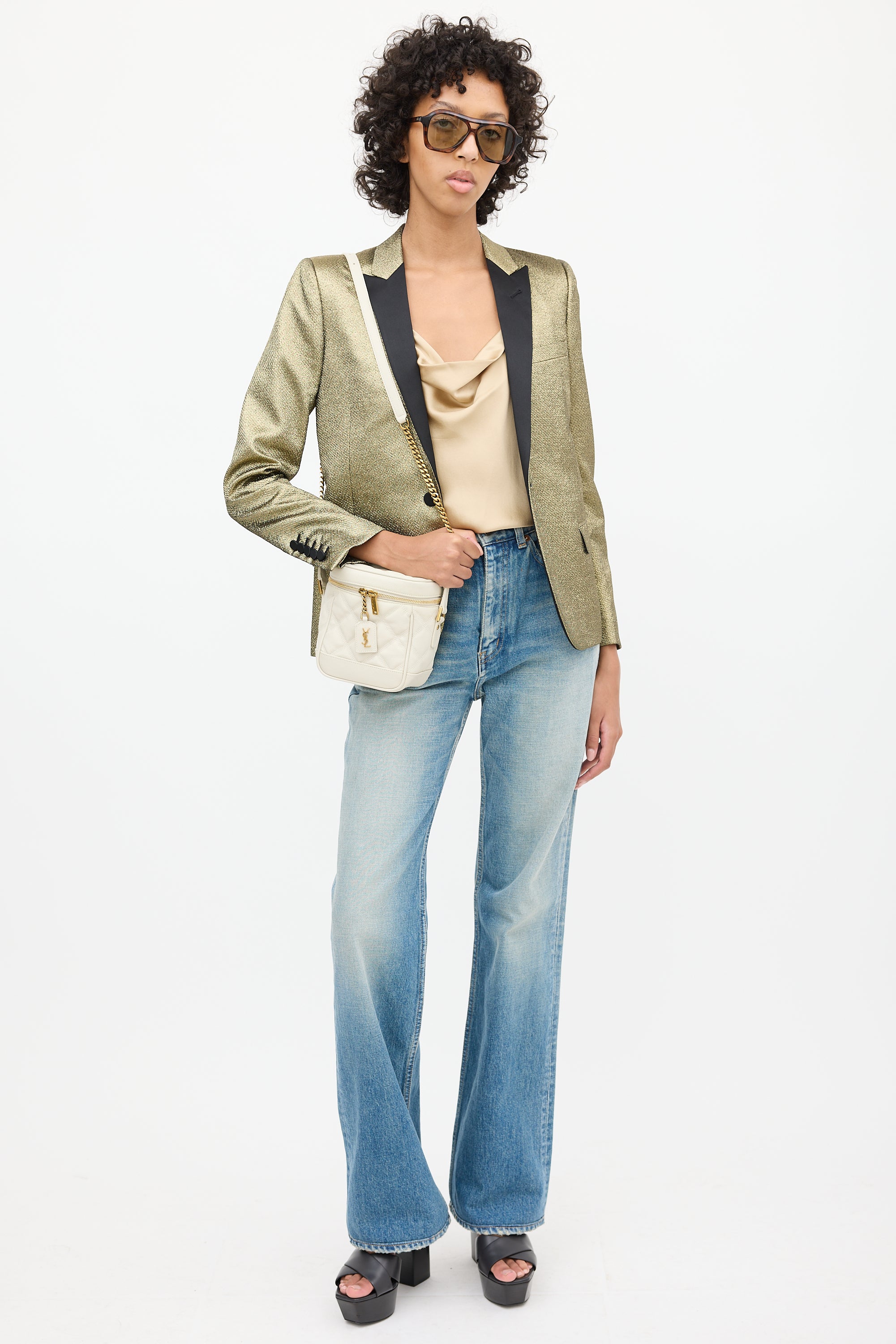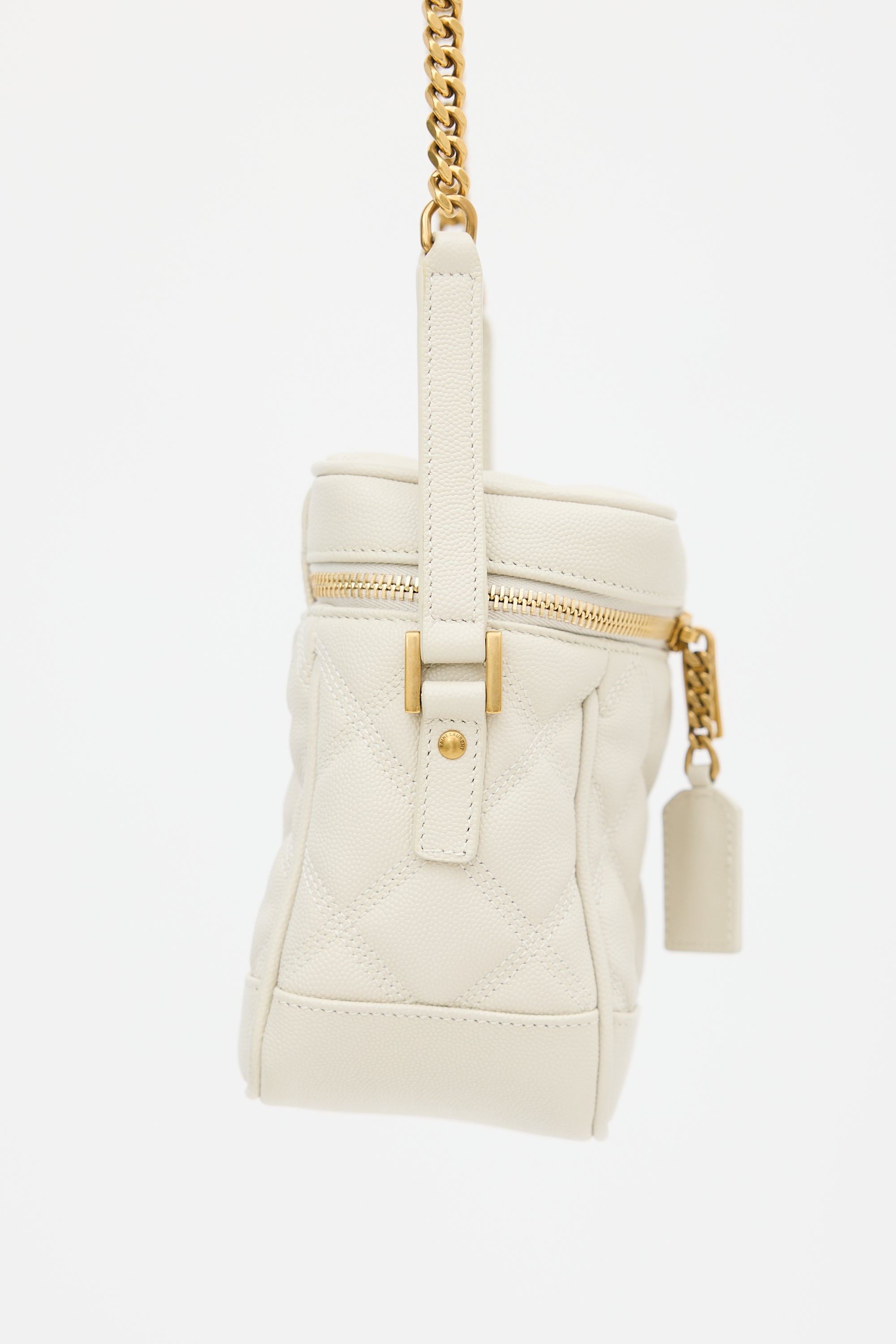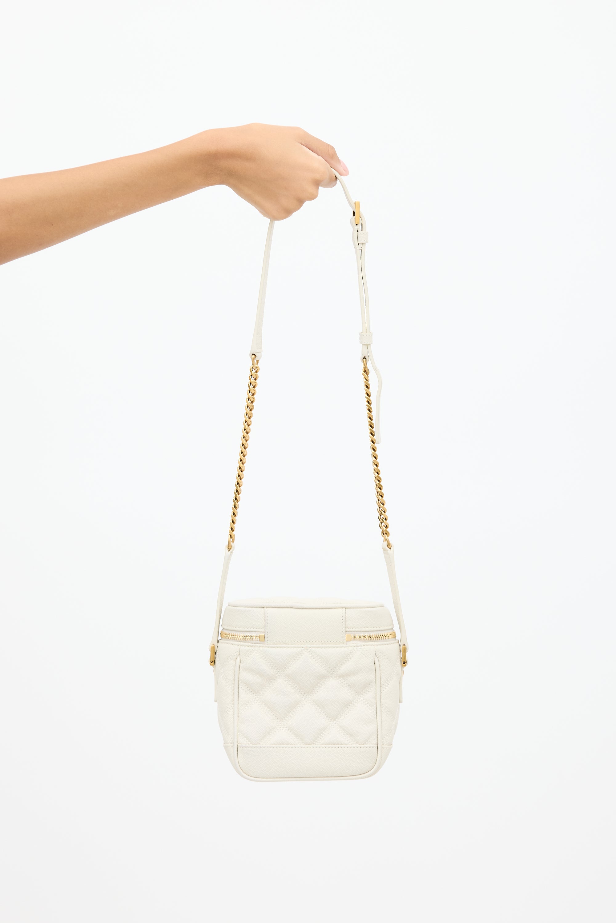 Pre-owned Saint Laurent cream leather 80s Vanity Crossbody bag featuring quilting throughout, gold tone hardware, adjustable leather and chain shoulder strap, dual zip around closure, logo hardware embellished luggage tag pull tab at one zipper, and one lined main compartment with single slip pocket. Comes with original dust bag.