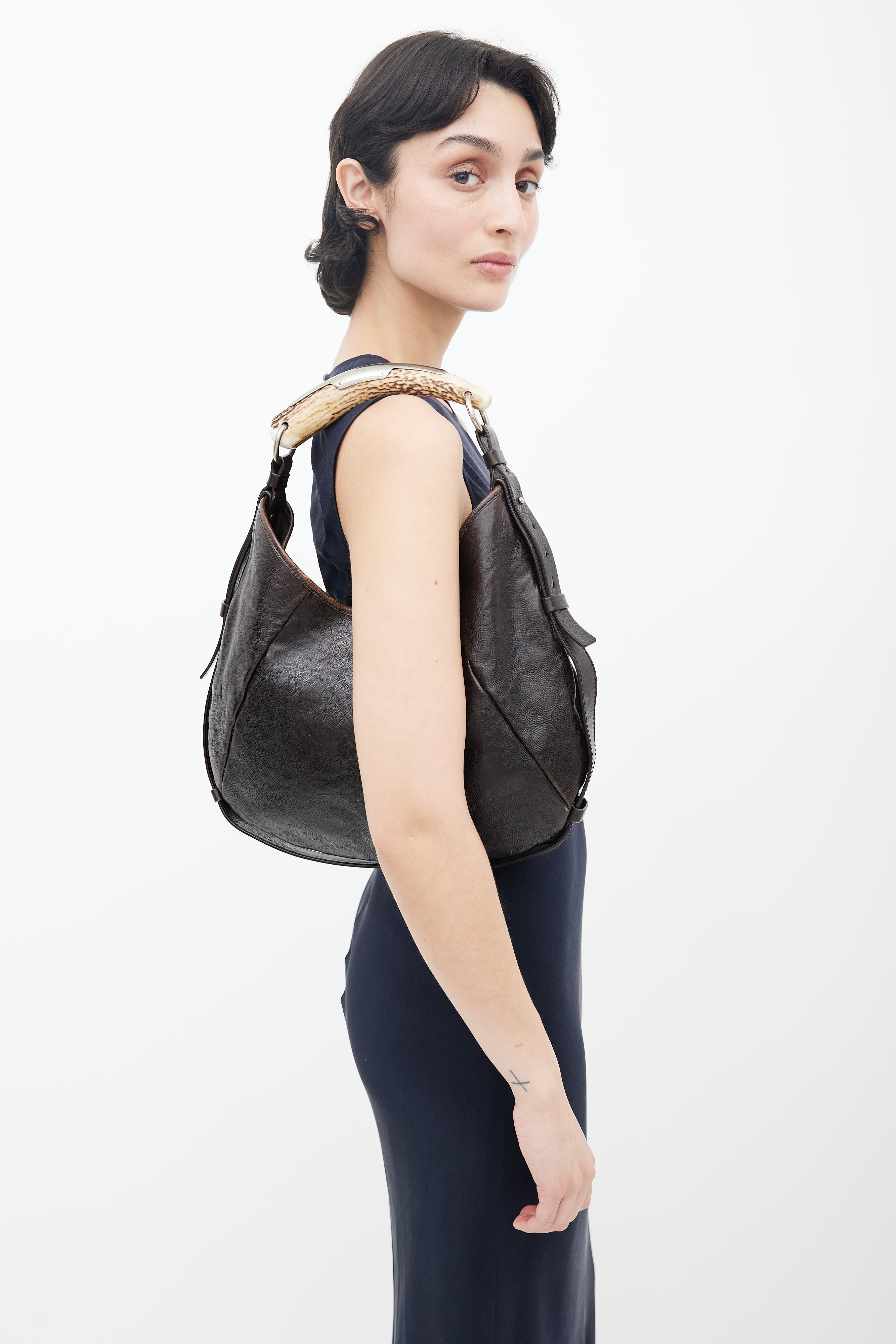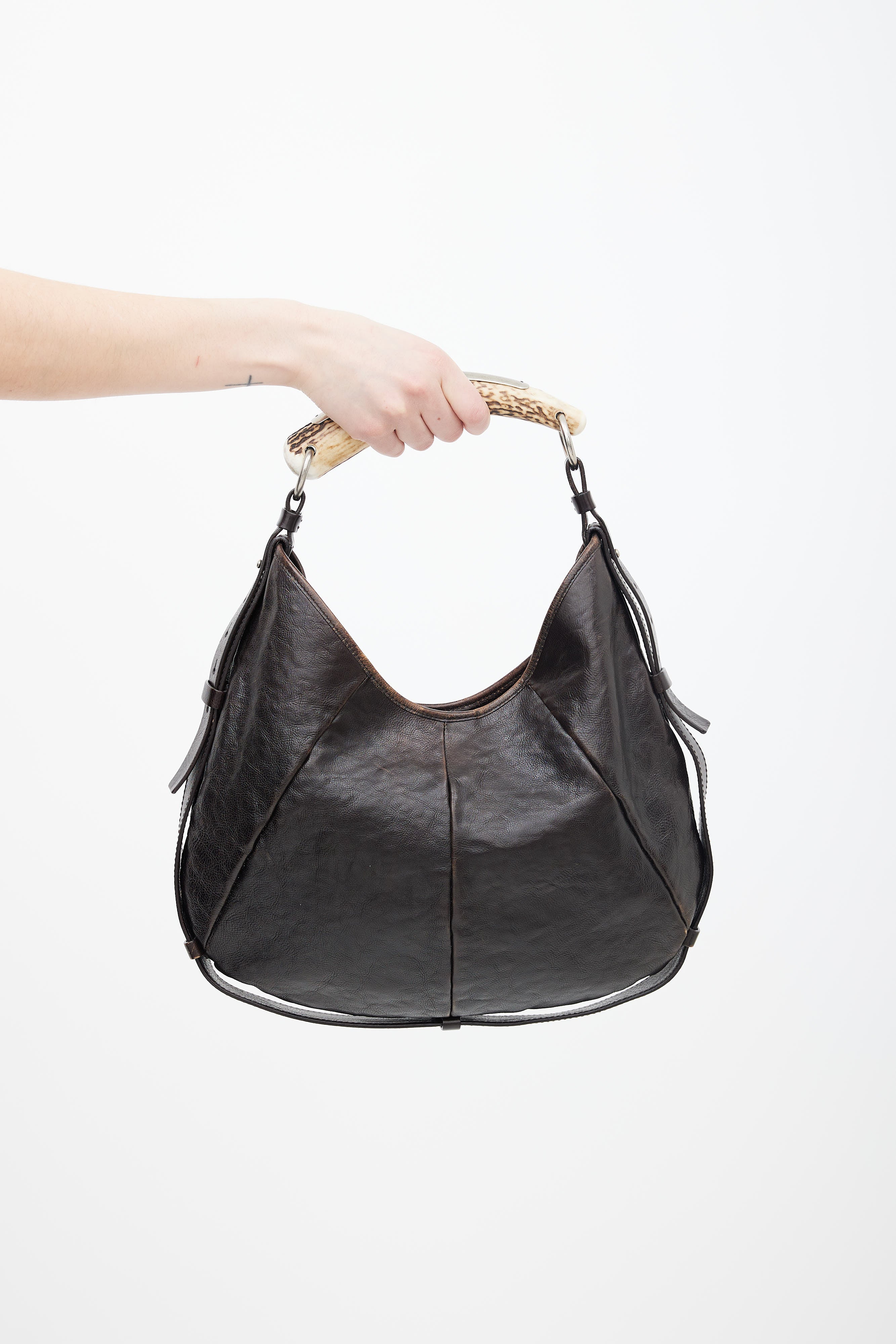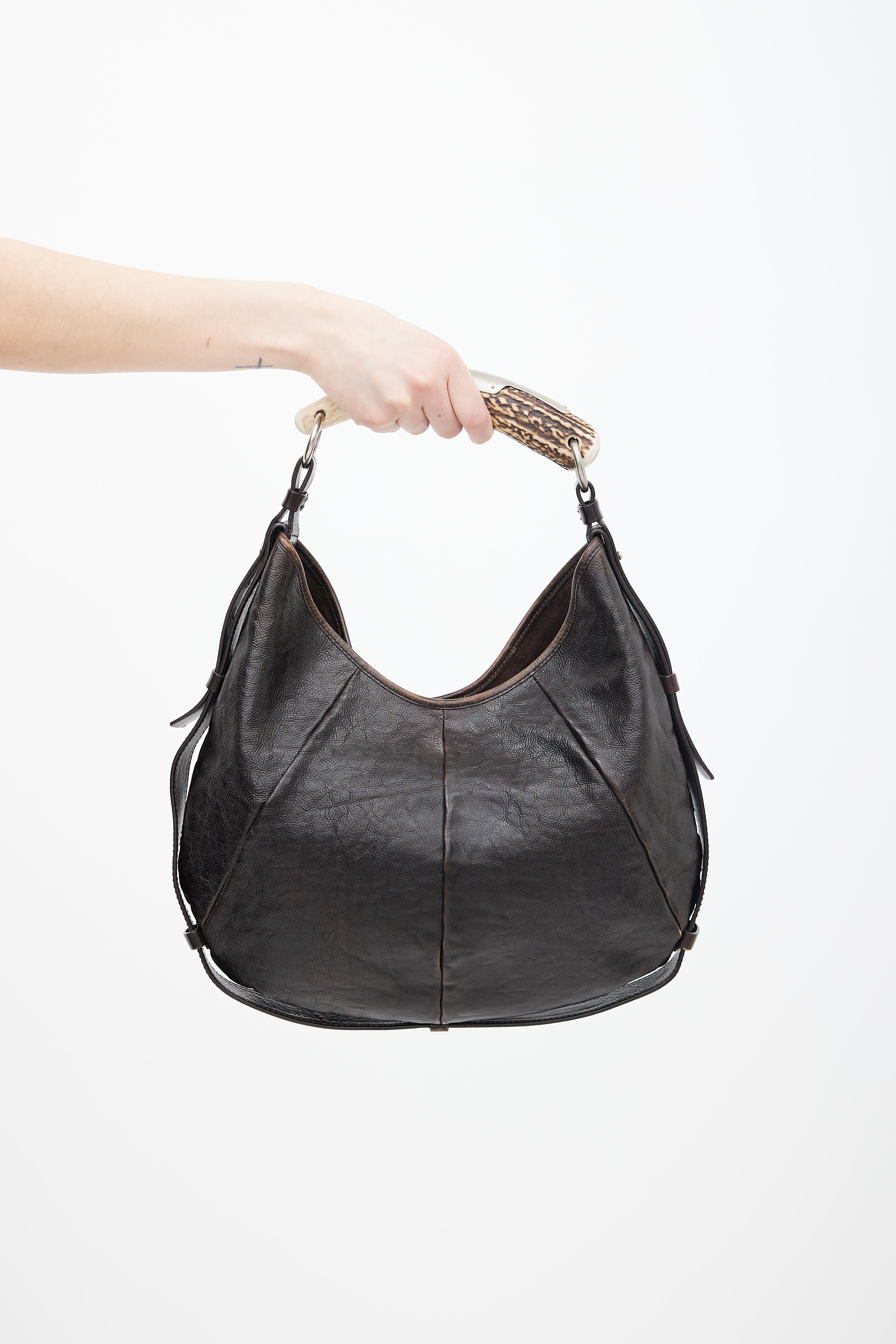 Pre-owned Saint Laurent Mombasa bag in dark brown featuring horn and silver-tone metal top handle, panel detail at face, magnetic closure with silver logo stamp, single compartment, interior zip pocket, and suede lining.