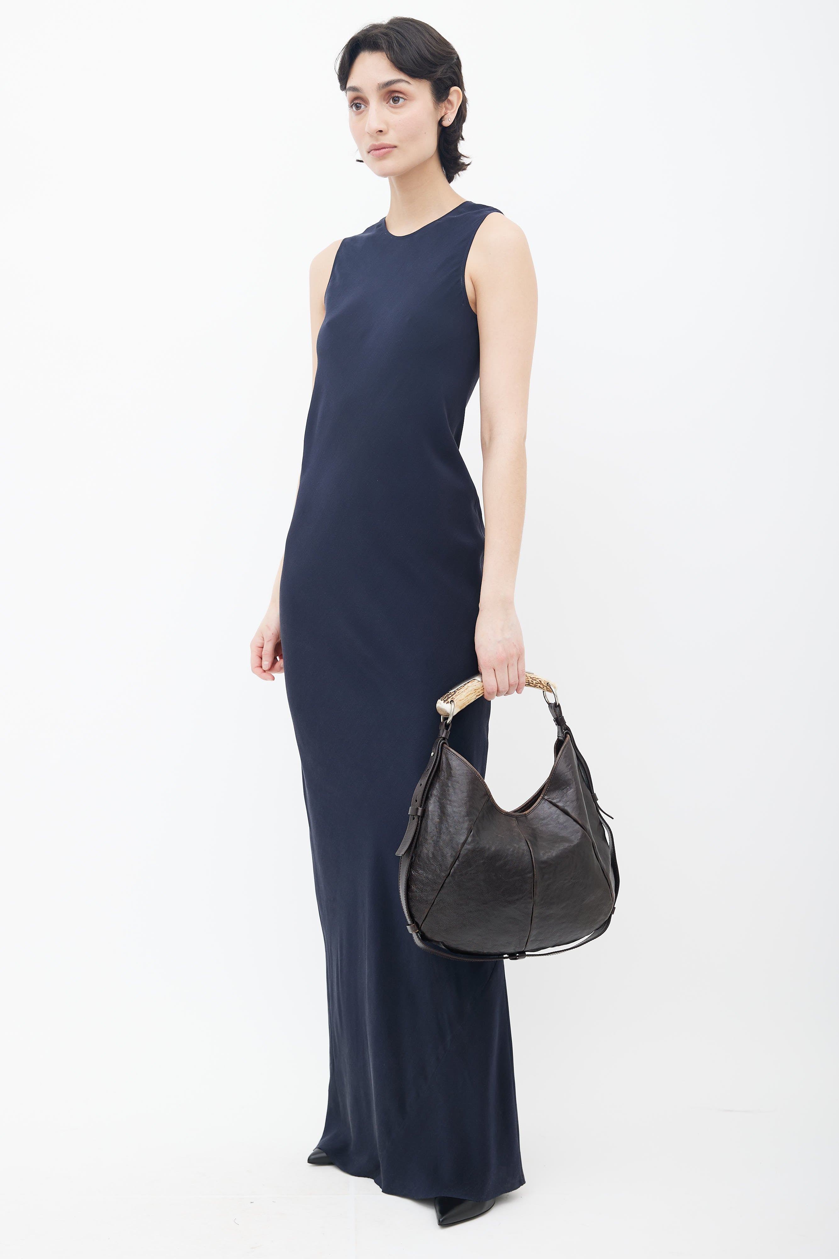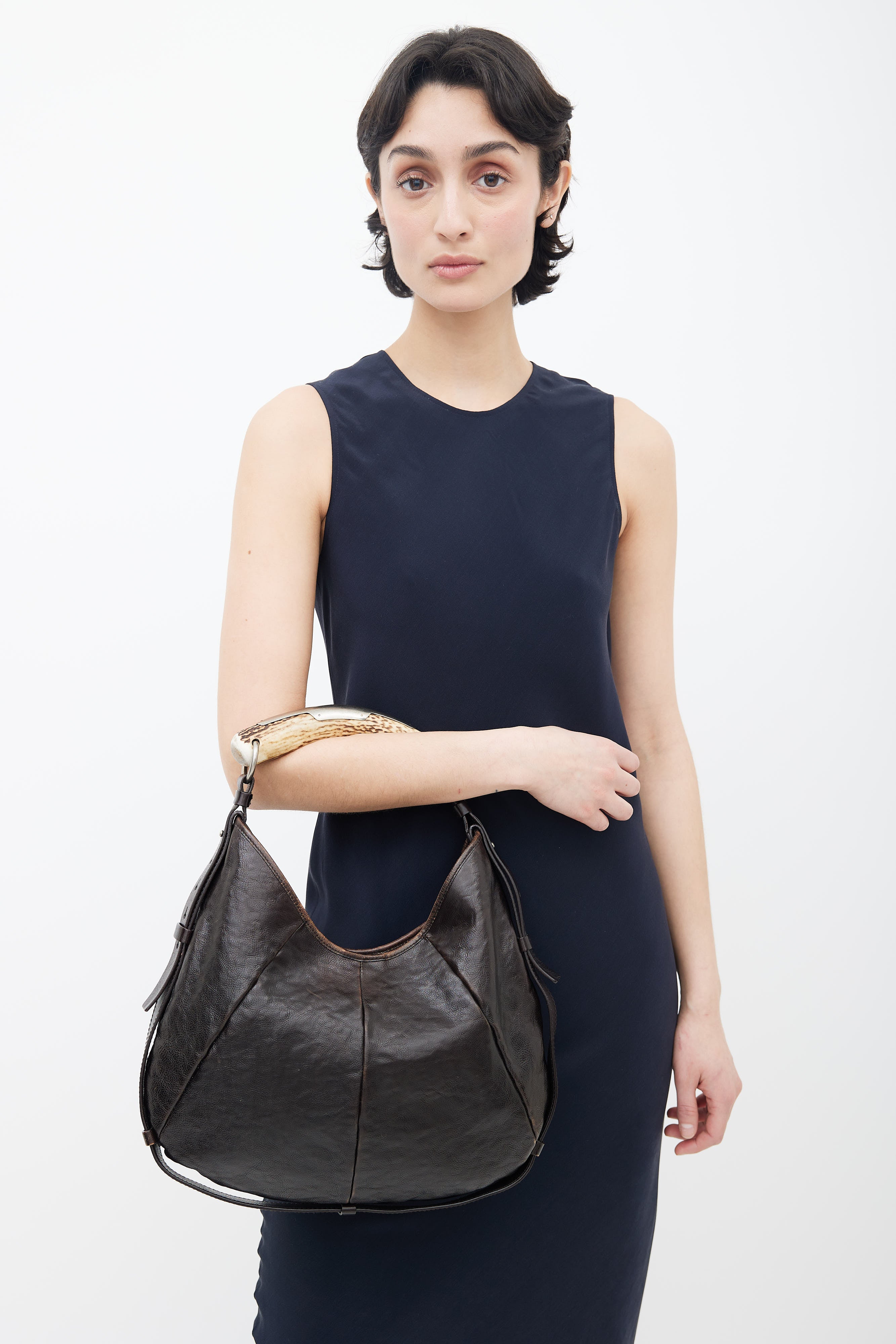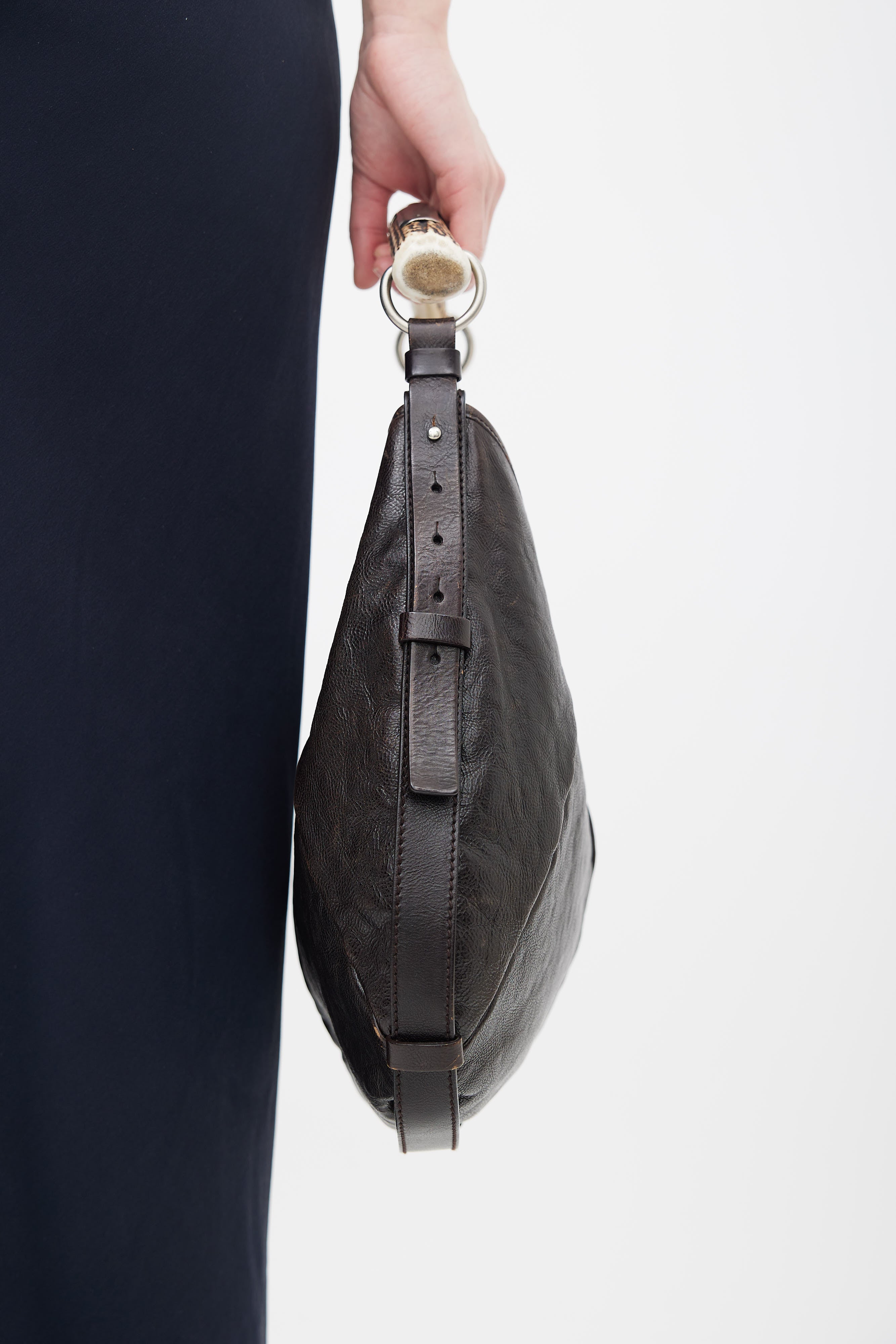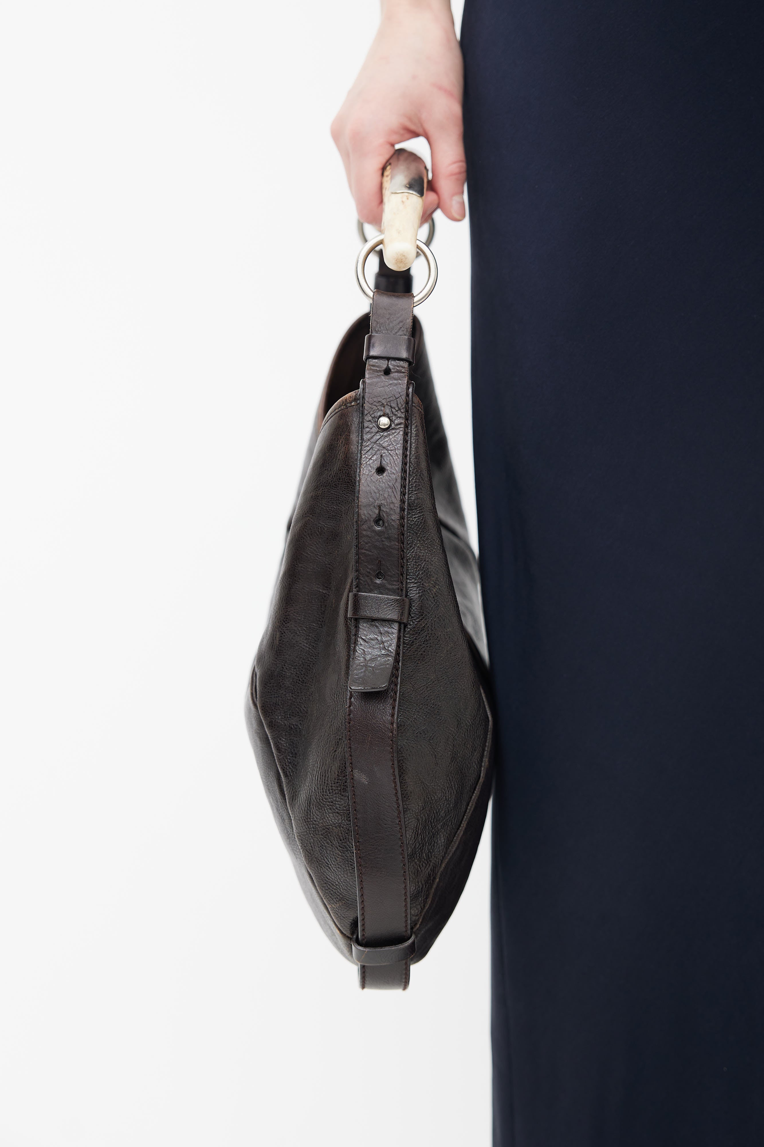 Pre-owned Saint Laurent Mombasa bag in dark brown featuring horn and silver-tone metal top handle, panel detail at face, magnetic closure with silver logo stamp, single compartment, interior zip pocket, and suede lining.