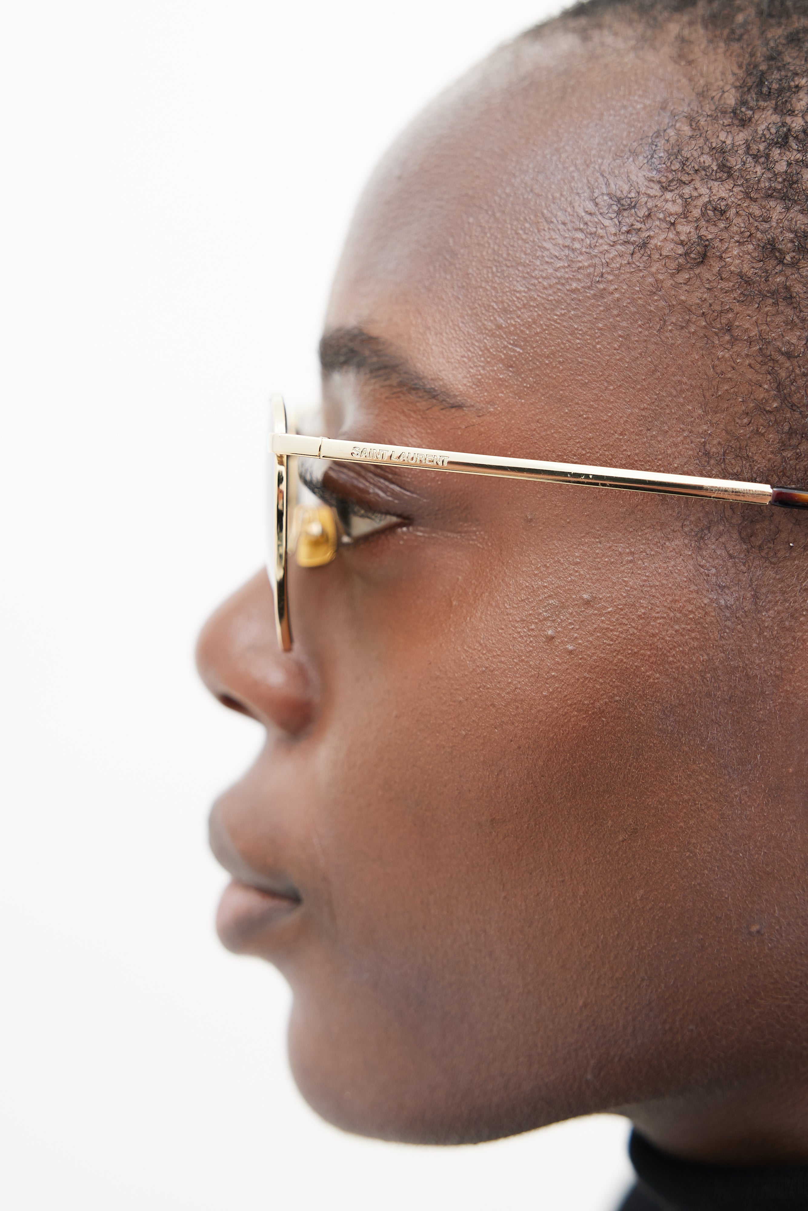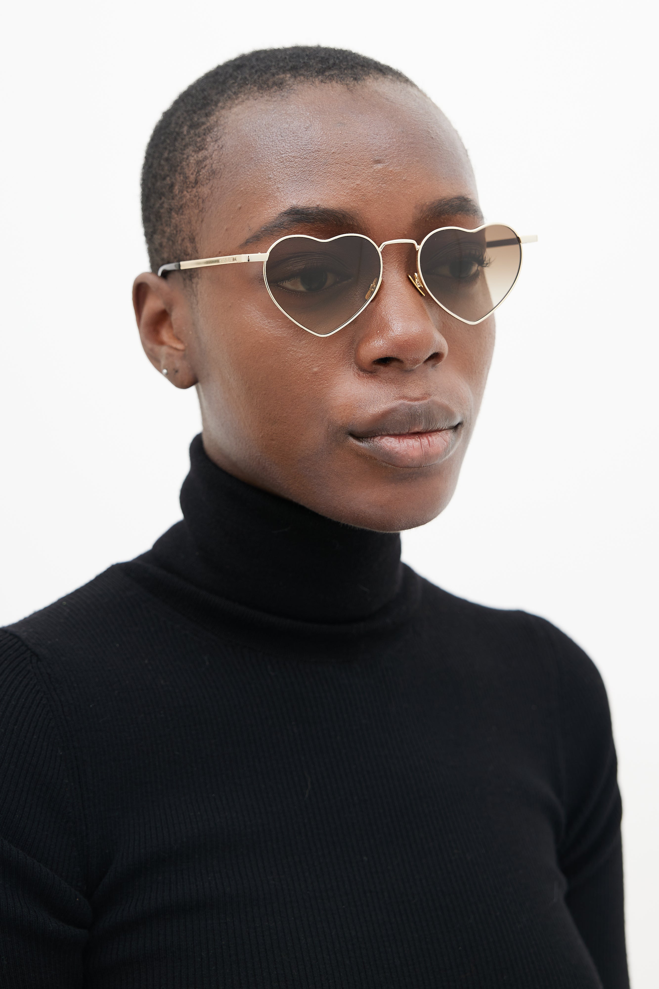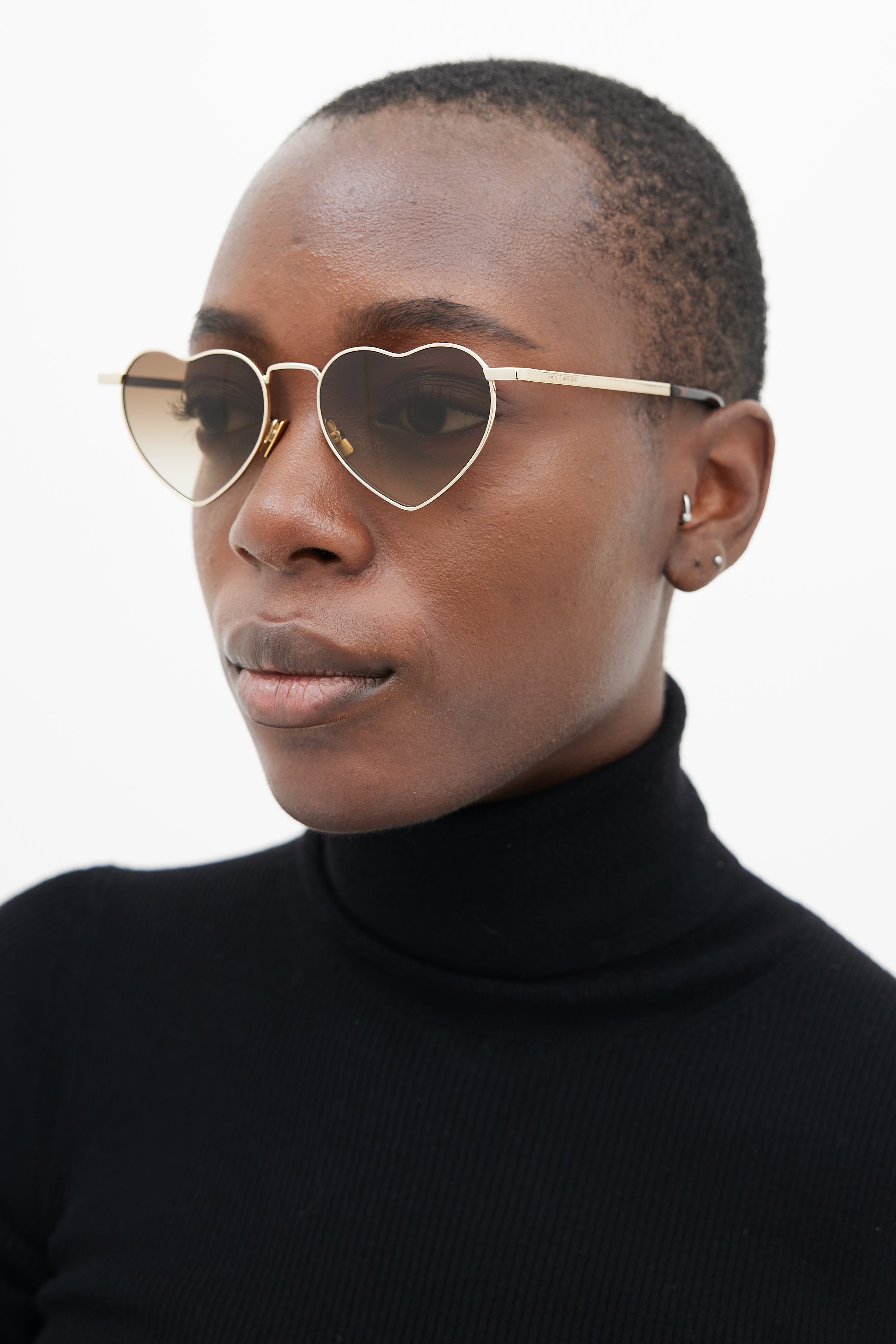 Pre-owned Saint Laurent Lou Lou sunglasses featuring a gold heart shaped frame, tinted lenses, nose pads, and embossed logo at temple.
