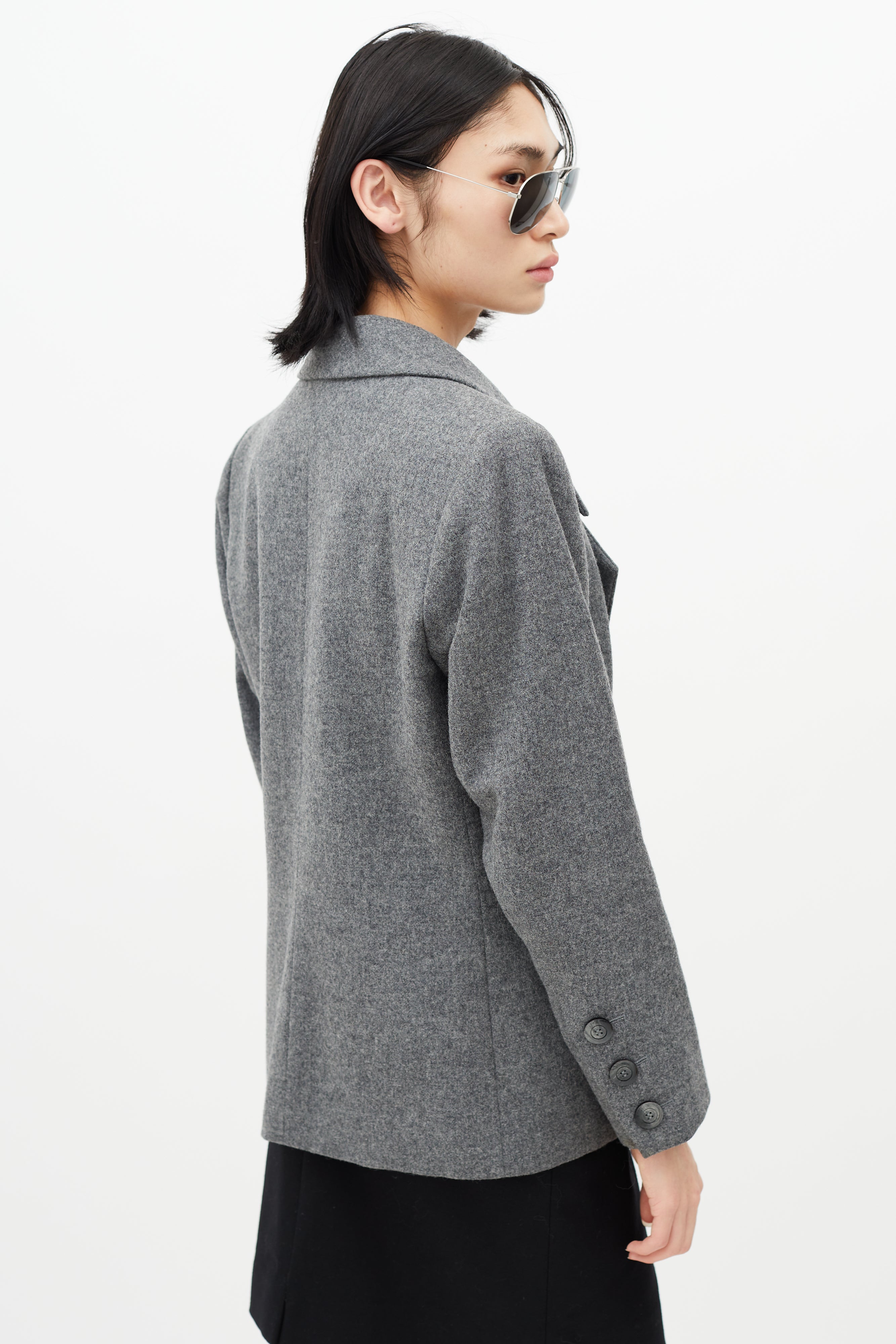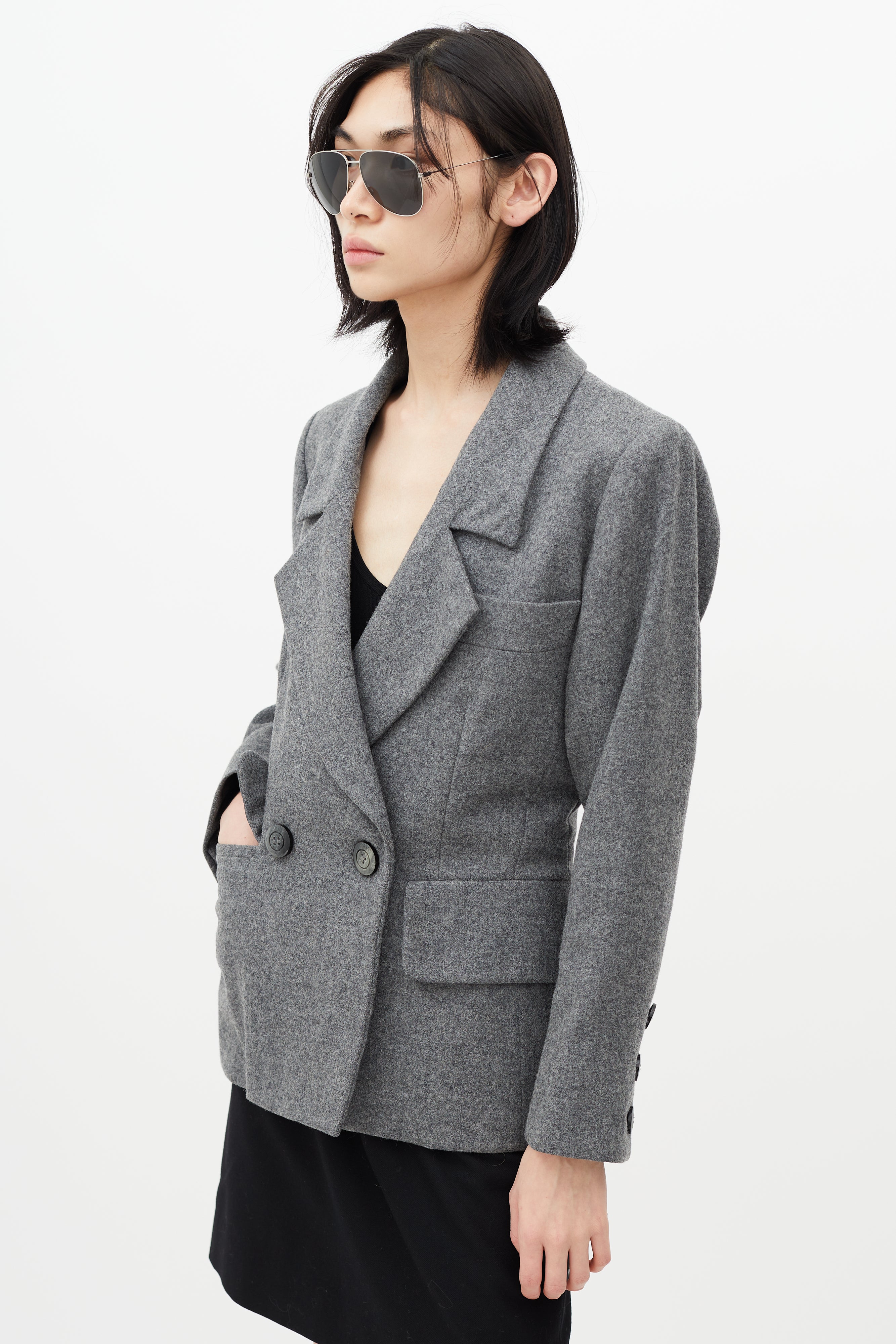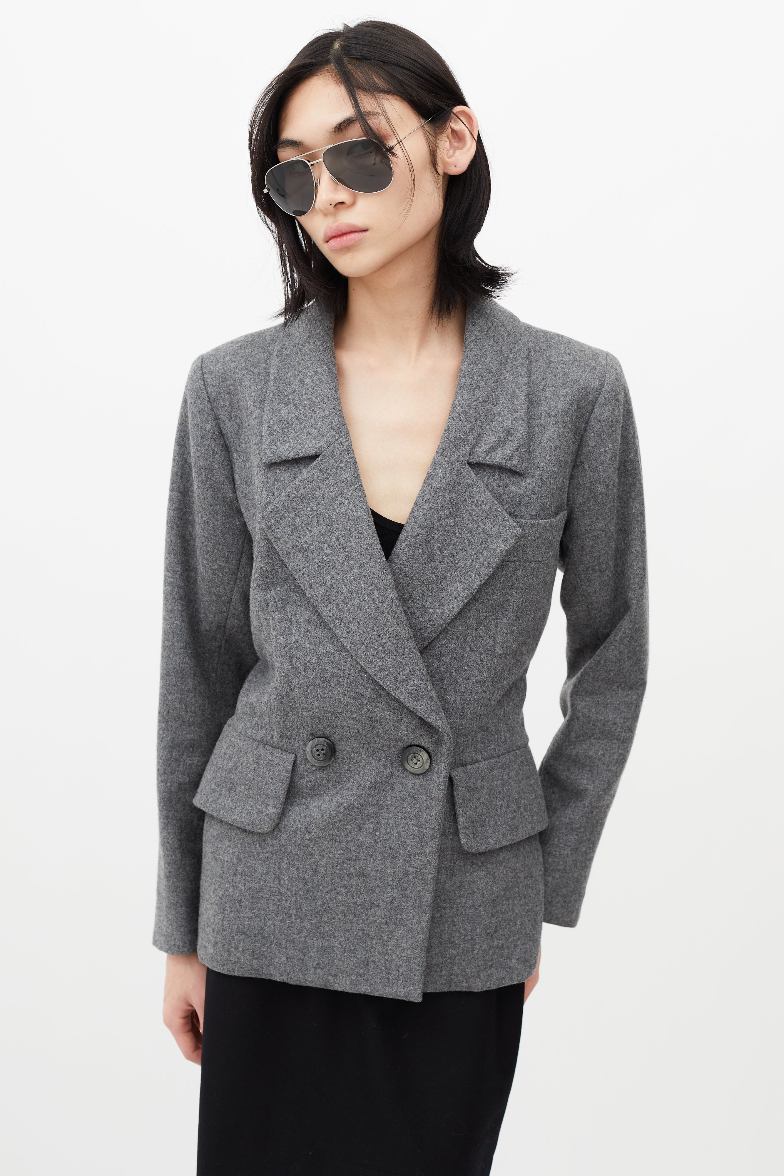 Pre-owned Saint Laurent Rive Gauche grey wool blazer featuring a notched lapel, one welt pocket at chest, two flap pockets at hip, long sleeves with buttoned cuffs, and double breasted button up front. Lined. Clipped to fit model.