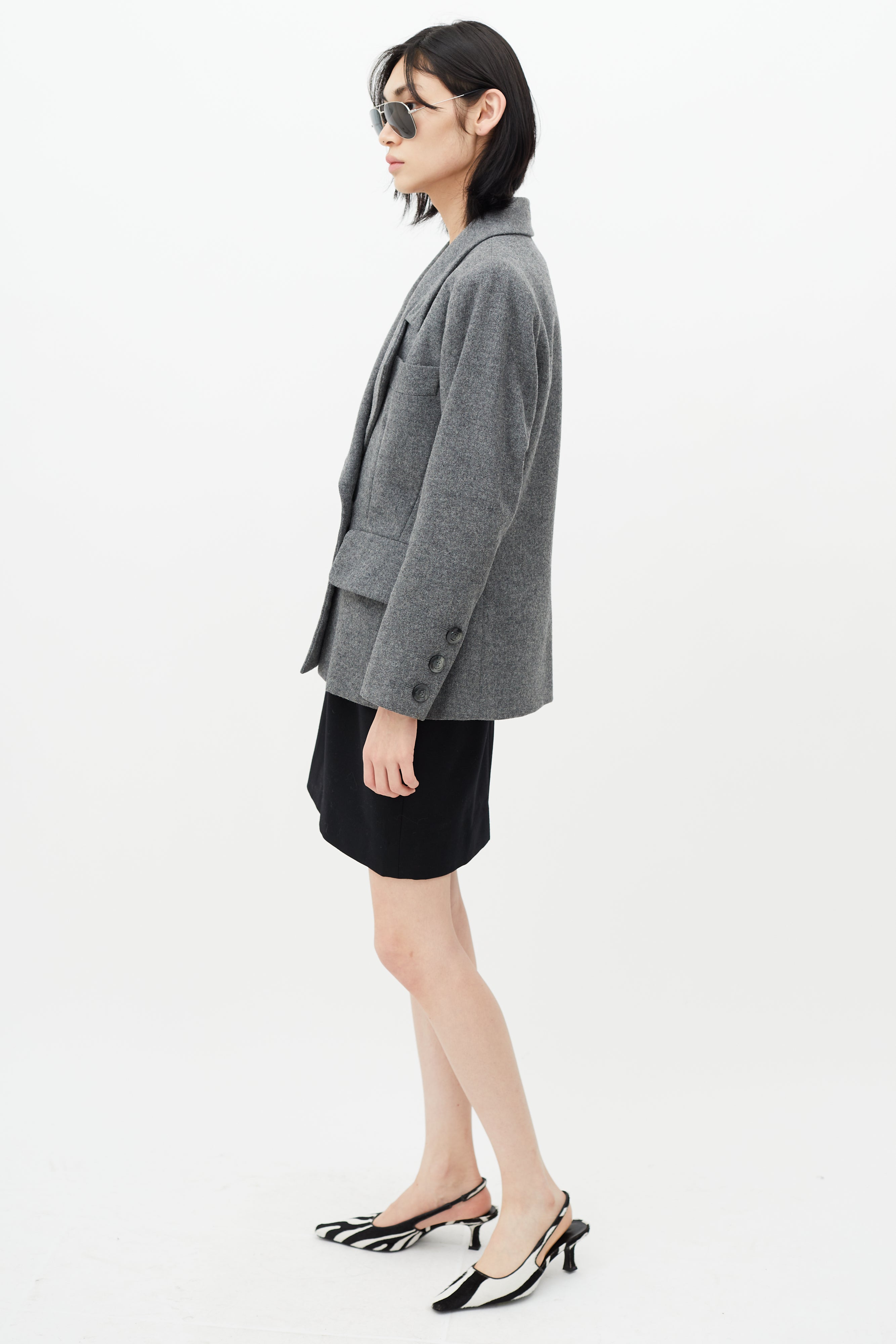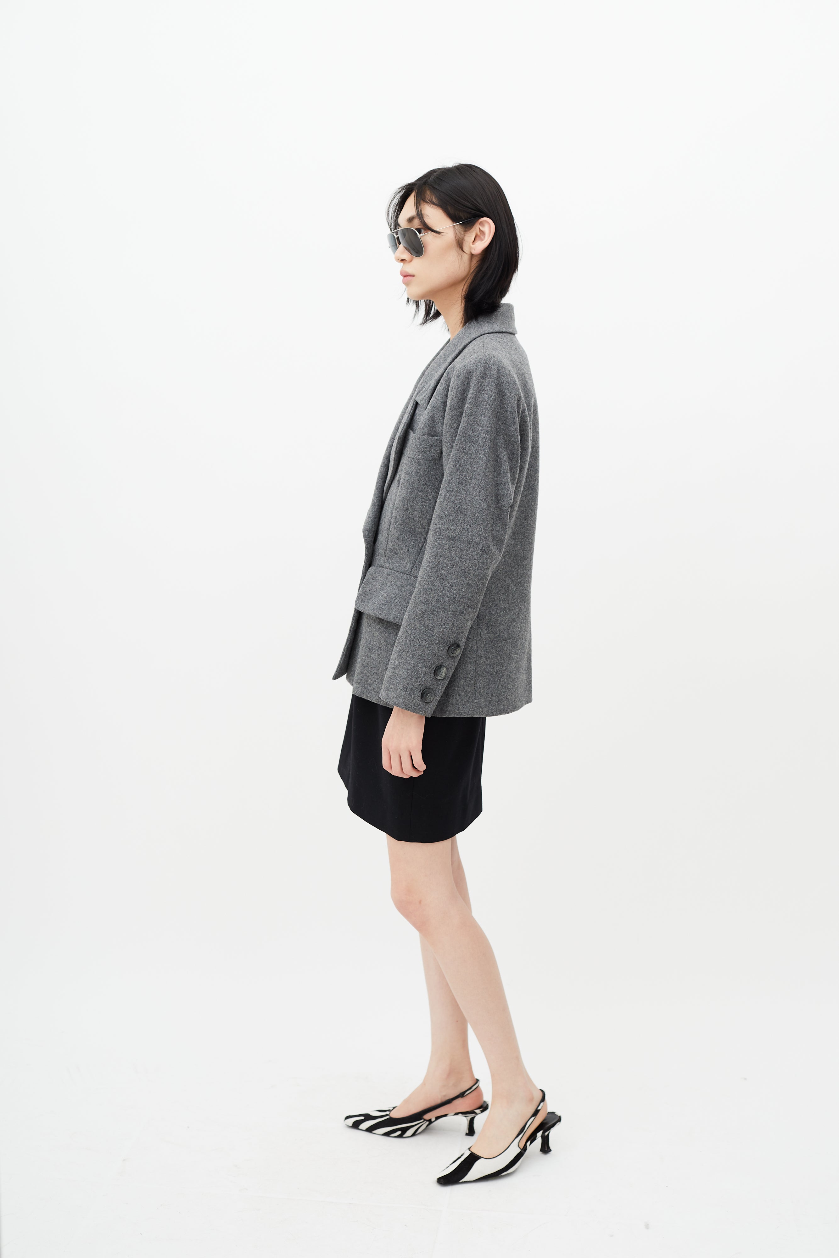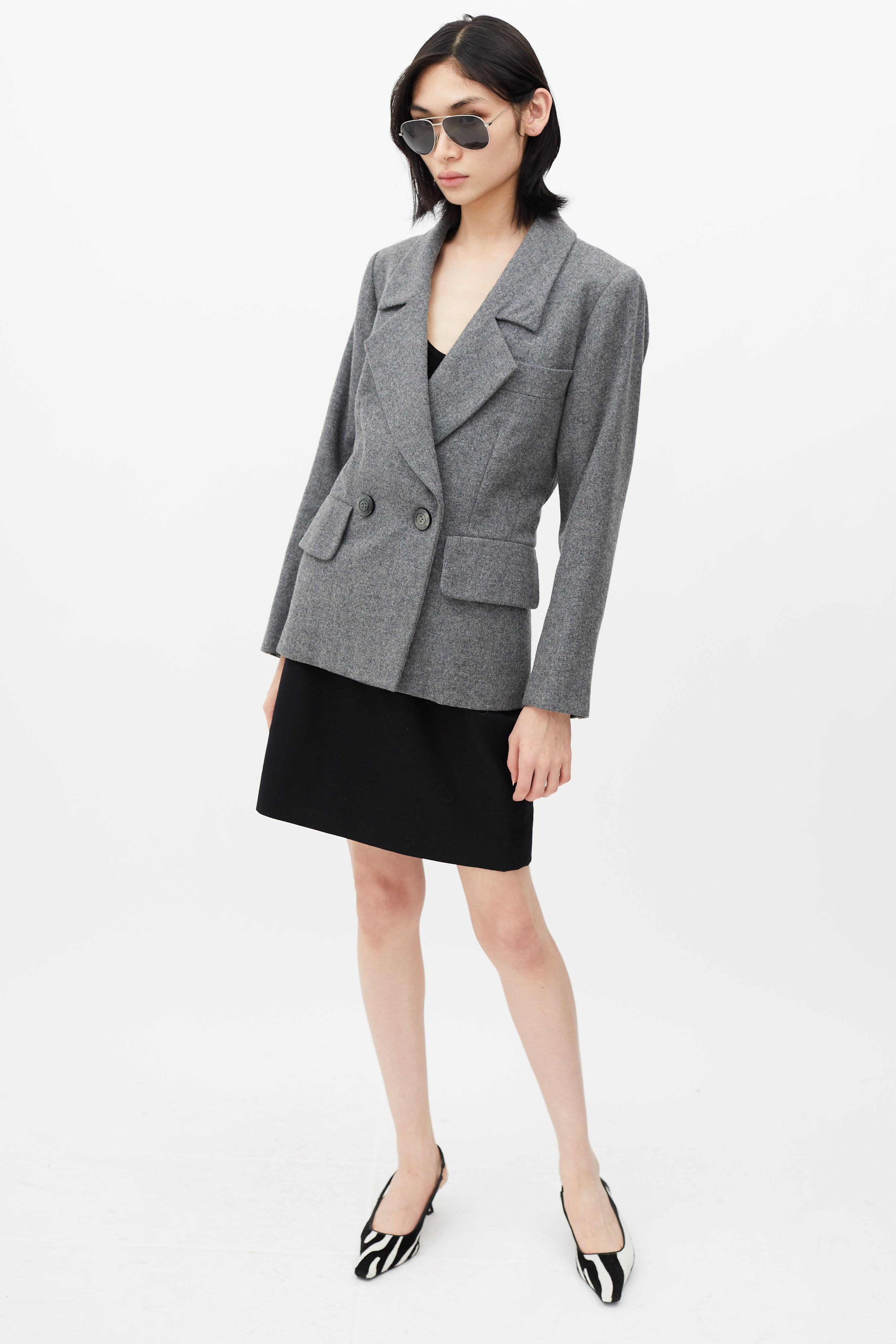 Pre-owned Saint Laurent Rive Gauche grey wool blazer featuring a notched lapel, one welt pocket at chest, two flap pockets at hip, long sleeves with buttoned cuffs, and double breasted button up front. Lined. Clipped to fit model.