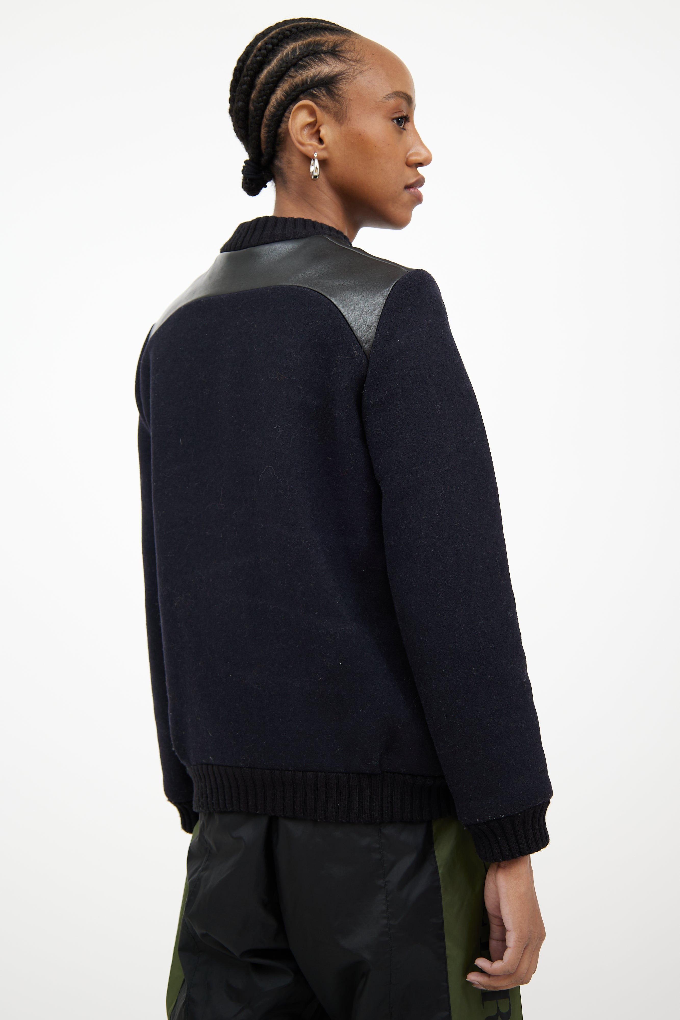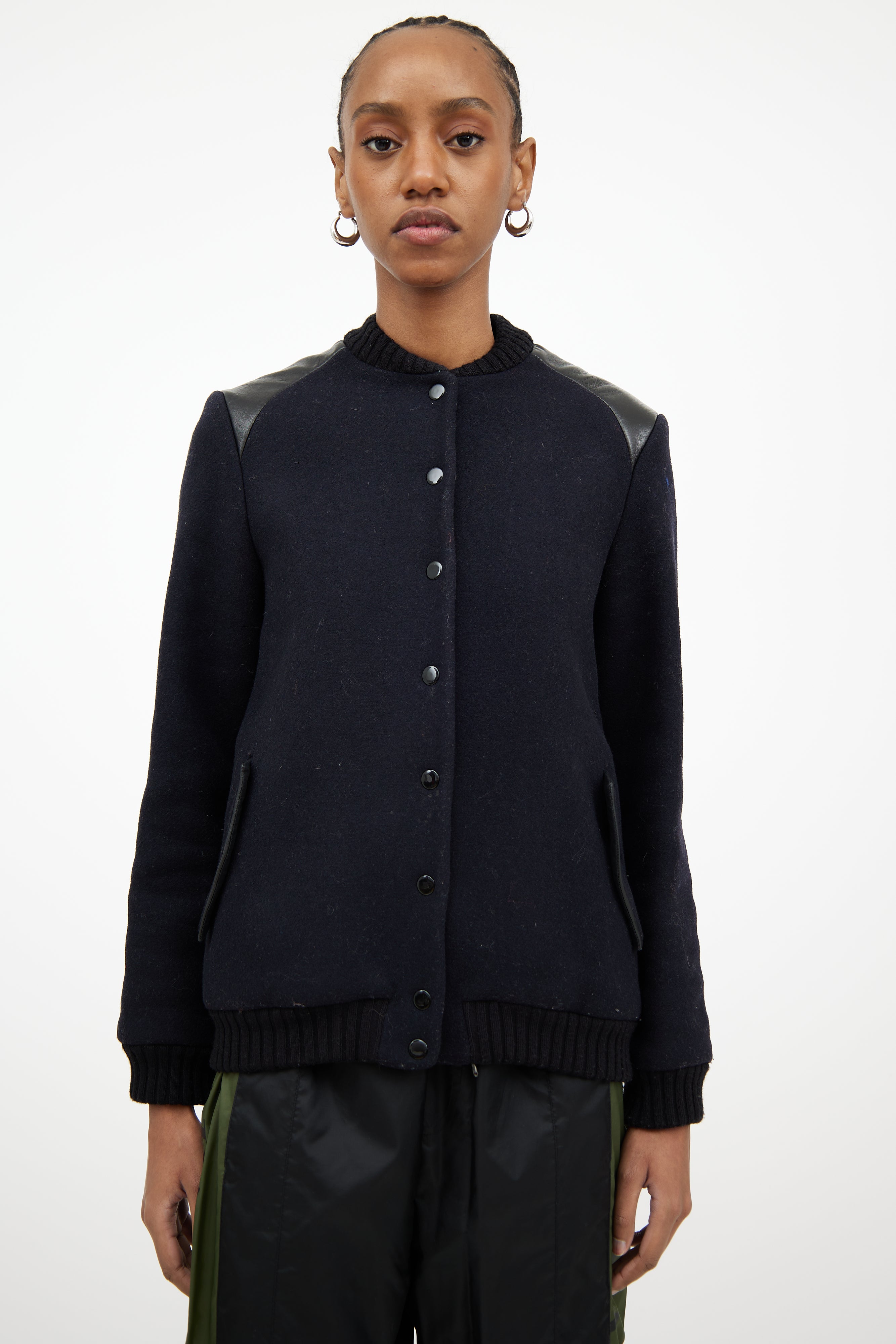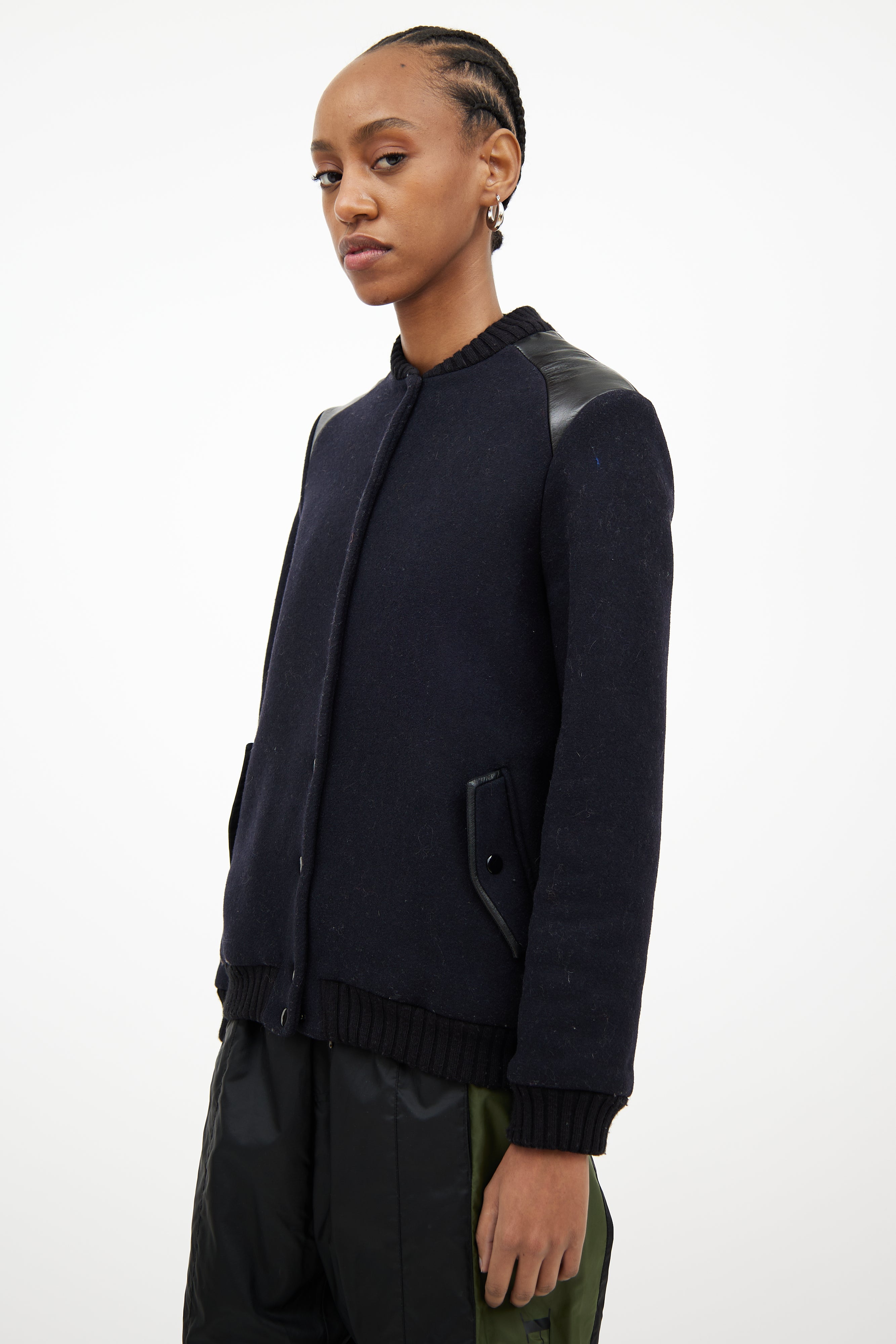 Pre-owned Sandro navy and black wool varsity jacket featuring ribknit stand collar, long sleeves with ribknit cuffs, dual angled button pockets at side, ribknit hem, snap button closure and leather detail at back yoke and shoulder. Fully lined.