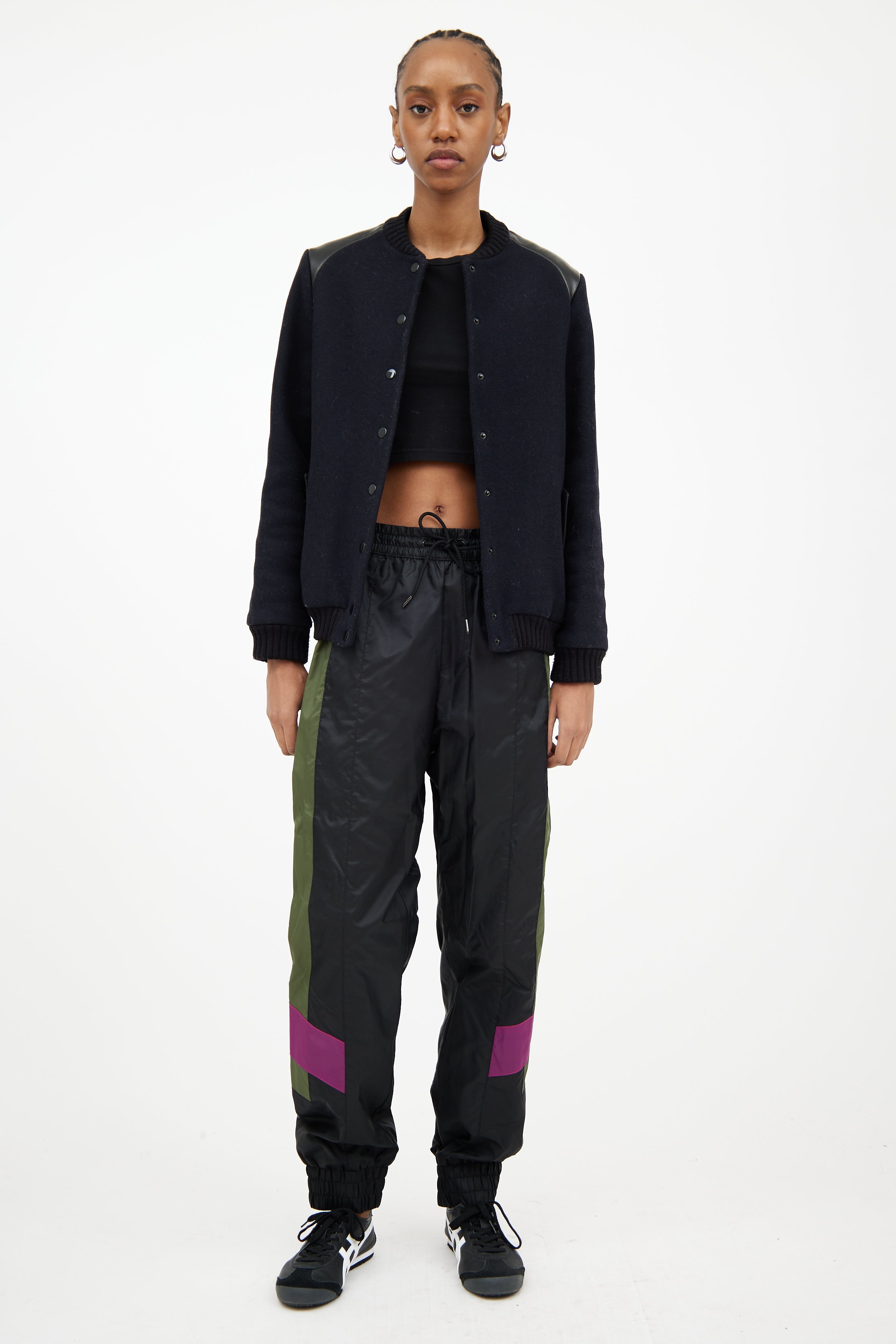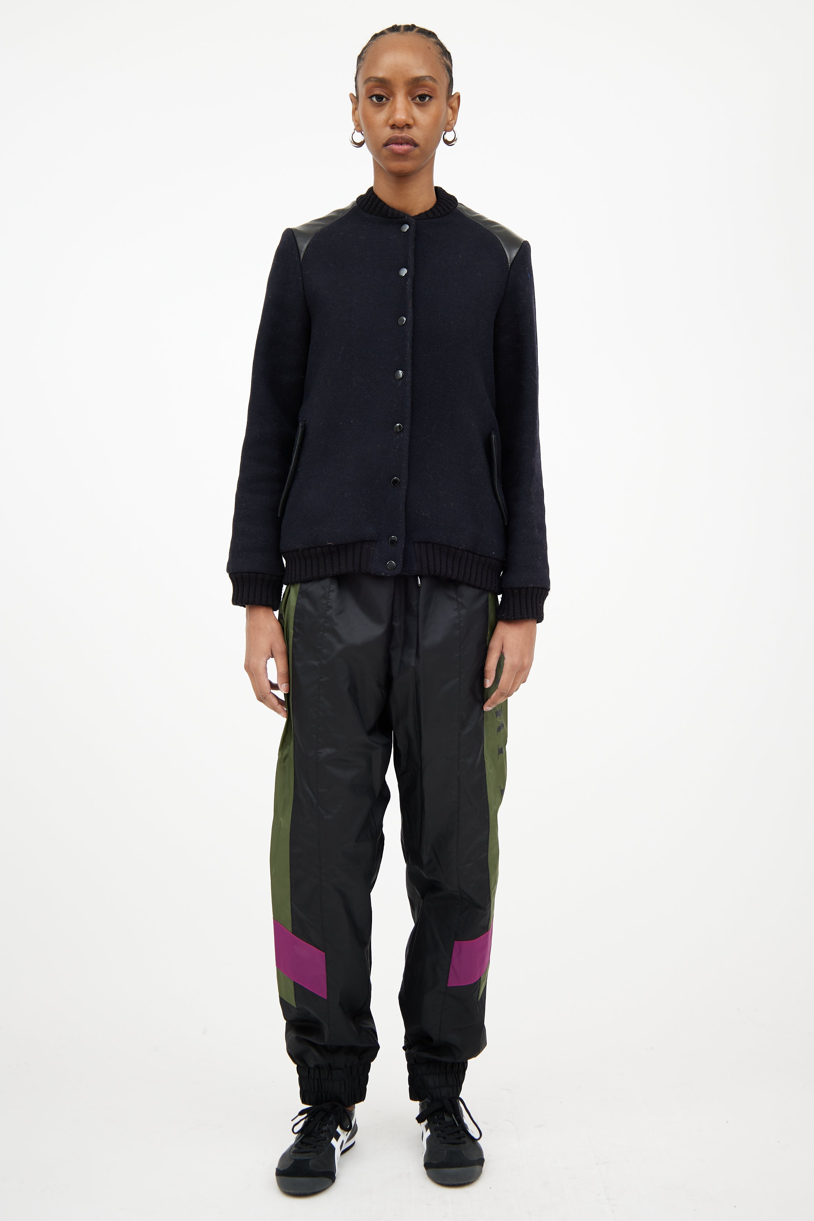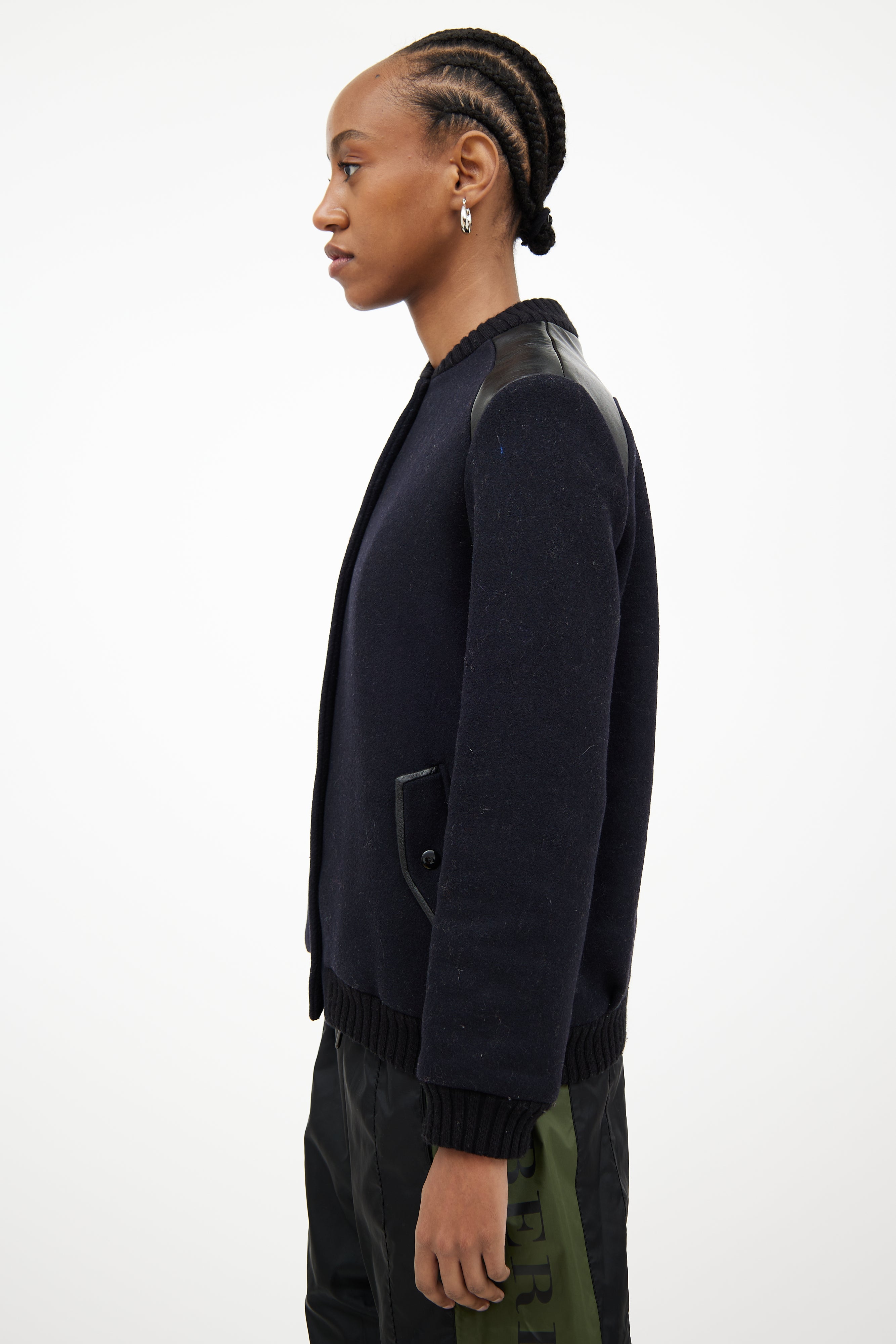 Pre-owned Sandro navy and black wool varsity jacket featuring ribknit stand collar, long sleeves with ribknit cuffs, dual angled button pockets at side, ribknit hem, snap button closure and leather detail at back yoke and shoulder. Fully lined.