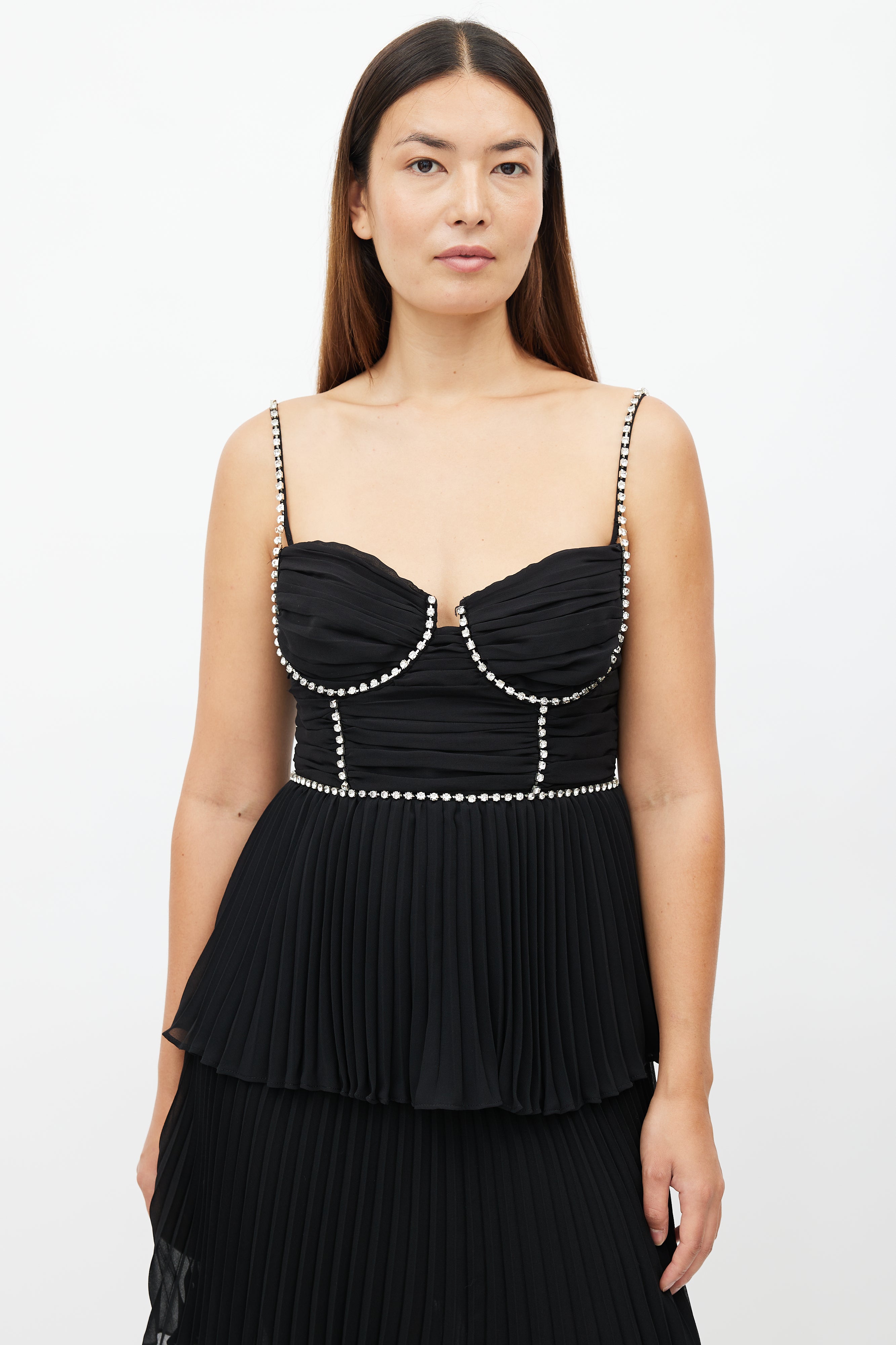 Pre-owned Self-Portrait black chiffon dress featuring a sweetheart neckline, pleated tiered skirt, structured bust with jewel detail, embellished shoulder straps, and zip at back with hook and eye closure. Lined.
