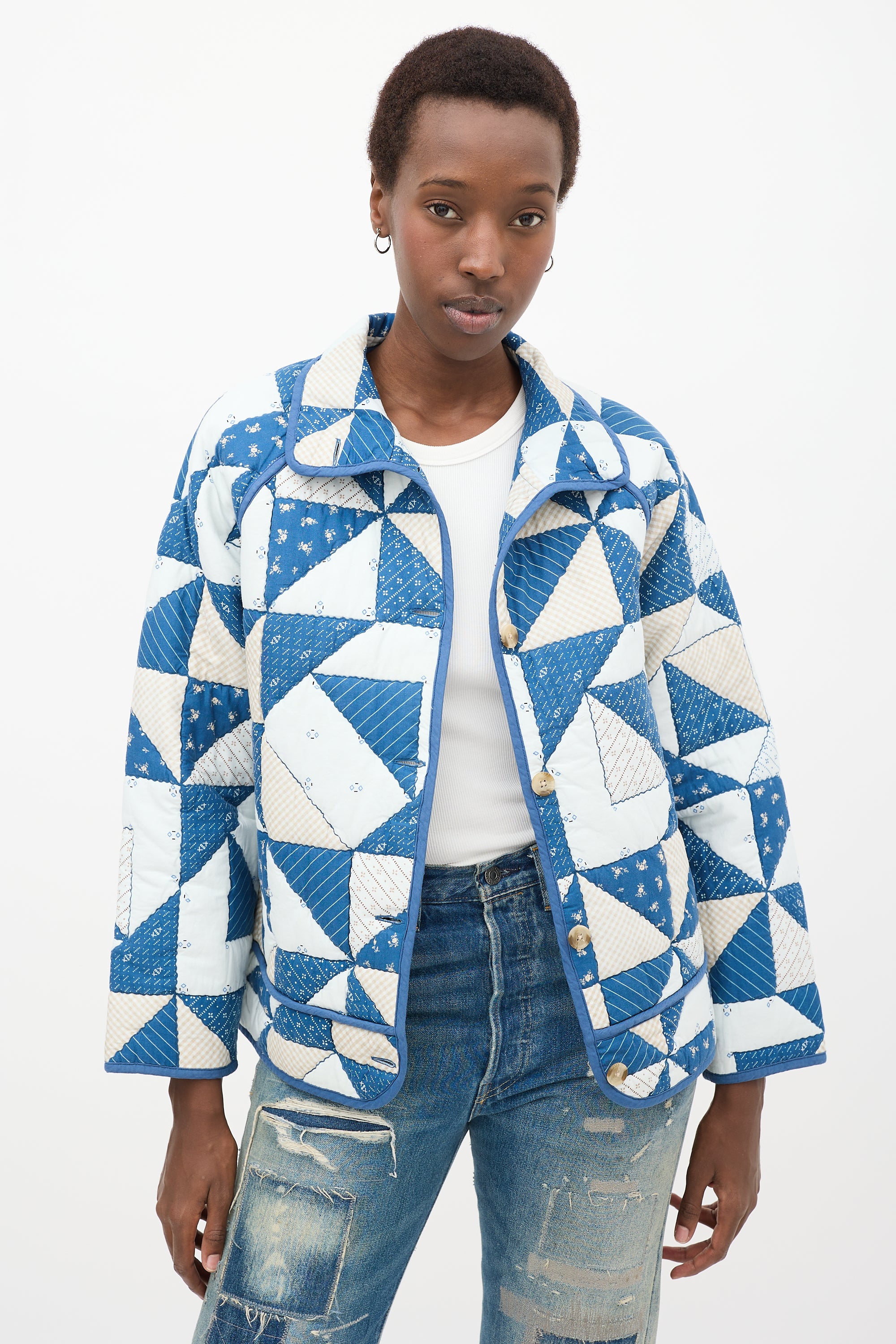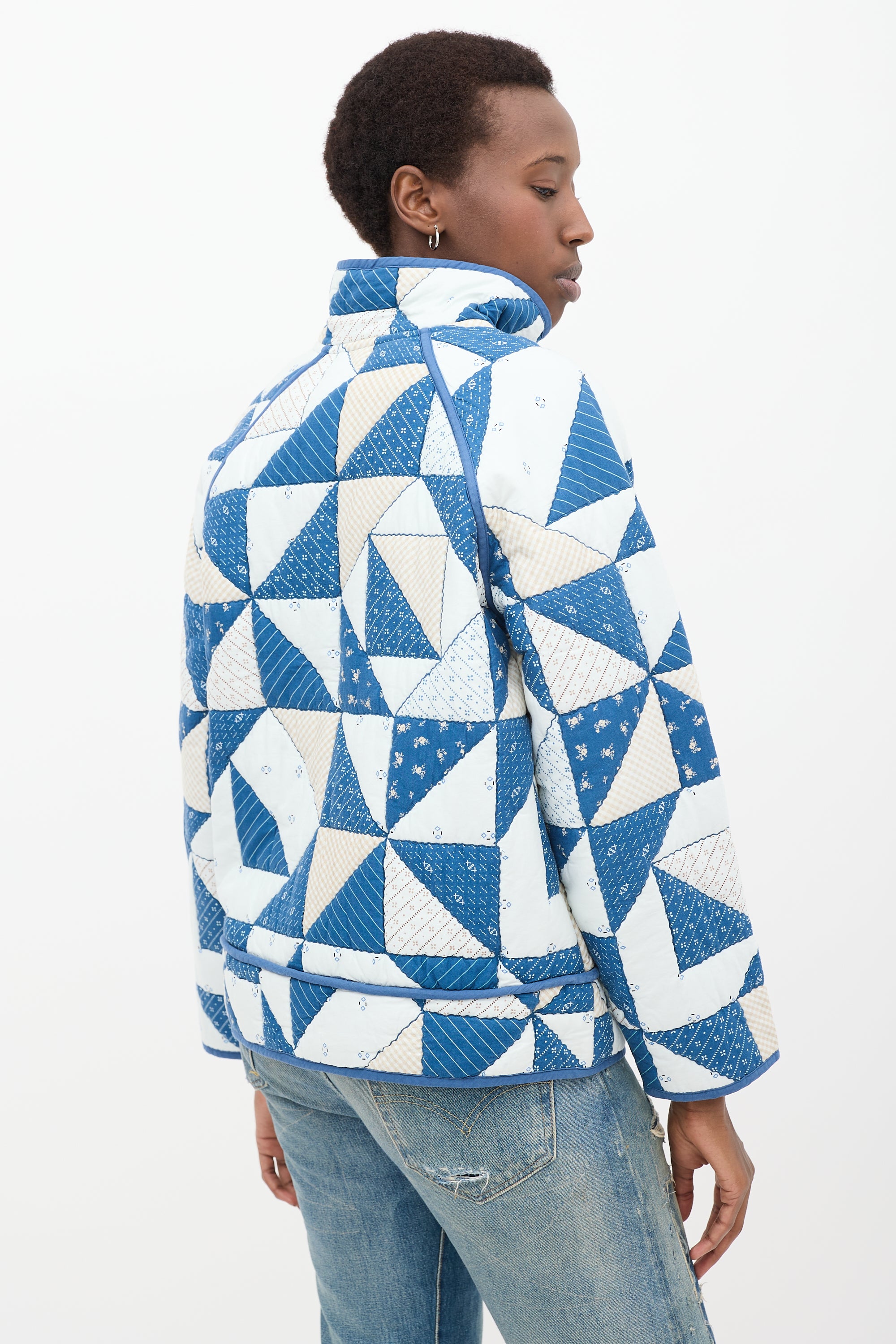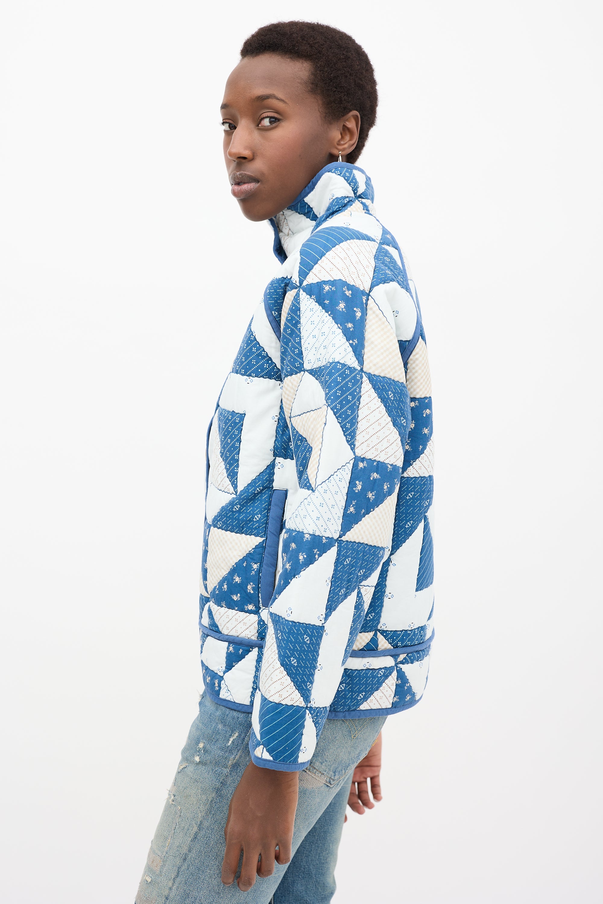 Pre-owned Sézane blue Léopold jacket featuring white multi patterned quilting throughout, funnel neck collar, long raglan sleeves, two slip pockets at hip, and button up closure. Lined.