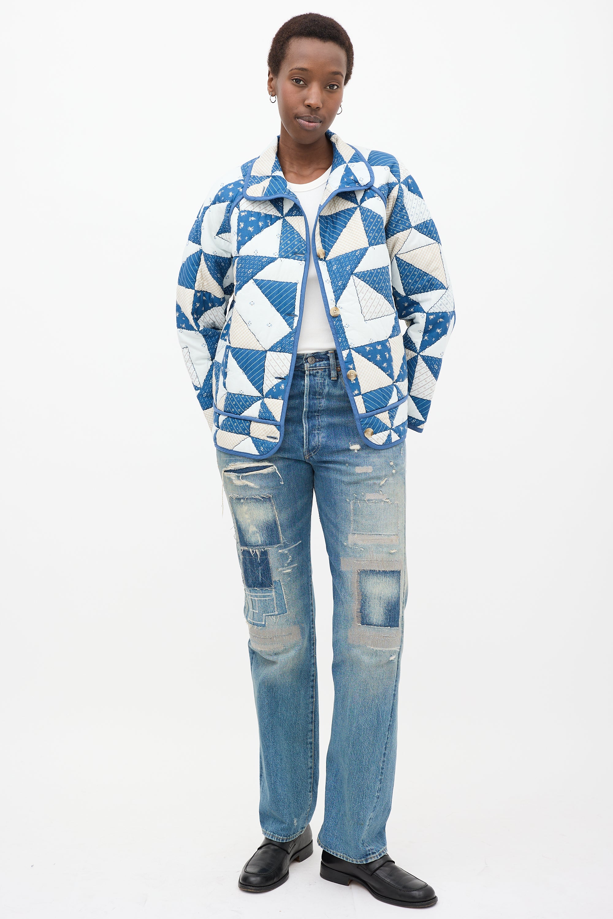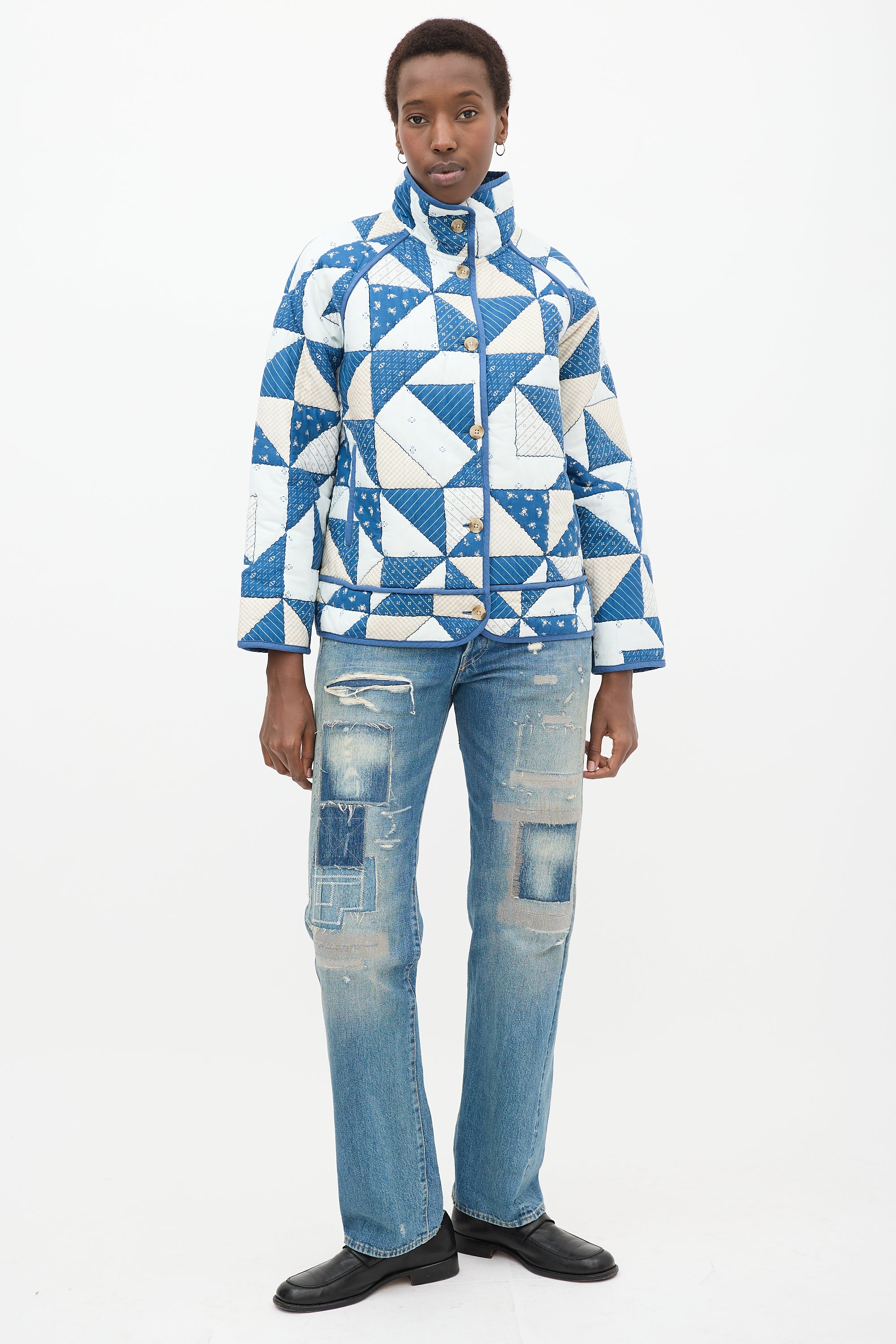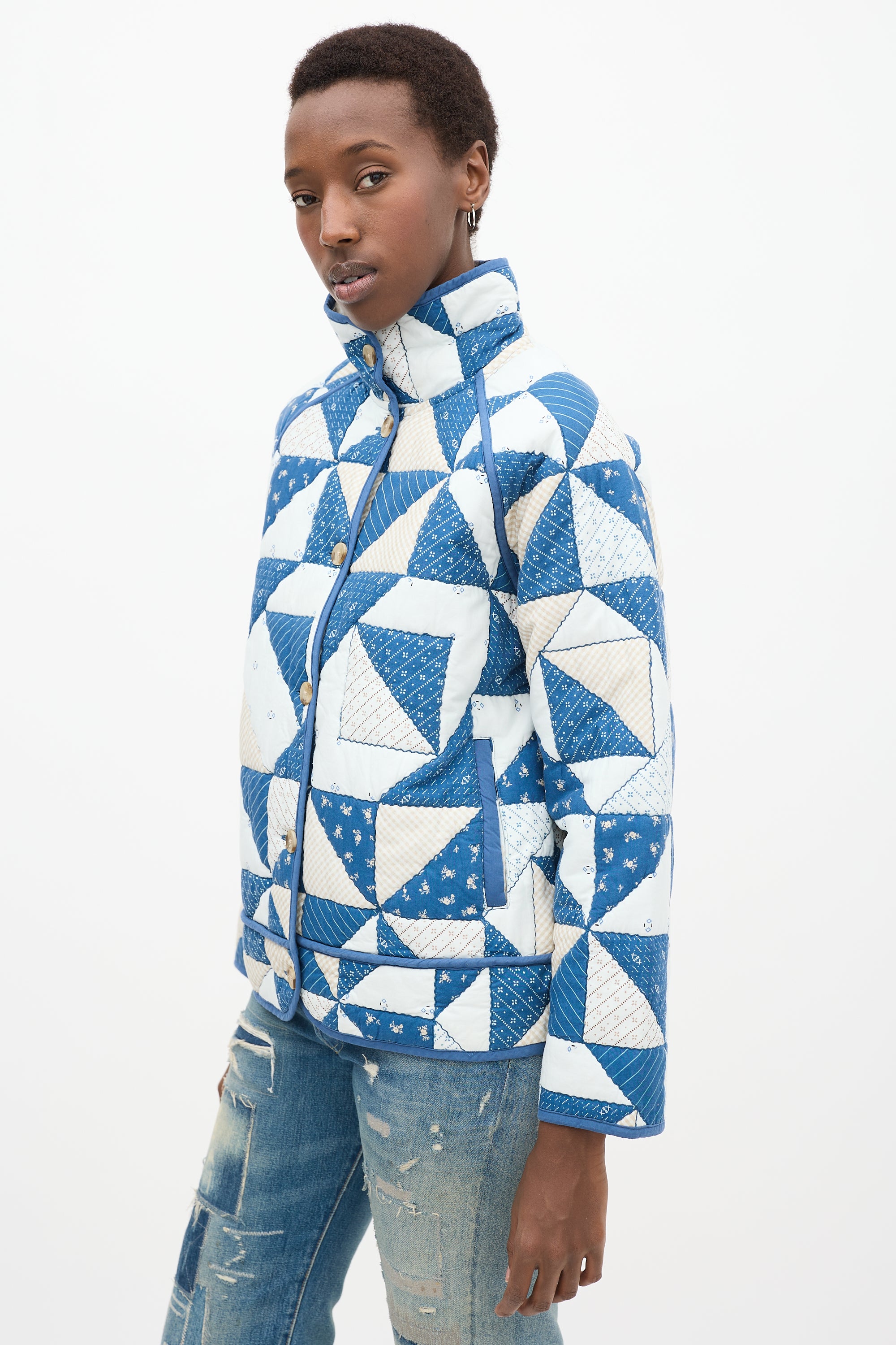 Pre-owned Sézane blue Léopold jacket featuring white multi patterned quilting throughout, funnel neck collar, long raglan sleeves, two slip pockets at hip, and button up closure. Lined.