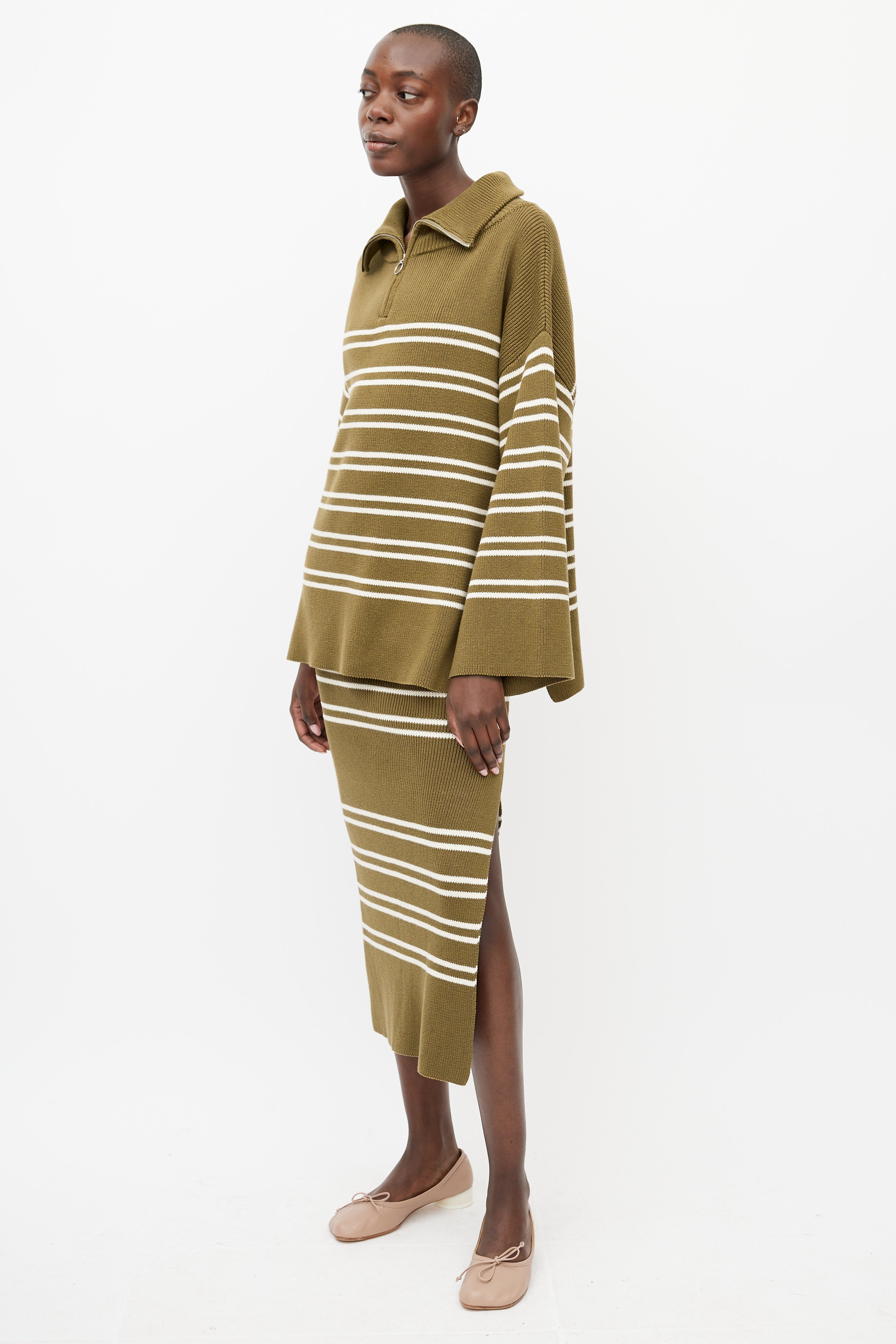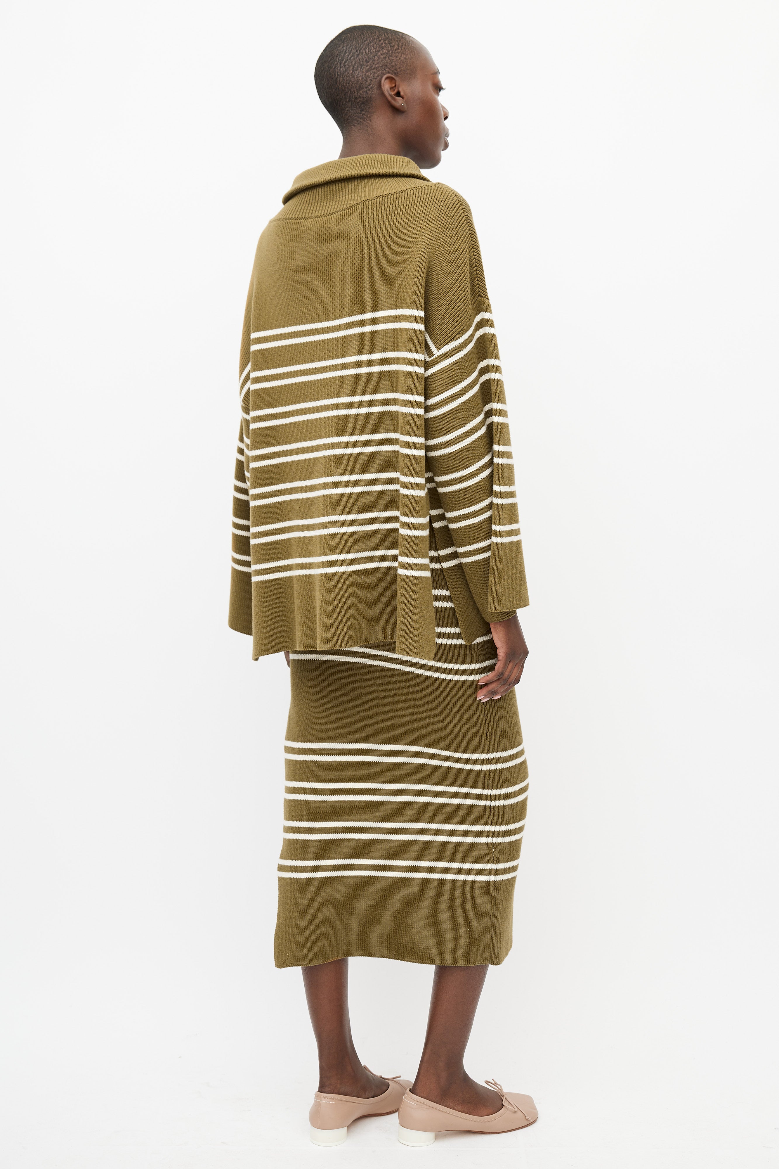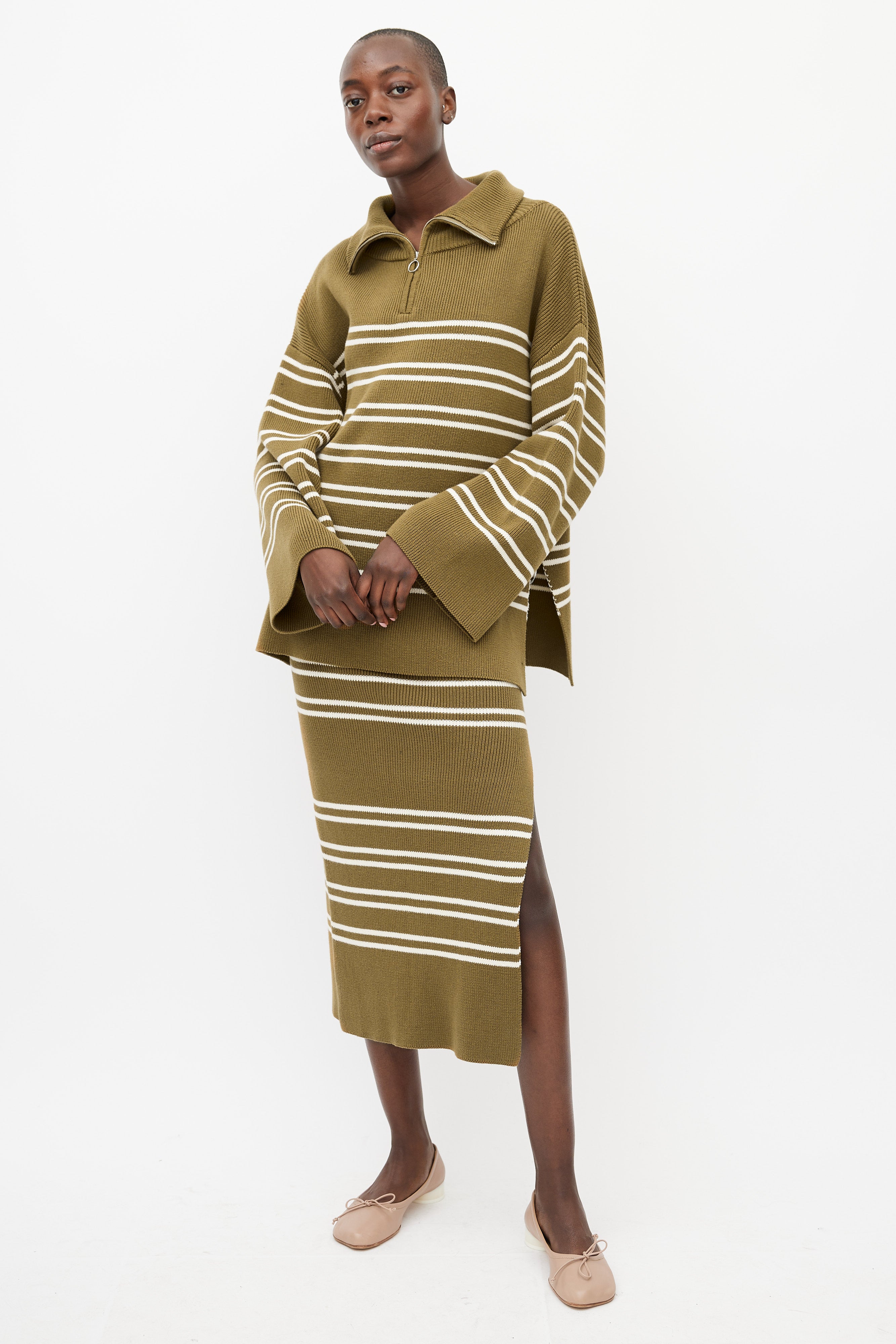 Pre-owned Shona Joy brown and cream sweater featuring funnel collar, half zip up front, ribbed knit, stripes, wide sleeves, white embroidery detail at left hip, and side slits. Matching skirt featuring elasticized waist and side slit.