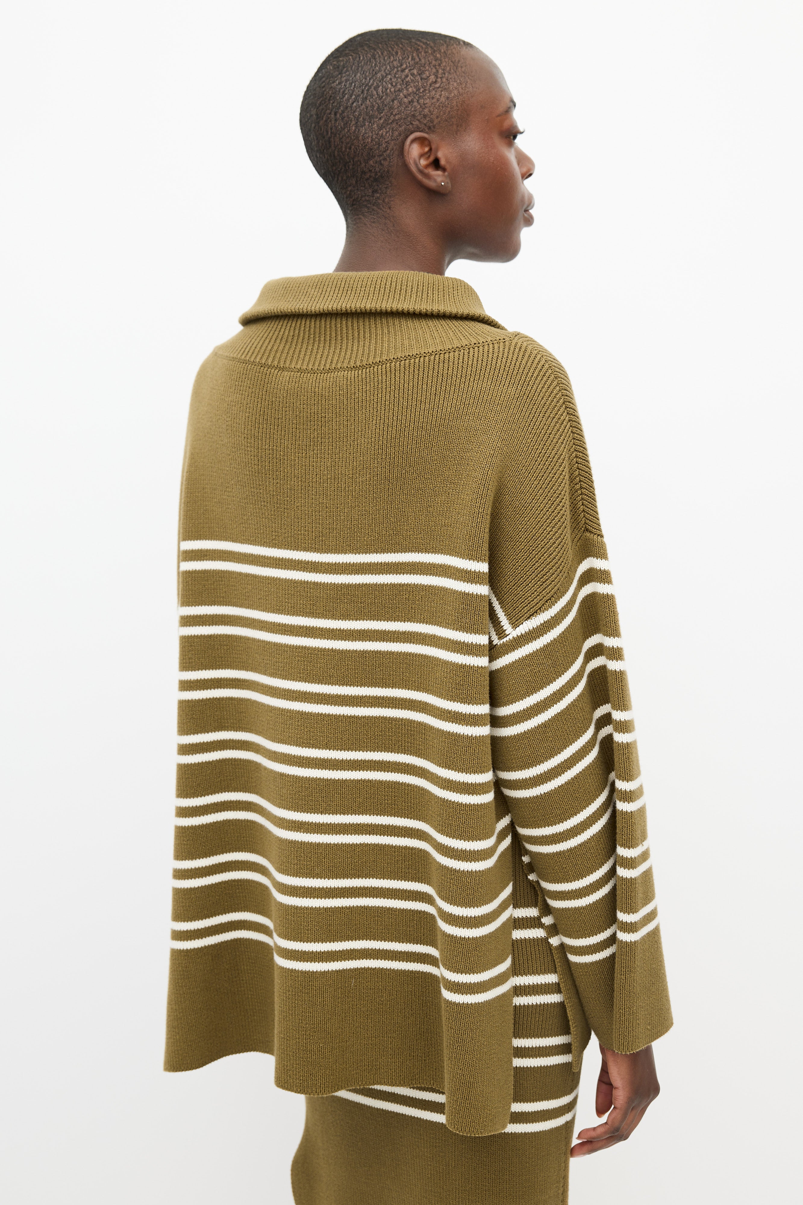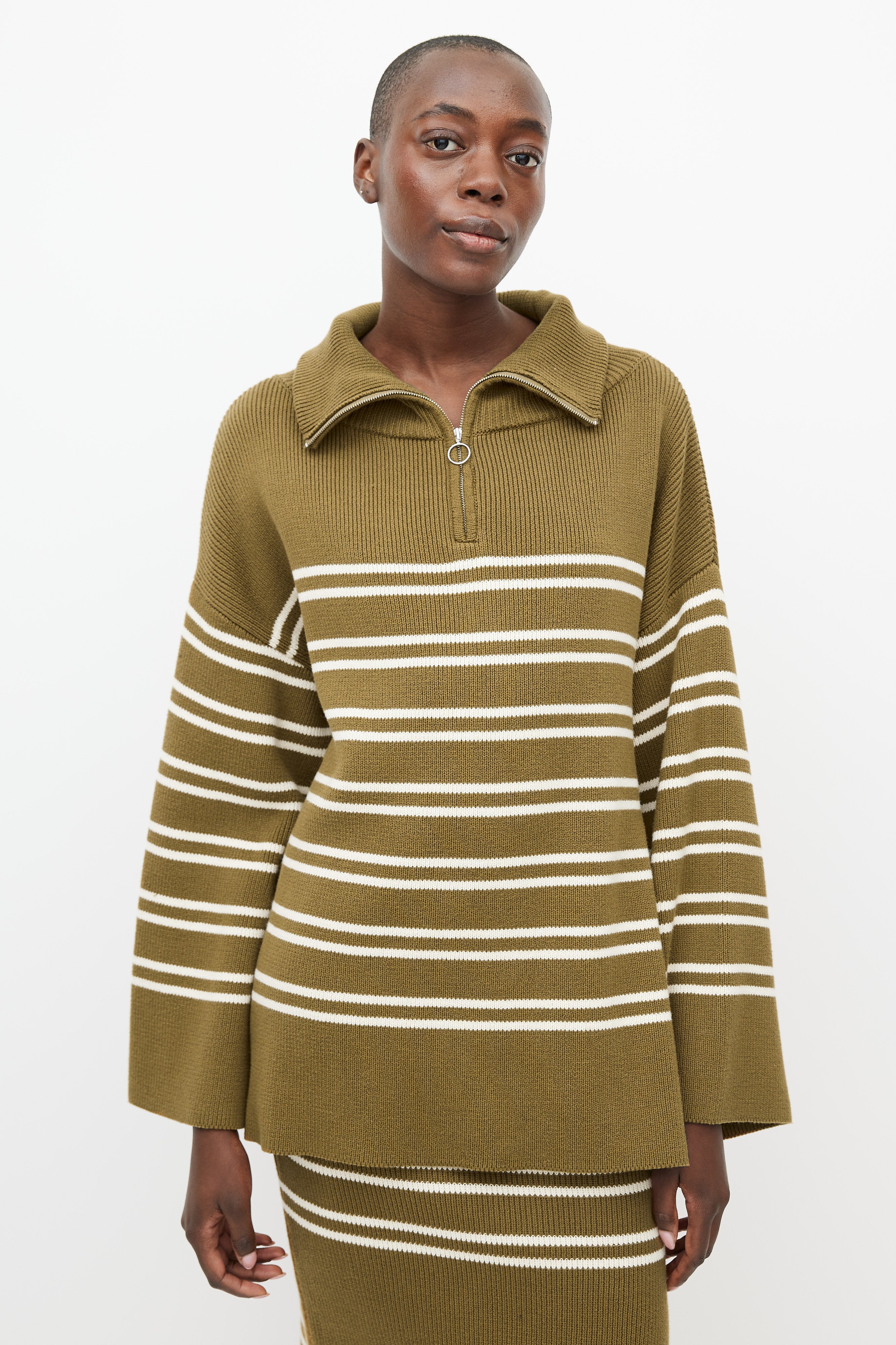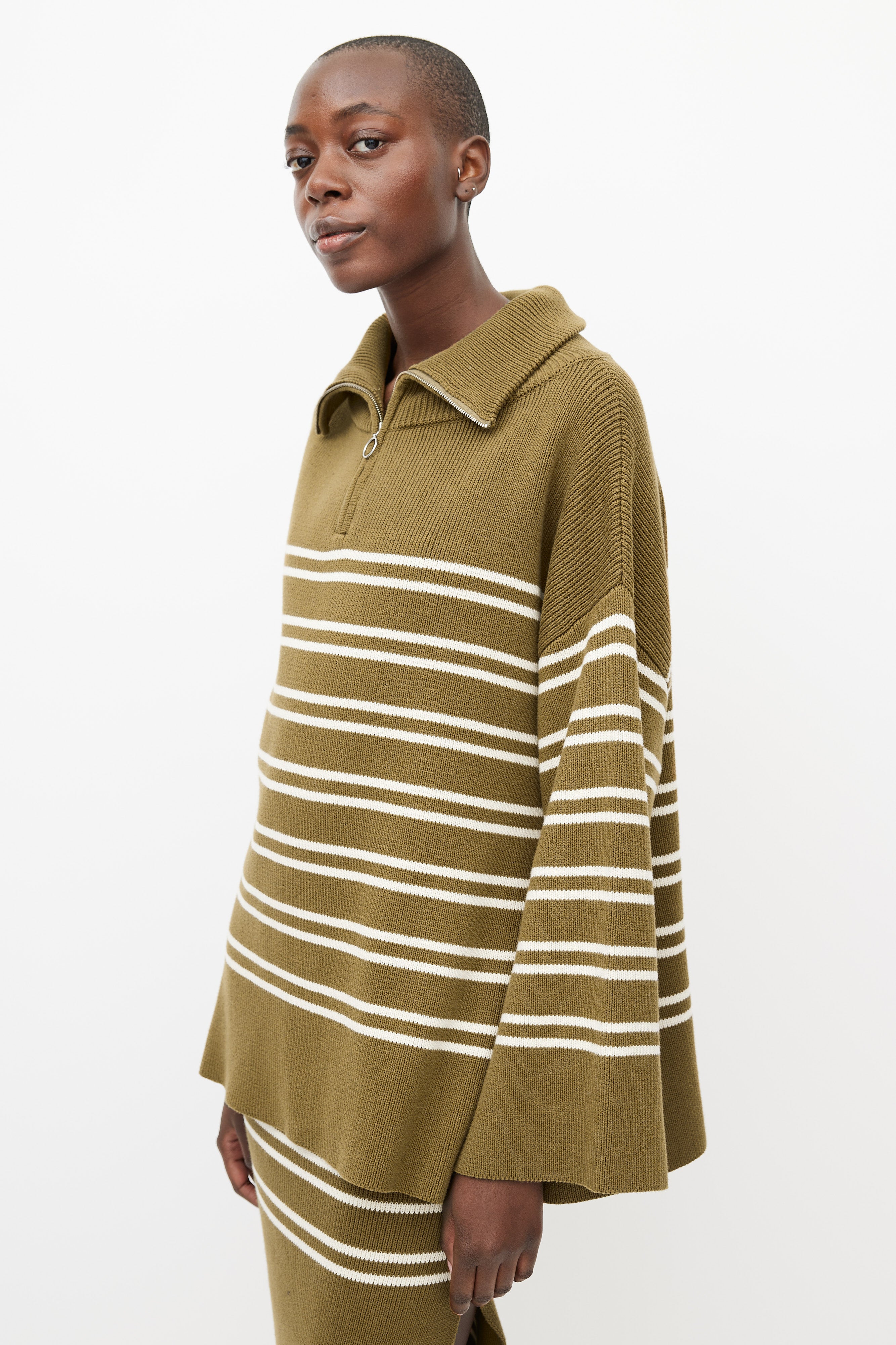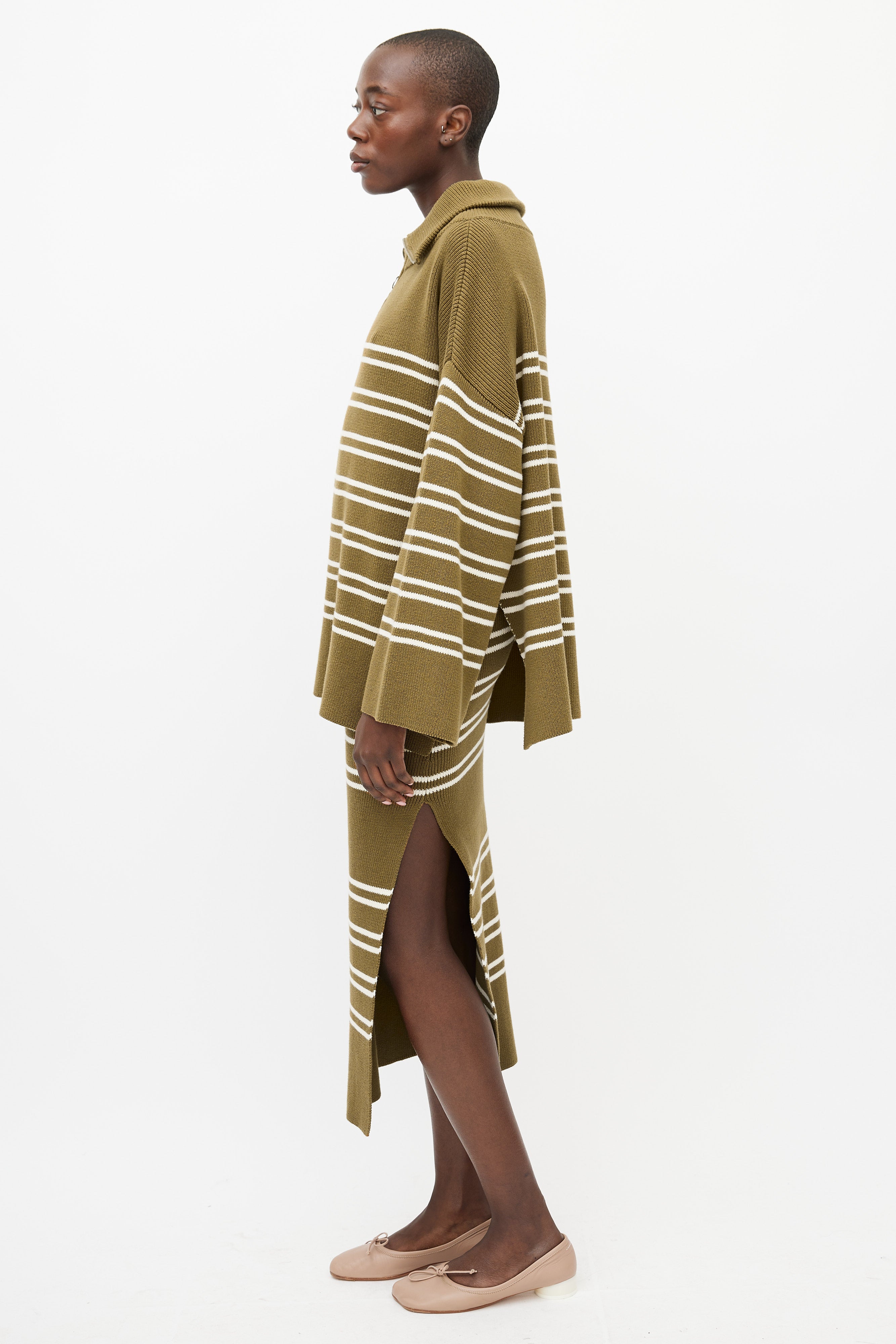 Pre-owned Shona Joy brown and cream sweater featuring funnel collar, half zip up front, ribbed knit, stripes, wide sleeves, white embroidery detail at left hip, and side slits. Matching skirt featuring elasticized waist and side slit.